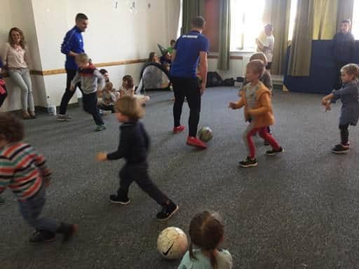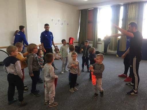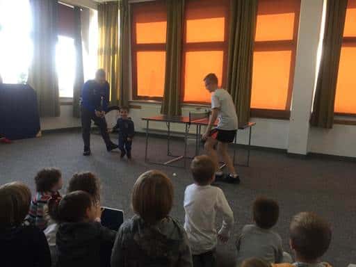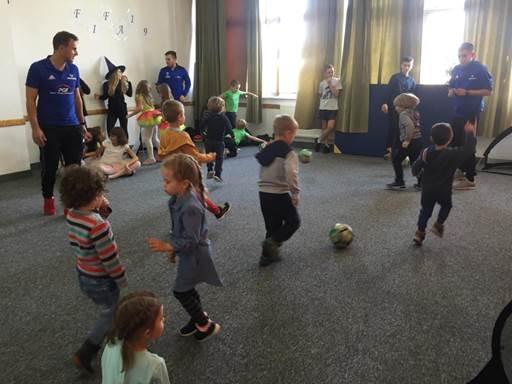 Po wizycie w klasie pierwszej, w sali treningowej czekali na nas trenerzy; pan Kamil i pan Mateusz. I tu nasze dzieci musiały wykazać się umiejętnościami sportowymi. Trenerzy przygotowali dla nas zabawy i ćwiczenia sportowe: biegi, grę w piłkę nożną, grę w tenisa stołowego, zabawy orientacyjne i zręcznościowe. Oczywiście świetnie sobie poradziliśmy. W prezencie otrzymaliśmy dwie piękne piłki, a jeszcze pan Kamil( a prywatnie tatuś naszej Blanki) obiecał małą bramkę.