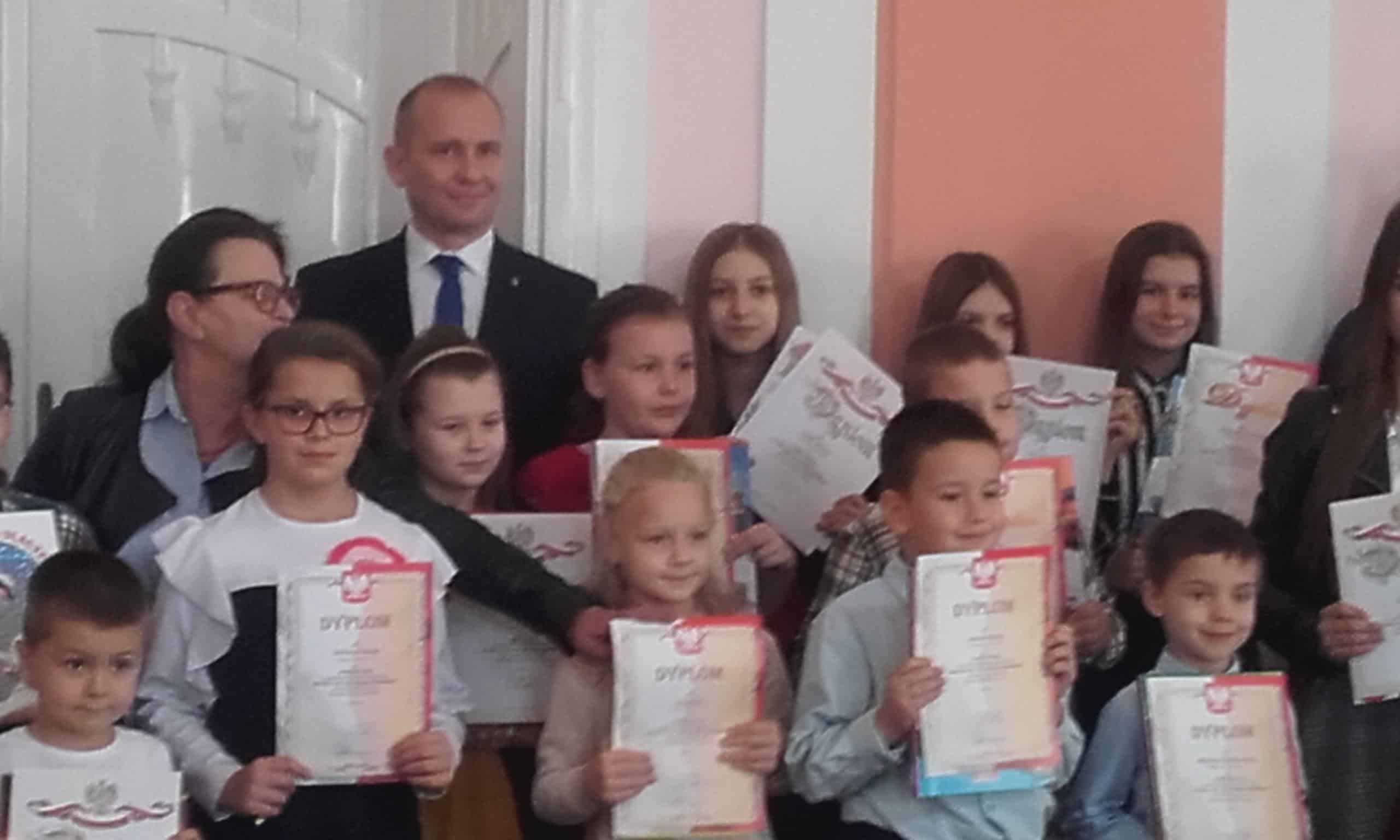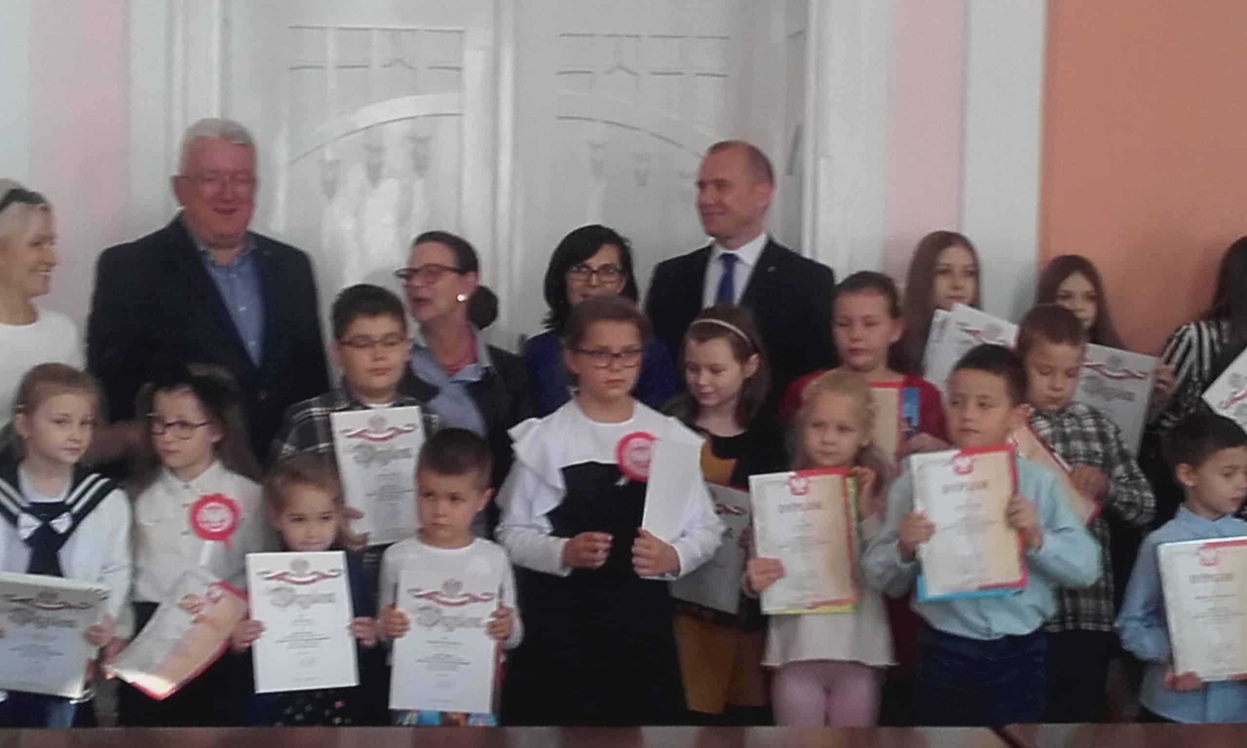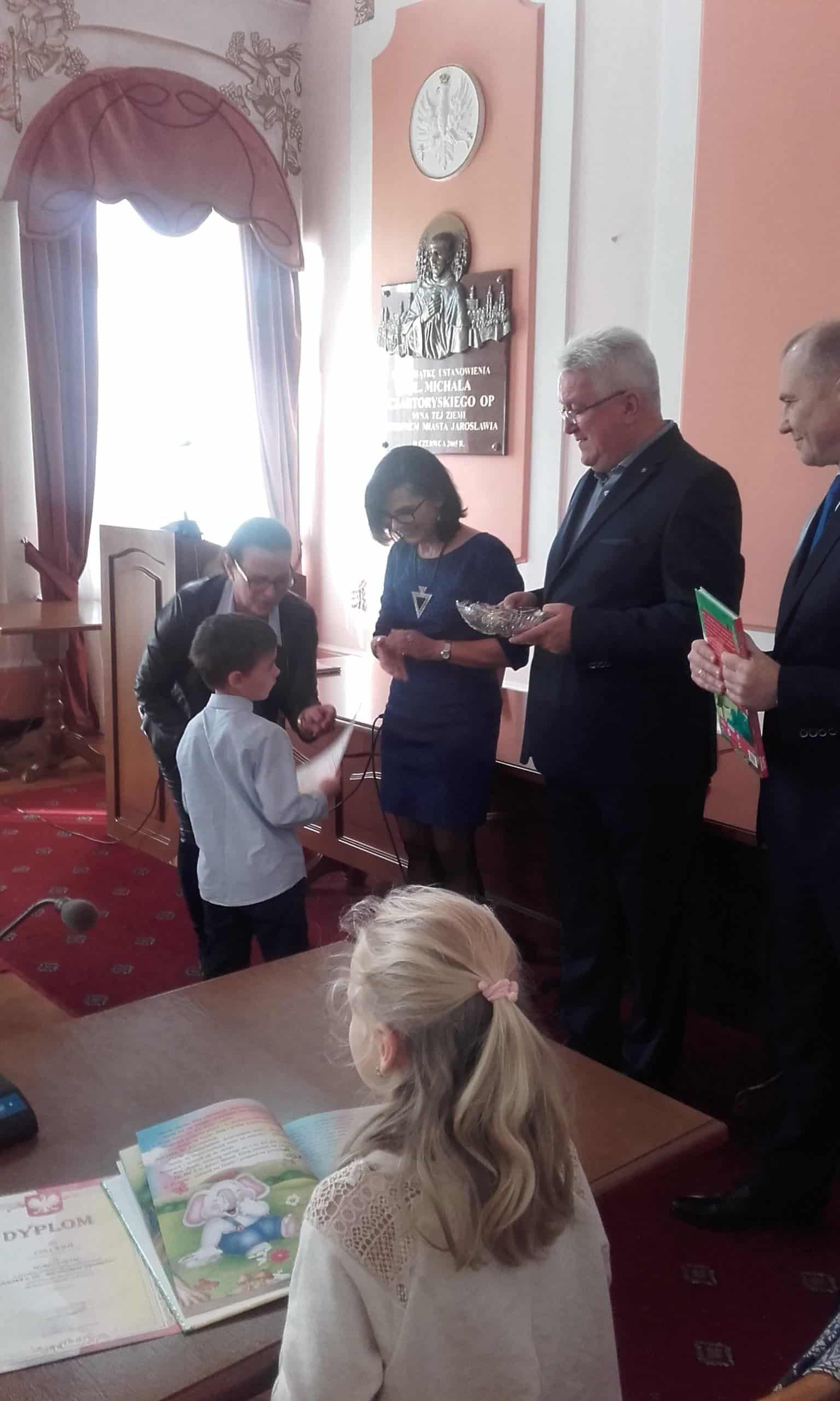 7 listopada w Urzędzie Miasta Jarosławia miała miejsce uroczystość będąca podsumowaniem konkursu plastycznego „Polska w 100- lecie odzyskania niepodległości”. Organizatorem konkursu była Szkoła Podstawowa nr 11, honorowy patronat pełnił Burmistrz Miasta Jarosławia.Celem konkursu było promowanie, rozpowszechnianie i wzmacnianie wśród dzieci wizerunku Polski, a także rozwijanie kreatywności, fantazji i wyobraźni plastycznej w odniesieniu do historii Polski w przestrzeni czasowej 1918-2018. Na konkurs wpłynęło 150 prac w trzech kategoriach wiekowych. Dzieci w przepiękny sposób używając równych technik plastycznych pokazały własną wizję Polski w 100- lecie odzyskania niepodległości. Prace były bogate w szczegóły, radosne i kolorowe, a dominującym kolorem była biel i czerwień, na co w swoim krótkim przemówieniu do dzieci zwrócił uwagę Pan Wiceburmistrz. I miejsce w tym konkursie zajął Michał Hołowacz z grupy Pomarańczowej, a wyróżnienia otrzymali również Lena Kiełt z grupy Żółtej, Mikołaj Dąbrowski z grupy Zielonej oraz Jakub Motyka z grupy Czerwonej. Jest to ogromny sukces. Laureaci otrzymali pamiątkowe dyplomy i nagrody w postaci książek oraz osobiście odebrali gratulacje z rąk Pana Wiceburmistrza, a także z rąk organizatorów konkursu. Na zakończenie wykonano pamiątkowe zdjęcia wszystkim laureatom konkursu. Serdecznie gratulujemy!