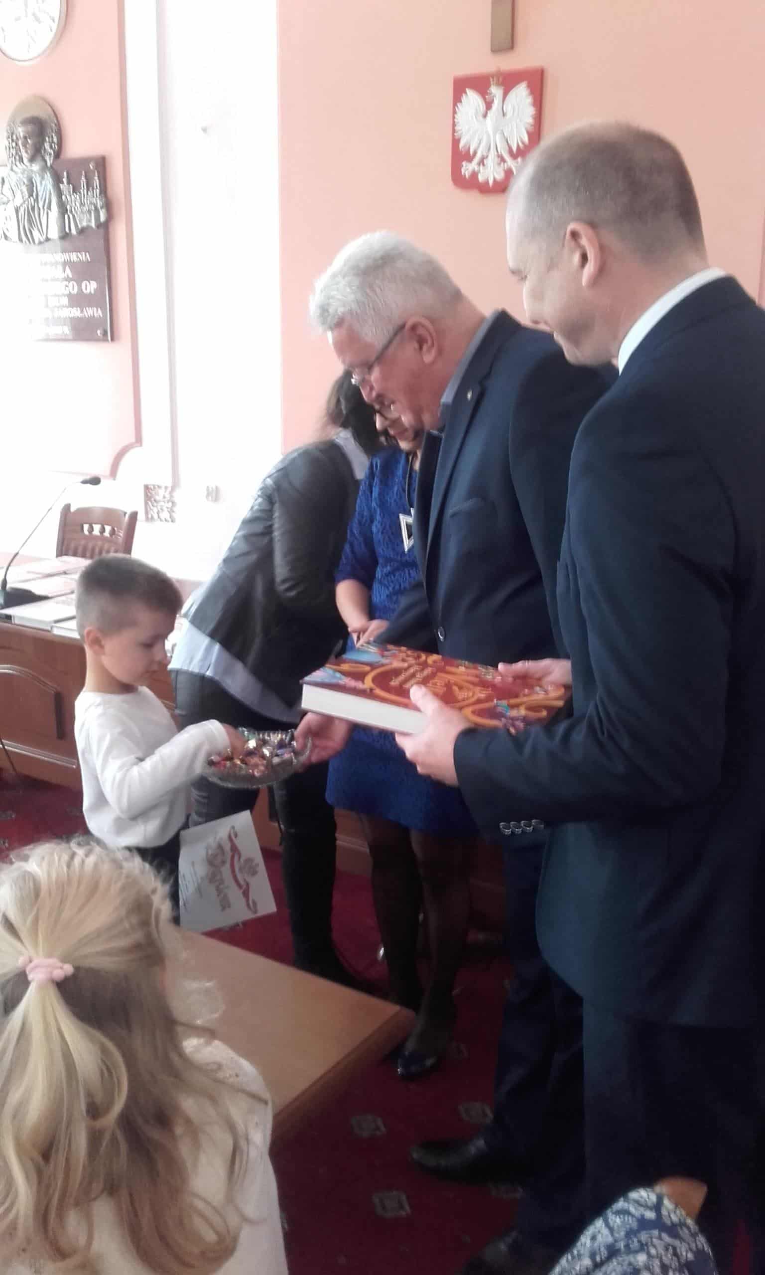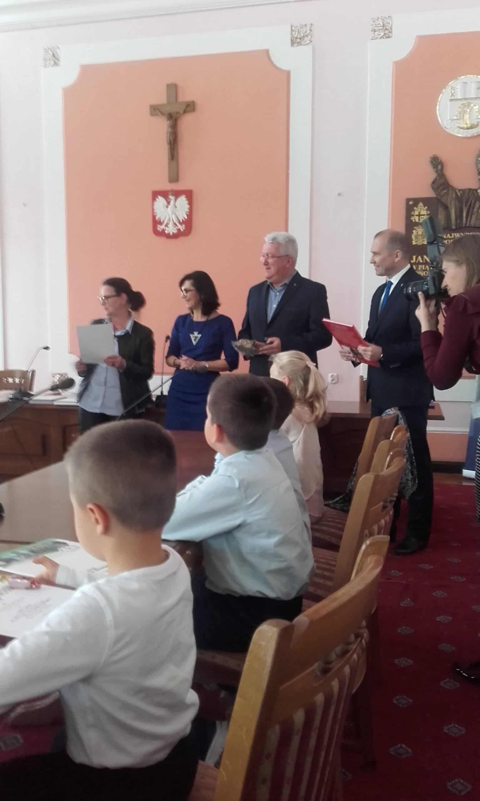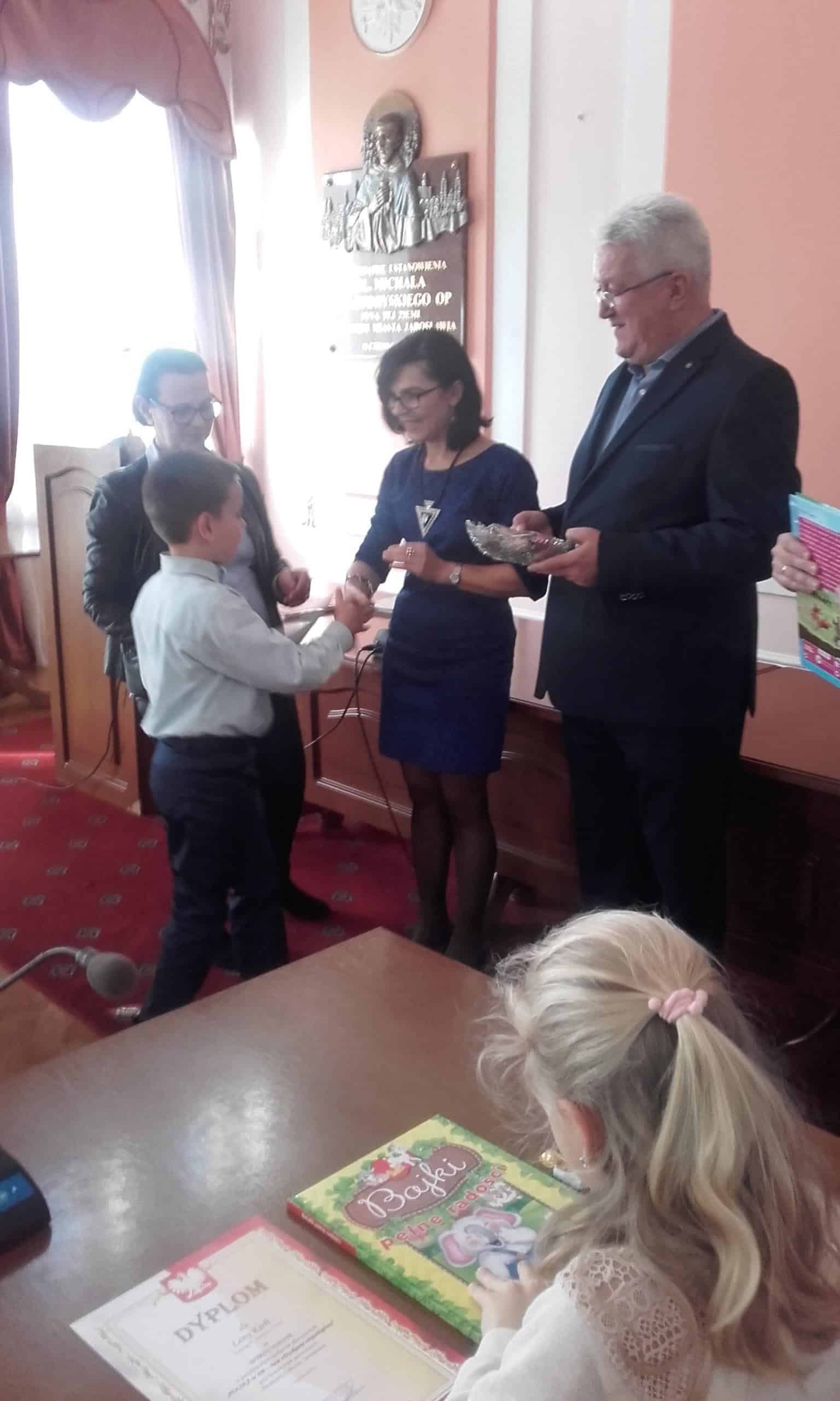 7 listopada w Urzędzie Miasta Jarosławia miała miejsce uroczystość będąca podsumowaniem konkursu plastycznego „Polska w 100- lecie odzyskania niepodległości”. Organizatorem konkursu była Szkoła Podstawowa nr 11, honorowy patronat pełnił Burmistrz Miasta Jarosławia.Celem konkursu było promowanie, rozpowszechnianie i wzmacnianie wśród dzieci wizerunku Polski, a także rozwijanie kreatywności, fantazji i wyobraźni plastycznej w odniesieniu do historii Polski w przestrzeni czasowej 1918-2018. Na konkurs wpłynęło 150 prac w trzech kategoriach wiekowych. Dzieci w przepiękny sposób używając równych technik plastycznych pokazały własną wizję Polski w 100- lecie odzyskania niepodległości. Prace były bogate w szczegóły, radosne i kolorowe, a dominującym kolorem była biel i czerwień, na co w swoim krótkim przemówieniu do dzieci zwrócił uwagę Pan Wiceburmistrz. I miejsce w tym konkursie zajął Michał Hołowacz z grupy Pomarańczowej, a wyróżnienia otrzymali również Lena Kiełt z grupy Żółtej, Mikołaj Dąbrowski z grupy Zielonej oraz Jakub Motyka z grupy Czerwonej. Jest to ogromny sukces. Laureaci otrzymali pamiątkowe dyplomy i nagrody w postaci książek oraz osobiście odebrali gratulacje z rąk Pana Wiceburmistrza, a także z rąk organizatorów konkursu. Na zakończenie wykonano pamiątkowe zdjęcia wszystkim laureatom konkursu. Serdecznie gratulujemy!