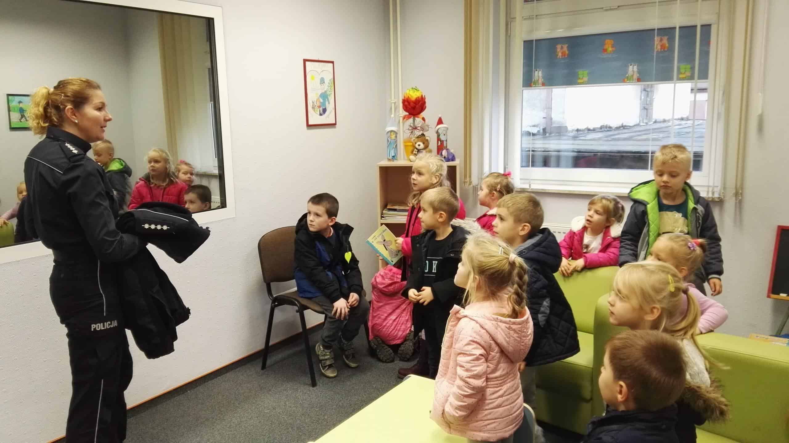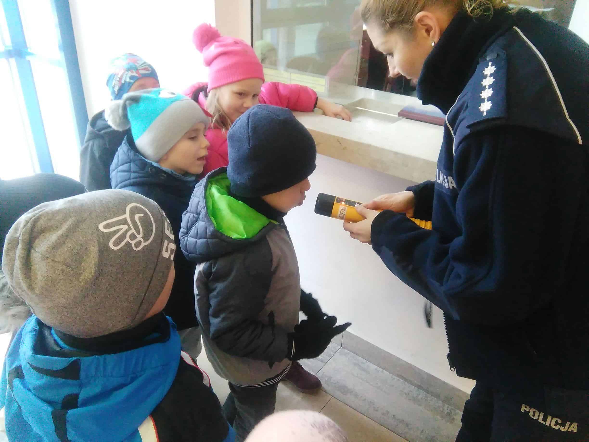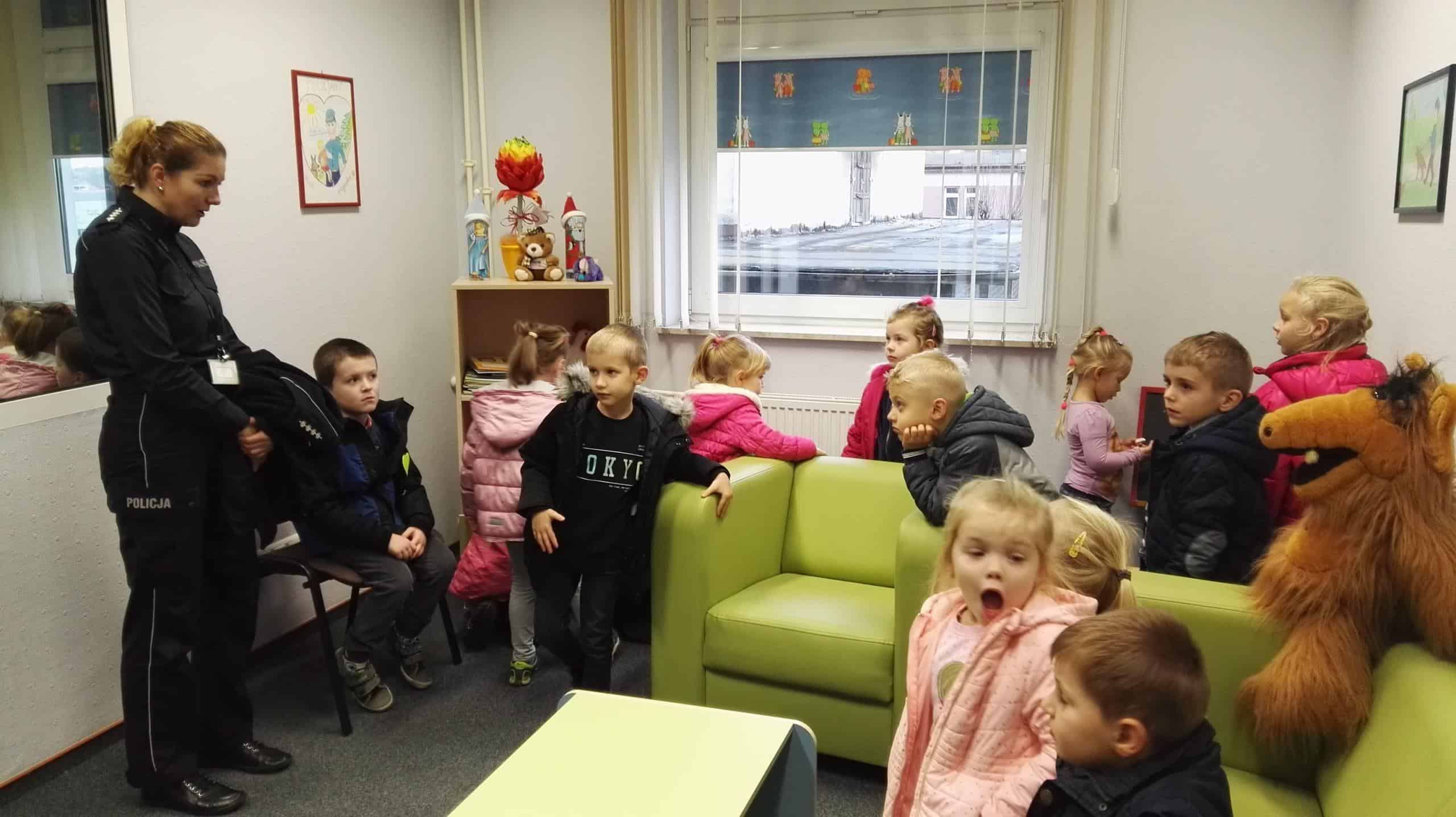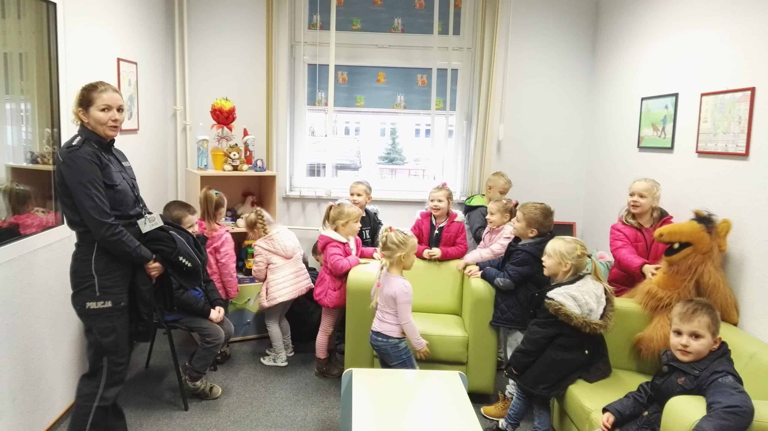W dniu 16 listopada wybraliśmy się na wycieczkę do Miejskiej Komendy Policji w Jarosławiu, gdzie dzieci miały możliwość przyjrzenia się z bliska pracy funkcjonariuszy policji oraz zwiedzenia obiektu. Pani funkcjonariusz zapoznawała dzieci z codzienną pracą policjantów oprowadzając ich po budynku komendy. W czasie spotkania dzieci zwiedziły pomieszczenia oraz zobaczyły sprzęt i wyposażenie policyjne. W tracie spaceru po komendzie przedszkolaki zwiedziły m.in. „niebieski pokój”- pokój przyjazny dzieciom, poznały zasadę działania weneckiego lustra, pokój zatrzymań i strzelnicę, a na monitorze komputera mogły obejrzeć jak wygląda cela a także obejrzały i skorzystały ze sprzętu do ćwiczeń na siłowni, na której to ćwiczą tutejsi policjanci. Dzieci dowiedziały się, kto to jest policjant dyżurny i czym się zajmuje, mogły dmuchnąć w alkomat. Dużym zainteresowaniem cieszyły się również radiowozy i motocykle wykorzystywane do codziennej służby. Każde dziecko przez chwilę mogło wczuć się w rolę policjanta i stać się pasażerem policyjnego pojazdu, zasiąść za kierownicą policyjnego samochodu oraz usłyszeć sygnały dźwiękowe, co wzbudziło najwięcej emocji. Podczas przebiegającego w miłej atmosferze spotkania dzieci zadawały mnóstwo ciekawych pytań, na które otrzymywały wyczerpujące odpowiedzi. Serdecznie dziękujemy za miłe spotkanie a przekazane treści na pewno na długo pozostaną w pamięci dzieci.