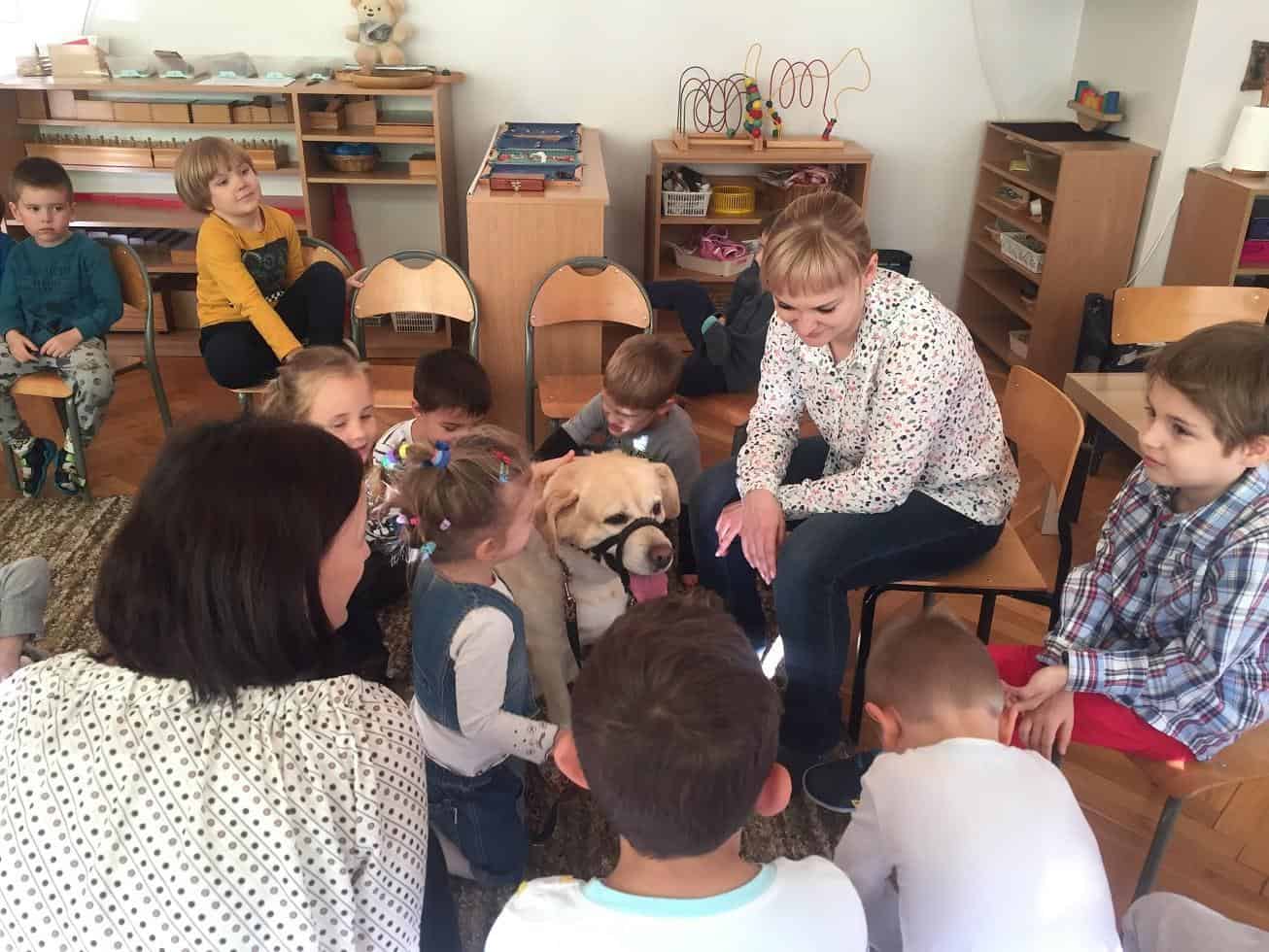Jaś przeprowadził lekcję o swoim psie, opowiadał jak się nim opiekuje, i o czynnościach pielęgnacyjnych jakie wykonuje wobec psa takich jak karmienie , szczotkowanie, dbanie o higienę własną- mycie rąk po skończonej zabawie z psem. Pokazał także dzieciom kilka wyuczonych z psem sztuczek. Jaś przypomniał dzieciom jak należy w bezpieczny sposób zachowywać się podczas przebywania i zabaw z psem.