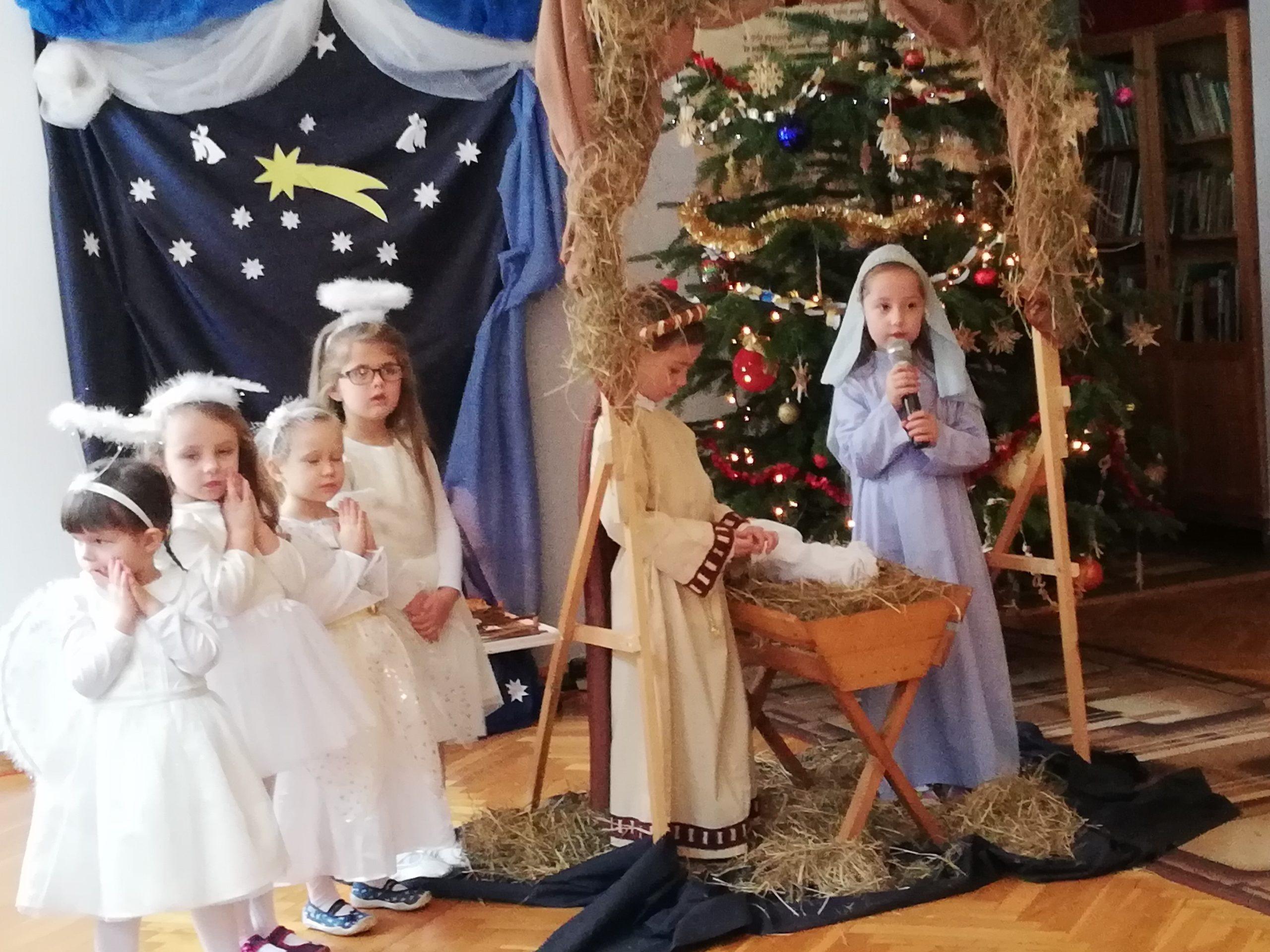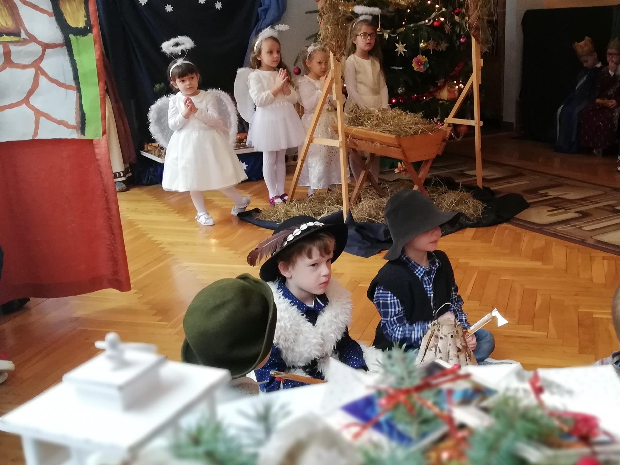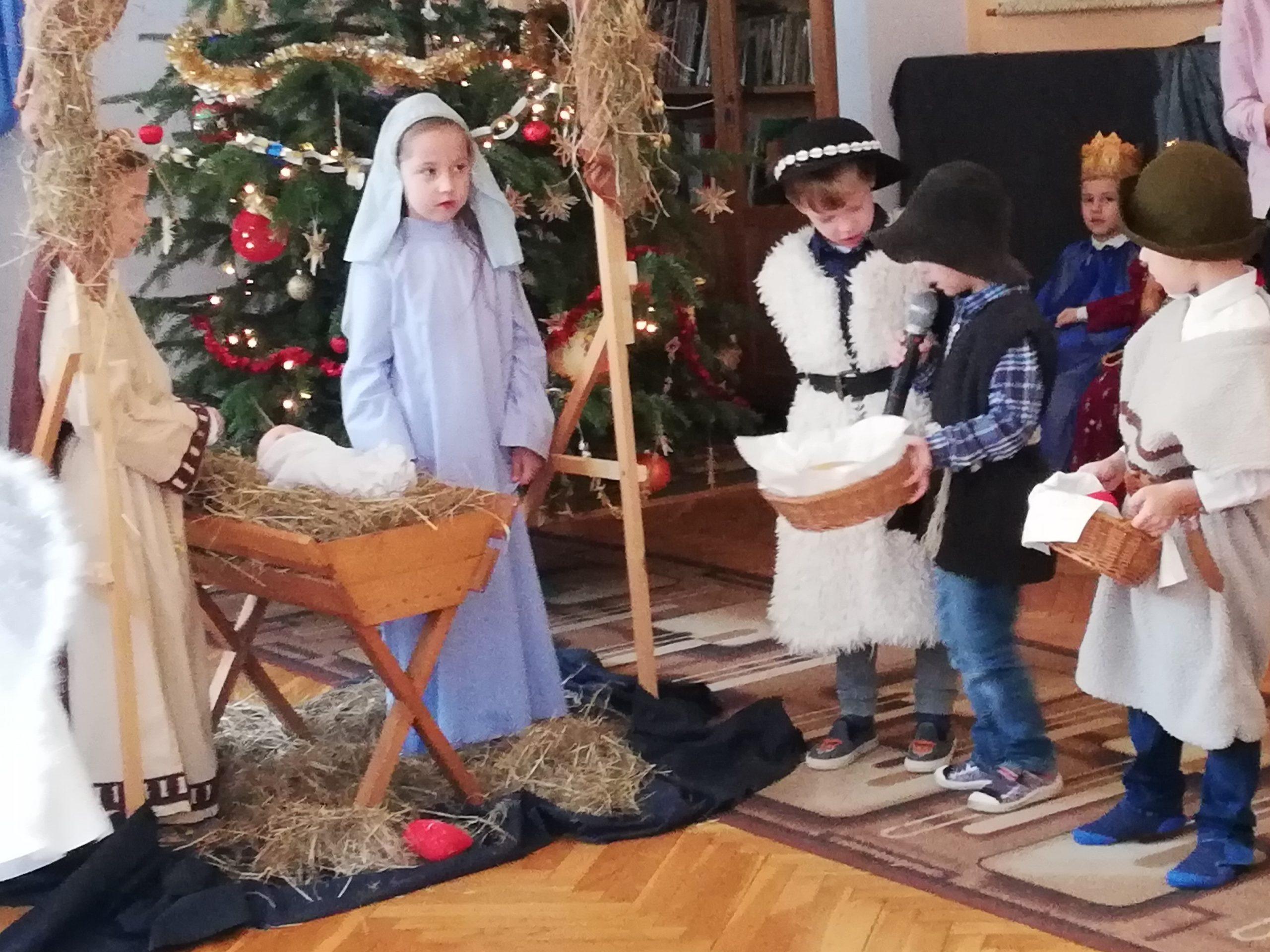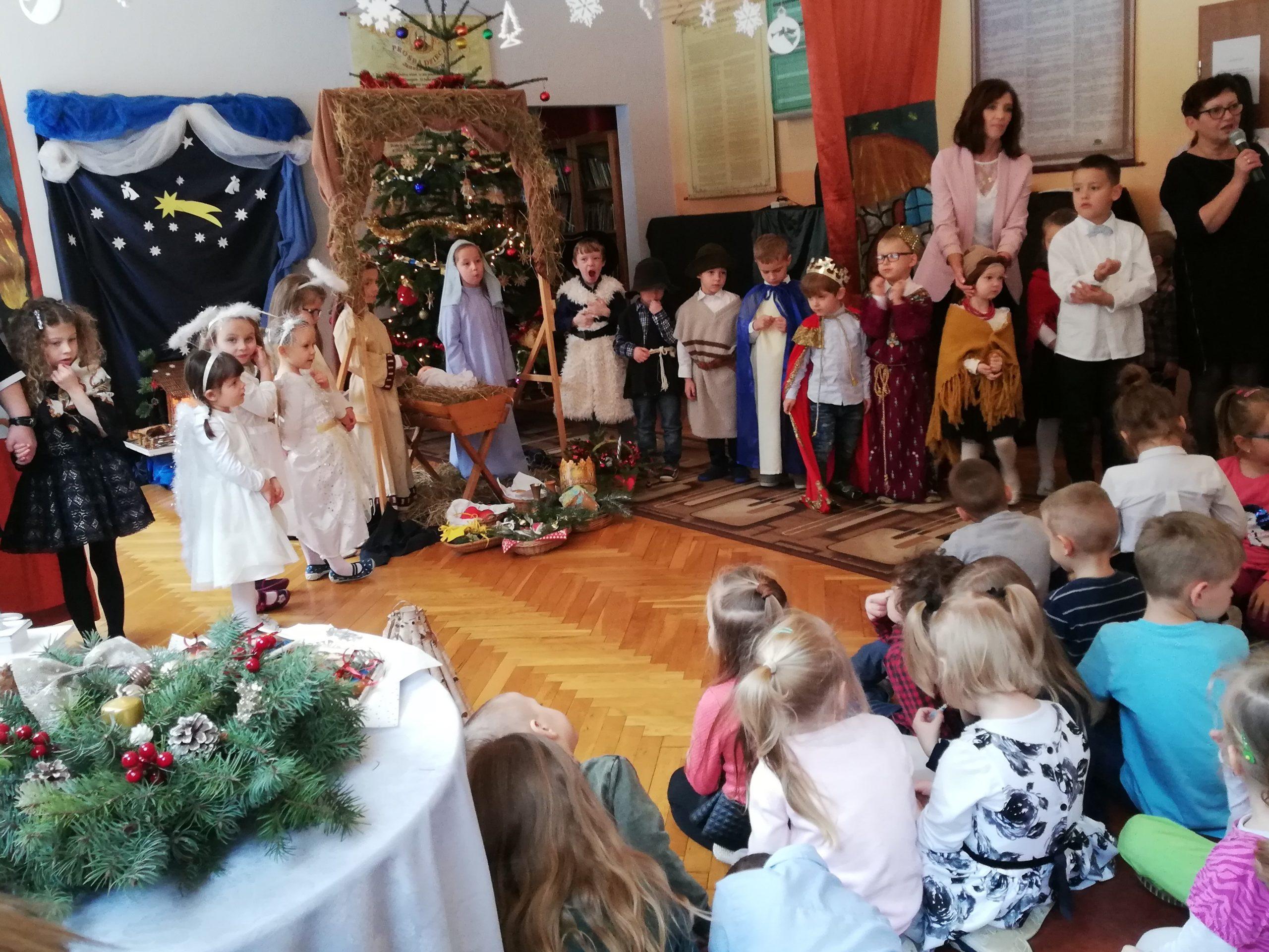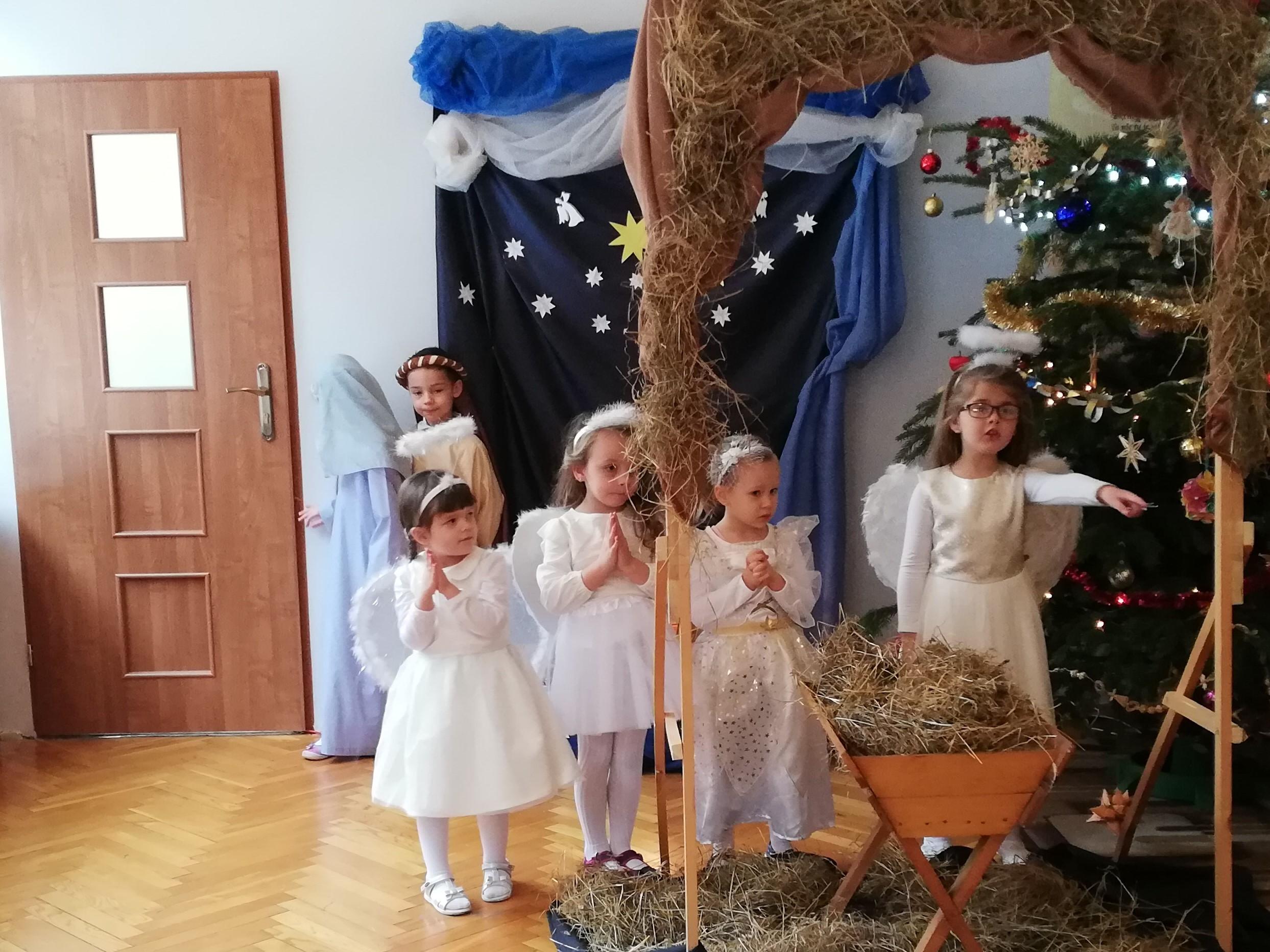 Wigilia Bożego Narodzenia to jeden z najpiękniejszych dni w roku, dlatego w naszej przedszkolnej społeczności przeżywamy go bardzo uroczyście. W tym dniu w każdej grupie, jak i w całym przedszkolu, już od samego rana panowała radosna, ożywiona atmosfera. Dzieci bardzo chętnie pomagały w przygotowaniach. Wspólnie nakrywały do stołu, ustawiały krzesła, rozkładały serwetki. O wyznaczonej godzinie wszystkie grupy zebrały się w holu naszego przedszkola, aby wziąć udział w uroczystej godzince adwentowej,przygotowanej przez Grupę Czerwoną z gościnnym udziałem niektórych przedszkolaków z Grupy Zielonej, pt. „Dziś jest dzień narodzin Pana Jezusa” przedstawionej w formie Jasełek. Aktorzy – Józef, Maryja, Aniołki, Królowie, Pasterze, Kobiety, Dzieci z poszczególnych grup, które złożyły dary u stóp Maleńkiego Jezusa, przygotowane dekoracje (żłobek, gwiazda betlejemska, szopka), wspólny śpiew najpiękniejszych polskich kolęd wprawiły wszystkich w świąteczny nastrój.