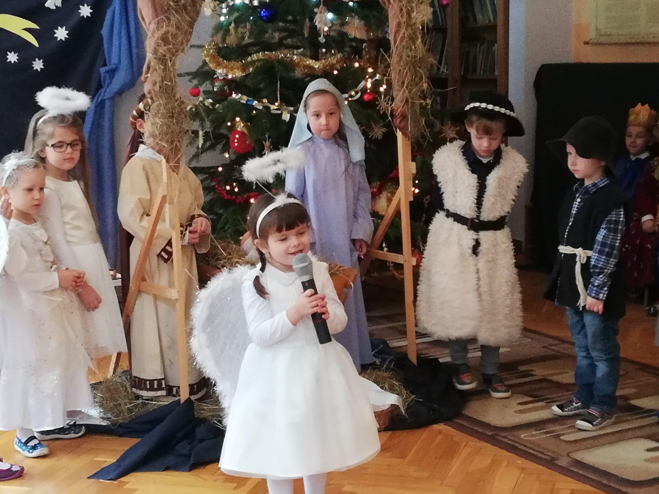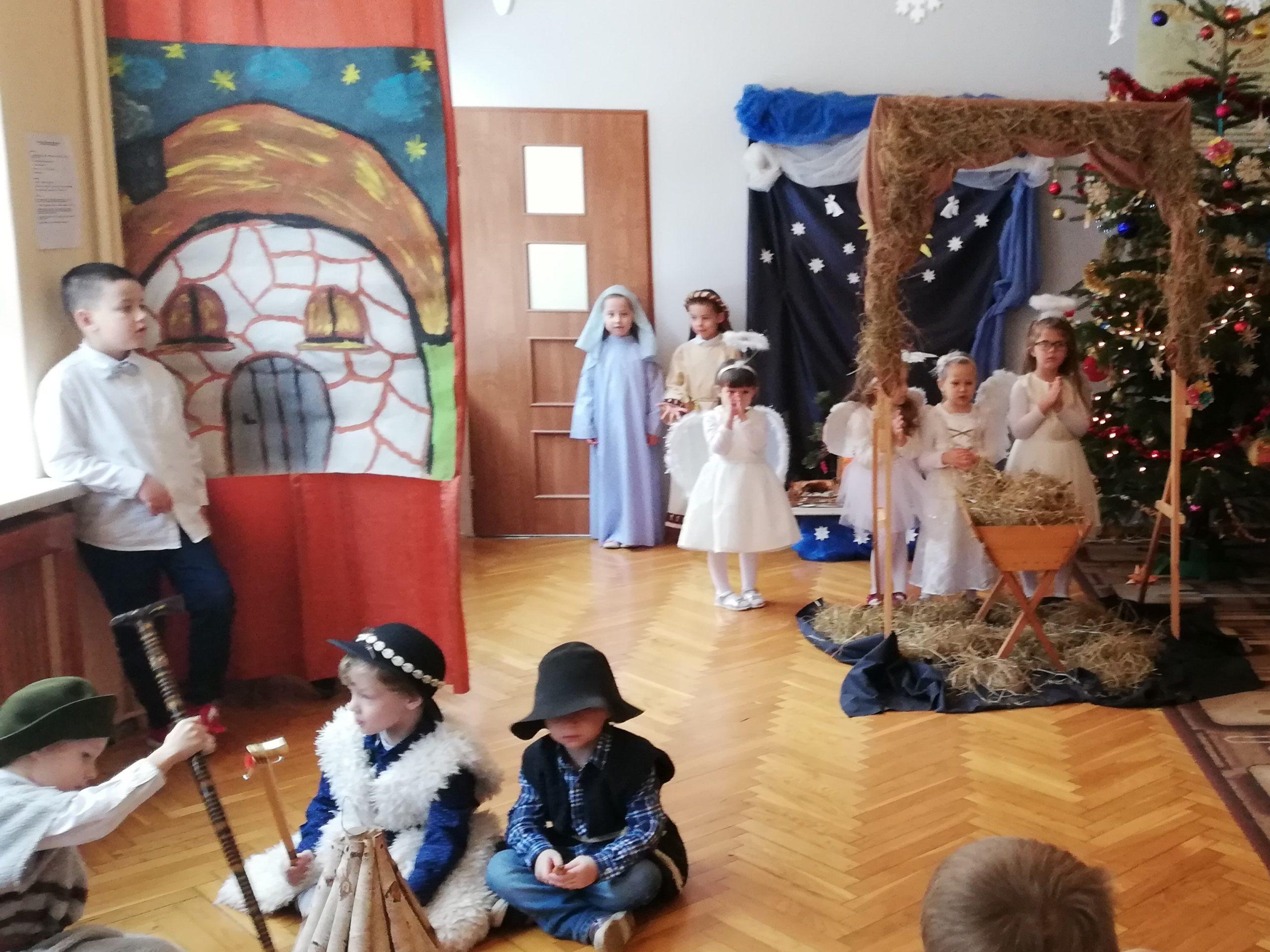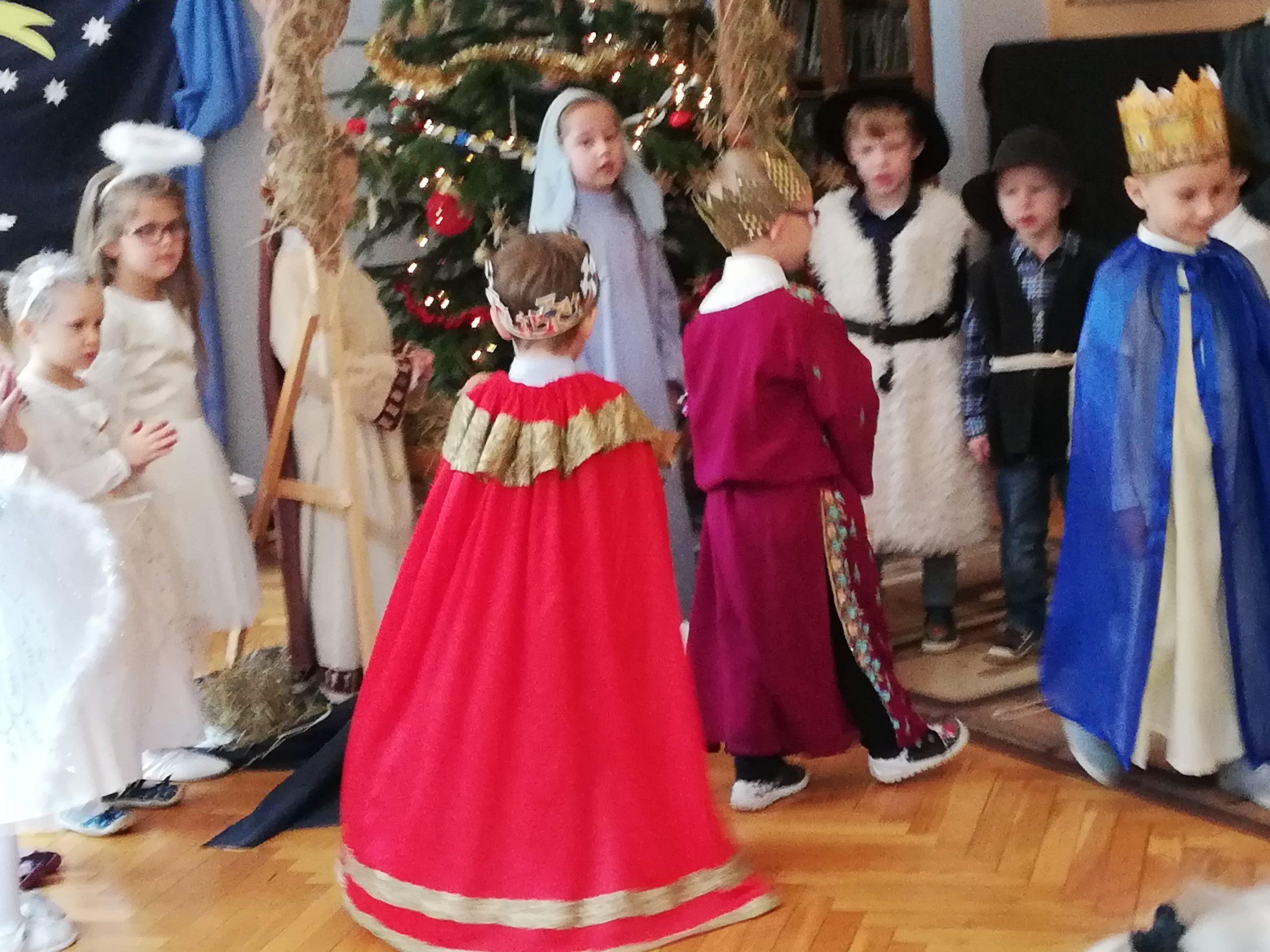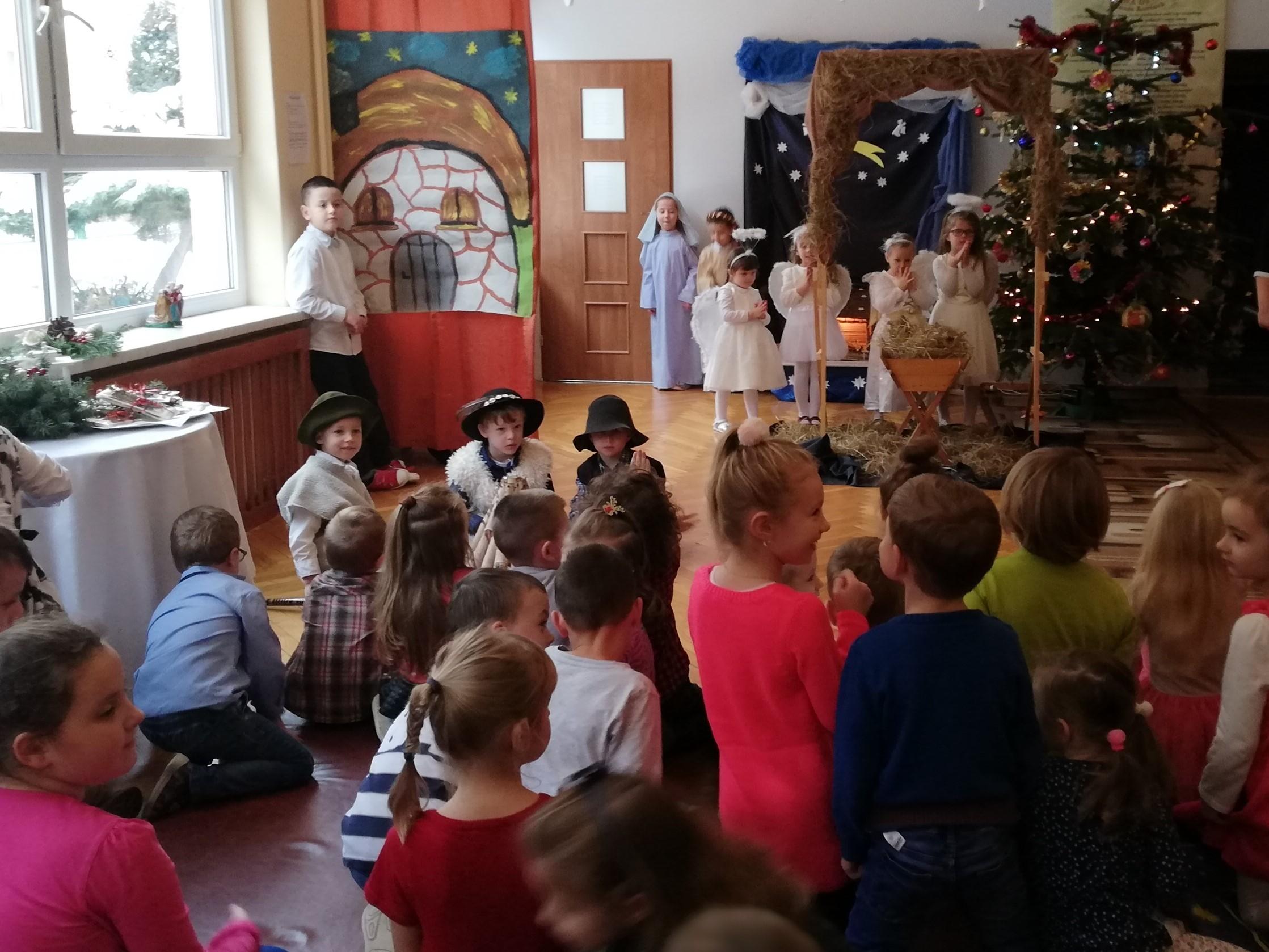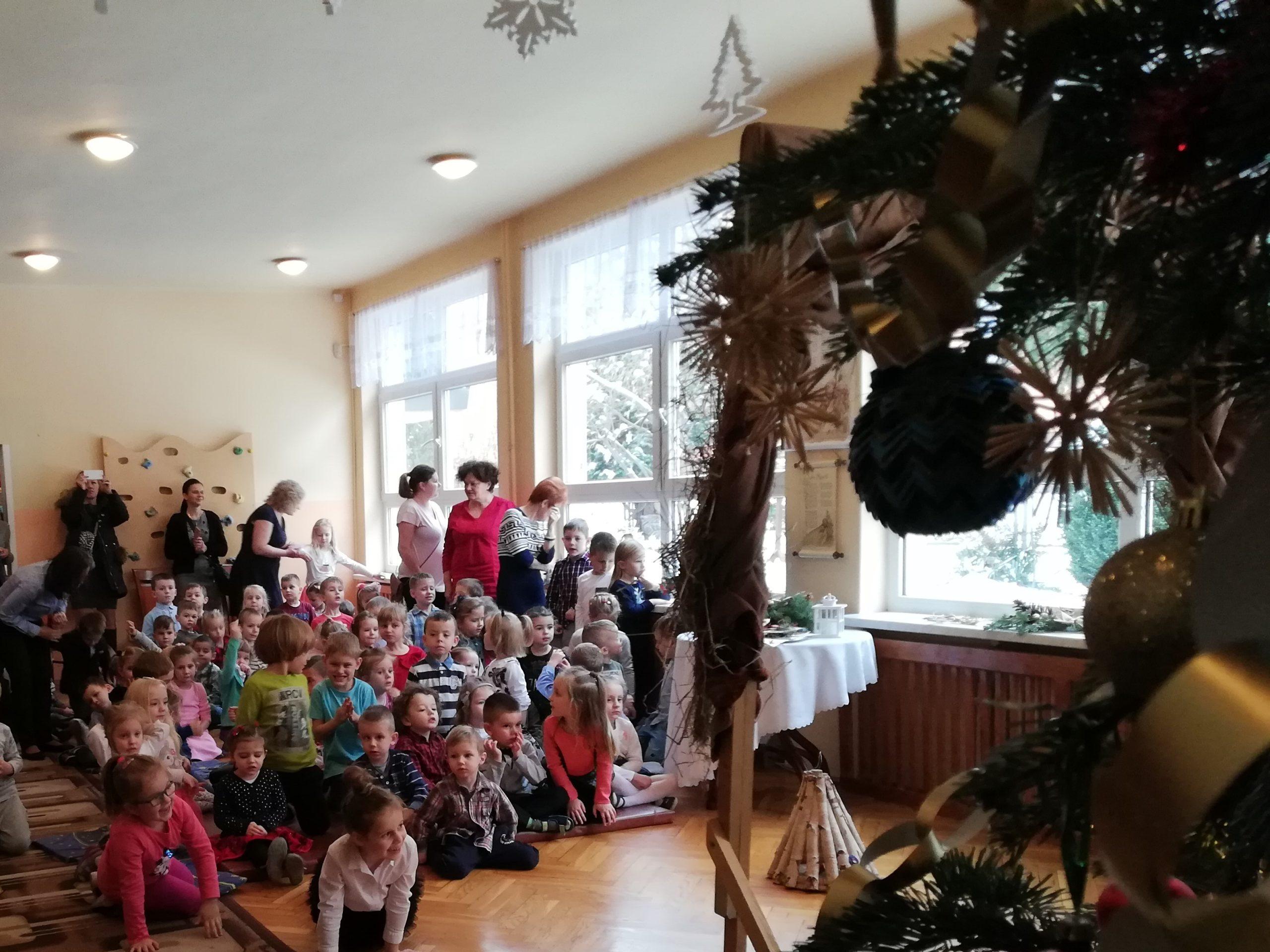 Wigilia Bożego Narodzenia to jeden z najpiękniejszych dni w roku, dlatego w naszej przedszkolnej społeczności przeżywamy go bardzo uroczyście. W tym dniu w każdej grupie, jak i w całym przedszkolu, już od samego rana panowała radosna, ożywiona atmosfera. Dzieci bardzo chętnie pomagały w przygotowaniach. Wspólnie nakrywały do stołu, ustawiały krzesła, rozkładały serwetki. O wyznaczonej godzinie wszystkie grupy zebrały się w holu naszego przedszkola, aby wziąć udział w uroczystej godzince adwentowej,przygotowanej przez Grupę Czerwoną z gościnnym udziałem niektórych przedszkolaków z Grupy Zielonej, pt. „Dziś jest dzień narodzin Pana Jezusa” przedstawionej w formie Jasełek. Aktorzy – Józef, Maryja, Aniołki, Królowie, Pasterze, Kobiety, Dzieci z poszczególnych grup, które złożyły dary u stóp Maleńkiego Jezusa, przygotowane dekoracje (żłobek, gwiazda betlejemska, szopka), wspólny śpiew najpiękniejszych polskich kolęd wprawiły wszystkich w świąteczny nastrój.