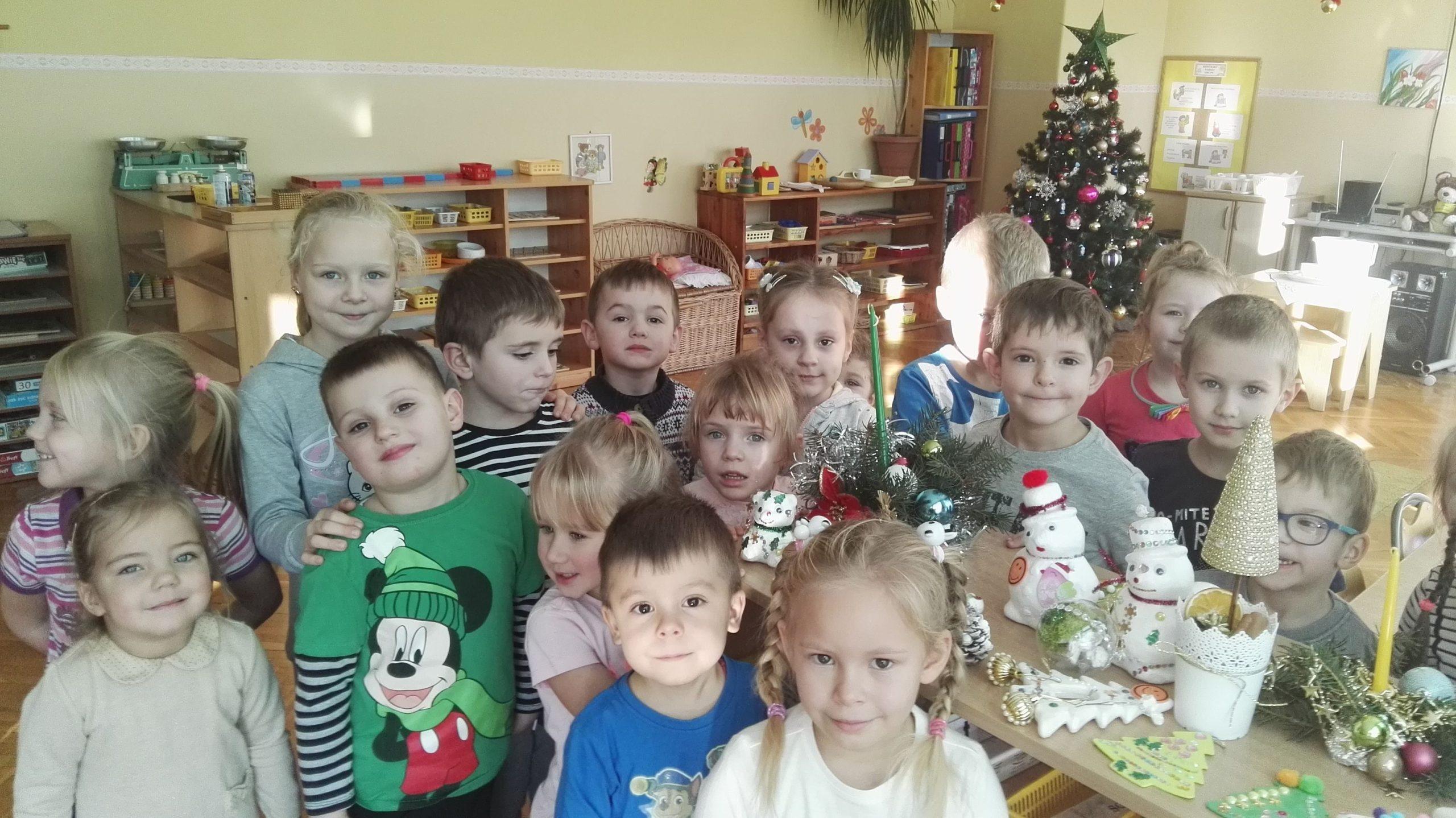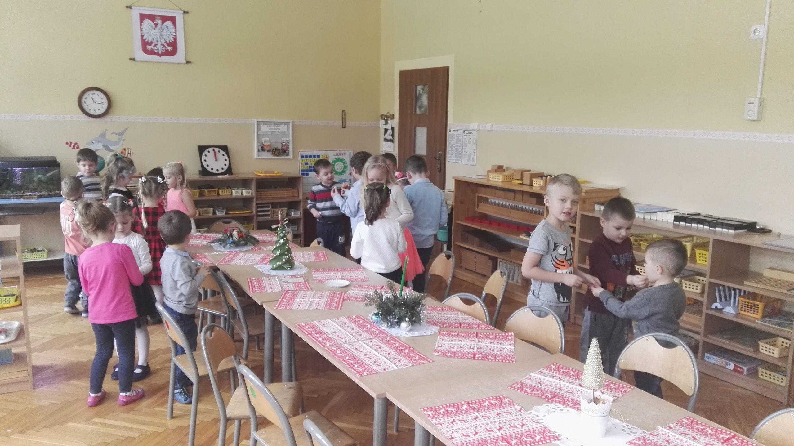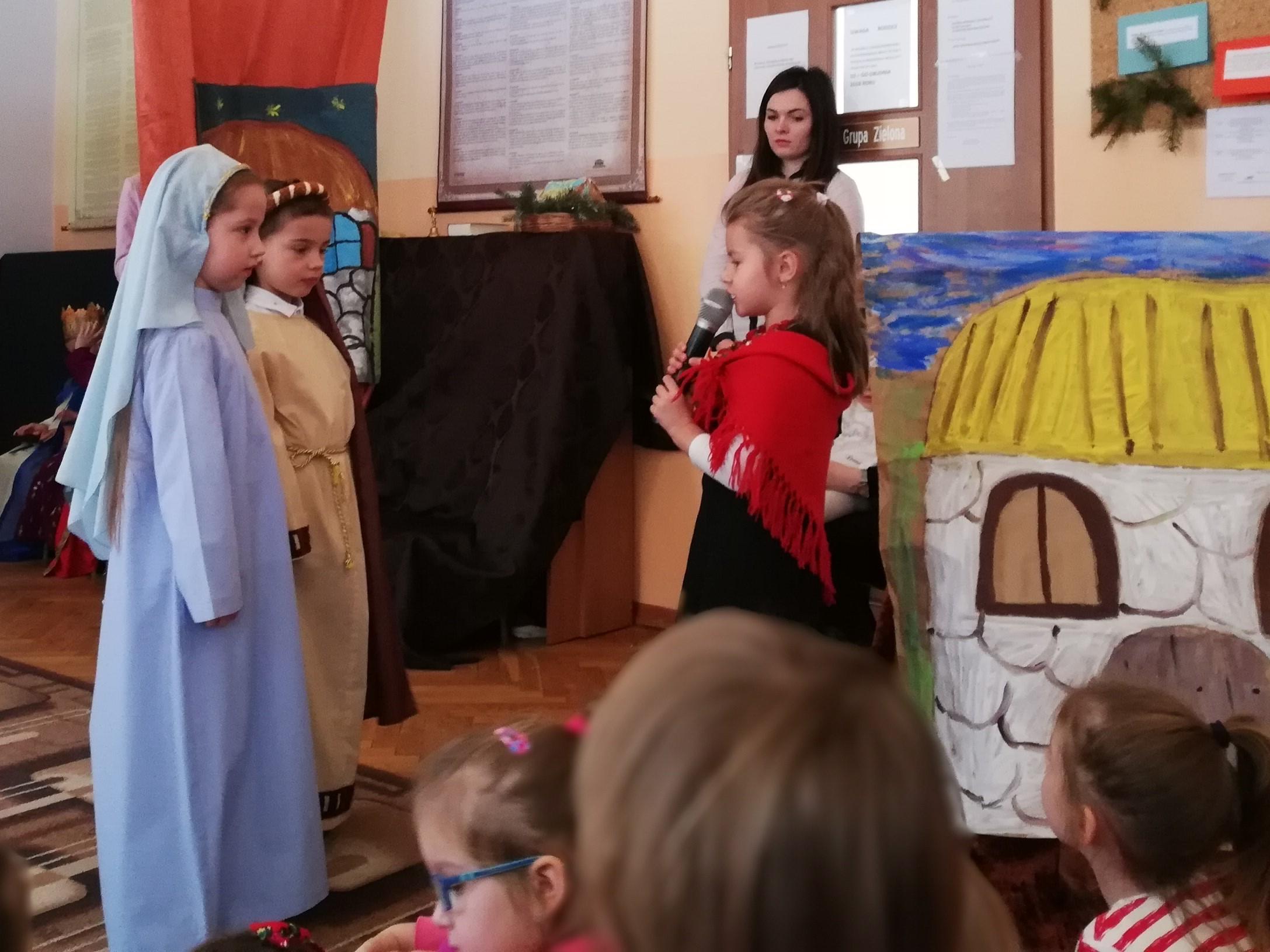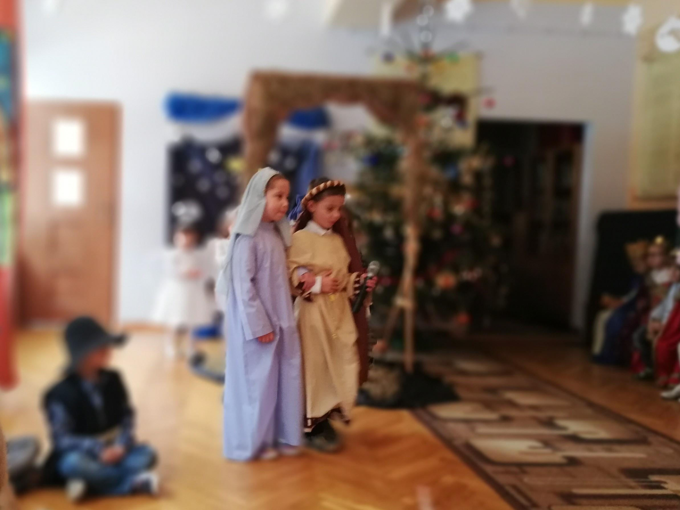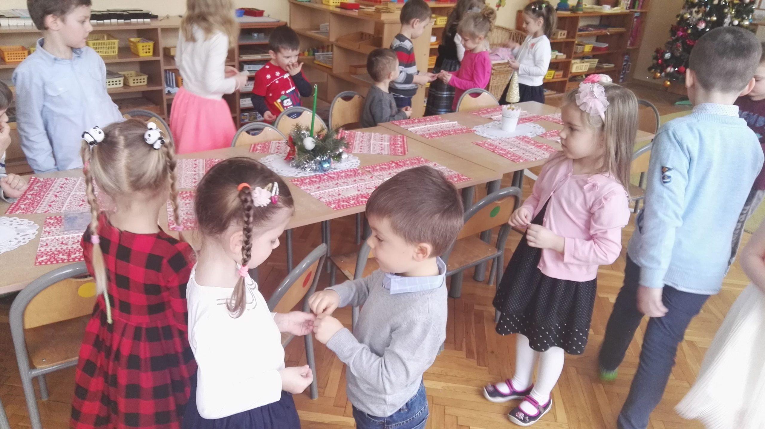 Wigilia Bożego Narodzenia to jeden z najpiękniejszych dni w roku, dlatego w naszej przedszkolnej społeczności przeżywamy go bardzo uroczyście. W tym dniu w każdej grupie, jak i w całym przedszkolu, już od samego rana panowała radosna, ożywiona atmosfera. Dzieci bardzo chętnie pomagały w przygotowaniach. Wspólnie nakrywały do stołu, ustawiały krzesła, rozkładały serwetki. O wyznaczonej godzinie wszystkie grupy zebrały się w holu naszego przedszkola, aby wziąć udział w uroczystej godzince adwentowej,przygotowanej przez Grupę Czerwoną z gościnnym udziałem niektórych przedszkolaków z Grupy Zielonej, pt. „Dziś jest dzień narodzin Pana Jezusa” przedstawionej w formie Jasełek. Aktorzy – Józef, Maryja, Aniołki, Królowie, Pasterze, Kobiety, Dzieci z poszczególnych grup, które złożyły dary u stóp Maleńkiego Jezusa, przygotowane dekoracje (żłobek, gwiazda betlejemska, szopka), wspólny śpiew najpiękniejszych polskich kolęd wprawiły wszystkich w świąteczny nastrój.