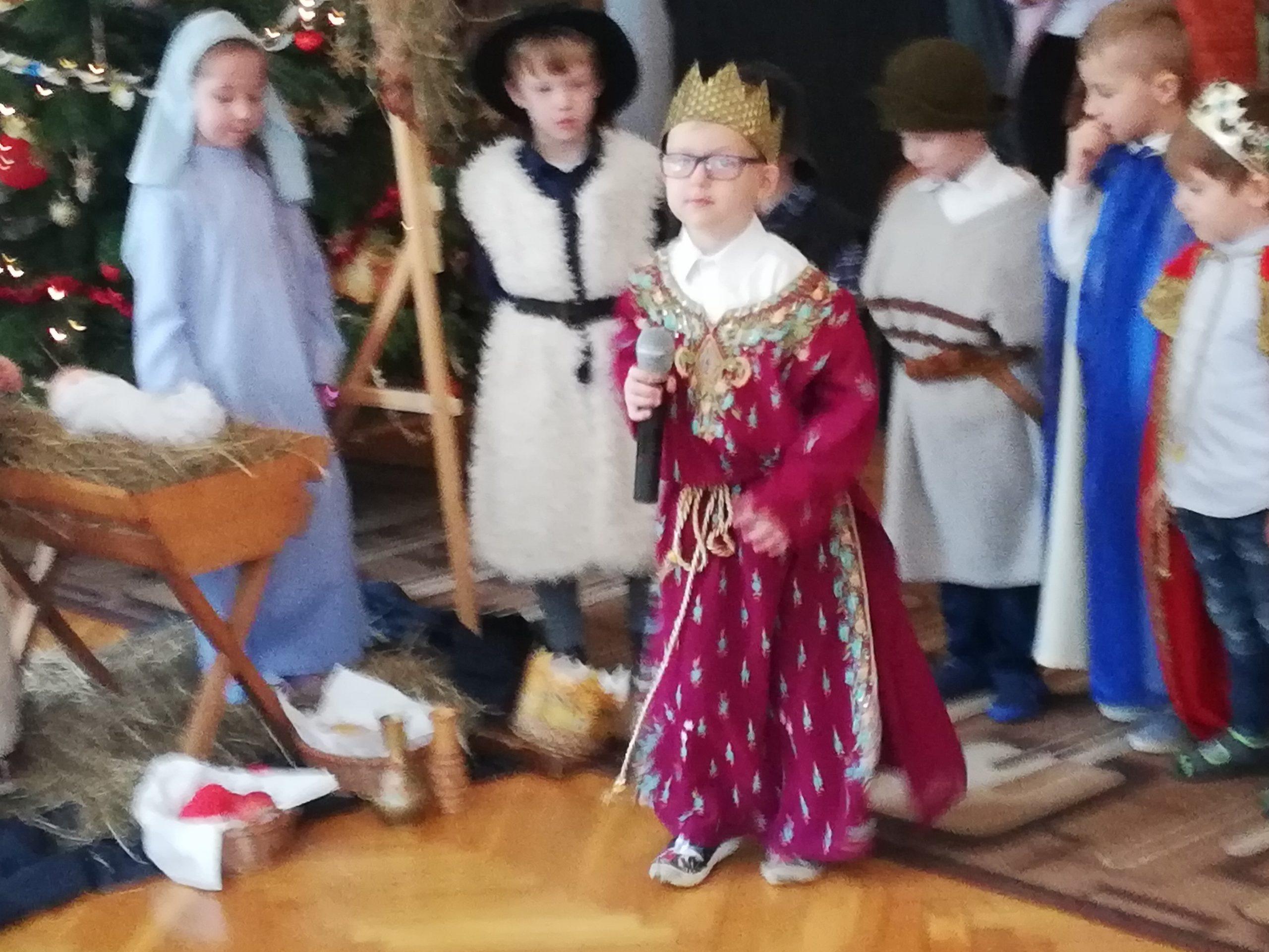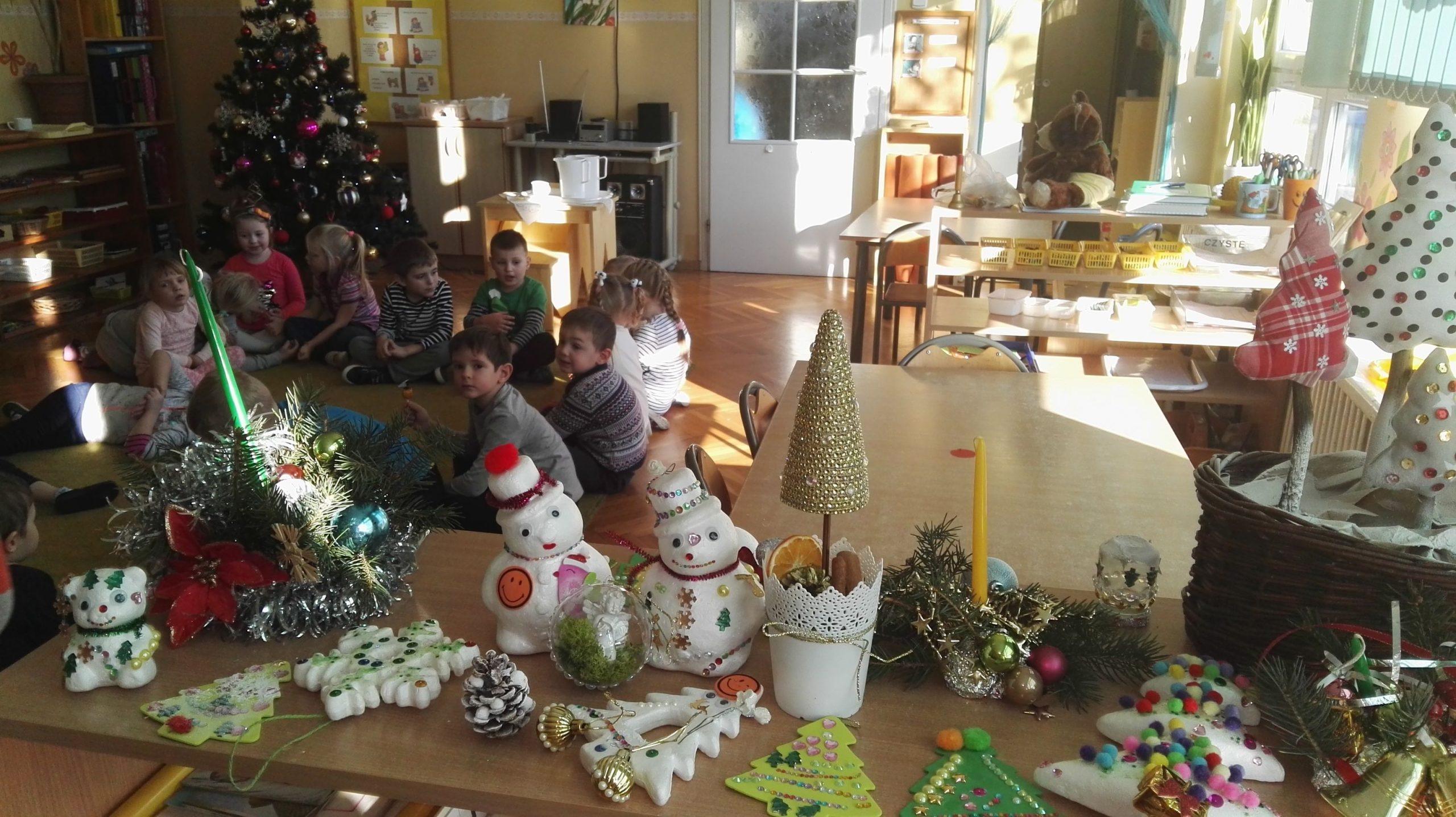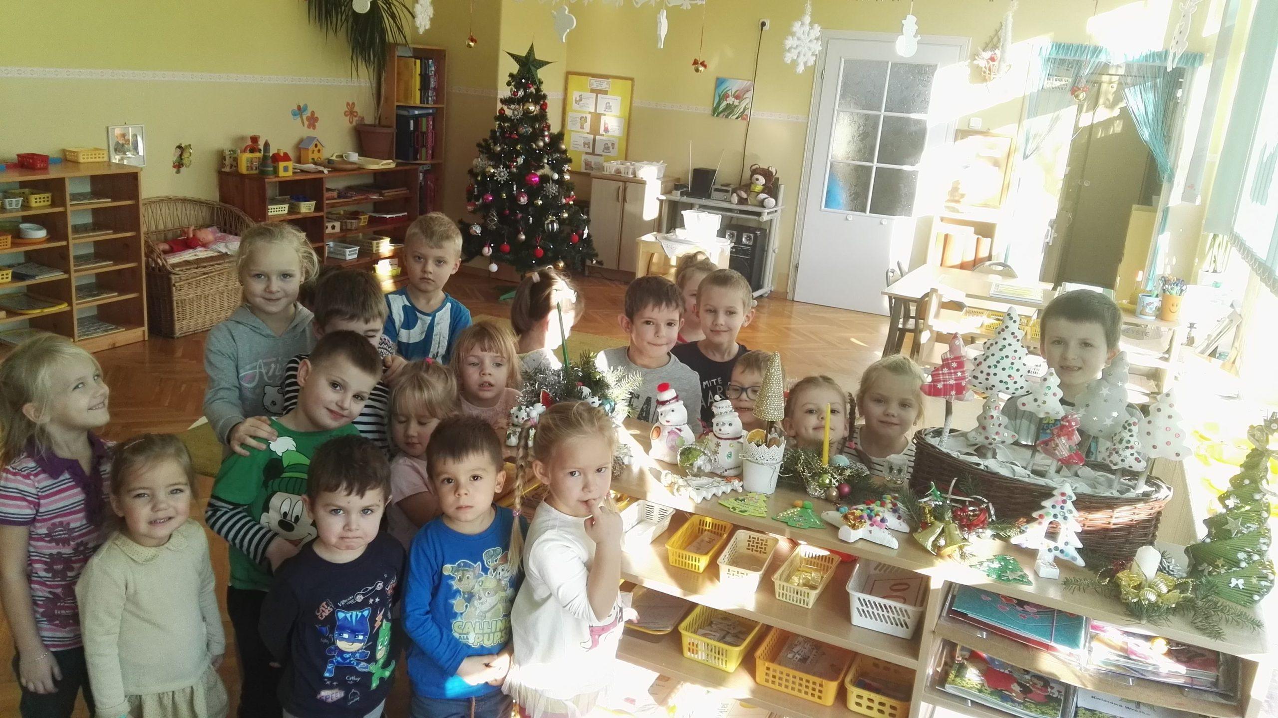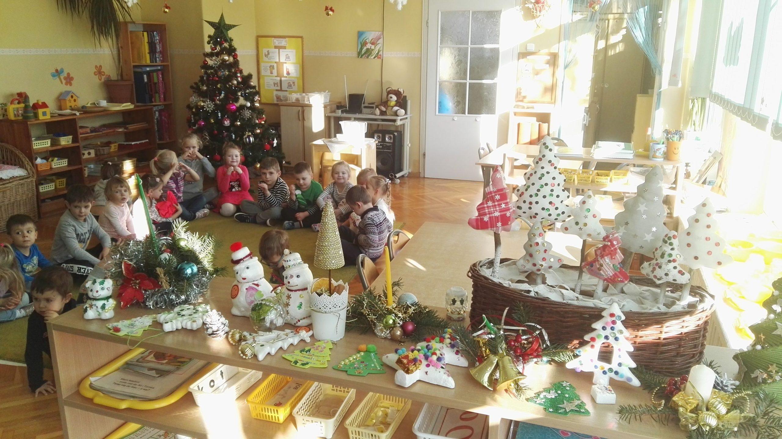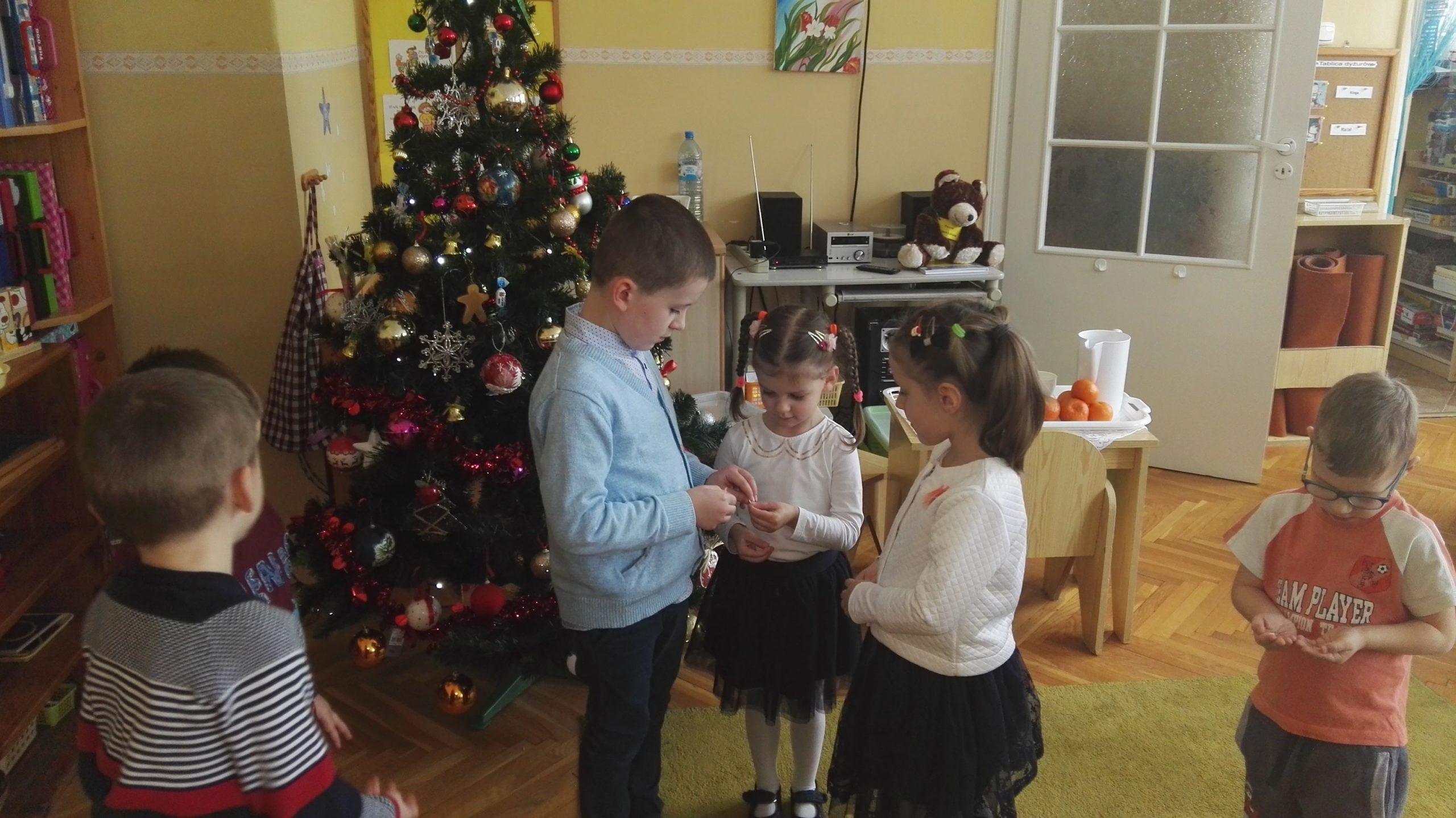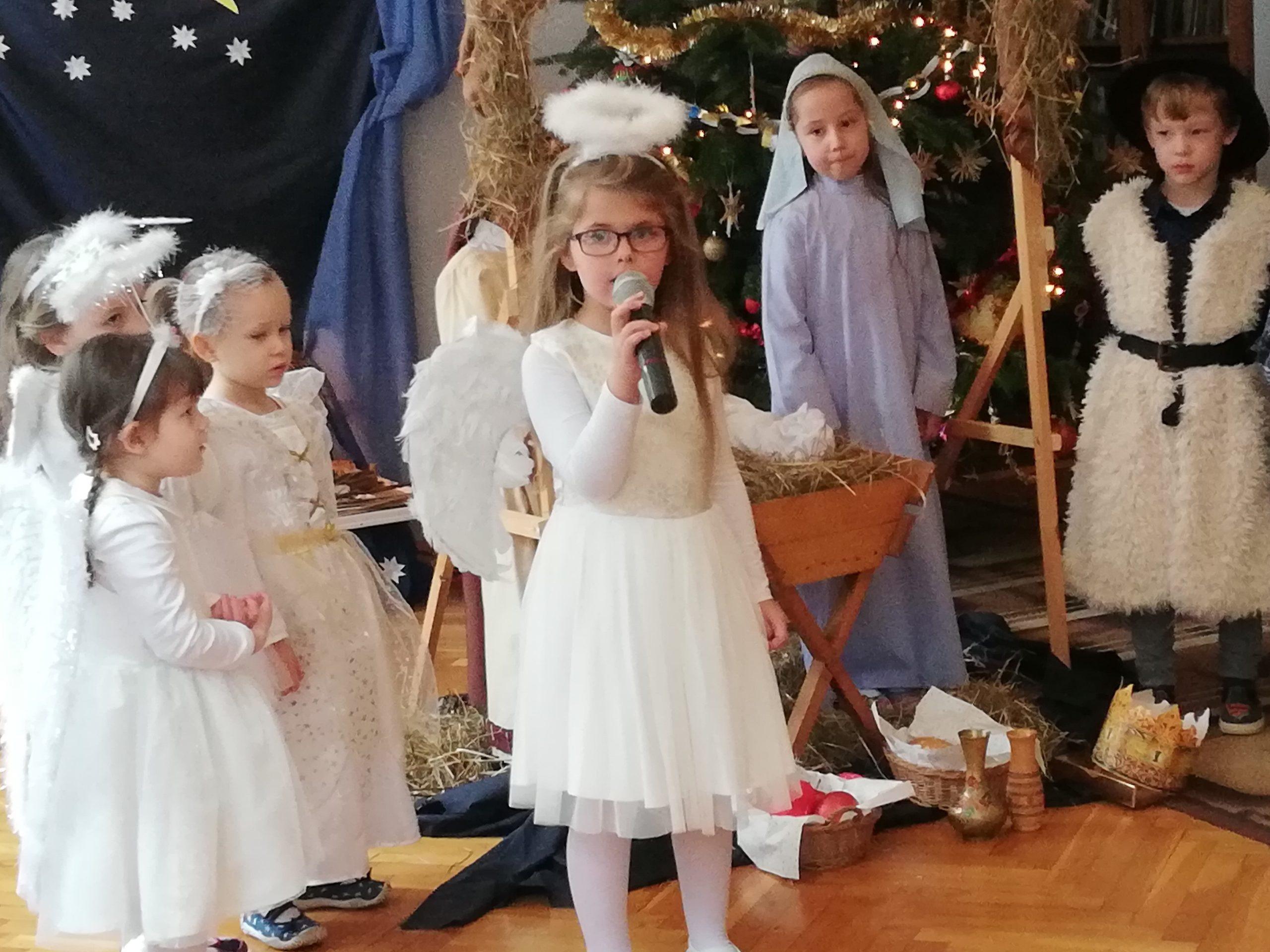 Wigilia Bożego Narodzenia to jeden z najpiękniejszych dni w roku, dlatego w naszej przedszkolnej społeczności przeżywamy go bardzo uroczyście. W tym dniu w każdej grupie, jak i w całym przedszkolu, już od samego rana panowała radosna, ożywiona atmosfera. Dzieci bardzo chętnie pomagały w przygotowaniach. Wspólnie nakrywały do stołu, ustawiały krzesła, rozkładały serwetki. O wyznaczonej godzinie wszystkie grupy zebrały się w holu naszego przedszkola, aby wziąć udział w uroczystej godzince adwentowej,przygotowanej przez Grupę Czerwoną z gościnnym udziałem niektórych przedszkolaków z Grupy Zielonej, pt. „Dziś jest dzień narodzin Pana Jezusa” przedstawionej w formie Jasełek. Aktorzy – Józef, Maryja, Aniołki, Królowie, Pasterze, Kobiety, Dzieci z poszczególnych grup, które złożyły dary u stóp Maleńkiego Jezusa, przygotowane dekoracje (żłobek, gwiazda betlejemska, szopka), wspólny śpiew najpiękniejszych polskich kolęd wprawiły wszystkich w świąteczny nastrój.