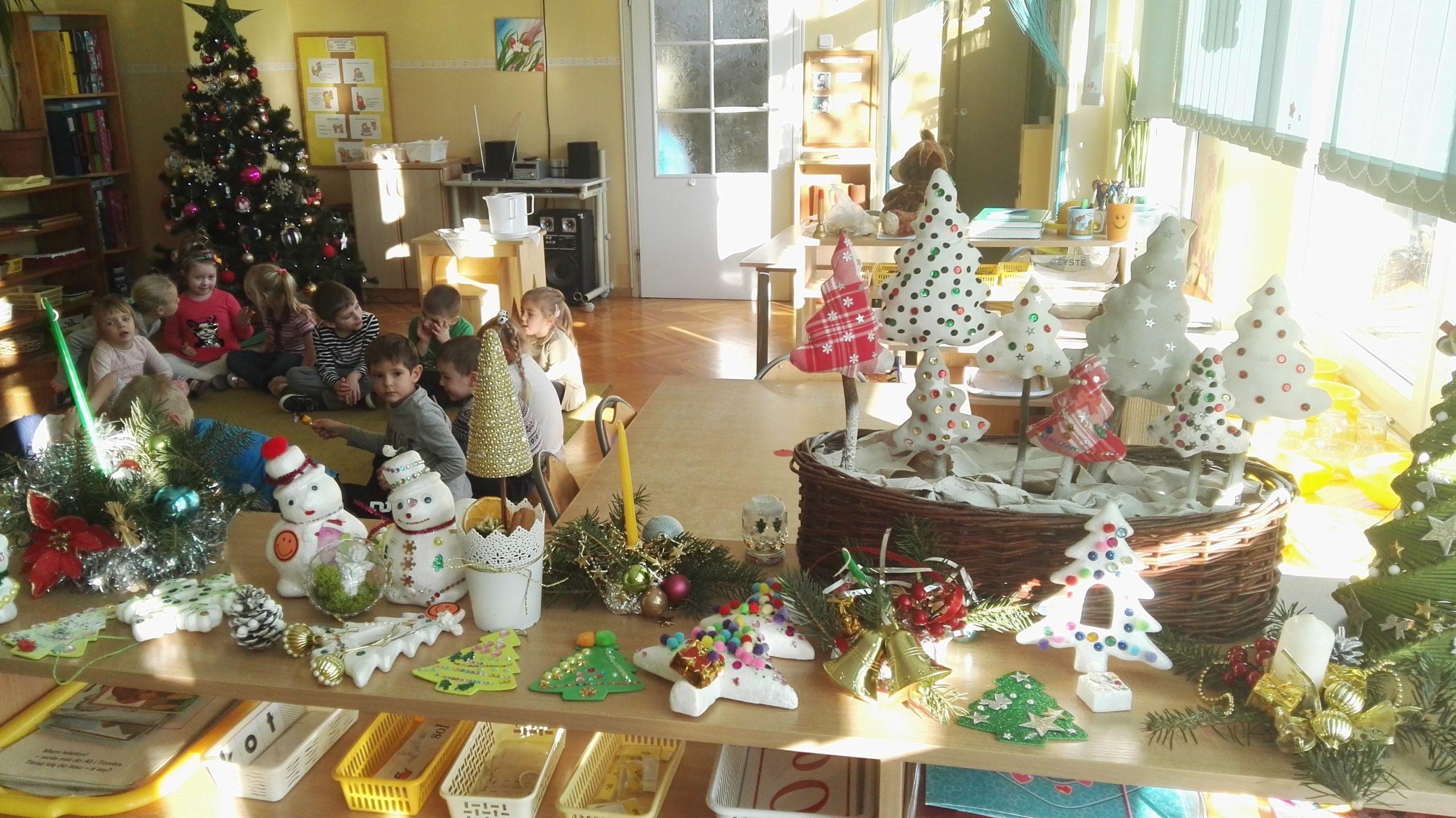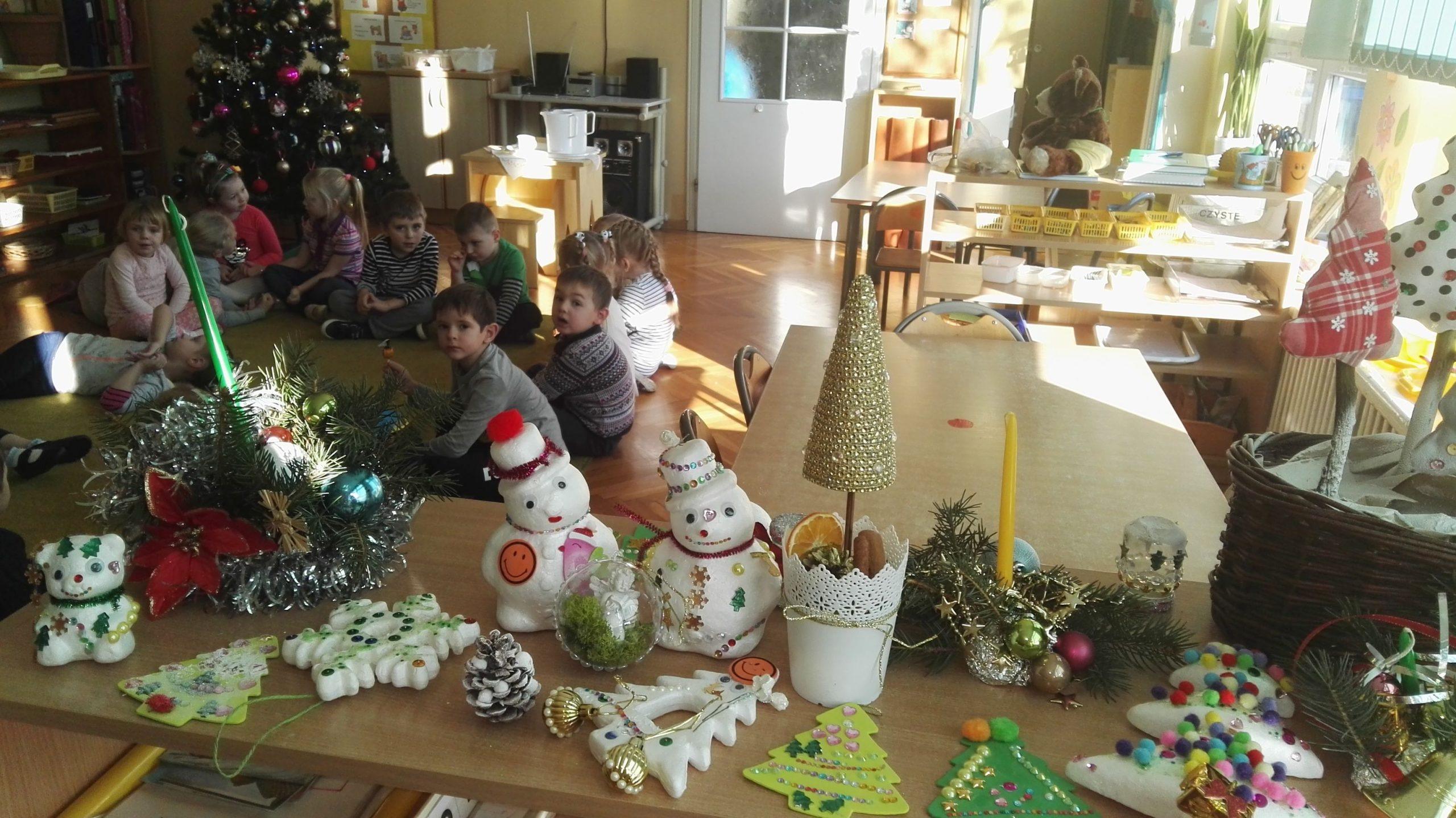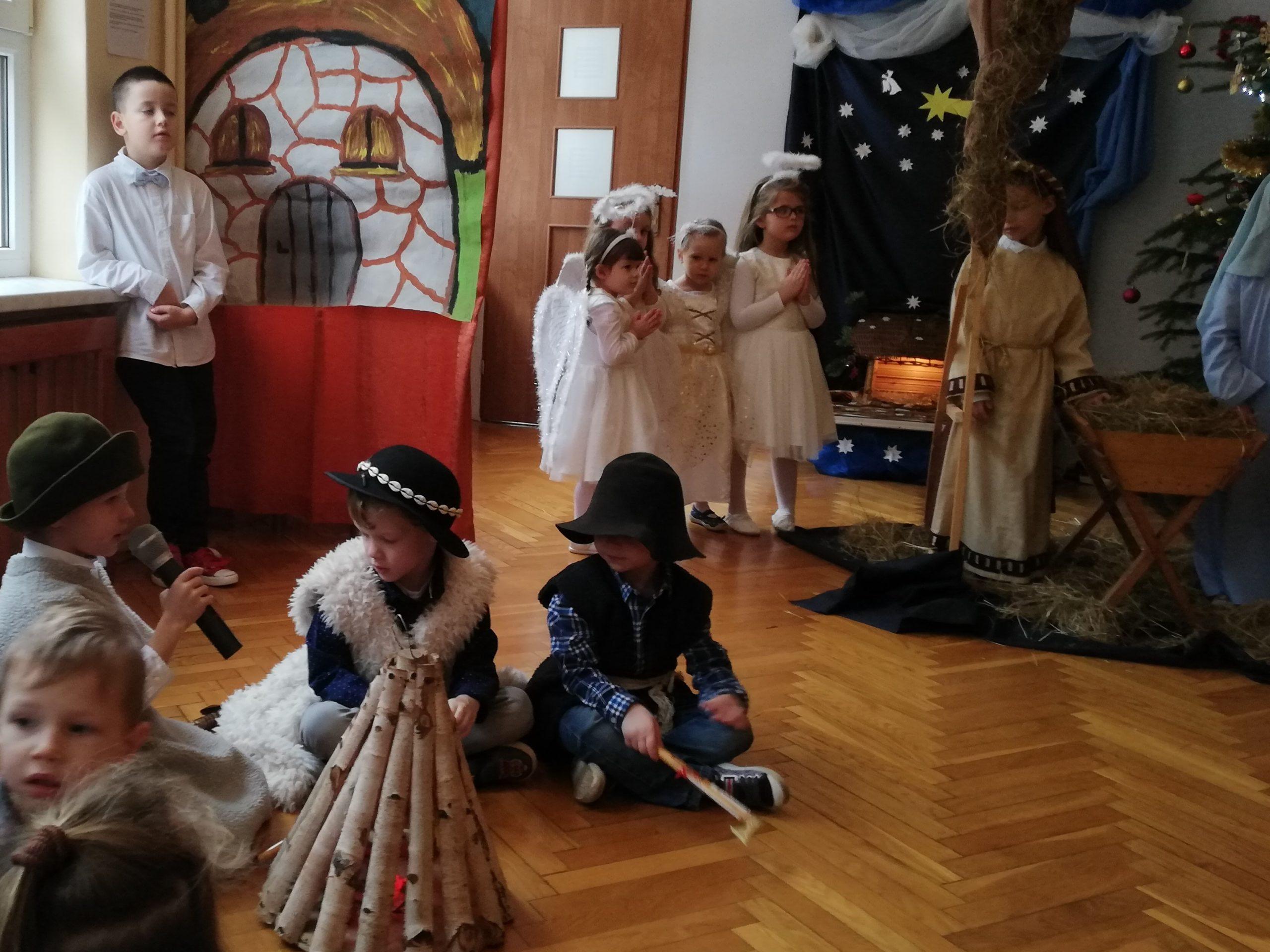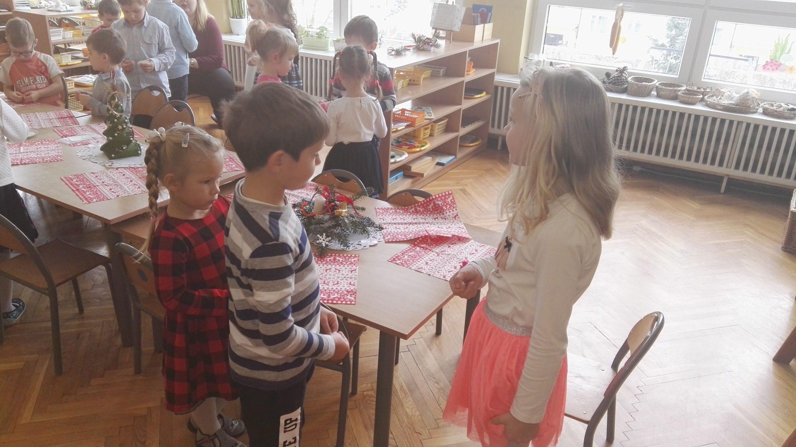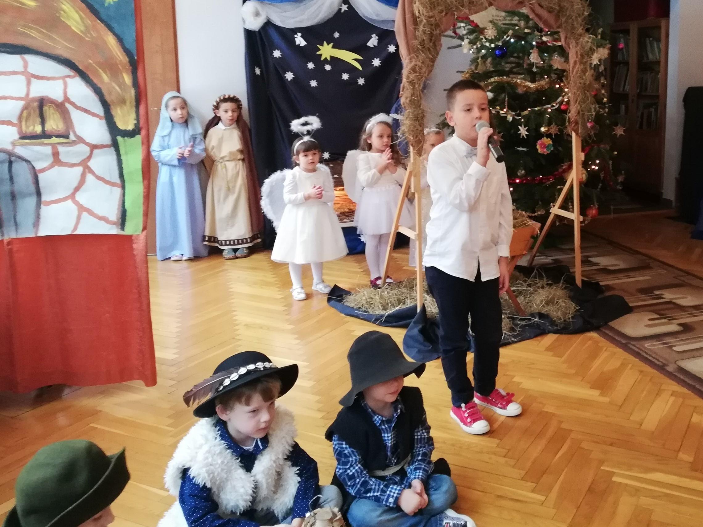 Wigilia Bożego Narodzenia to jeden z najpiękniejszych dni w roku, dlatego w naszej przedszkolnej społeczności przeżywamy go bardzo uroczyście. W tym dniu w każdej grupie, jak i w całym przedszkolu, już od samego rana panowała radosna, ożywiona atmosfera. Dzieci bardzo chętnie pomagały w przygotowaniach. Wspólnie nakrywały do stołu, ustawiały krzesła, rozkładały serwetki. O wyznaczonej godzinie wszystkie grupy zebrały się w holu naszego przedszkola, aby wziąć udział w uroczystej godzince adwentowej,przygotowanej przez Grupę Czerwoną z gościnnym udziałem niektórych przedszkolaków z Grupy Zielonej, pt. „Dziś jest dzień narodzin Pana Jezusa” przedstawionej w formie Jasełek. Aktorzy – Józef, Maryja, Aniołki, Królowie, Pasterze, Kobiety, Dzieci z poszczególnych grup, które złożyły dary u stóp Maleńkiego Jezusa, przygotowane dekoracje (żłobek, gwiazda betlejemska, szopka), wspólny śpiew najpiękniejszych polskich kolęd wprawiły wszystkich w świąteczny nastrój.
