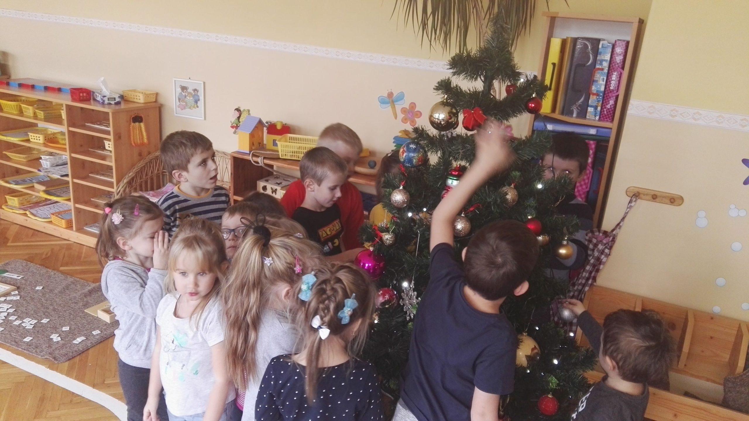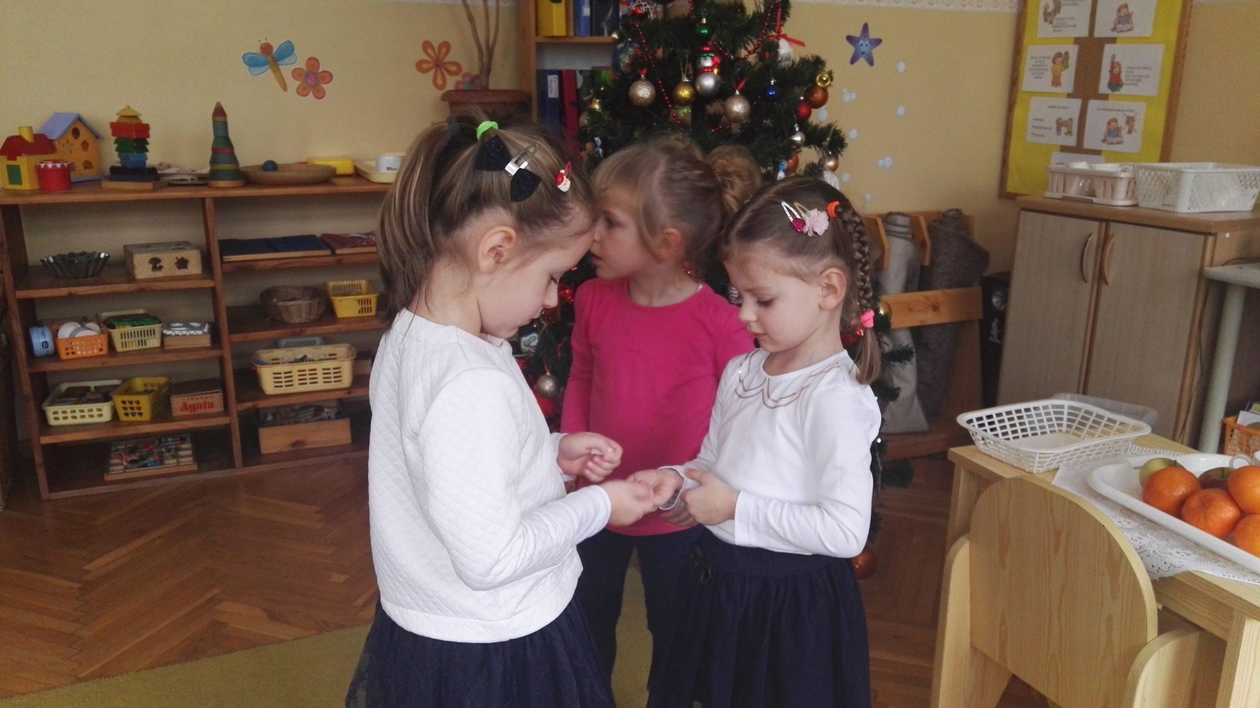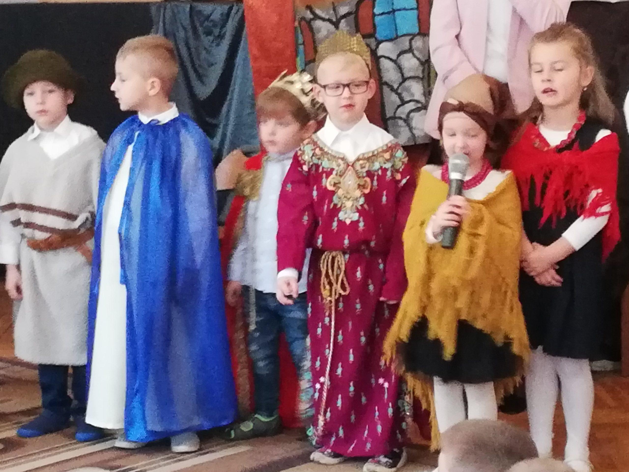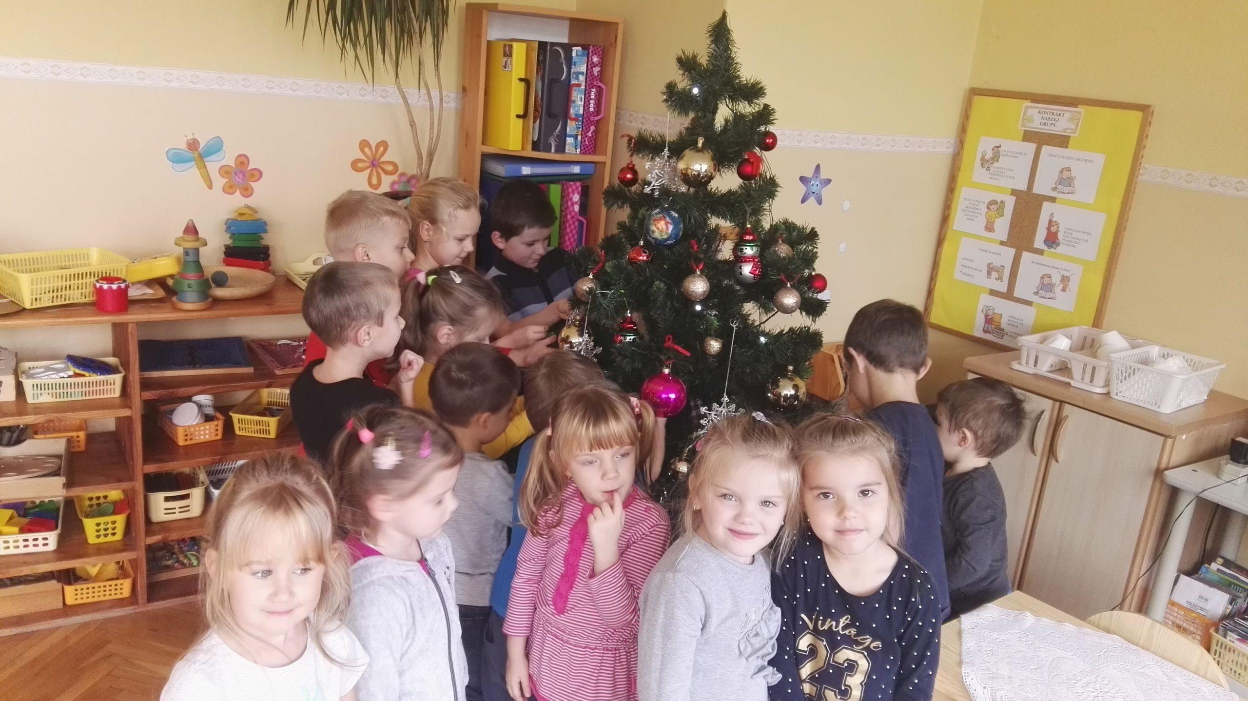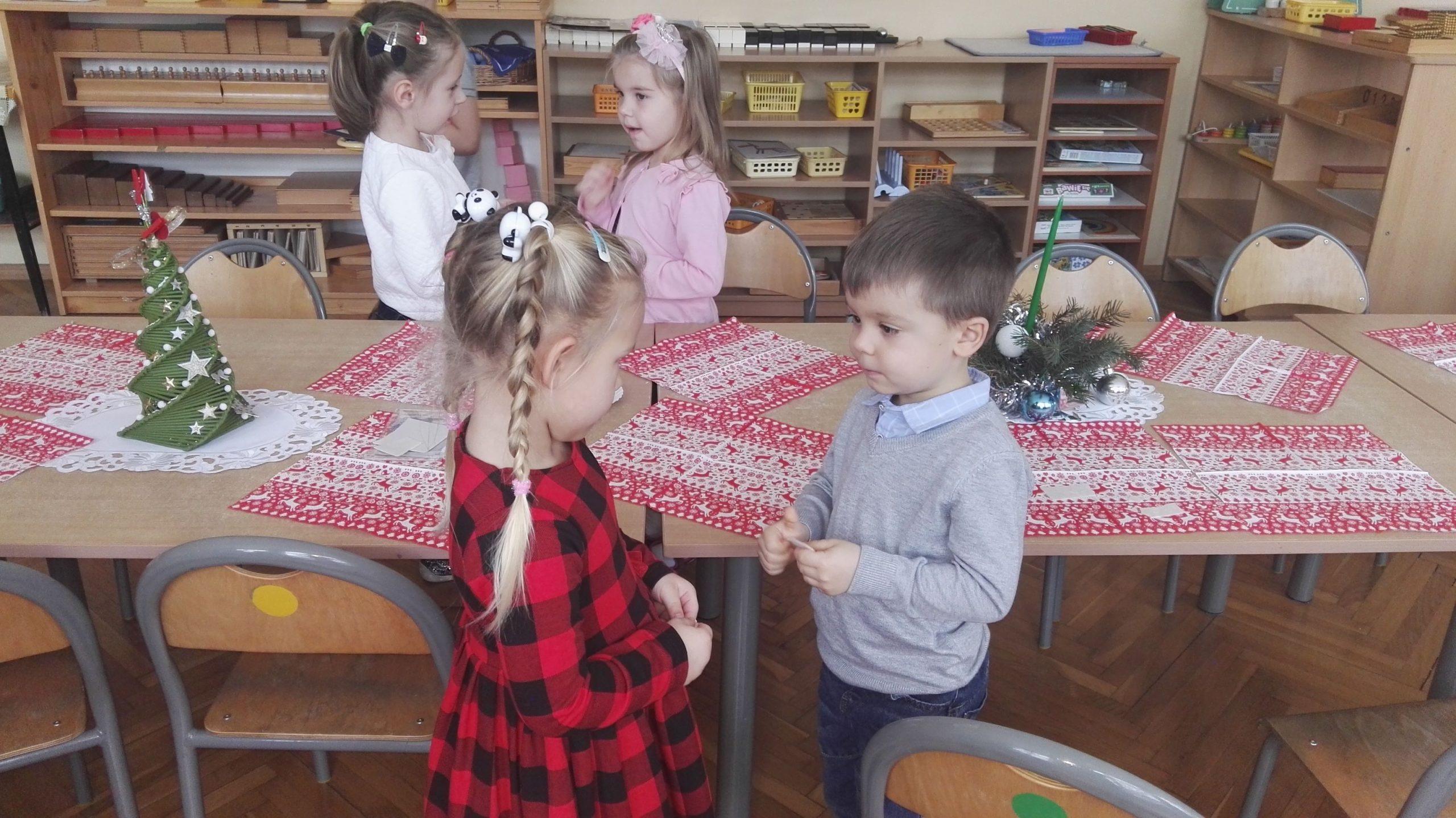 Wigilia Bożego Narodzenia to jeden z najpiękniejszych dni w roku, dlatego w naszej przedszkolnej społeczności przeżywamy go bardzo uroczyście. W tym dniu w każdej grupie, jak i w całym przedszkolu, już od samego rana panowała radosna, ożywiona atmosfera. Dzieci bardzo chętnie pomagały w przygotowaniach. Wspólnie nakrywały do stołu, ustawiały krzesła, rozkładały serwetki. O wyznaczonej godzinie wszystkie grupy zebrały się w holu naszego przedszkola, aby wziąć udział w uroczystej godzince adwentowej,przygotowanej przez Grupę Czerwoną z gościnnym udziałem niektórych przedszkolaków z Grupy Zielonej, pt. „Dziś jest dzień narodzin Pana Jezusa” przedstawionej w formie Jasełek. Aktorzy – Józef, Maryja, Aniołki, Królowie, Pasterze, Kobiety, Dzieci z poszczególnych grup, które złożyły dary u stóp Maleńkiego Jezusa, przygotowane dekoracje (żłobek, gwiazda betlejemska, szopka), wspólny śpiew najpiękniejszych polskich kolęd wprawiły wszystkich w świąteczny nastrój.