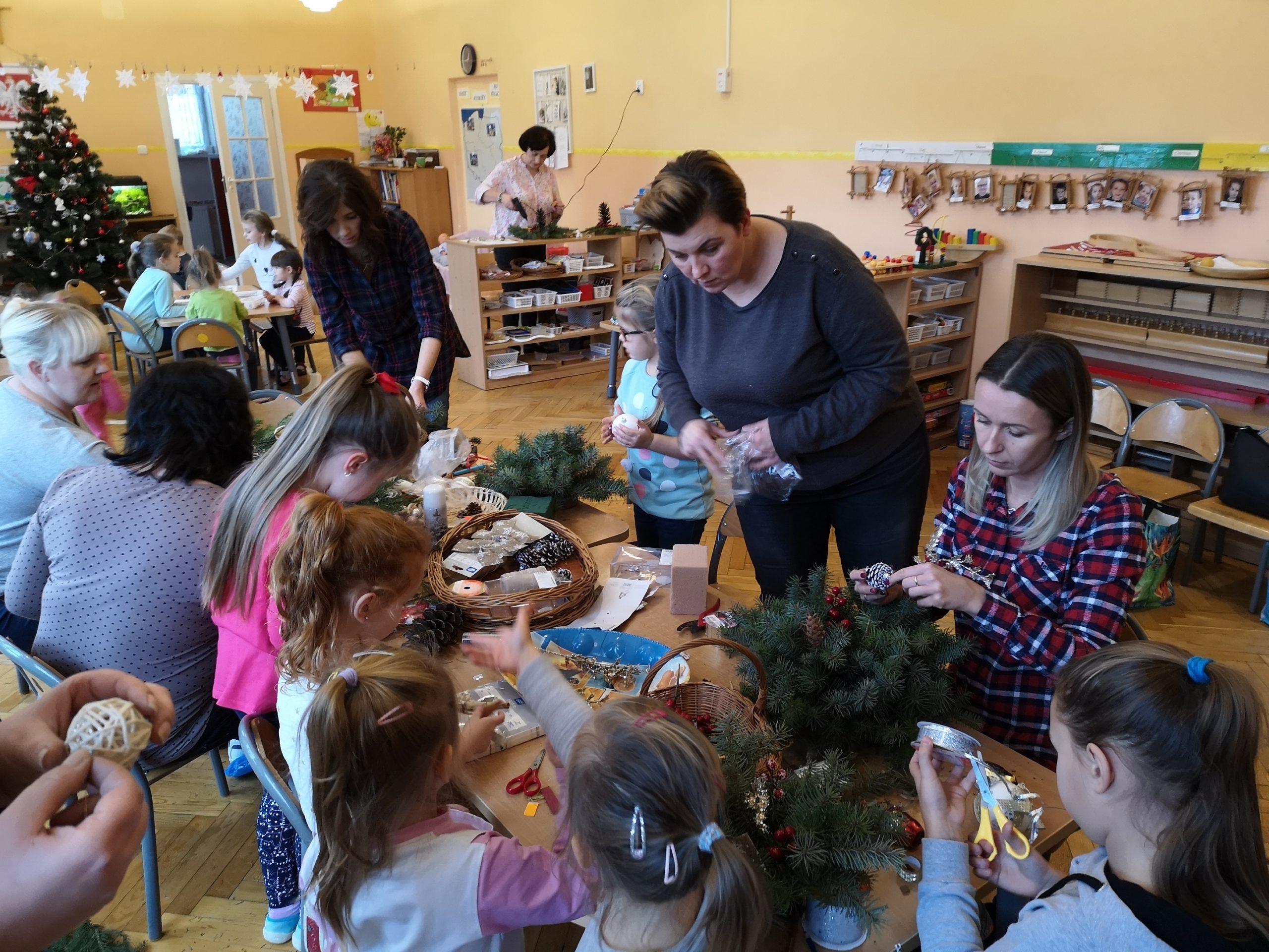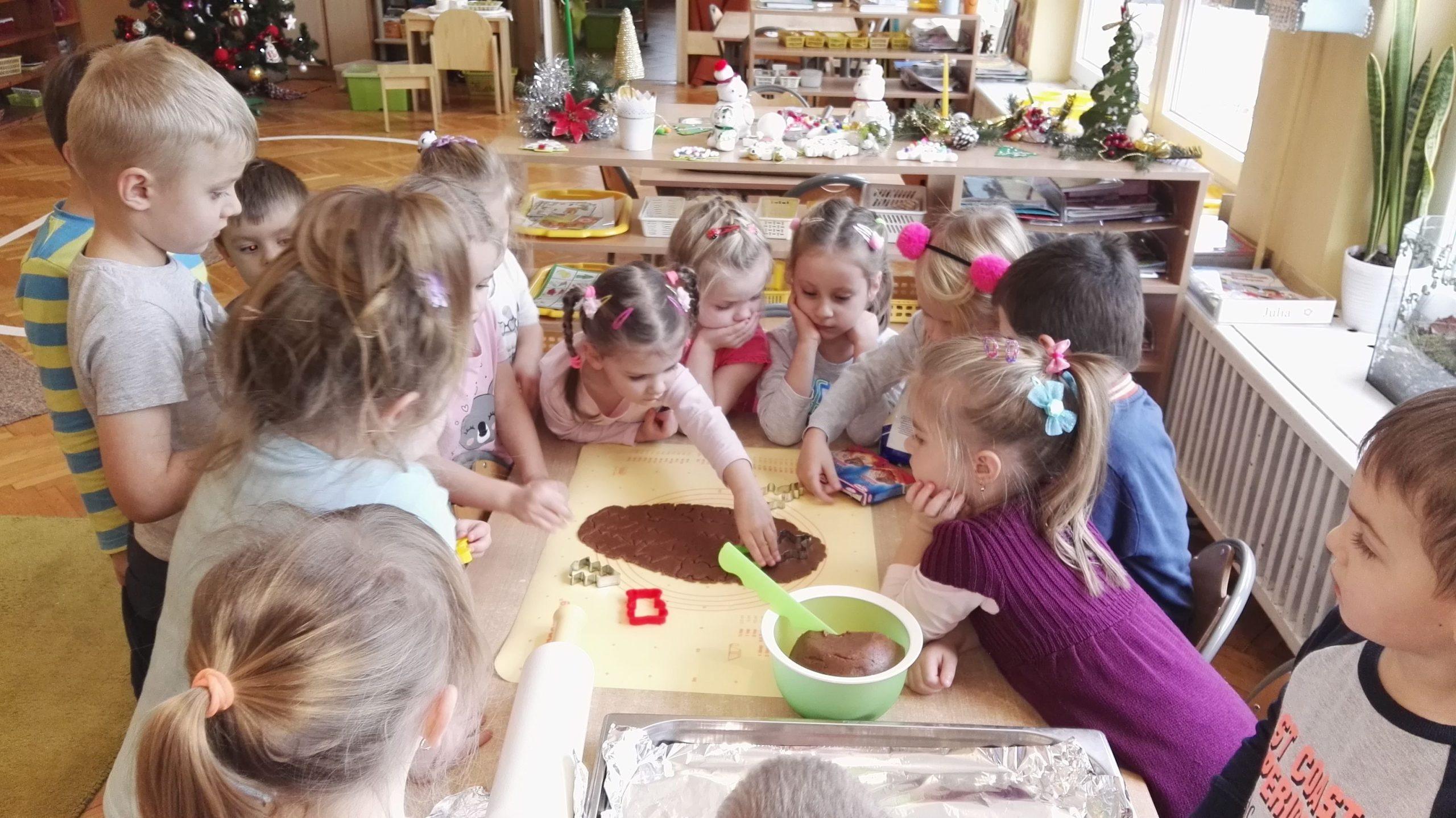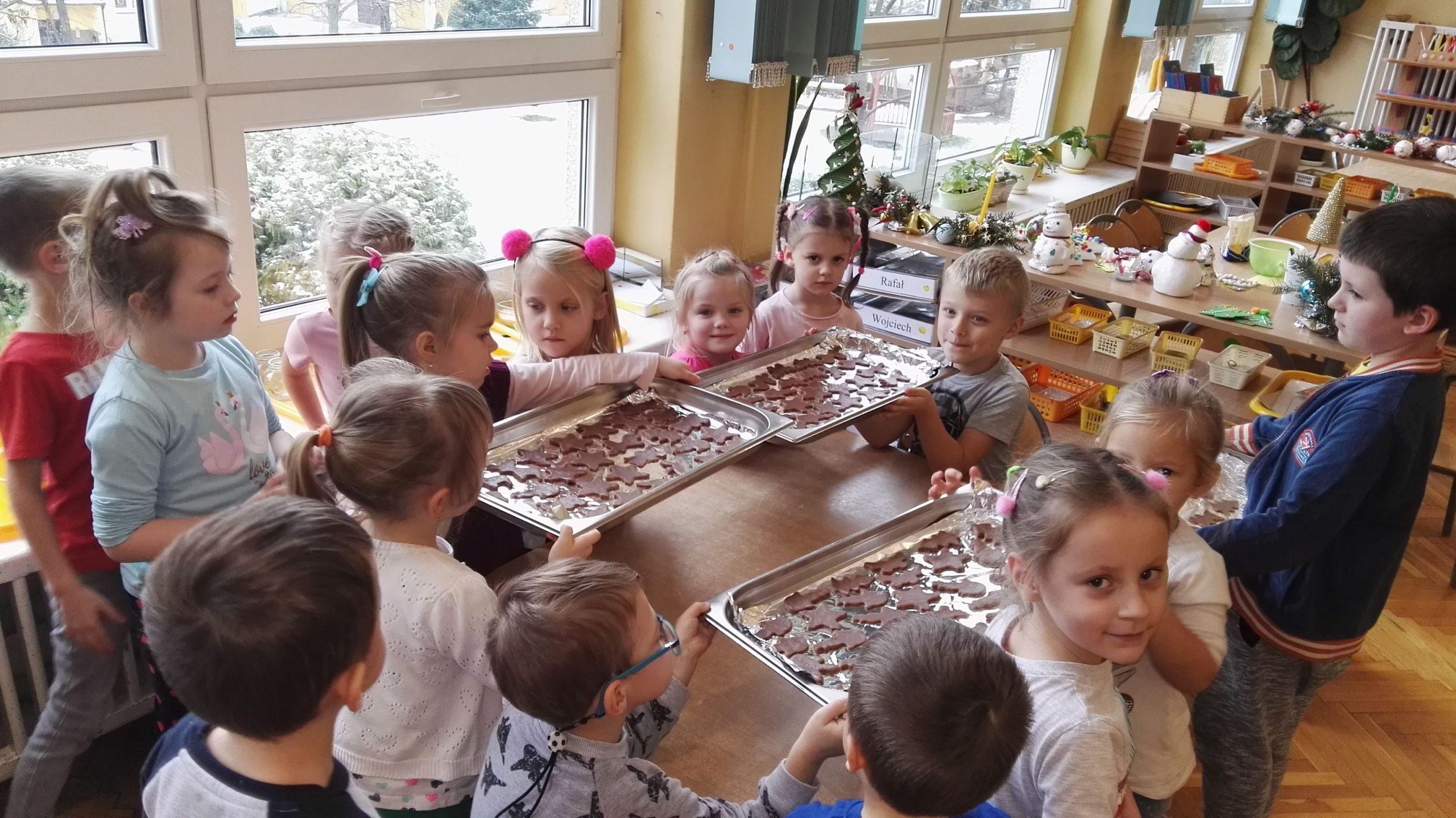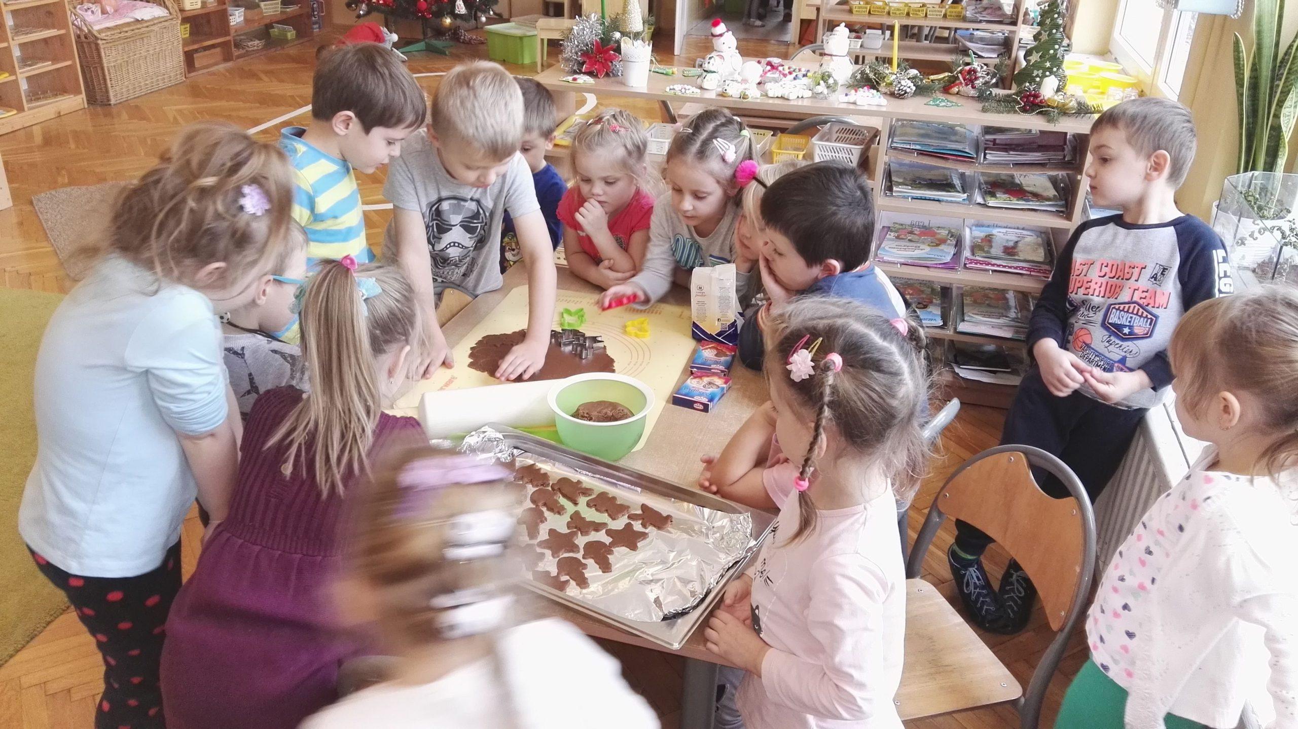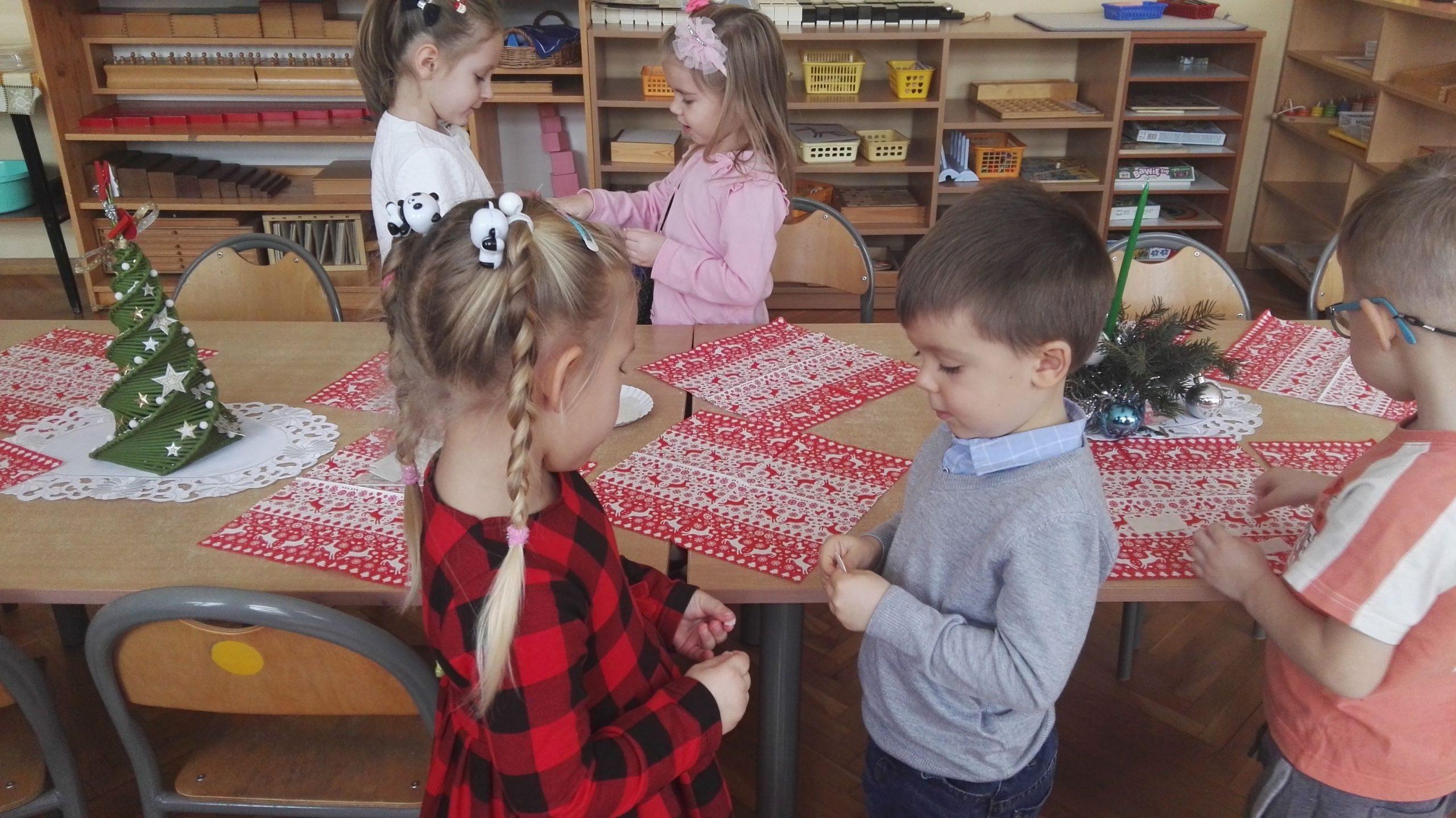 Wigilia Bożego Narodzenia to jeden z najpiękniejszych dni w roku, dlatego w naszej przedszkolnej społeczności przeżywamy go bardzo uroczyście. W tym dniu w każdej grupie, jak i w całym przedszkolu, już od samego rana panowała radosna, ożywiona atmosfera. Dzieci bardzo chętnie pomagały w przygotowaniach. Wspólnie nakrywały do stołu, ustawiały krzesła, rozkładały serwetki. O wyznaczonej godzinie wszystkie grupy zebrały się w holu naszego przedszkola, aby wziąć udział w uroczystej godzince adwentowej,przygotowanej przez Grupę Czerwoną z gościnnym udziałem niektórych przedszkolaków z Grupy Zielonej, pt. „Dziś jest dzień narodzin Pana Jezusa” przedstawionej w formie Jasełek. Aktorzy – Józef, Maryja, Aniołki, Królowie, Pasterze, Kobiety, Dzieci z poszczególnych grup, które złożyły dary u stóp Maleńkiego Jezusa, przygotowane dekoracje (żłobek, gwiazda betlejemska, szopka), wspólny śpiew najpiękniejszych polskich kolęd wprawiły wszystkich w świąteczny nastrój.