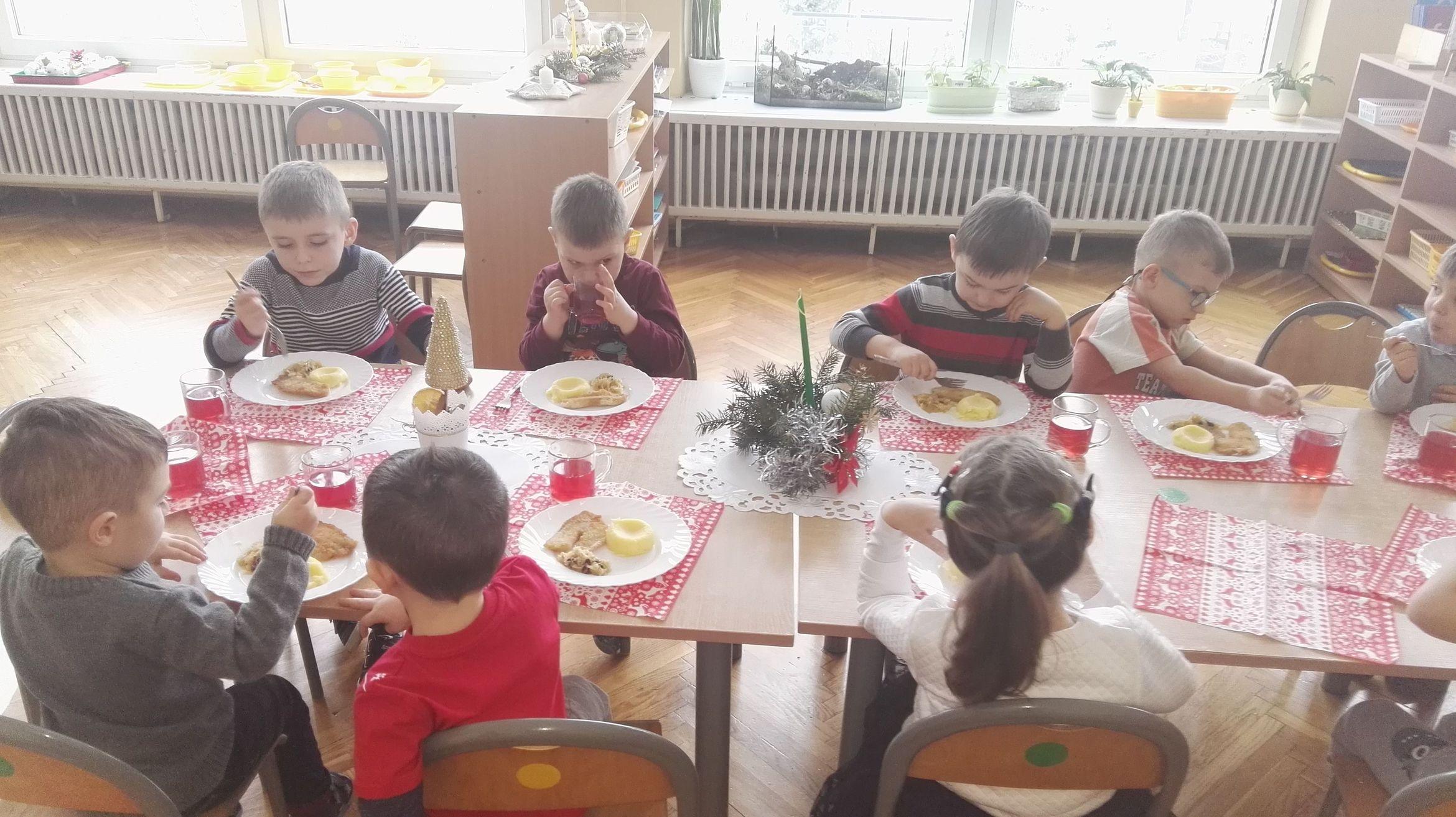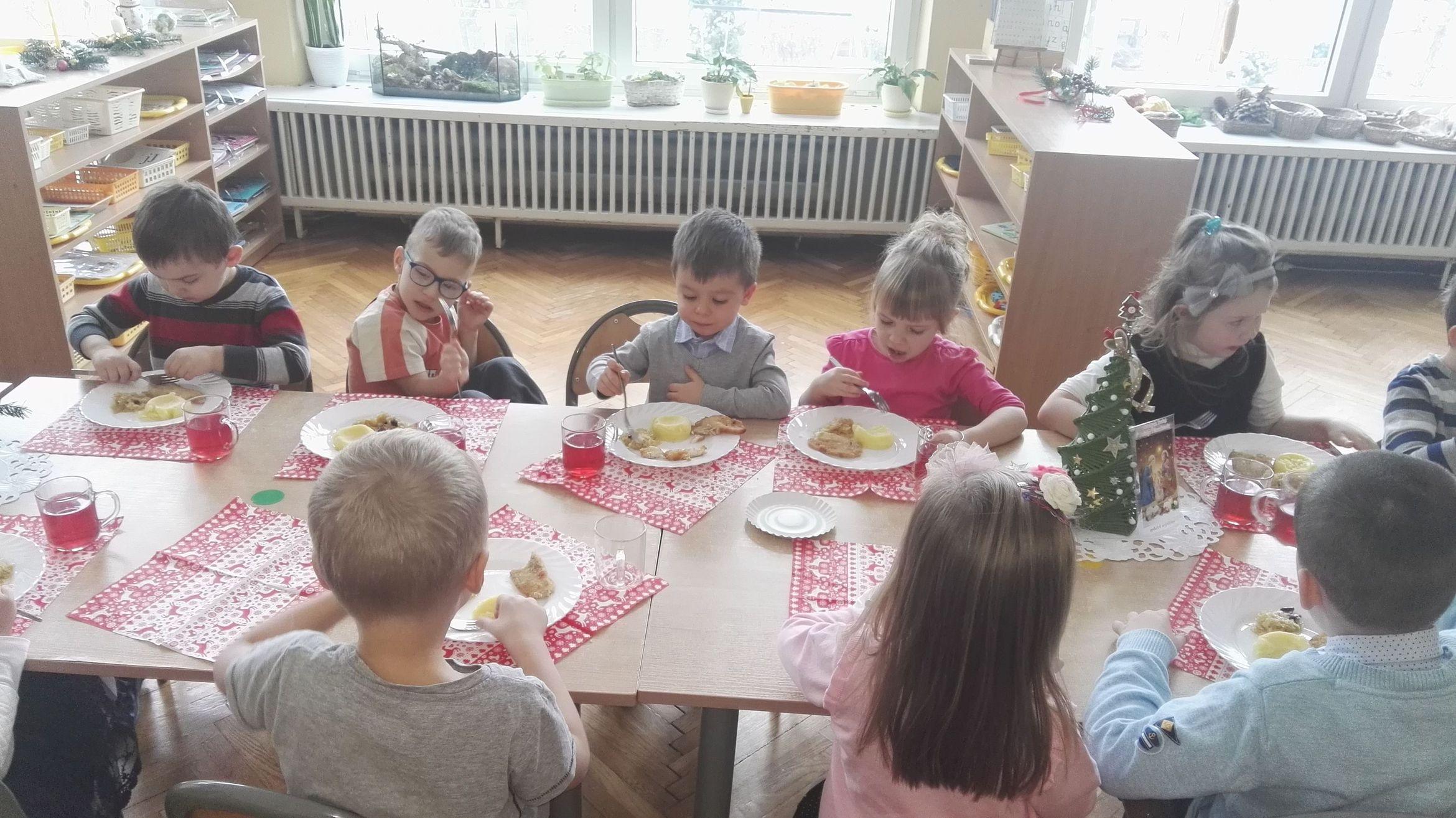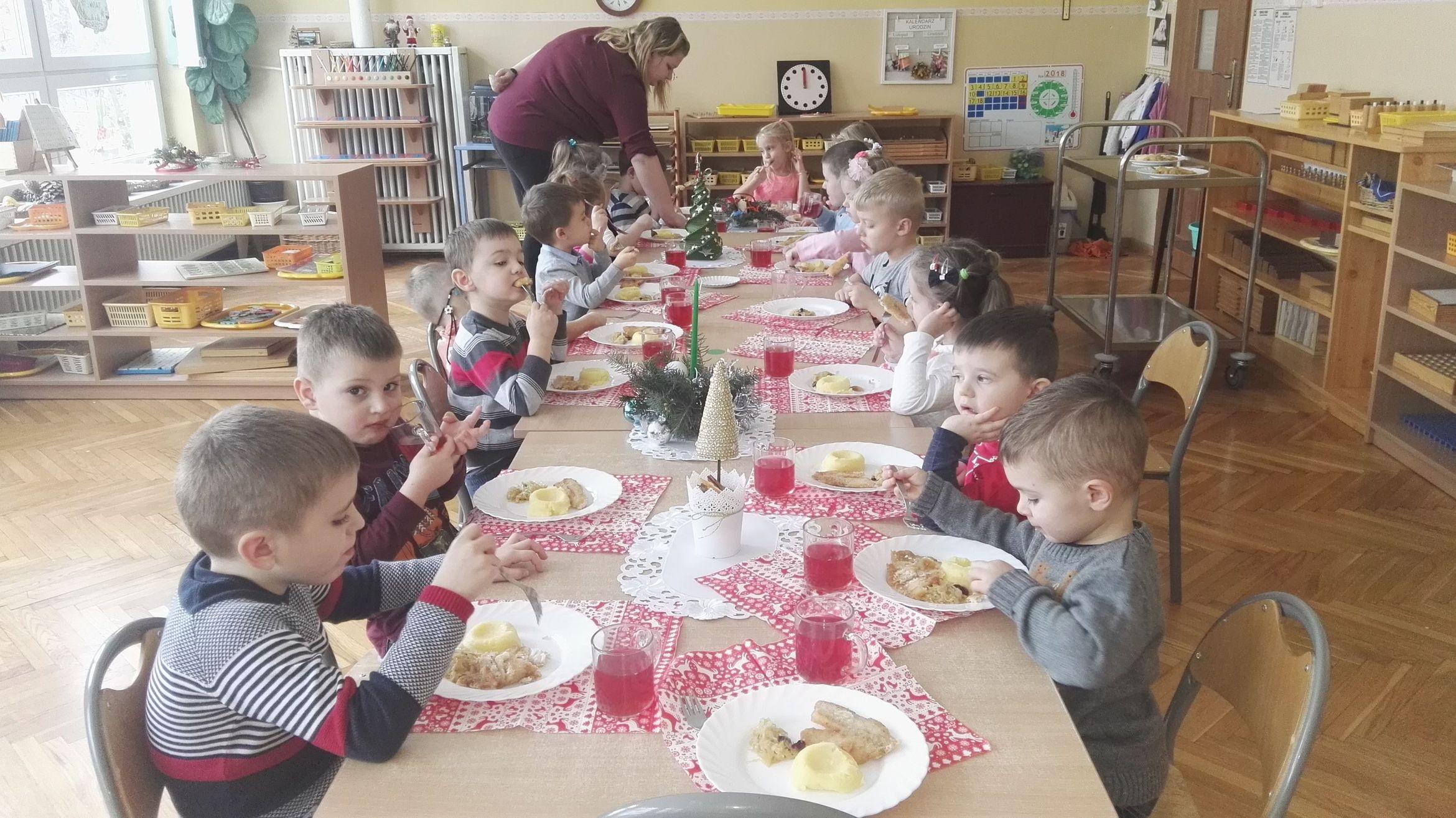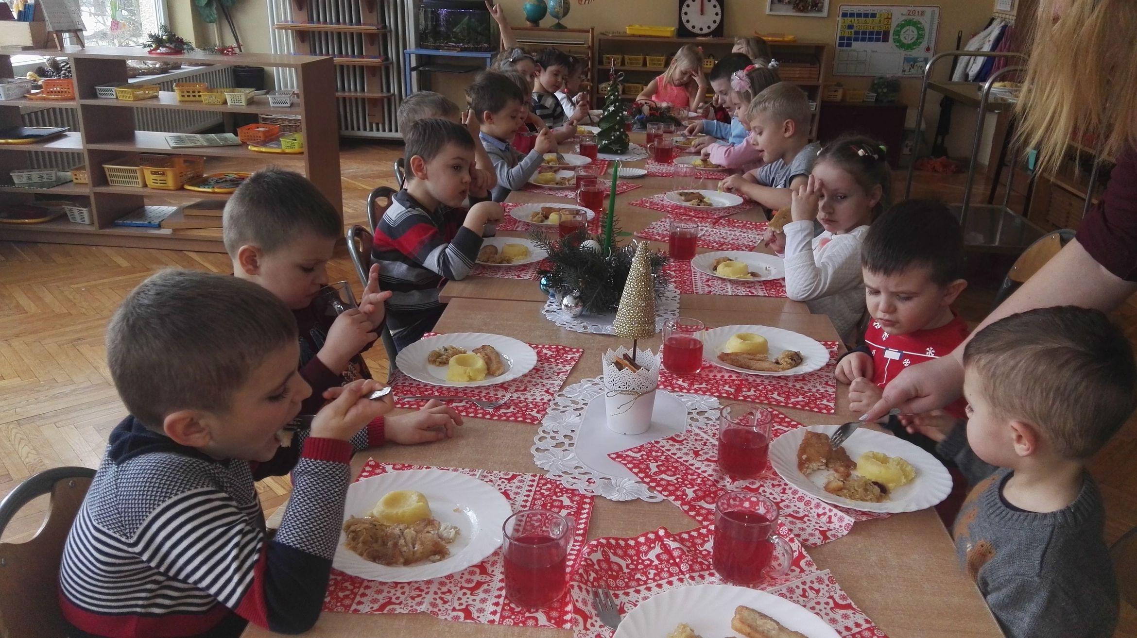Po występie Pani Dyrektor złożyła dzieciom, rodzicom, nauczycielom, wszystkim pracownikom przedszkola najlepsze, bożonarodzeniowe i noworoczne życzenia, po czym wspólnie dzielono się opłatkiem, składając sobie przy tym najserdeczniejsze życzenia. Po opłatku wszyscy zasiedli przy stole, aby posmakować tradycyjnej zupy grzybowej i wigilijnej ryby. Nie zabrakło także pysznych świątecznych słodkości przygotowanych przez nasze wspaniałe Mamusie, za co oczywiście bardzo dziękujemy.