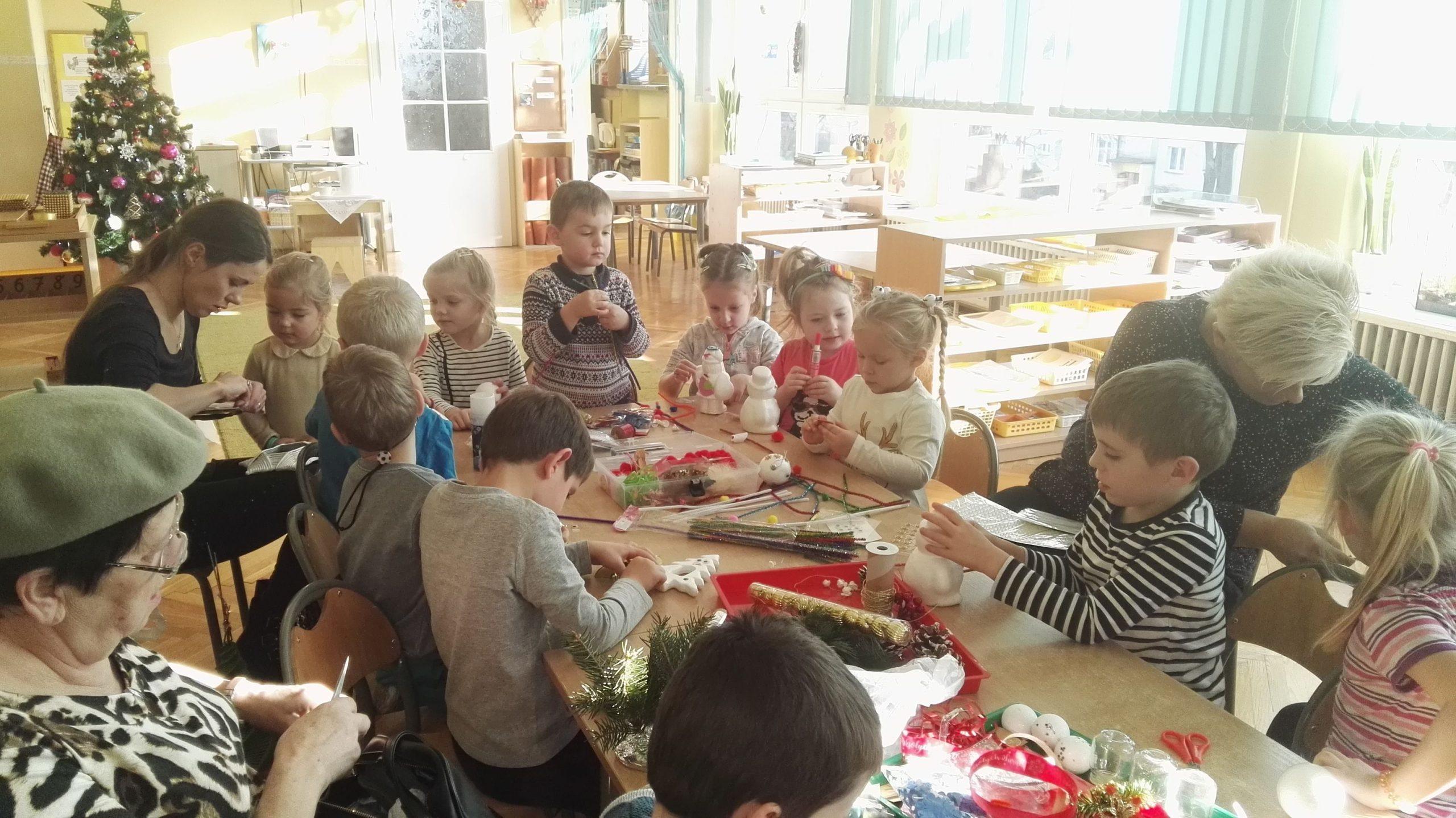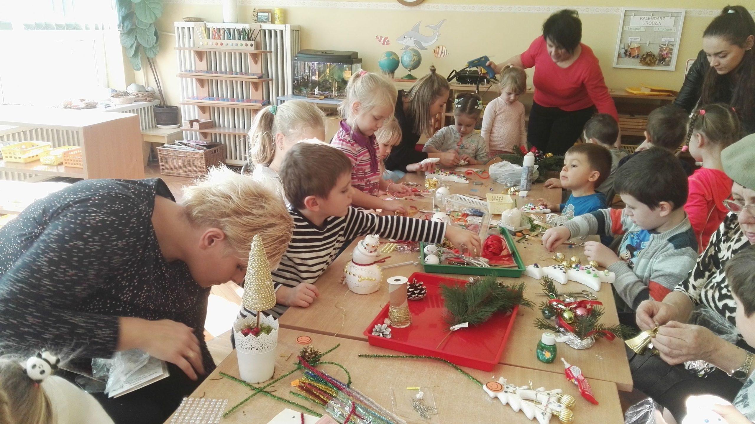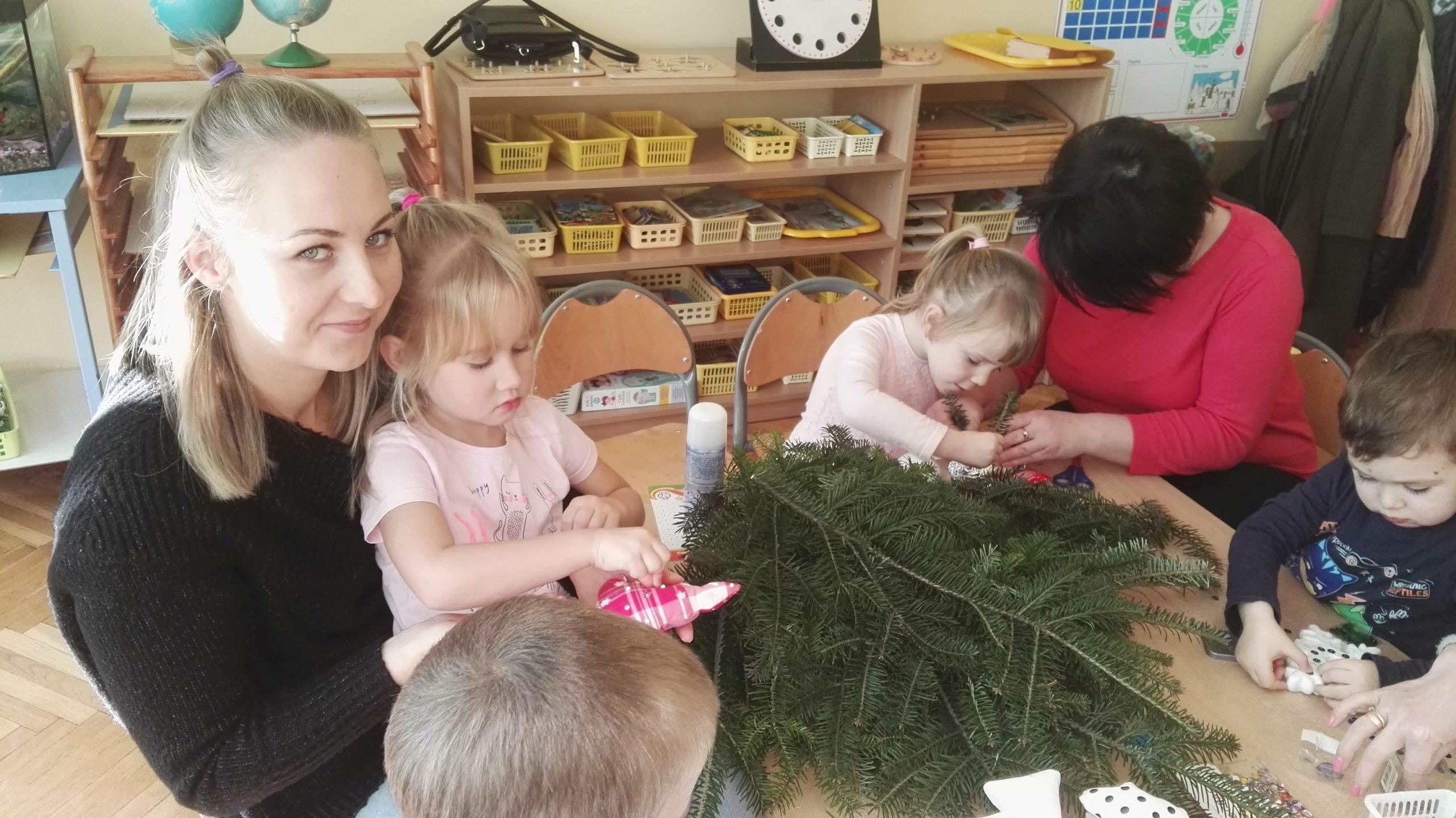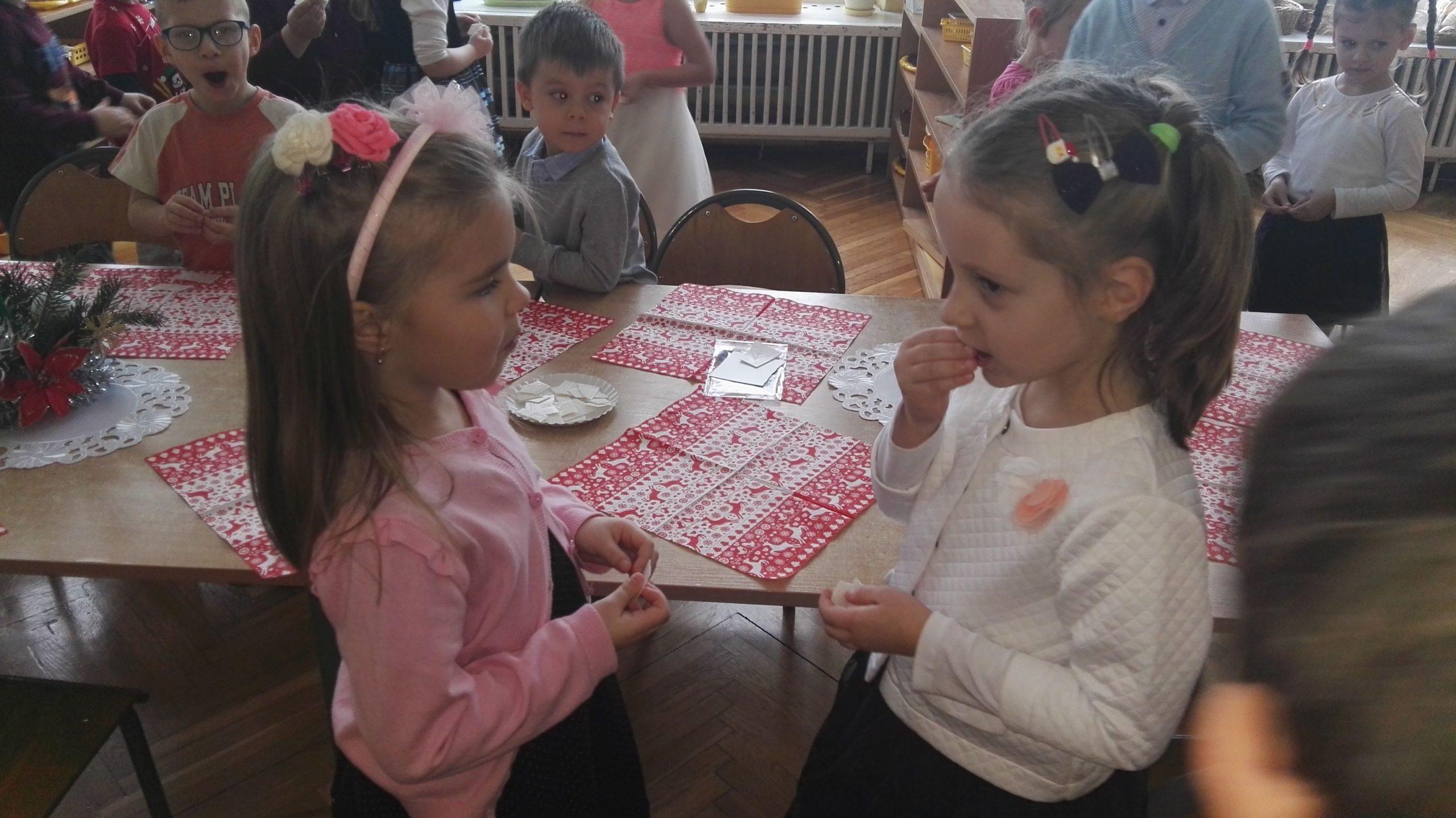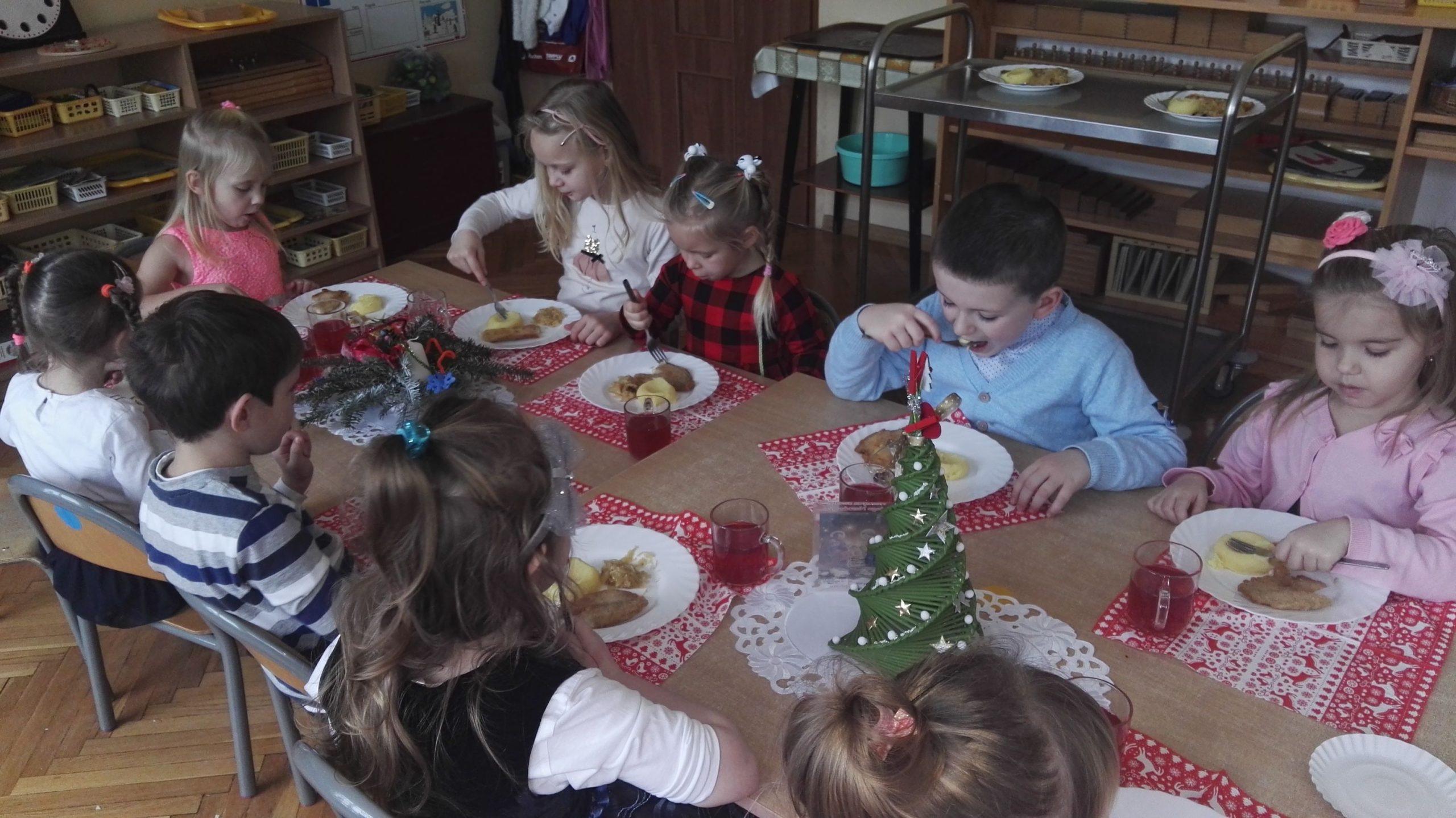 Po występie Pani Dyrektor złożyła dzieciom, rodzicom, nauczycielom, wszystkim pracownikom przedszkola najlepsze, bożonarodzeniowe i noworoczne życzenia, po czym wspólnie dzielono się opłatkiem, składając sobie przy tym najserdeczniejsze życzenia. Po opłatku wszyscy zasiedli przy stole, aby posmakować tradycyjnej zupy grzybowej i wigilijnej ryby. Nie zabrakło także pysznych świątecznych słodkości przygotowanych przez nasze wspaniałe Mamusie, za co oczywiście bardzo dziękujemy.