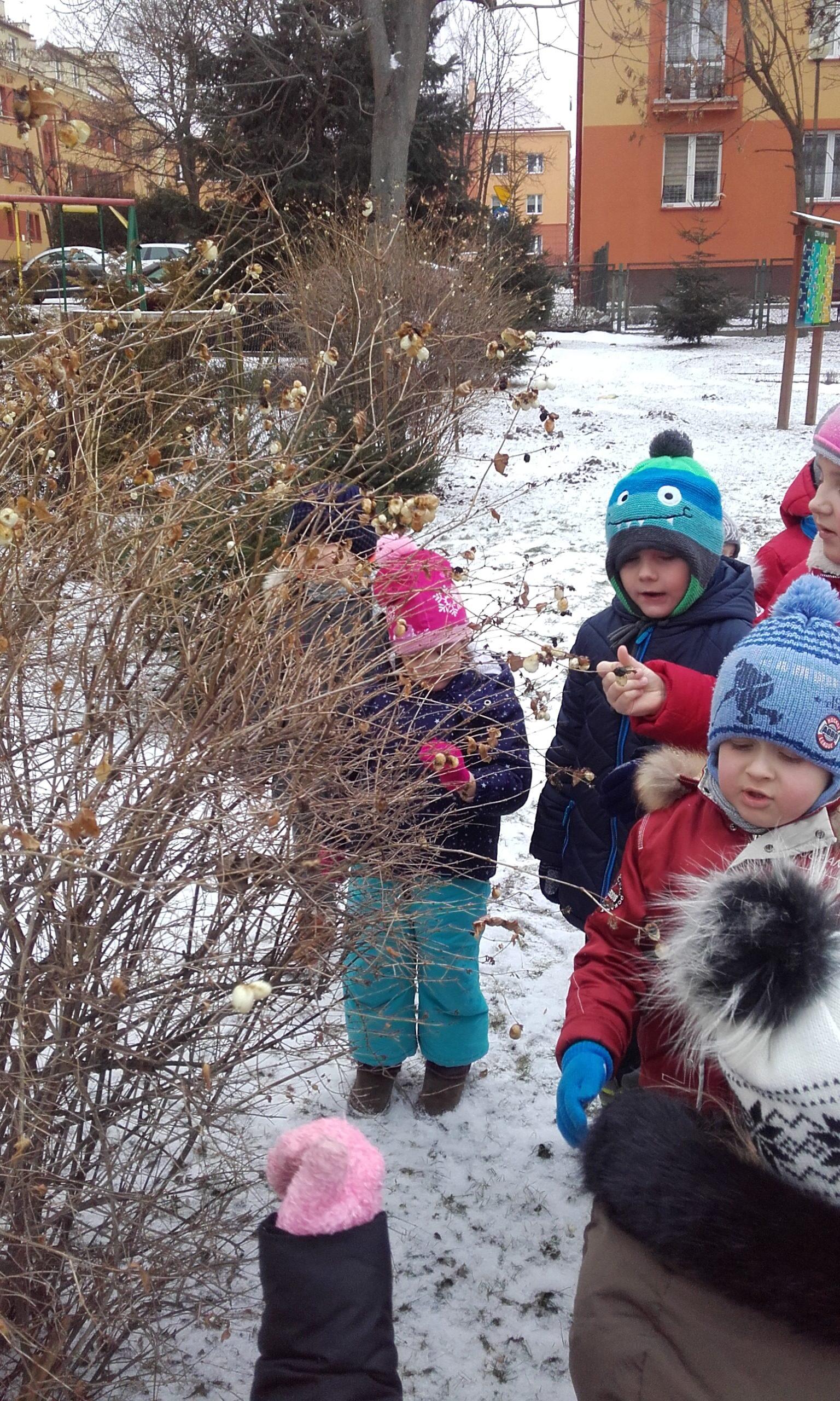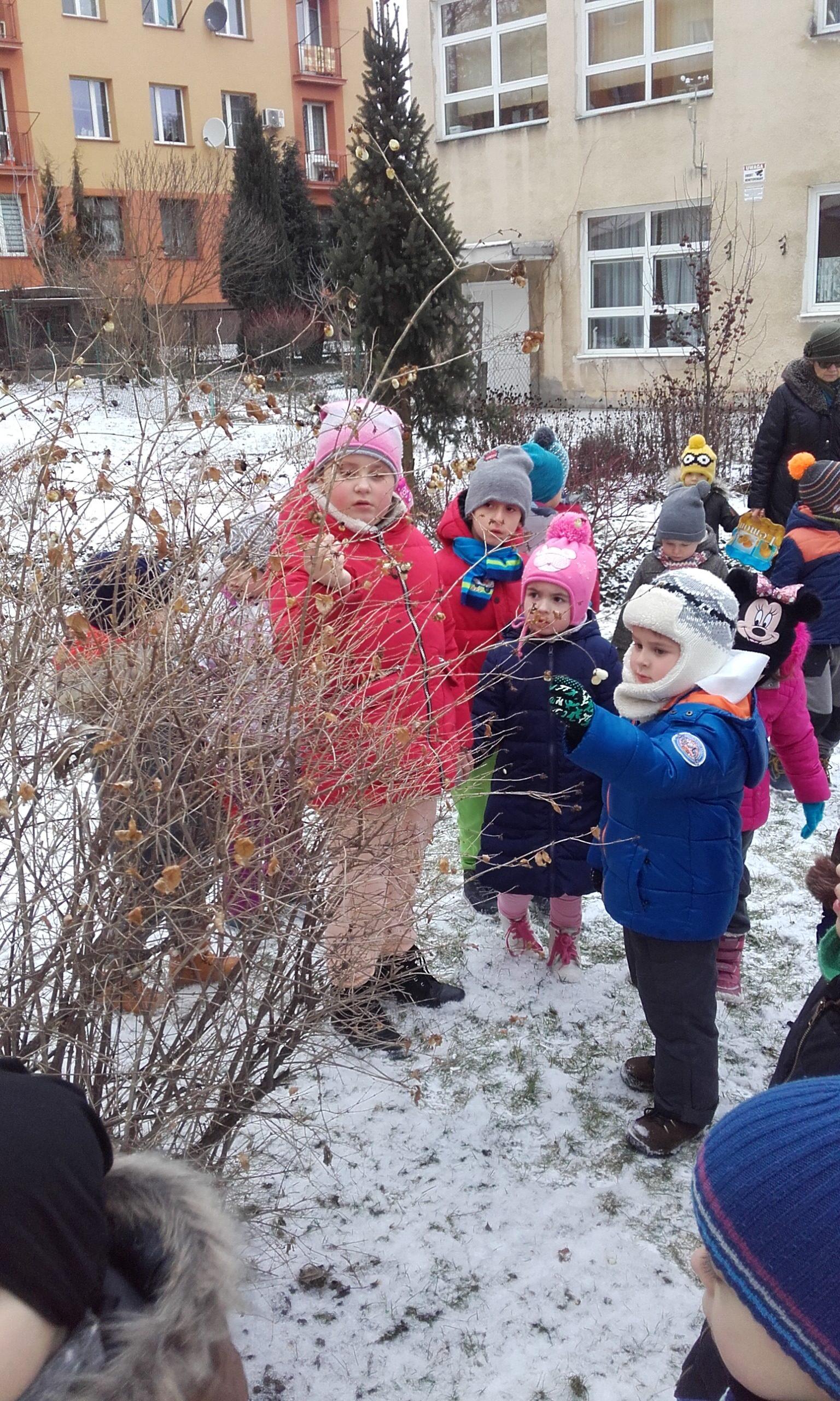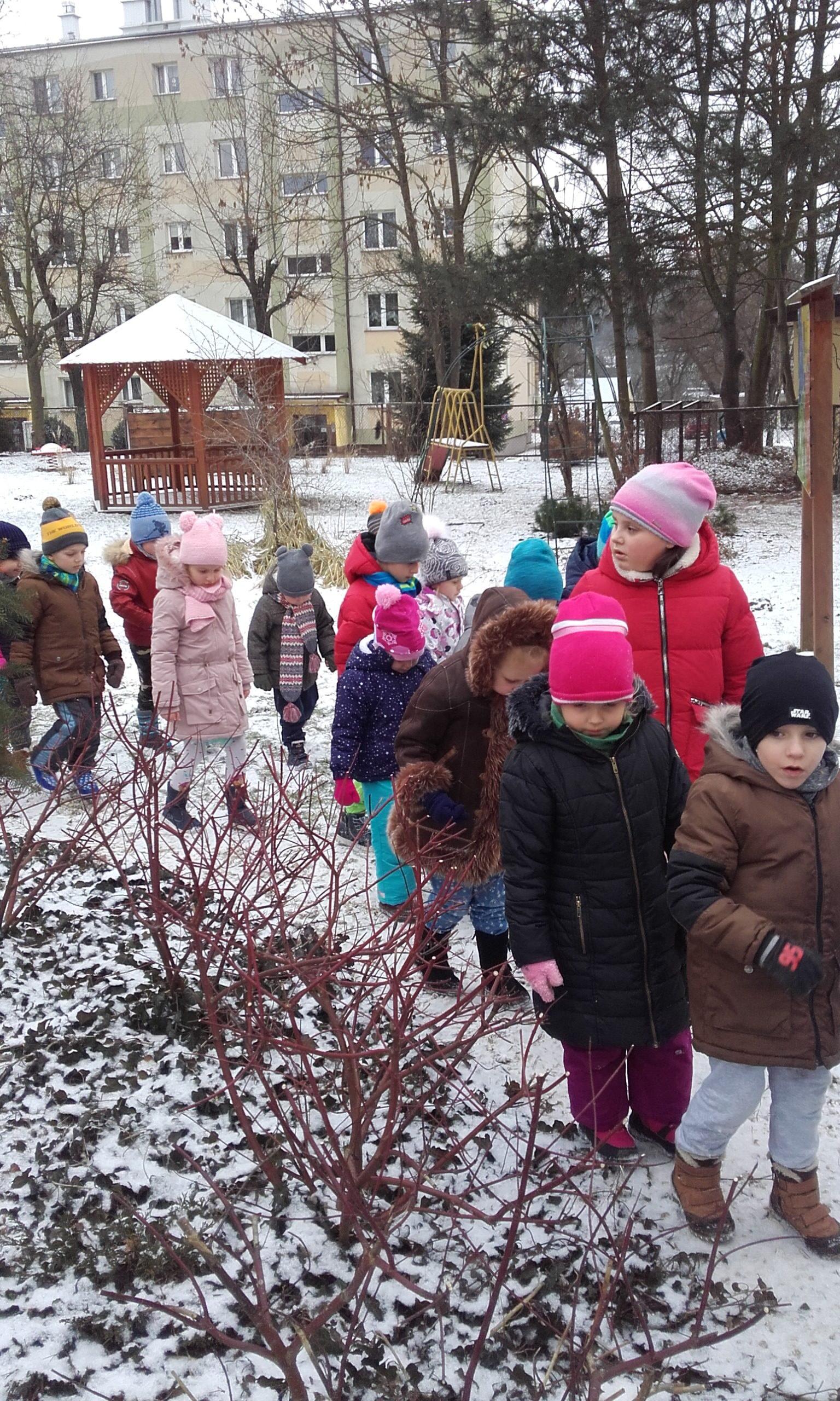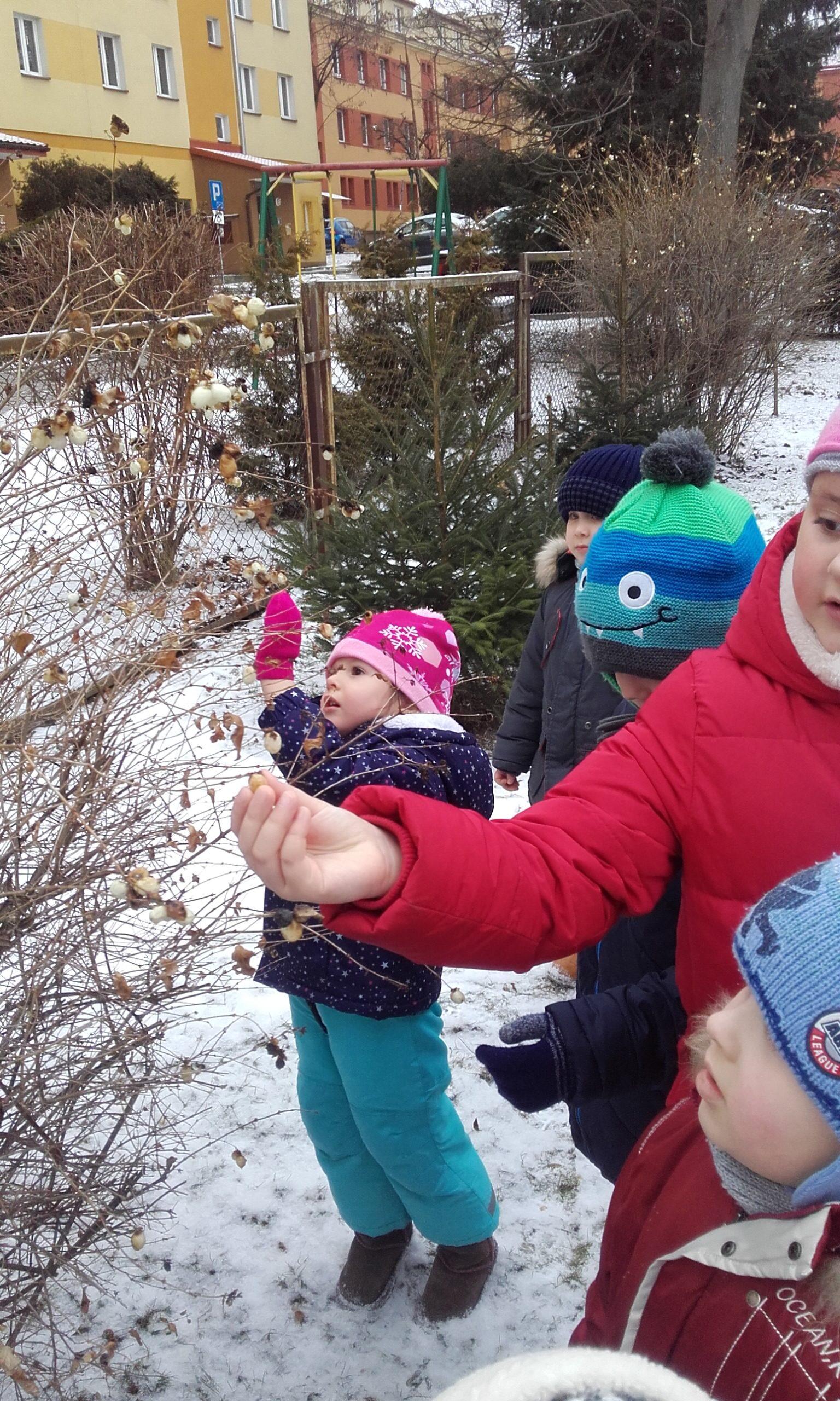 Obserwowanie, eksperymentowanie i odkrywanie przyrody w okresie zimy zawsze sprawia dzieciom wiele przyjemności. Pogoda nie zawsze sprzyja częstym spacerom z dziećmi w okresie zimy, a dzieci spragnione są takich doświadczeń. Przedszkolna przyrodnicza ścieżka edukacyjna nawet zimą pozwala dokonać wielu ciekawych obserwacji przyrodniczych. Życie przyrody jest bardzo zróżnicowane. Dzieci szybko dostrzegły, że przyroda jest w okresie zimy uśpiona. Brak zieleni, niewielka warstwa śniegu, suche gałązki roślin, resztki jarzębiny na drzewie służące jako pokarm dla niektórych ptaków to pierwsze spostrzeżenia dzieci. Obserwacja ptaków poszukujących pokarmu była interesująca dla dzieci, a także pobudziła ich do działań związanych z ich dokarmianiem. Pojawiły się pytania dlaczego choinki nie straciły zielonego koloru tak jak inne drzewa i dlaczego nie straciły igieł. Był to bodziec do poszukiwania odpowiedzi w literaturze o tematyce przyrodniczej w przedszkolnej biblioteczce. Był to krótki pobyt w ogrodzie przedszkolnym,śnieg był sypki, więc próby zrobienia kulek śniegowych były niemożliwe, ale wywołały mnóstwo radości.