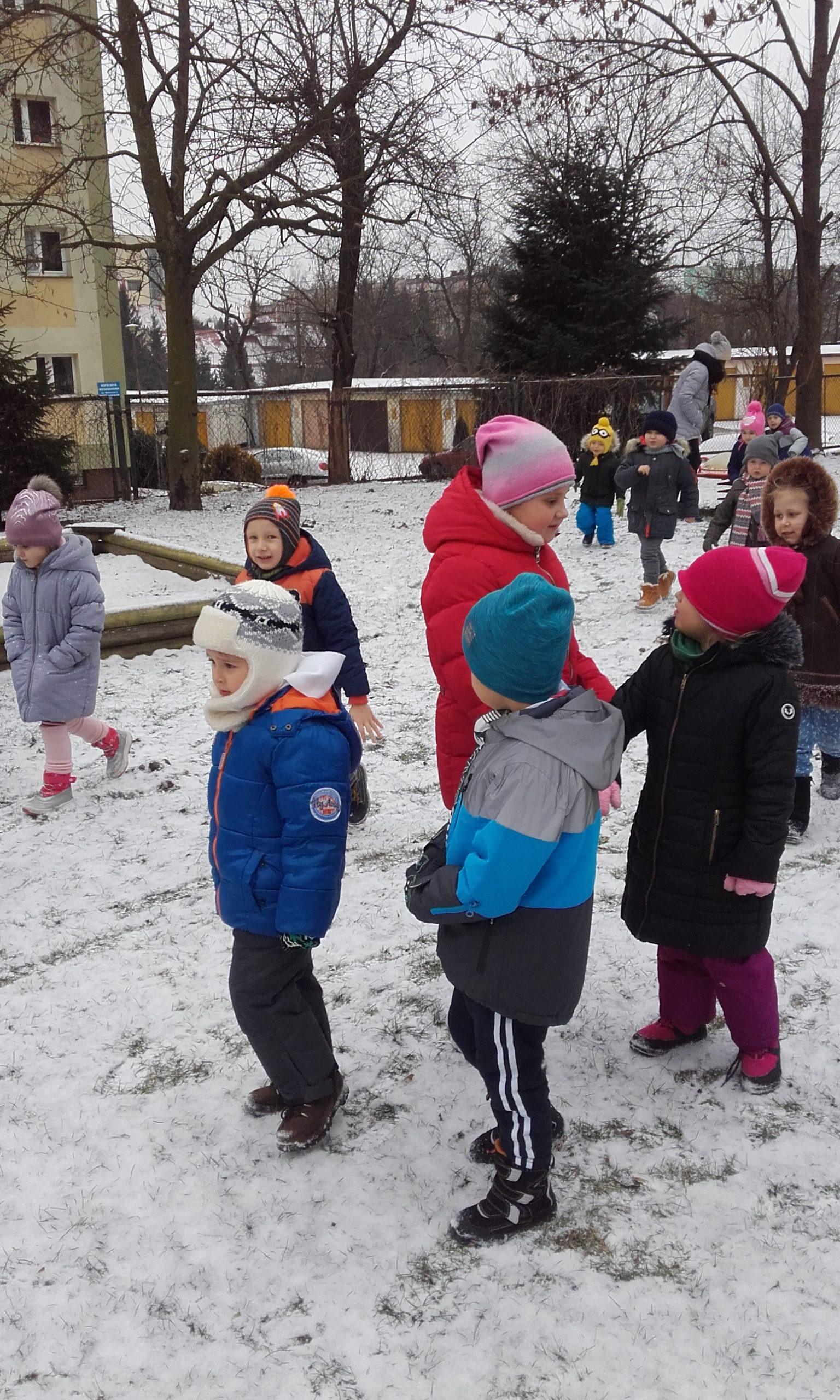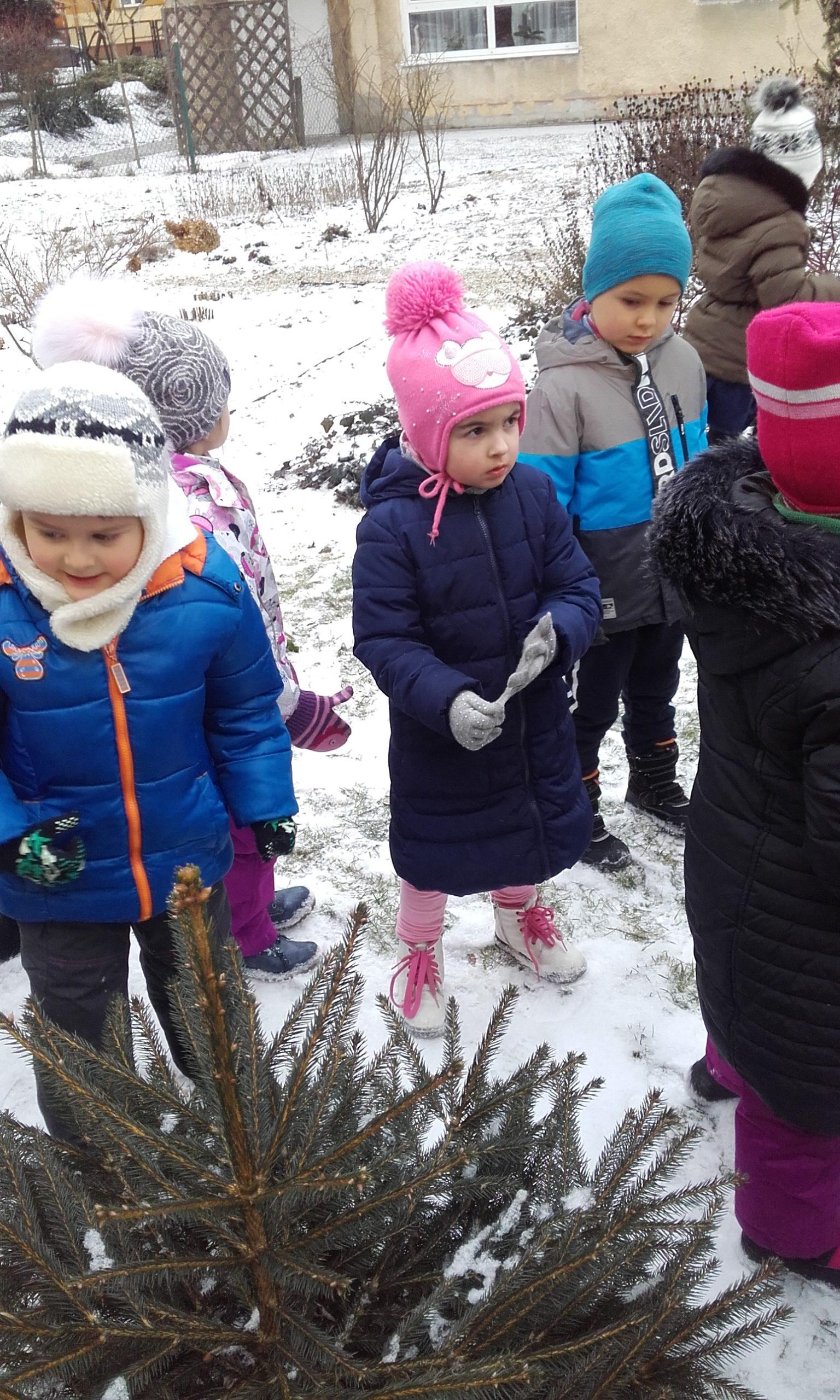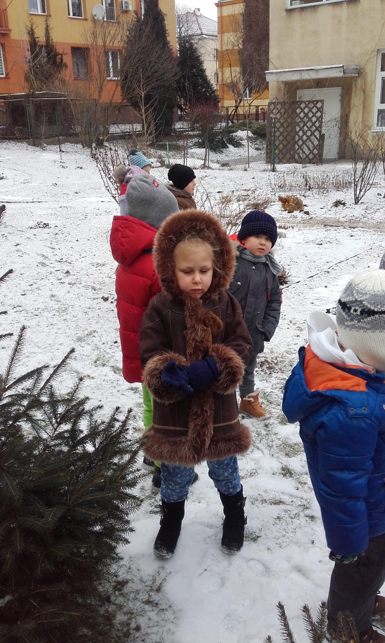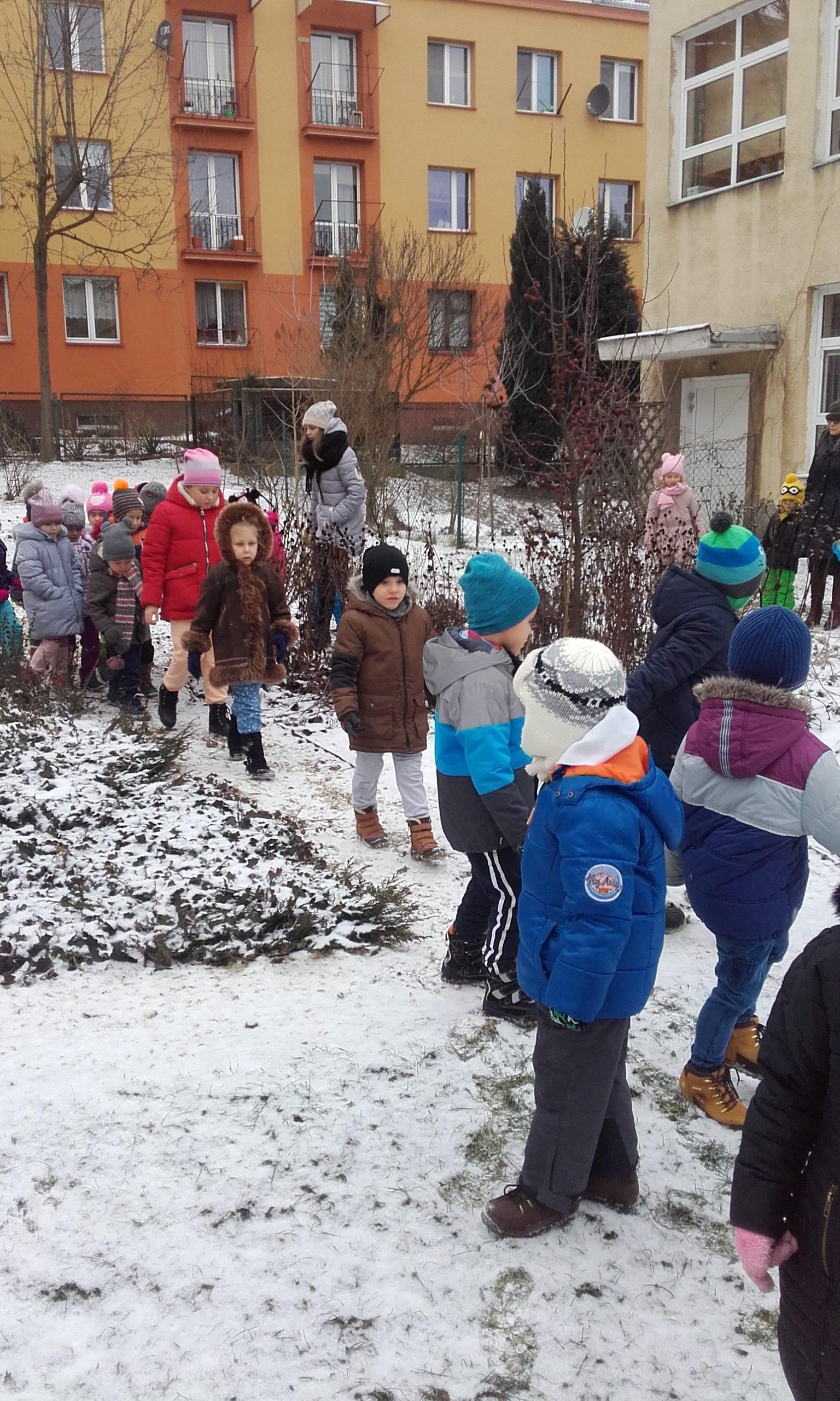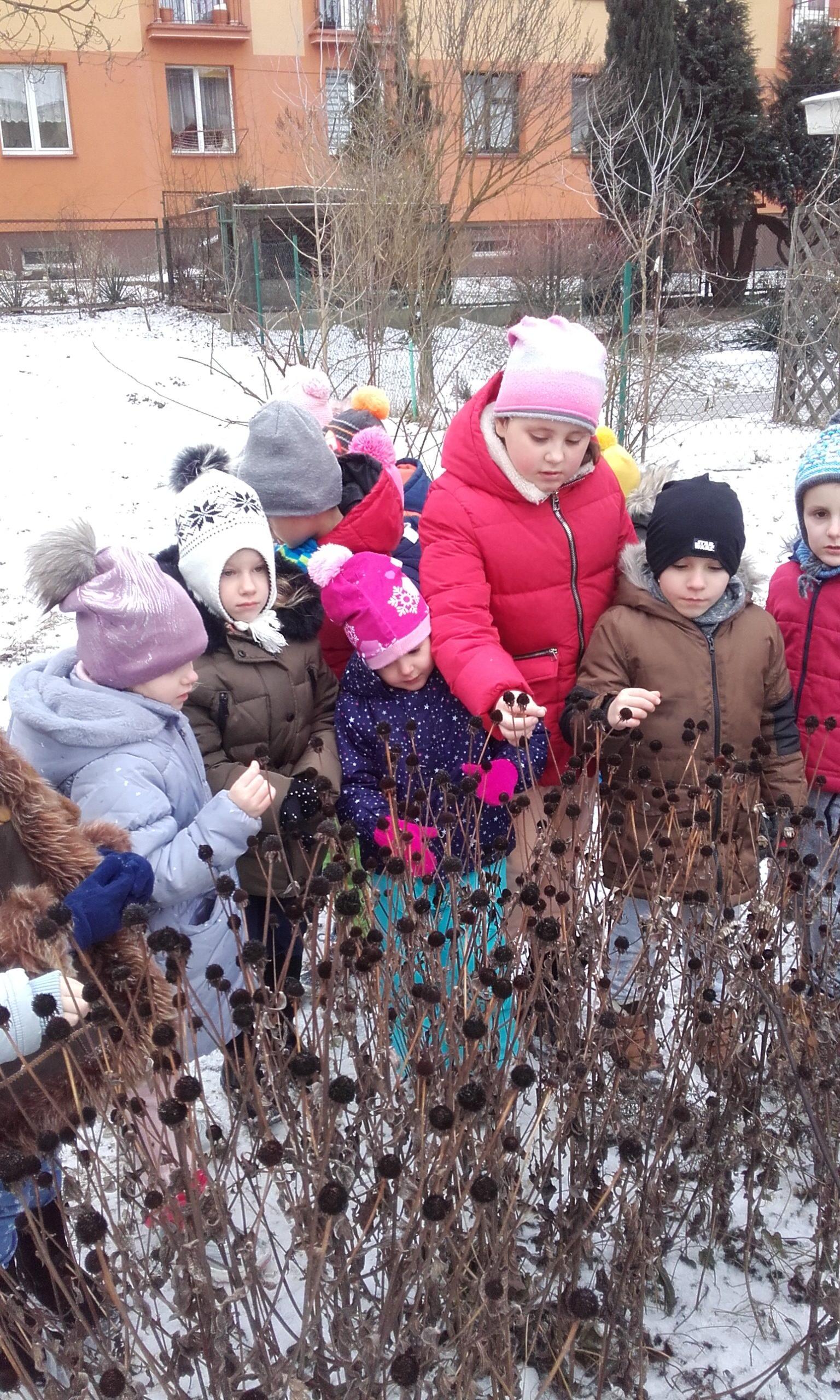 Obserwowanie, eksperymentowanie i odkrywanie przyrody w okresie zimy zawsze sprawia dzieciom wiele przyjemności. Pogoda nie zawsze sprzyja częstym spacerom z dziećmi w okresie zimy, a dzieci spragnione są takich doświadczeń. Przedszkolna przyrodnicza ścieżka edukacyjna nawet zimą pozwala dokonać wielu ciekawych obserwacji przyrodniczych. Życie przyrody jest bardzo zróżnicowane. Dzieci szybko dostrzegły, że przyroda jest w okresie zimy uśpiona. Brak zieleni, niewielka warstwa śniegu, suche gałązki roślin, resztki jarzębiny na drzewie służące jako pokarm dla niektórych ptaków to pierwsze spostrzeżenia dzieci. Obserwacja ptaków poszukujących pokarmu była interesująca dla dzieci, a także pobudziła ich do działań związanych z ich dokarmianiem. Pojawiły się pytania dlaczego choinki nie straciły zielonego koloru tak jak inne drzewa i dlaczego nie straciły igieł. Był to bodziec do poszukiwania odpowiedzi w literaturze o tematyce przyrodniczej w przedszkolnej biblioteczce. Był to krótki pobyt w ogrodzie przedszkolnym,śnieg był sypki, więc próby zrobienia kulek śniegowych były niemożliwe, ale wywołały mnóstwo radości.