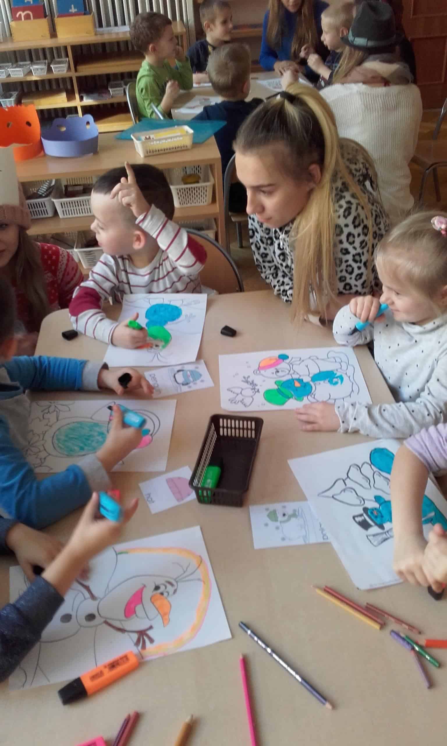 W piątek 1 lutego odbyła się nietypowa lekcja języka angielskiego prowadzona przez uczennice klasy pedagogicznej Zespołu Szkół Licealnych i Technicznych w Jarosławiu. Zima za oknem więc tematem lekcji również była zima. Uczennice przygotowały wyjątkowo ciekawą lekcję. Zainteresowanie dzieci wzbudziły bardzo pomysłowe kostiumy nawiązujące tematycznie do aktualnej pory roku. Uczennice przebrane były za bałwanka, śnieżynkę,pingwinka, miały na sobie elementy garderoby noszonej zimą: ciepłą czapkę, szalik, ciepłe buty… Po nauce powitalnej piosenki w języku angielskim dzieci poznawały angielskie słowa związane z zimą i zimową garderobą. Powtarzały i zapamiętywały słowa. Utrwaleniem poznanych słów była zabawa dydaktyczna w odnalezienie obrazków tematycznie związanych z zimą i nadanie im angielskich nazw. Nie było to takie łatwe, ale udało się . Na zakończenie dzieci otrzymały zimowe kolorowanki. Były bardzo zadowolone, z ochotą kolorowały i utrwalały poznane angielskie słówka.