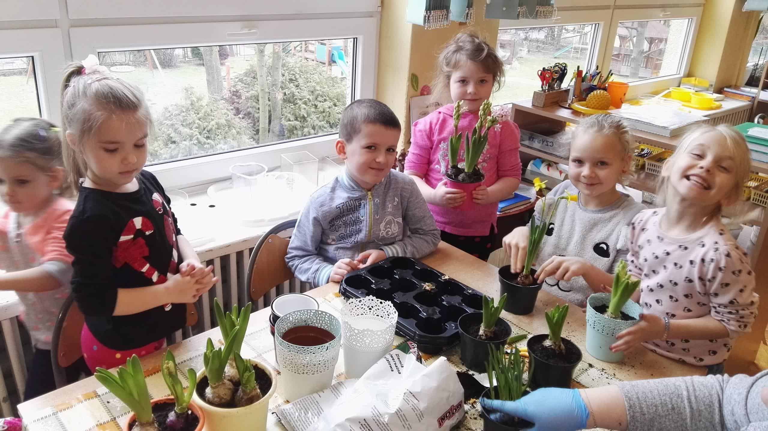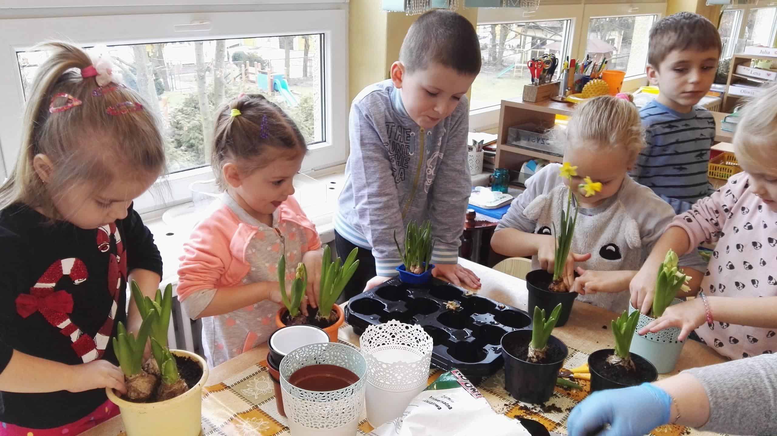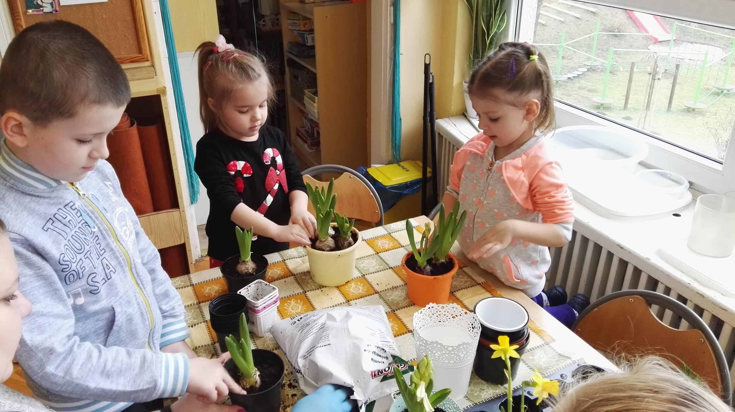Choć za oknem jeszcze śnieg, a dzieci nie mogąc doczekać się ciepłej wiosny postanowiły założyć hodowlę kwiatów cebulkowych. Kwiaty to bardzo atrakcyjny temat do poznawania i obserwowania sposobu wzrostu, daje dzieciom możliwość obserwacji zmian jakie zachodzą w okresie wczesnego przedwiośnia. W związku z tym wspólnie zasadziliśmy rośliny a nasz parapet wypełniły doniczki z hiacyntami, żonkilami i szafirkami. W czasie sadzenia kwiatów dzieci poszerzały swoje wiadomości na temat warunków niezbędnych do rozwoju roślin. Teraz pozostało już tylko obserwować jak rosną i zakwitną. Dziękujemy rodzicom którzy chętnie włączyli się wzbogacając nasz kącik przyrodniczy w sadzonki kwiatów.