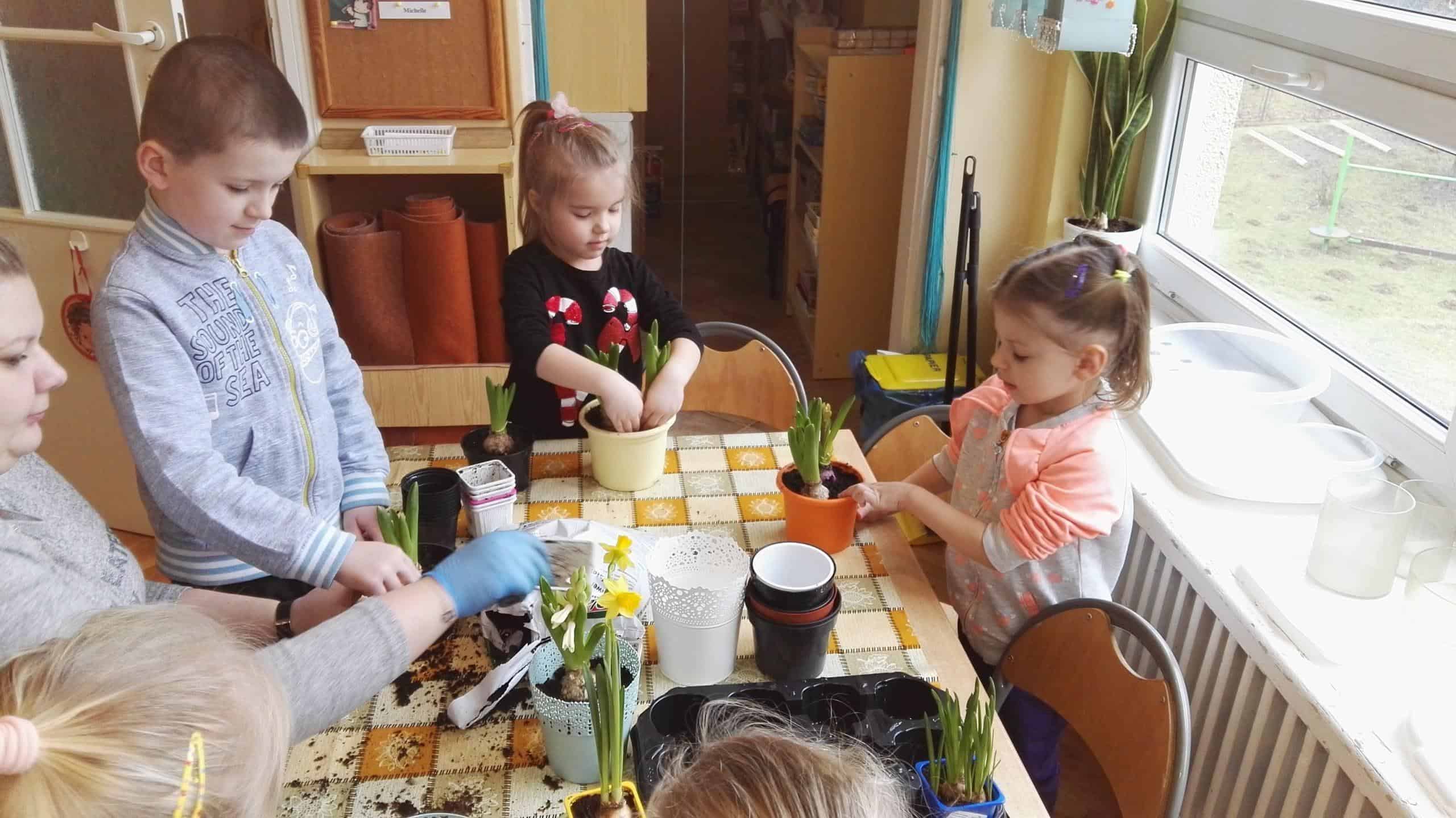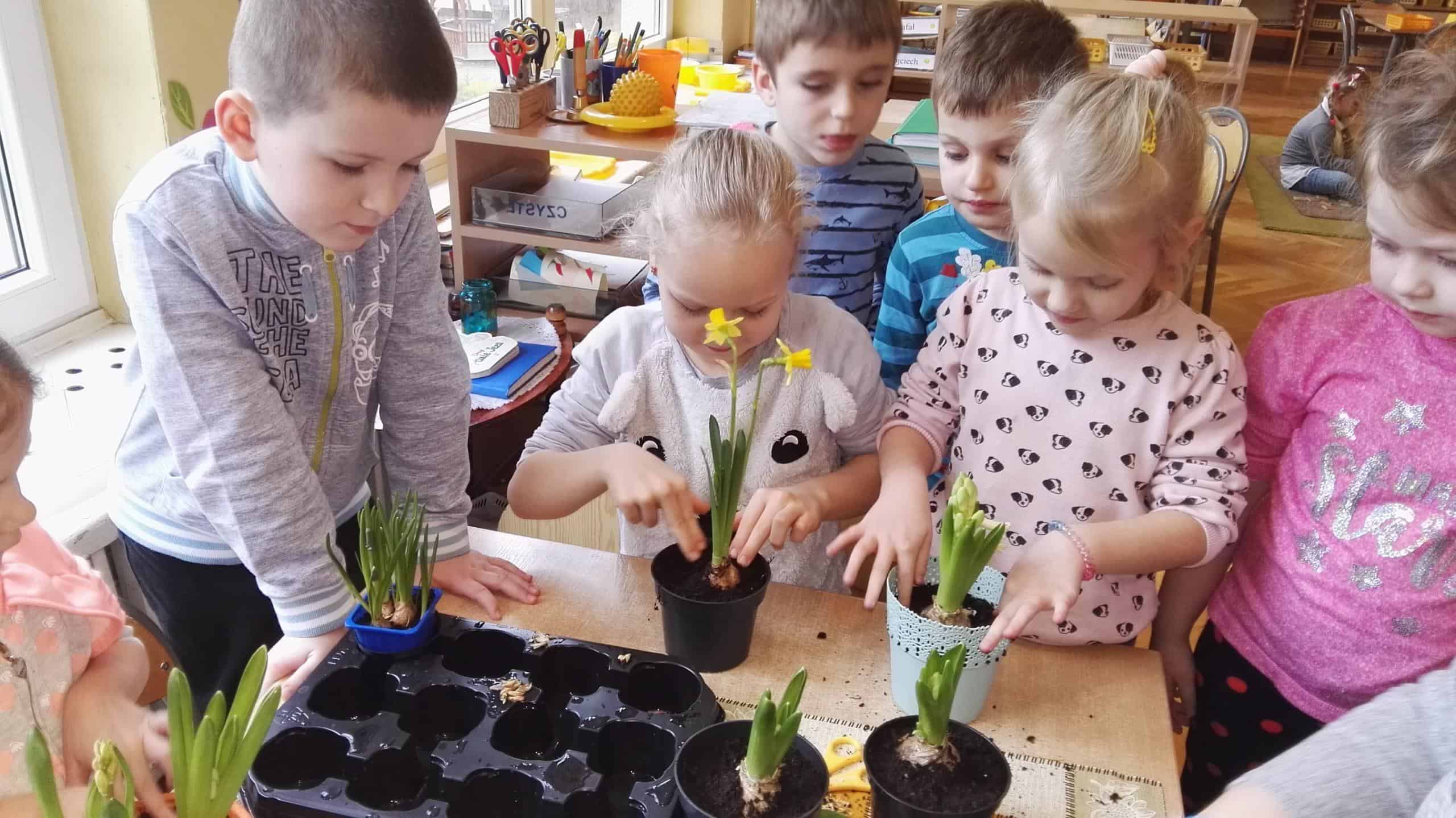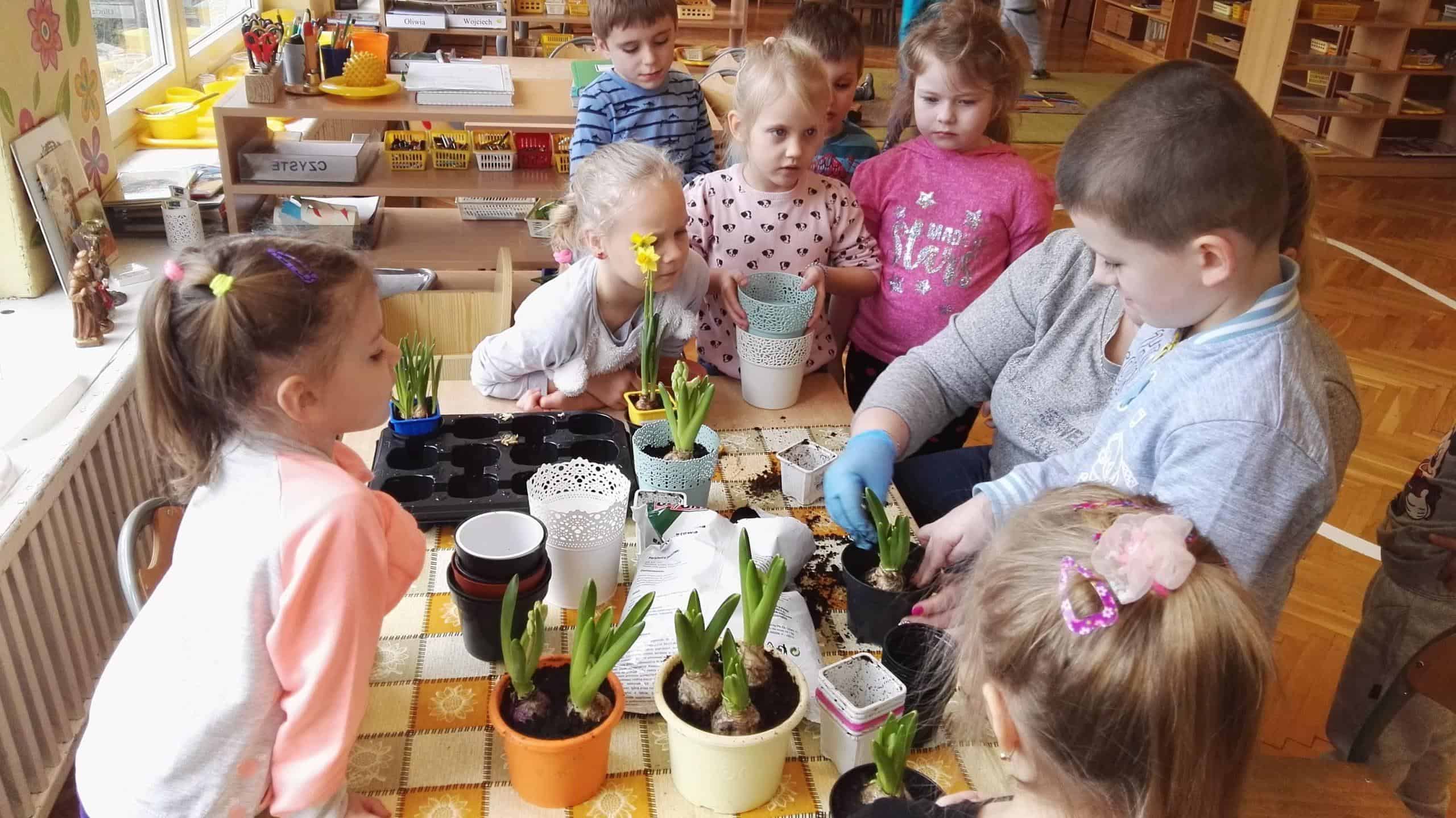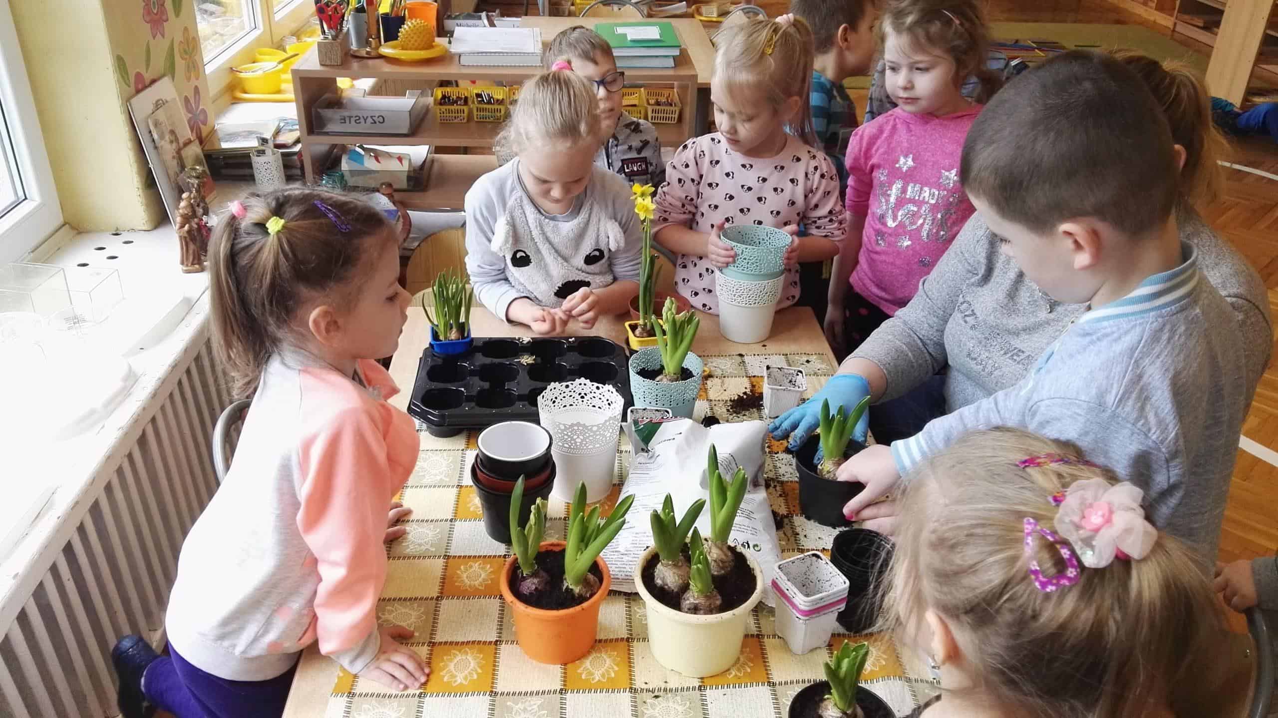Choć za oknem jeszcze śnieg, a dzieci nie mogąc doczekać się ciepłej wiosny postanowiły założyć hodowlę kwiatów cebulkowych. Kwiaty to bardzo atrakcyjny temat do poznawania i obserwowania sposobu wzrostu, daje dzieciom możliwość obserwacji zmian jakie zachodzą w okresie wczesnego przedwiośnia. W związku z tym wspólnie zasadziliśmy rośliny a nasz parapet wypełniły doniczki z hiacyntami, żonkilami i szafirkami. W czasie sadzenia kwiatów dzieci poszerzały swoje wiadomości na temat warunków niezbędnych do rozwoju roślin. Teraz pozostało już tylko obserwować jak rosną i zakwitną. Dziękujemy rodzicom którzy chętnie włączyli się wzbogacając nasz kącik przyrodniczy w sadzonki kwiatów.