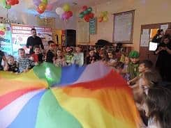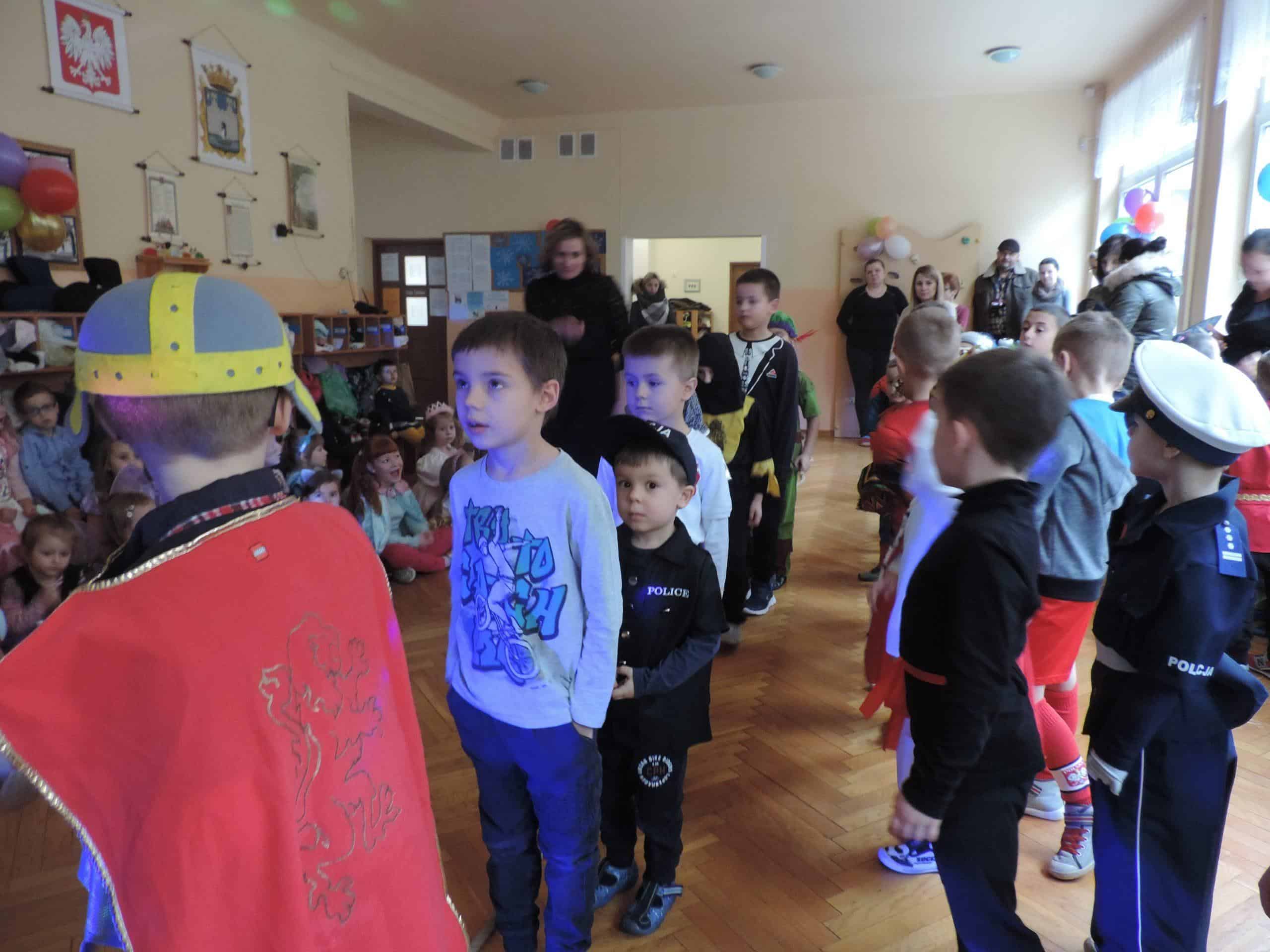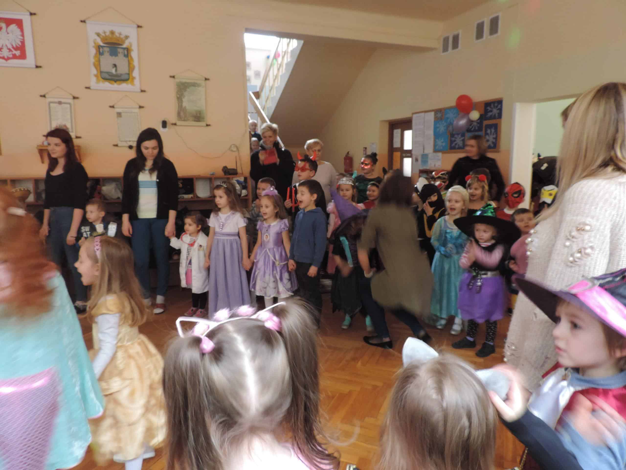 Dzieci z wielką ochotą uczestniczyły też we wspólnych zabawach i konkursach, przygotowanych przez p. Dominika. Podczas przerwy w balu dzieci mogły chwilę odpocząć i napić się soku, po czym muzyka znowu porwała wszystkie przedszkolaki do wspólnej zabawy. Na Sali zrobiło się kolorowo, wszyscy wesoło się bawili a uśmiech i radość nie znikały z twarzy szczęśliwych dzieci. Kiedy czas zabawy dobiegł końca dzieci z żalem opuszczały nasz hol, który na czas zabawy stał się wielką salą balową. Bal umożliwił dzieciom spędzenie czasu w miłej atmosferze, a wspólna zabawa przyniosła im wiele radości.