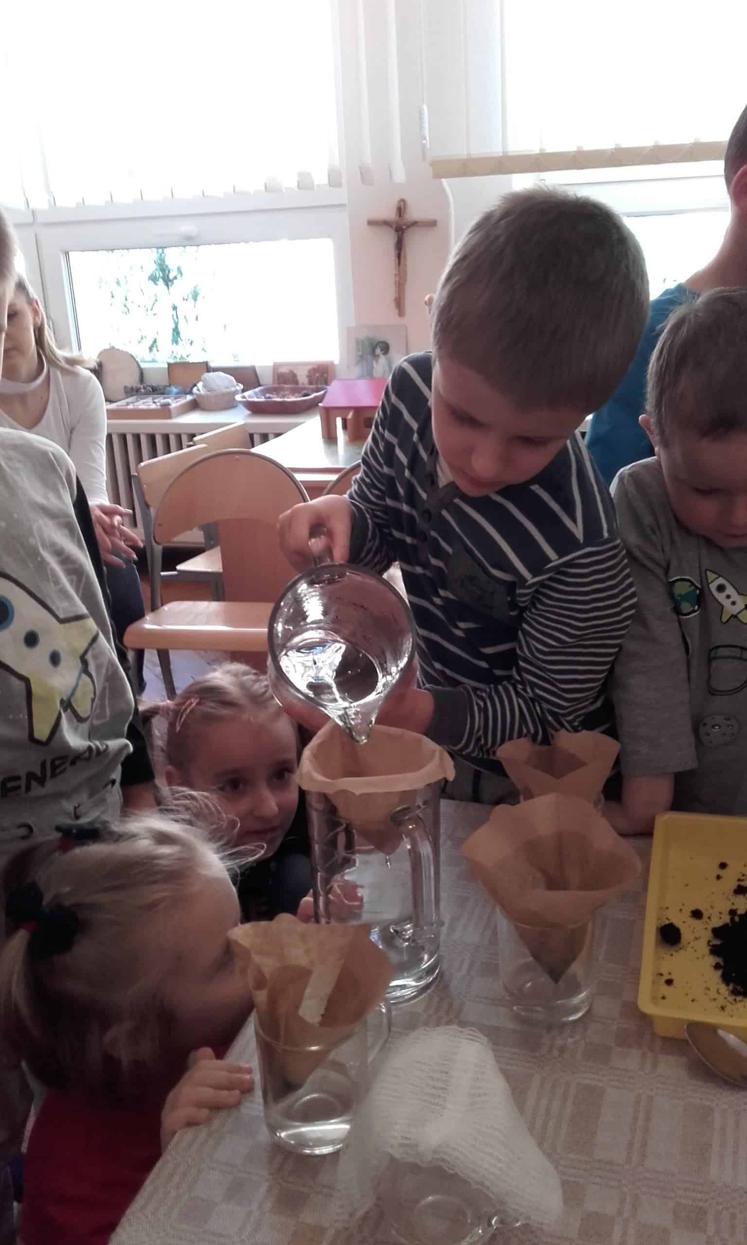 Tematyka przyrodnicza przekazywana w formie eksperymentów, doświadczeń wzbudza duże zainteresowanie wśród dzieci. Stwarzanie funkcjonalnych stref badawczych stanowi dodatkową stymulację polegającą na potęgowaniu ciekawości świata. Kolejnym tematem realizowanym w ramach realizacji projektu „Działam, doświadczam, odkrywam” była woda, jej czystość i nasz wpływ na jej jakość. Na co dzień dzieci bardzo chętnie eksperymentują z wodą w przedszkolu- przelewają, odlewają, dolewają, zabarwiają różnymi kolorami, badają co w niej pływa, a co tonie. Tym razem poruszyliśmy następujące tematy: skąd pochodzi woda ( źródło: strumyk, rzeka , jezioro, morze ocean), określanie charakterystycznych cech wody (barwa, konsystencja, zapach , temperatura), poznanie wody jaka źródła przyjemności ( zabawy z wodą). Definiowanie i ustalanie czym jest woda nie było trudne. Jednak najistotniejszym tematem było uświadomienie jej znaczenia dla roślin, zwierząt i człowieka. Dzieci z ochotą podawały przykłady działania człowieka wpływającego na zanieczyszczenie wody. Do eksperymentu wykorzystaliśmy gazę i filtry do kawy. Najpierw wodę wymieszaliśmy z ziemią, wrzuciliśmy do niej drobne kamyczki, grudki i rozpoczęliśmy proces filtrowania wody obserwując powolny proces jej oczyszczania. Dzieci były bardzo zaangażowane i aktywne, szybko wyłaniały wnioski. Zrozumiały że mają wpływ na jakość życia na Ziemi i dowiedziały się, jak postępować, by oszczędzać wodę i jej nie zanieczyszczać. Człowiek od zarania dziejów, korzystając z bogactw naturalnych Ziemi wyrządził jej wiele krzywd, które stanowią poważne zagrożenia równowagi. Ochrona środowiska, w tym wody ma ogromne znaczenie na jakość życia na Ziemi przyszłych pokoleń.