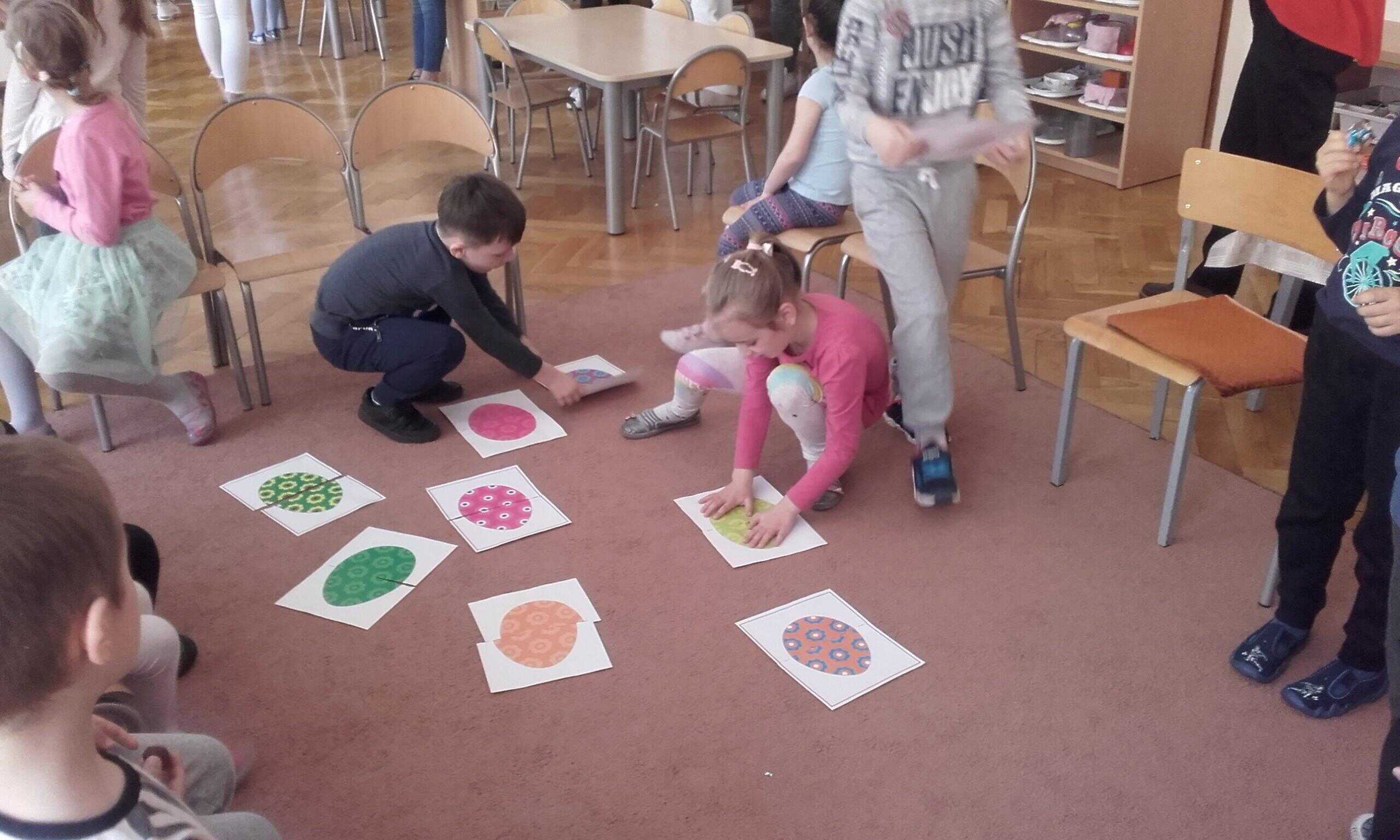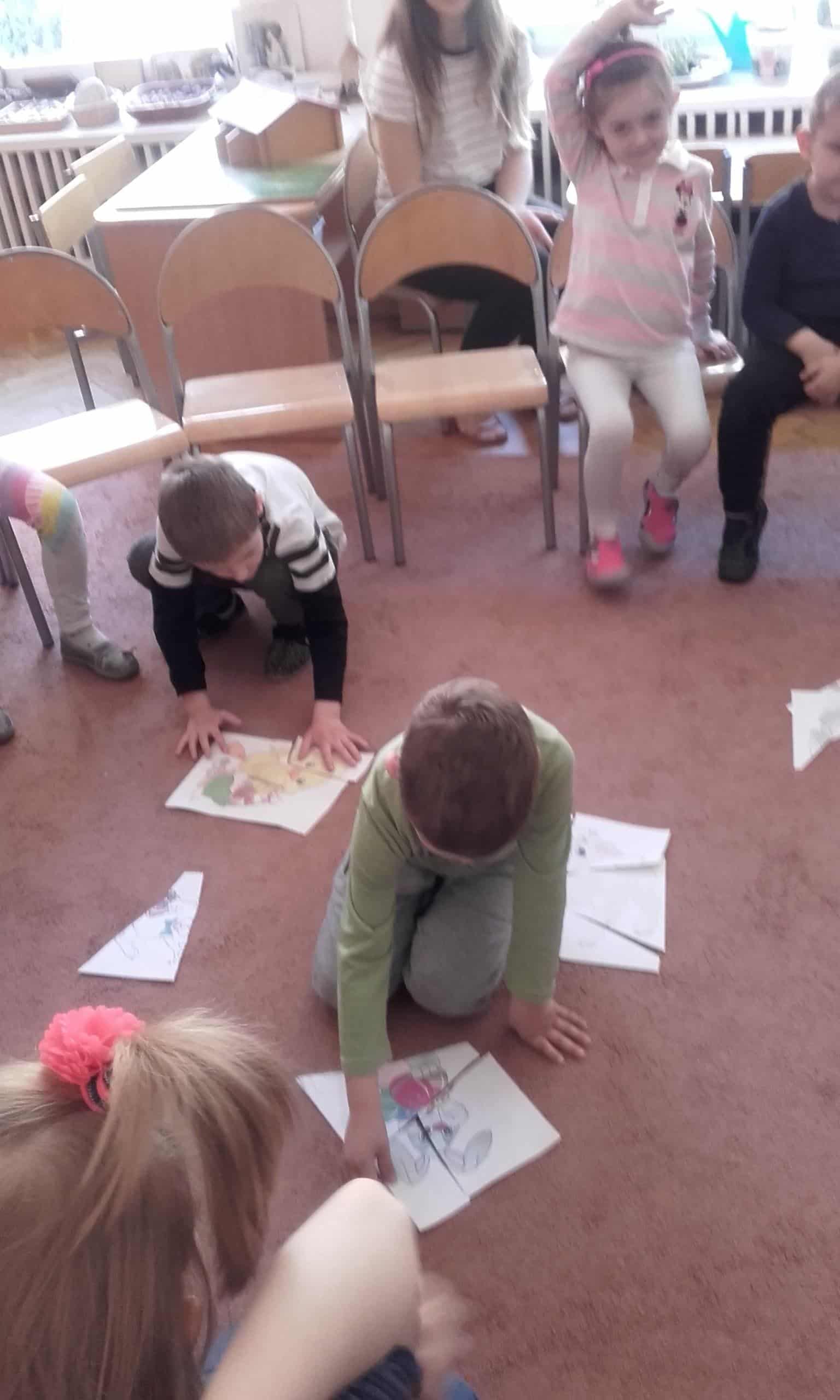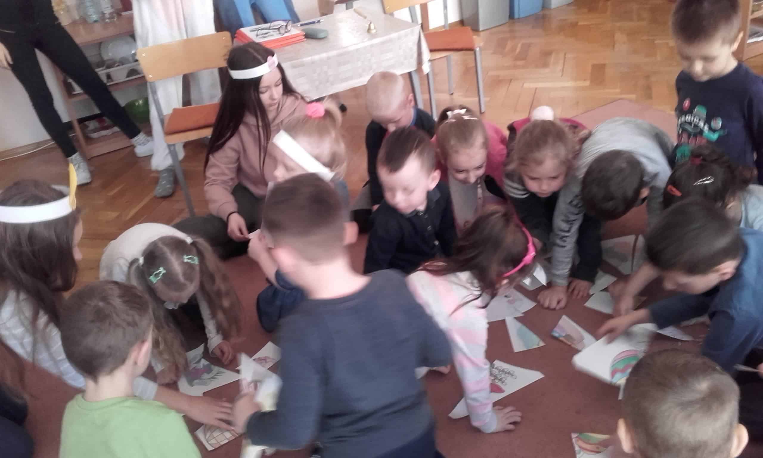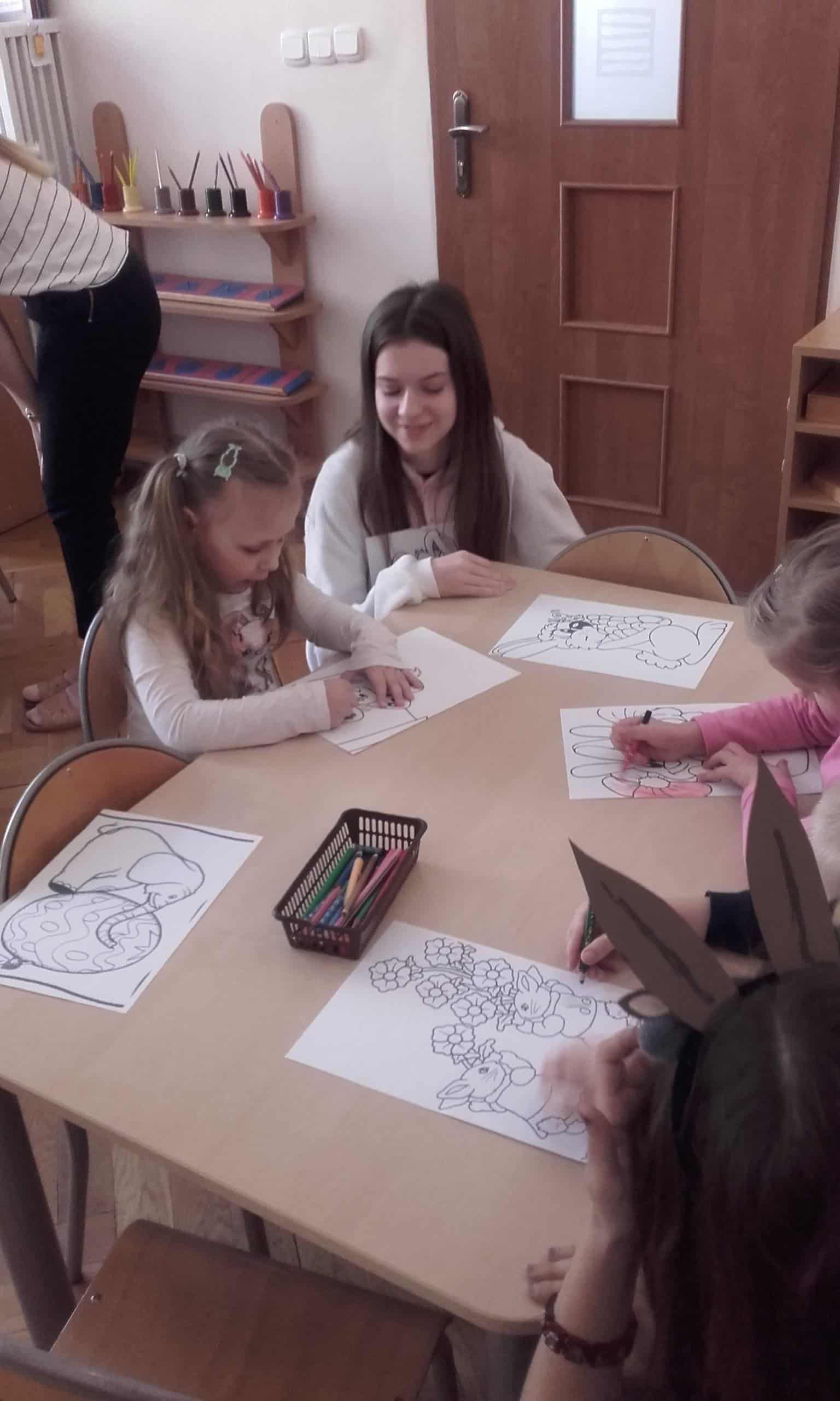 Efektem współpracy Grupy Pomarańczowej z Zespołem Szkół Innowacyjnych w Jarosławiu są cykliczne zajęcia z języka angielskiego prowadzone przez uczennice klasy o profilu psychologiczno – pedagogicznym. Tym razem tematem przewodnim tych zajęć były zbliżające się Święta Wielkanocne. Dzieci gromadziły angielskie słownictwo nawiązujące do Wielkanocy. Zabawa ruchowa przy piosence o zajączkach i barankach bardzo się dzieciom spodobała. Zadanie grupowe polegające na odszukaniu ukrytych w sali zajęć części pisanek i układanie ich w całość bardzo pochłonęło dzieci. Również chętnie dzieci kolorowały obrazki tematycznie nawiązujące do Wielkanocy. Utrwalenie słówek odbyło się podczas układania obrazkowych puzzli przedstawiających pisanki, baranki, zajączki i palmy wielkanocne.