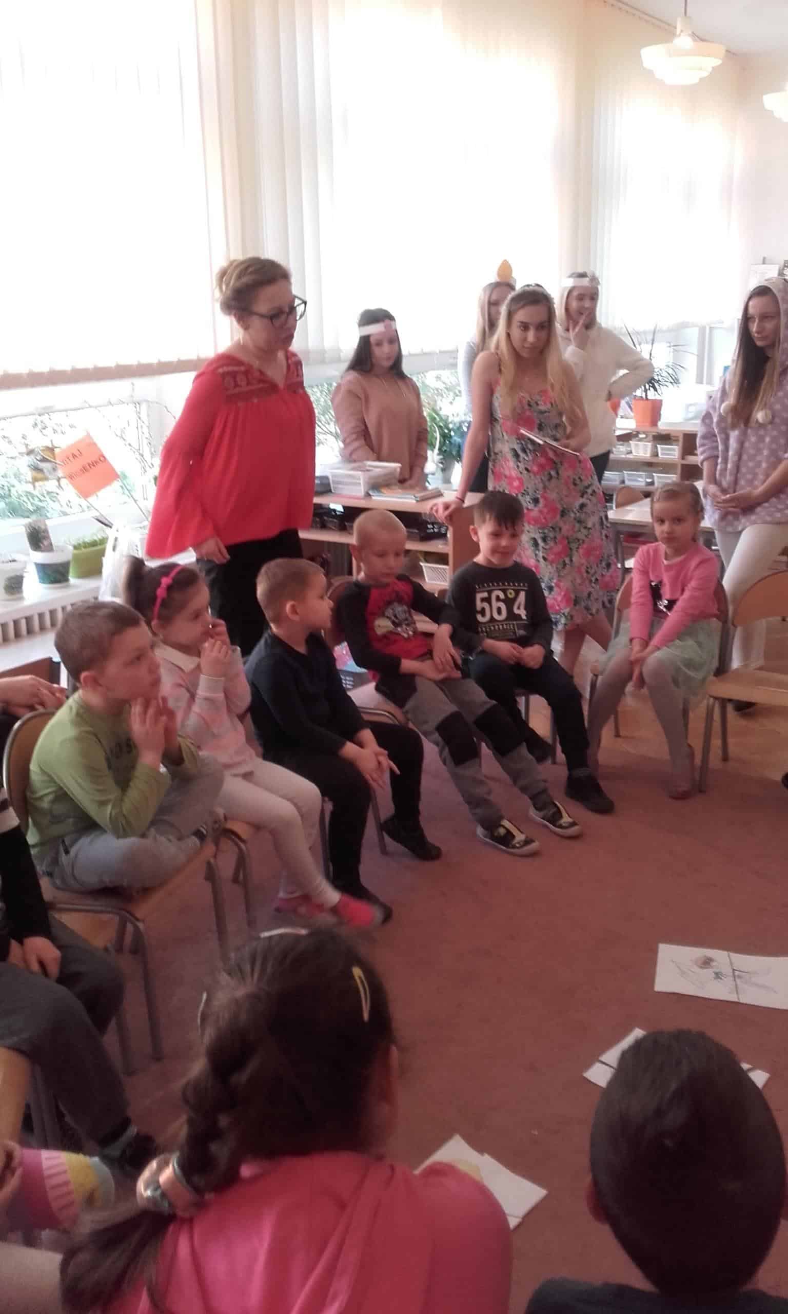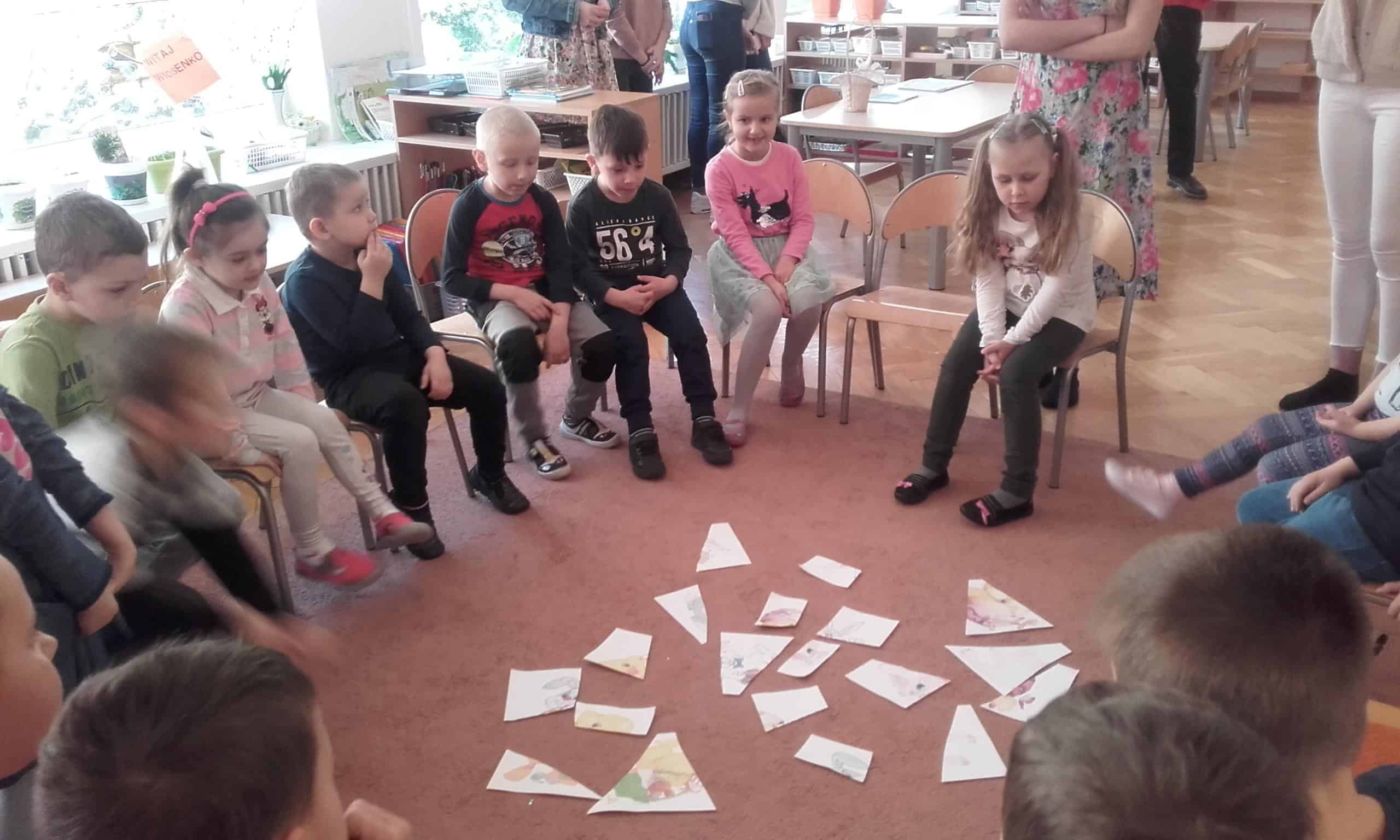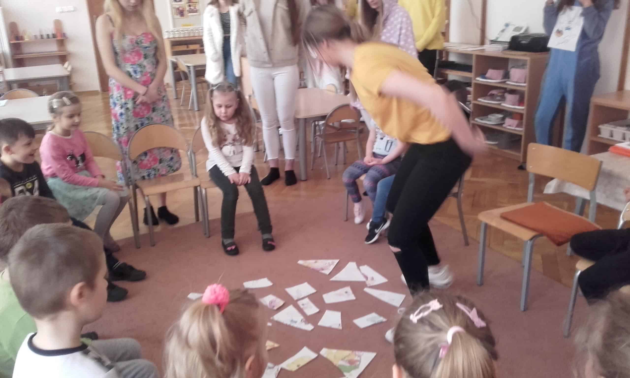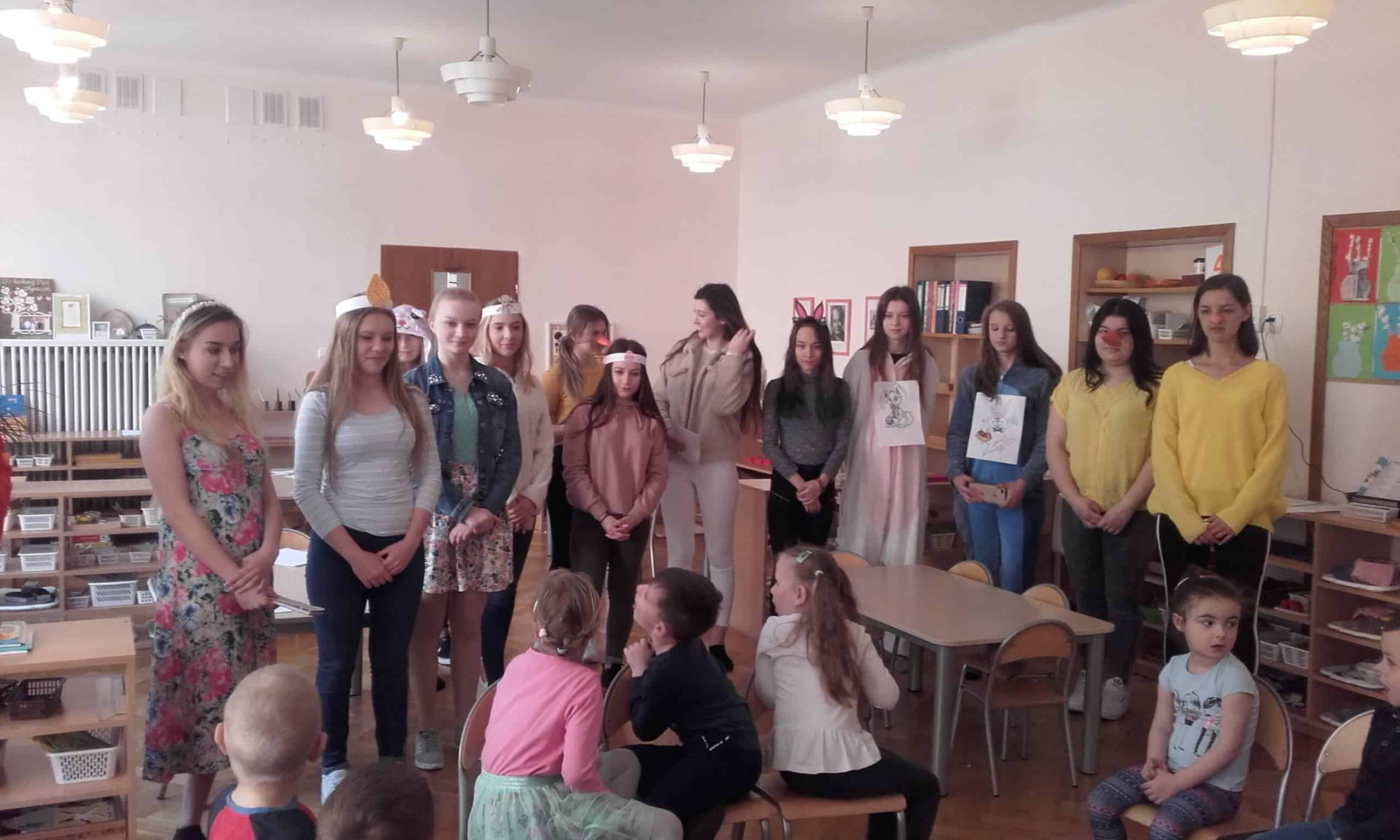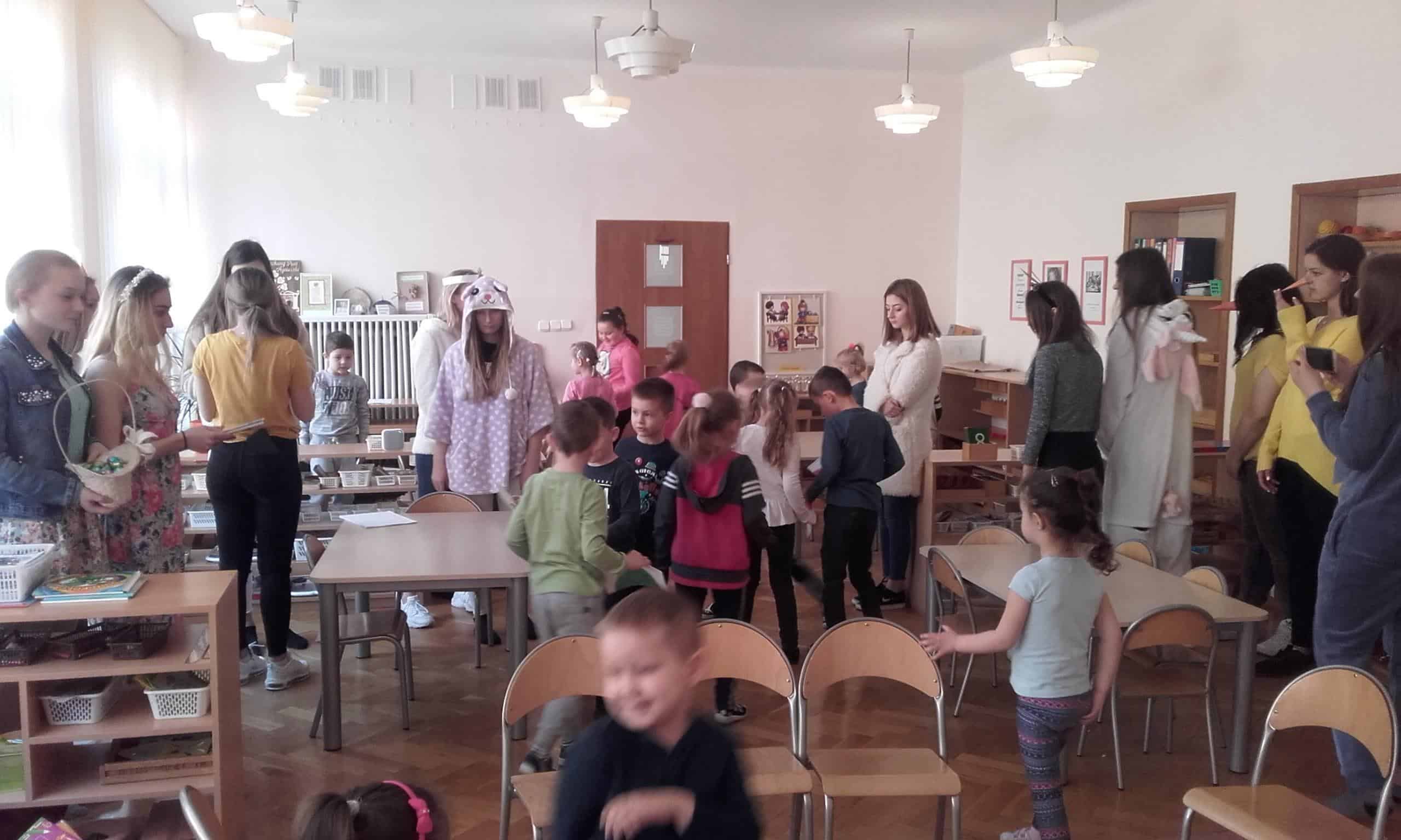 Efektem współpracy Grupy Pomarańczowej z Zespołem Szkół Innowacyjnych w Jarosławiu są cykliczne zajęcia z języka angielskiego prowadzone przez uczennice klasy o profilu psychologiczno – pedagogicznym. Tym razem tematem przewodnim tych zajęć były zbliżające się Święta Wielkanocne. Dzieci gromadziły angielskie słownictwo nawiązujące do Wielkanocy. Zabawa ruchowa przy piosence o zajączkach i barankach bardzo się dzieciom spodobała. Zadanie grupowe polegające na odszukaniu ukrytych w sali zajęć części pisanek i układanie ich w całość bardzo pochłonęło dzieci. Również chętnie dzieci kolorowały obrazki tematycznie nawiązujące do Wielkanocy. Utrwalenie słówek odbyło się podczas układania obrazkowych puzzli przedstawiających pisanki, baranki, zajączki i palmy wielkanocne.