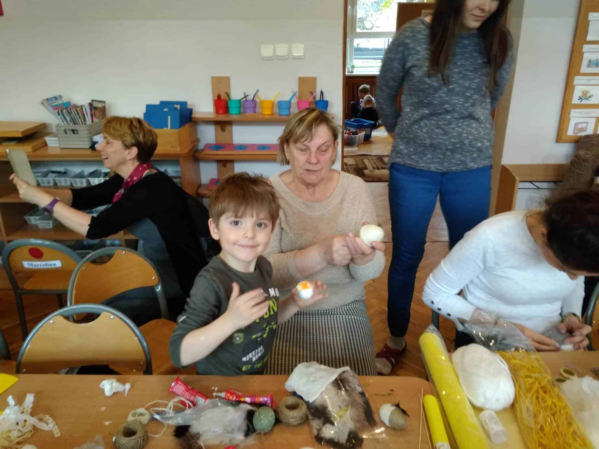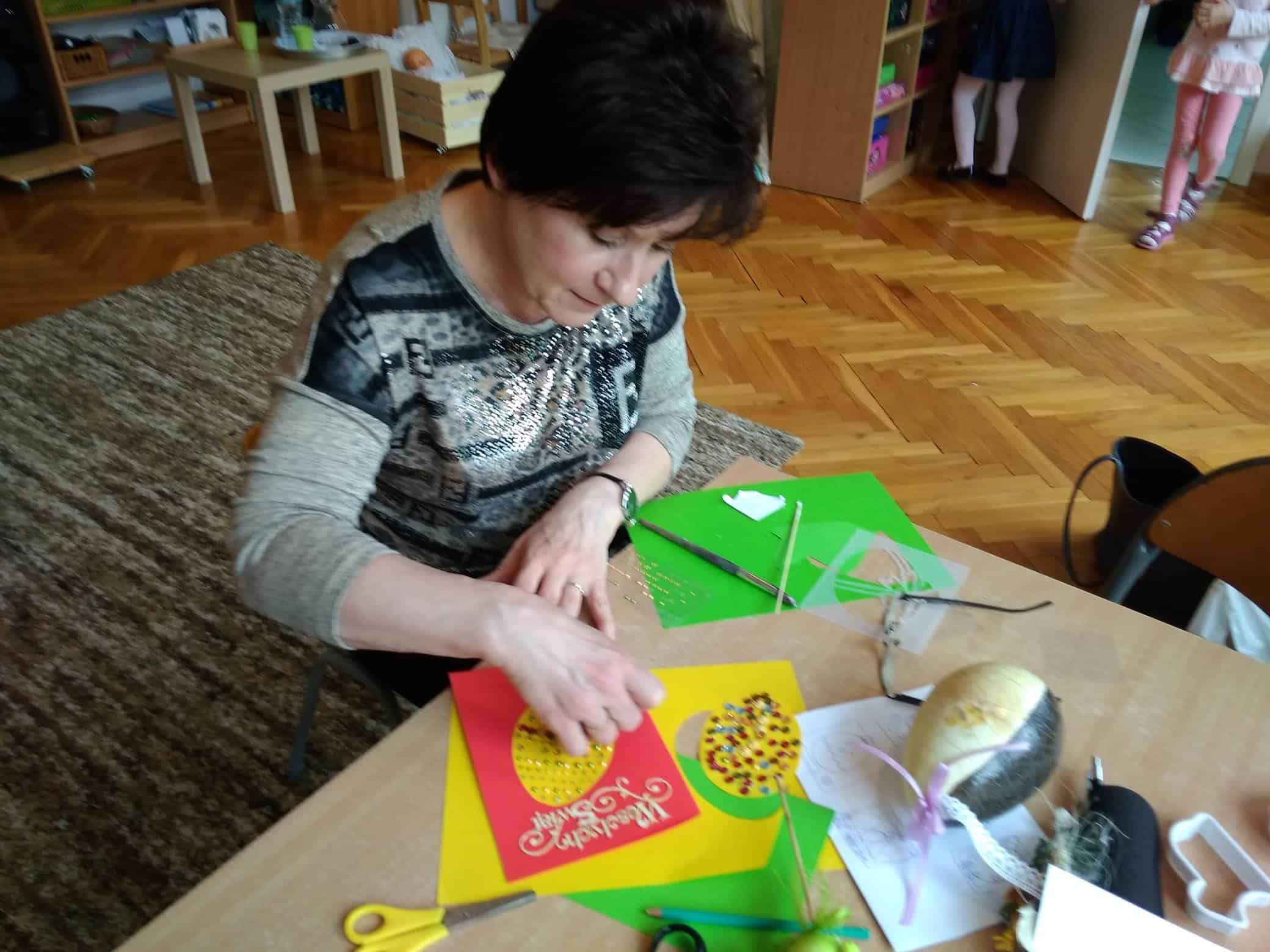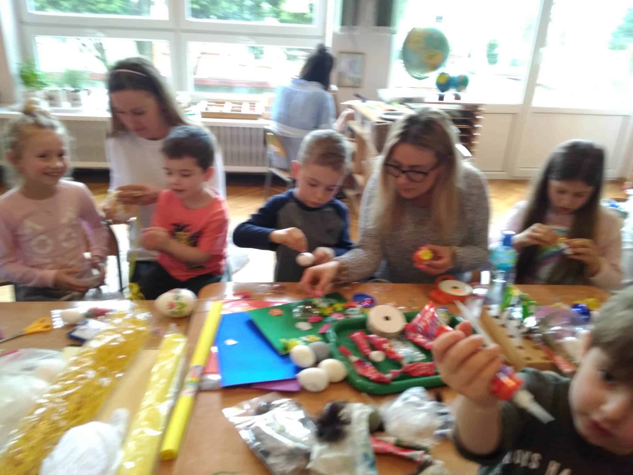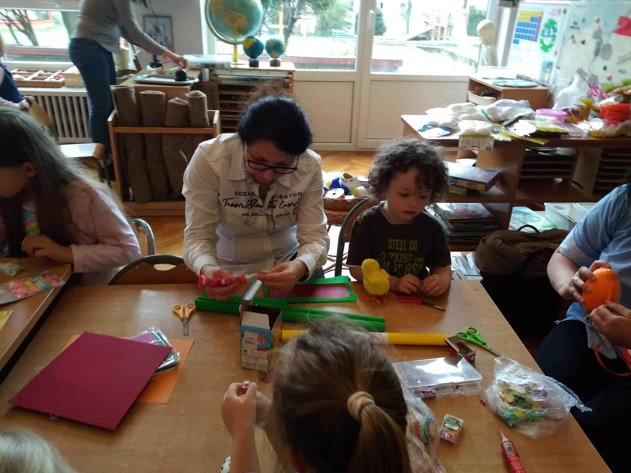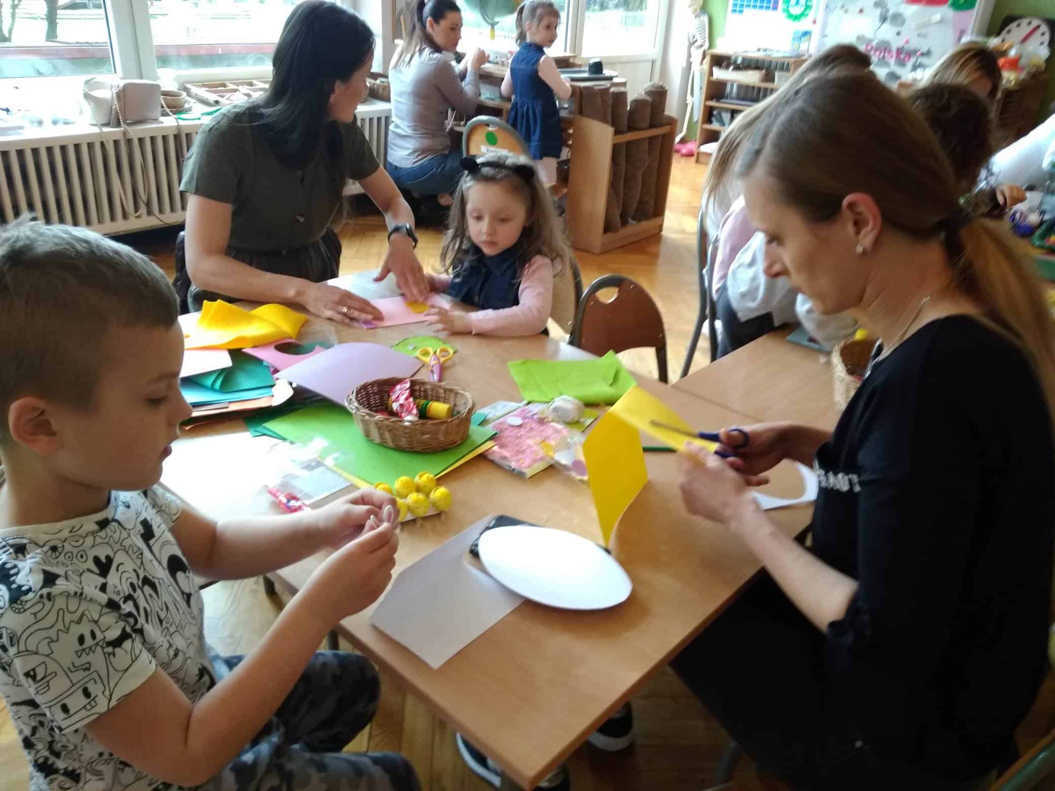 Nasze przedszkole bardzo ceni sobie współpracę z Rodzicami, oraz ich zaangażowanie w proces rozwoju dziecka. Wśród Rodziców największym powodzeniem cieszą się zajęcia w których mogą bezpośrednio uczestniczyć. Warsztaty z Rodzicami to propozycja wspólnej zabawy i nauki z dzieckiem. Proponowane aktywności umożliwiają nawiązanie bezpośrednich relacji z innymi dziećmi i ich Rodzicami, a także pozwalają lepiej poznać środowisko przedszkolne. Aby w przedszkolu zagościła świąteczna atmosfera zorganizowaliśmy dla dzieci, rodziców, oraz innych członków rodzin warsztaty plastyczne Wielkanocne kartki, pisanki, ozdoby. Nasza sala zamieniła się na dwie godziny w pracownię plastyczną, w której działo się wiele ciekawych rzeczy. Babcie, ciocie oraz rodzice odkrywali swoje talenty plastyczne, a dzieci zamieniły się w prawdziwych artystów. Wszyscy pracowali z ogromnym zapałem ale był też i czas na miłe pogawędki. Wszyscy wykazali się dużą kreatywnością i inwencją twórczą. Wykonane prace zostały umieszczone na wystawie przedszkolnej, przez co magia świąt zagościła już w naszym przedszkolu.