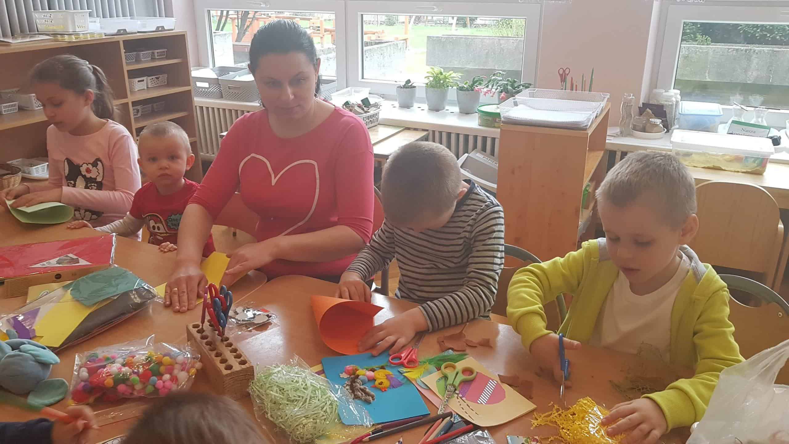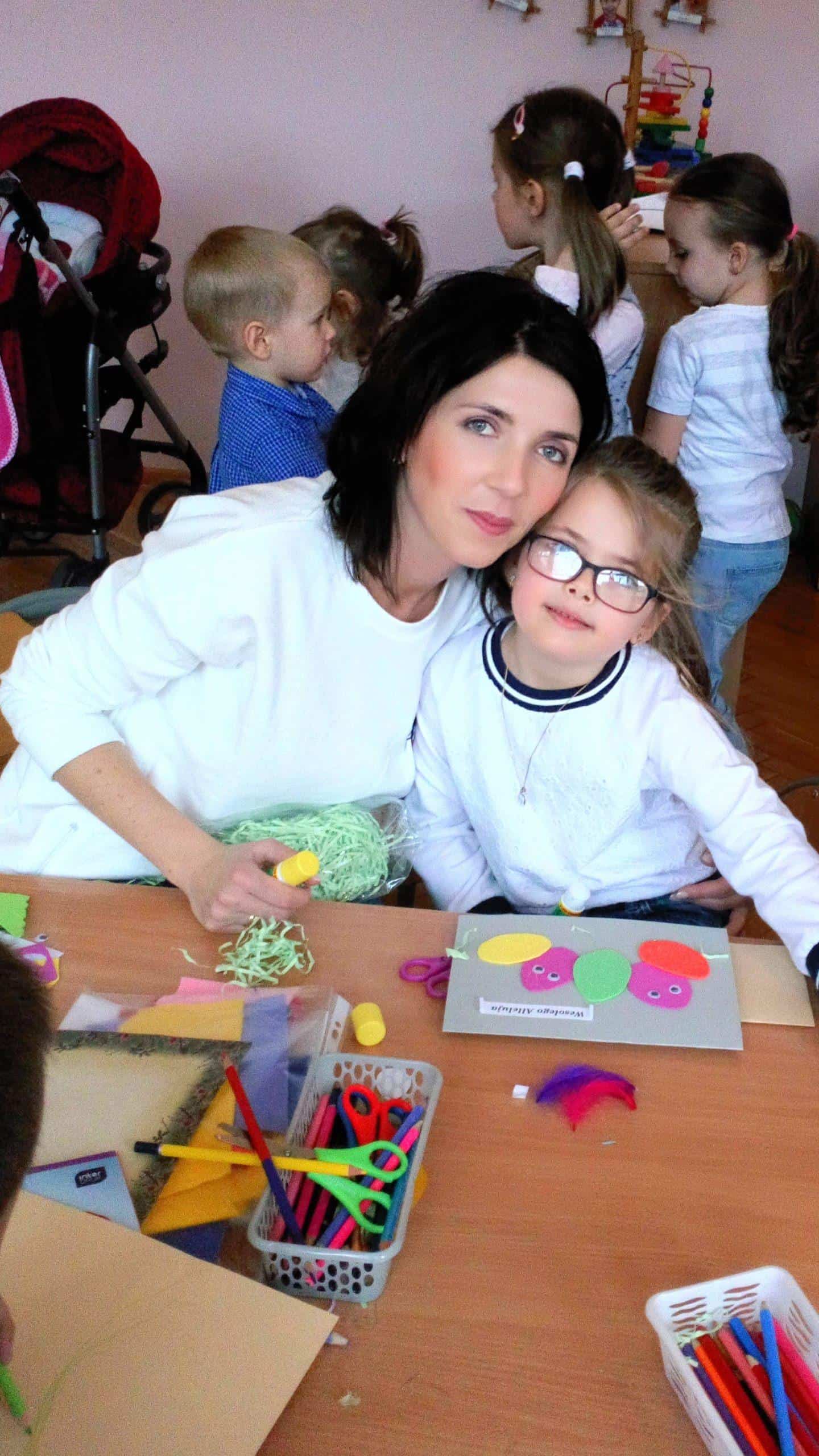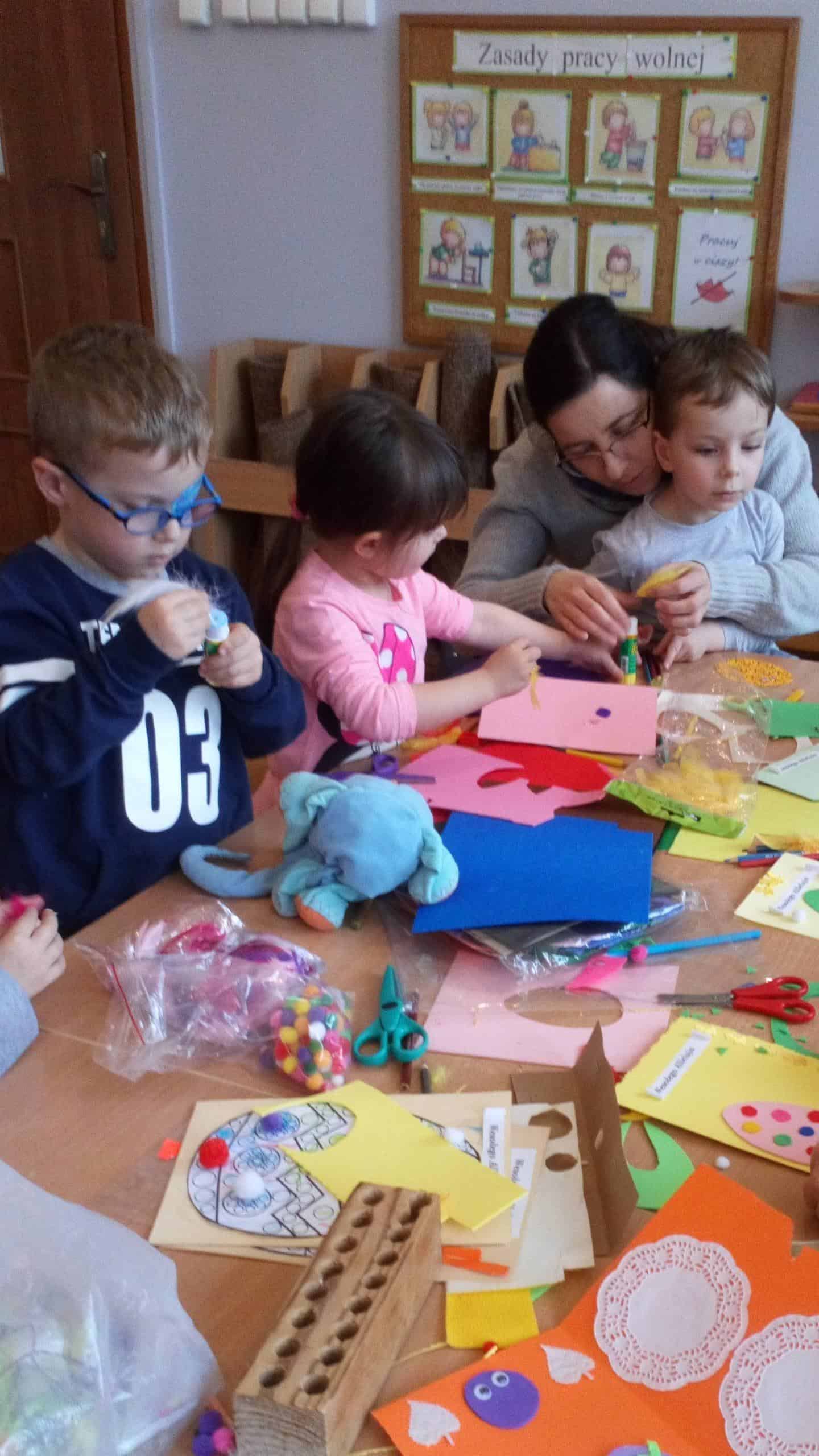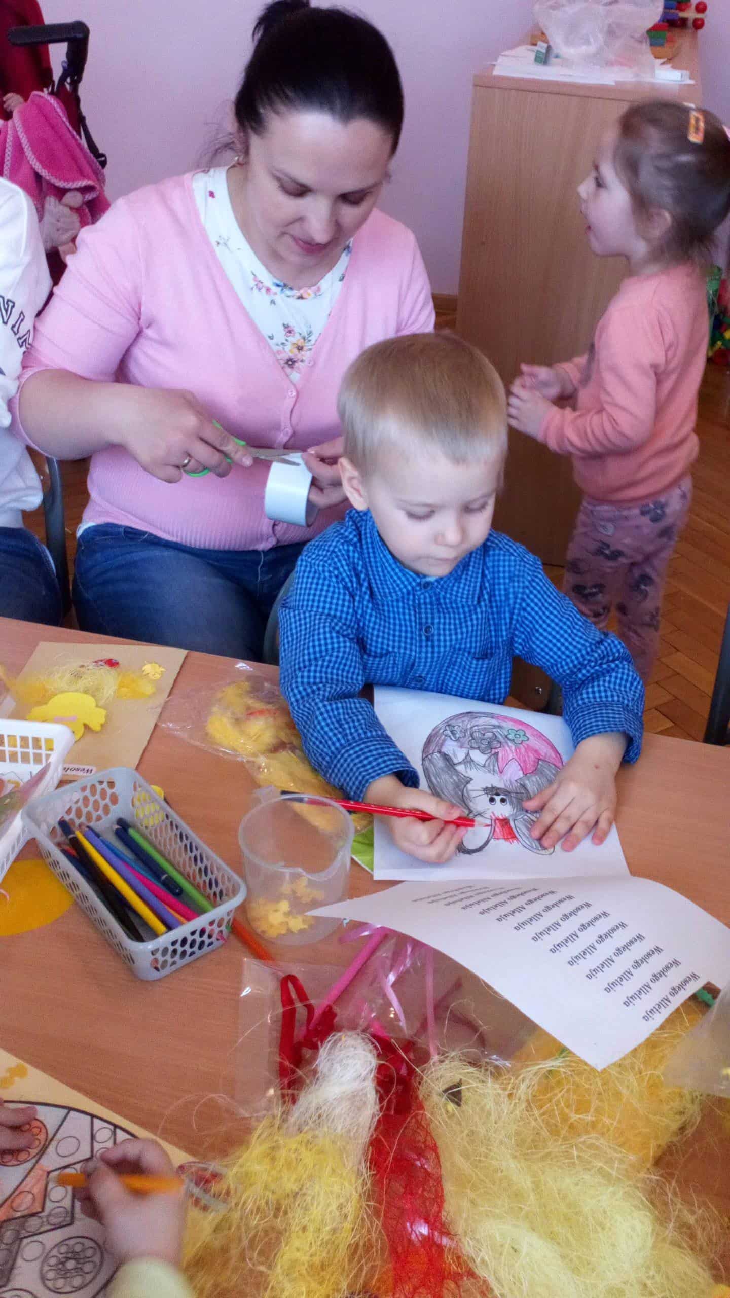 Dziękujemy wszystkim obecnym na warsztatach – małej Emilii, która cierpliwie i cichutko leżała w wózeczku czekając aż mamusia skończy tworzyć karteczki z Gabrysią i Kinią, nieco starszemu Wojtusiowi, braciszkowi Kubusia, który zajął się poznawaniem materiałów na półkach i przez to dał spokojnie pracować mamusi, Oli i Kubusiowi, Milence, która swoimi zdolnościami plastycznymi dzielnie wspierała swoją siostrę Maję i pomagała innym, młodszym dzieciom z grupy, oczywiście Amelii i Wiktorii, o których wspominałam już wcześniej oraz naszym niezastąpionym i niezawodnym mamusiom, które starają się być zawsze i pomagać we wszystkim. Bardzo się cieszymy, że mamy tak uzdolnionych i chętnych do współpracy rodziców wdrażających w nasze życie przedszkolne także innych członków rodzin. W tym miejscu pragniemy również serdecznie podziękować babci naszego Michałka, która nie mogła być na warsztatach, ale chcąc zaznaczyć swój wkład w tworzenie ozdób świątecznych przekazała do grupy piękne, własnoręcznie dziergane ozdoby wielkanocne (kurczaczki, baranki, króliki), które zdobią naszą salę i przedszkolny hol. Dziękujemy za wspólnie spędzony czas i życzymy wesołych, zdrowych, radosnych Świąt Wielkanocnych.
