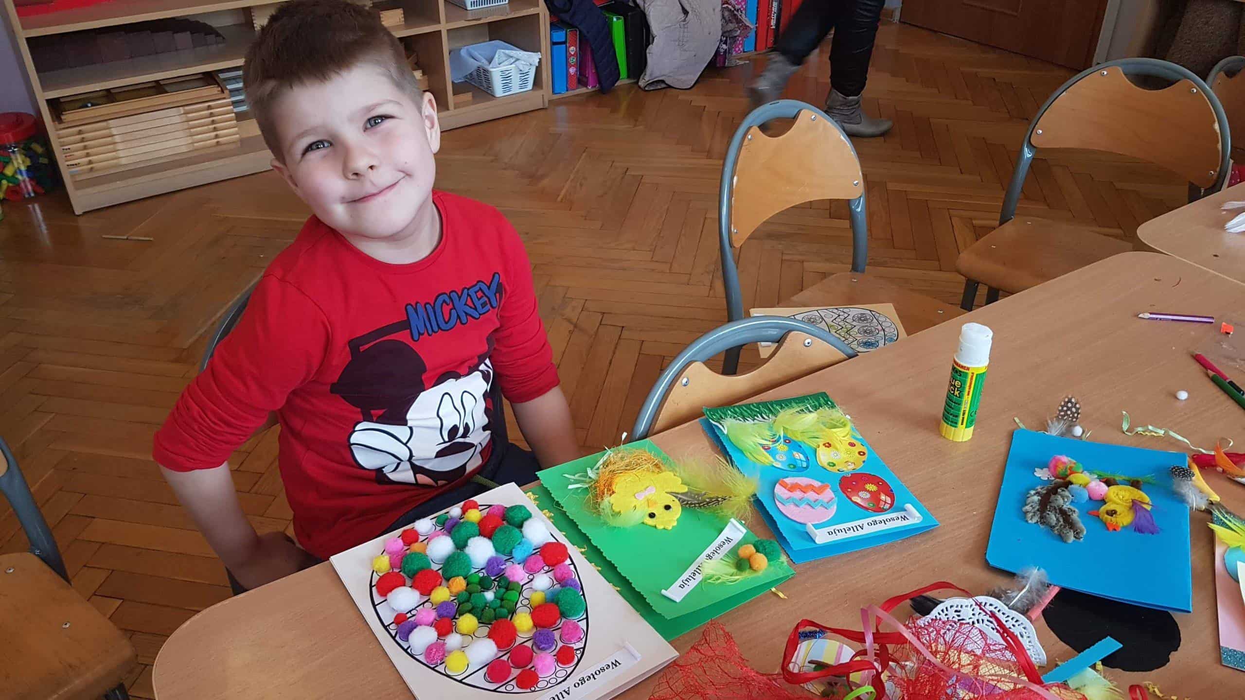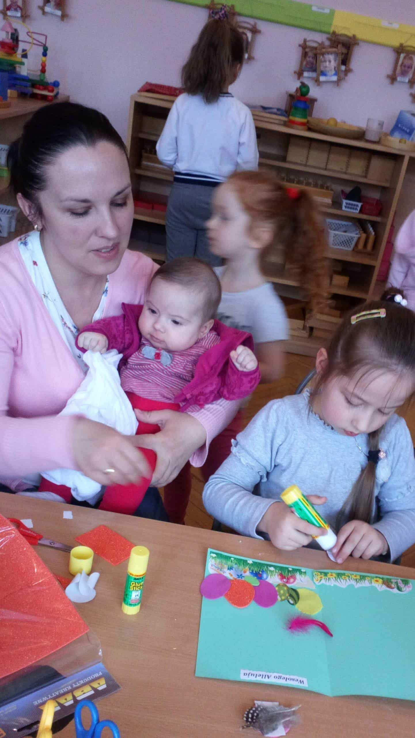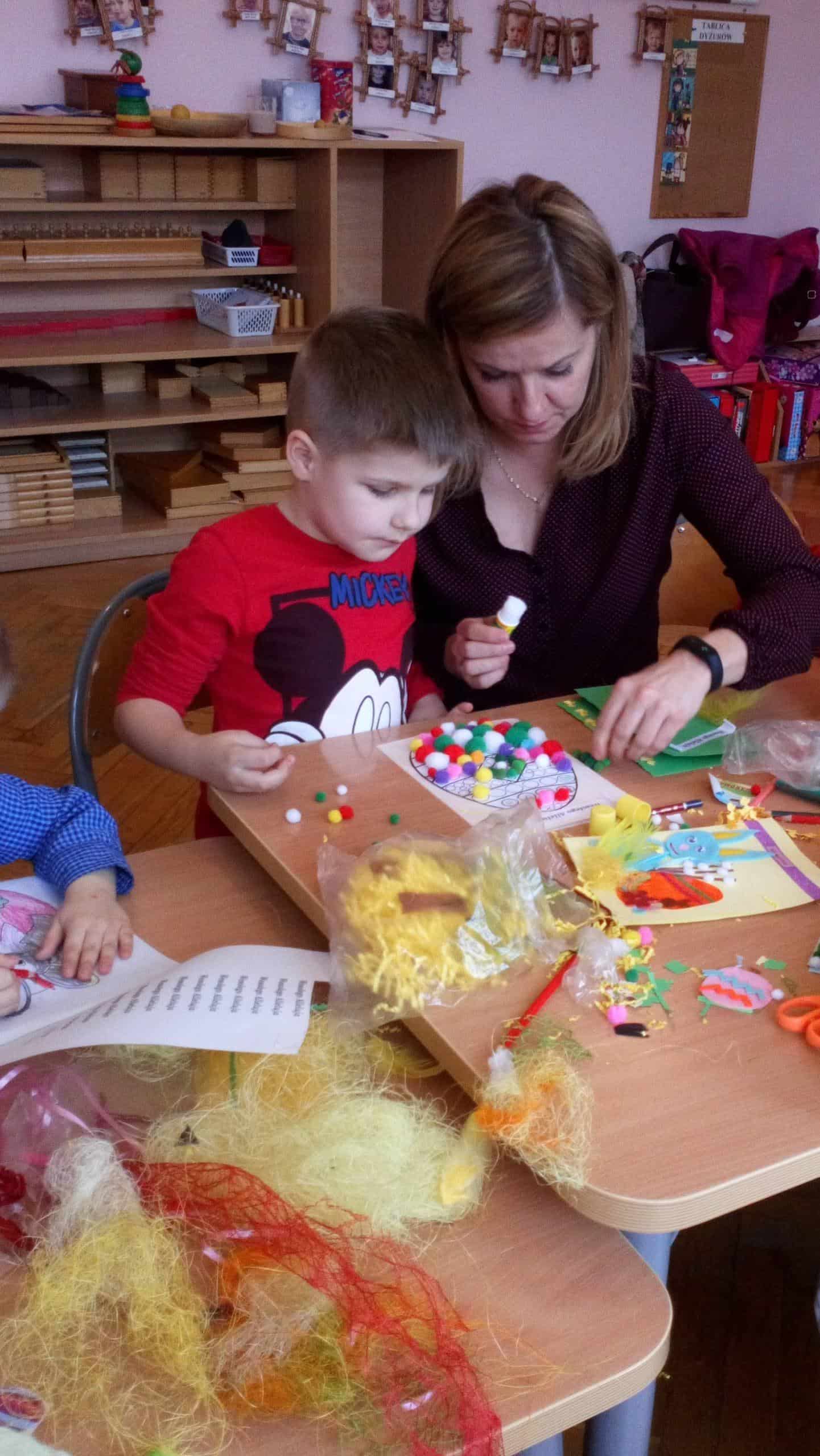 Dziękujemy wszystkim obecnym na warsztatach – małej Emilii, która cierpliwie i cichutko leżała w wózeczku czekając aż mamusia skończy tworzyć karteczki z Gabrysią i Kinią, nieco starszemu Wojtusiowi, braciszkowi Kubusia, który zajął się poznawaniem materiałów na półkach i przez to dał spokojnie pracować mamusi, Oli i Kubusiowi, Milence, która swoimi zdolnościami plastycznymi dzielnie wspierała swoją siostrę Maję i pomagała innym, młodszym dzieciom z grupy, oczywiście Amelii i Wiktorii, o których wspominałam już wcześniej oraz naszym niezastąpionym i niezawodnym mamusiom, które starają się być zawsze i pomagać we wszystkim. Bardzo się cieszymy, że mamy tak uzdolnionych i chętnych do współpracy rodziców wdrażających w nasze życie przedszkolne także innych członków rodzin. W tym miejscu pragniemy również serdecznie podziękować babci naszego Michałka, która nie mogła być na warsztatach, ale chcąc zaznaczyć swój wkład w tworzenie ozdób świątecznych przekazała do grupy piękne, własnoręcznie dziergane ozdoby wielkanocne (kurczaczki, baranki, króliki), które zdobią naszą salę i przedszkolny hol. Dziękujemy za wspólnie spędzony czas i życzymy wesołych, zdrowych, radosnych Świąt Wielkanocnych.