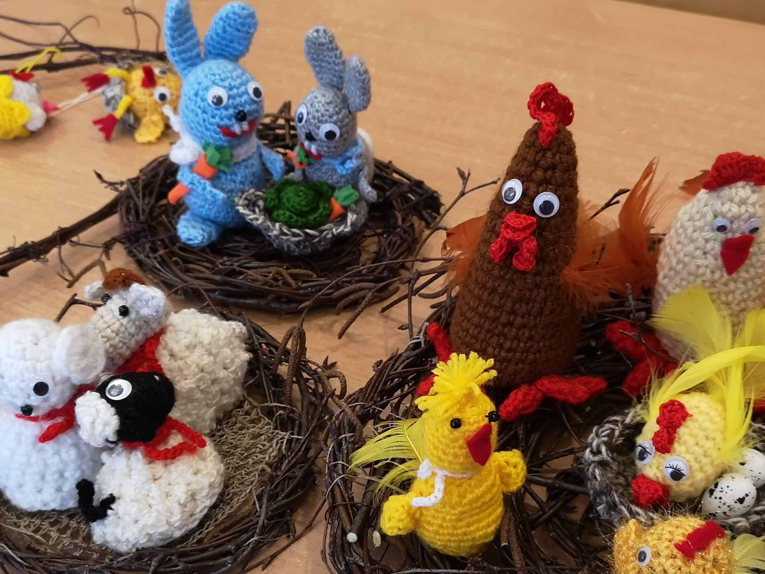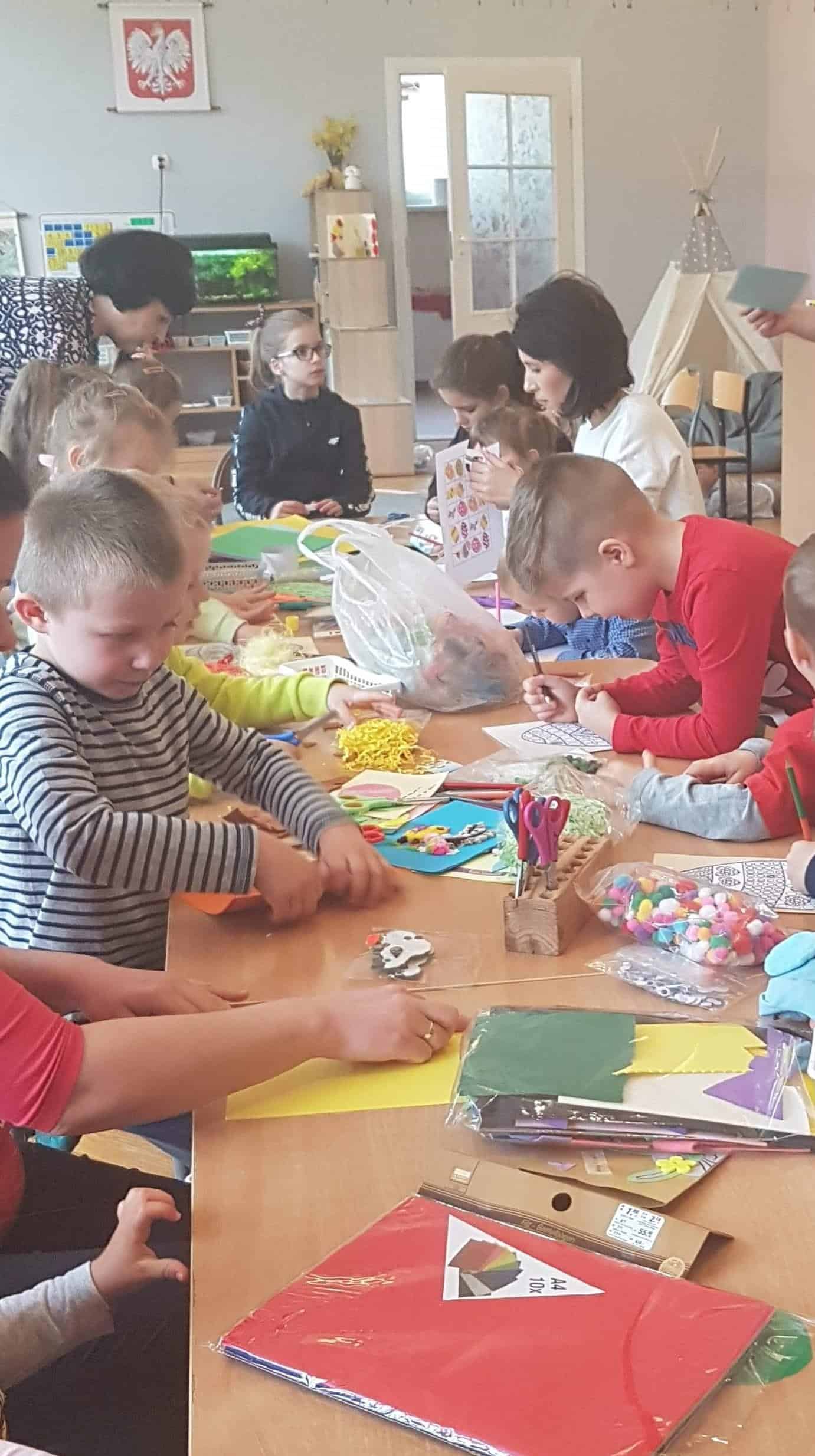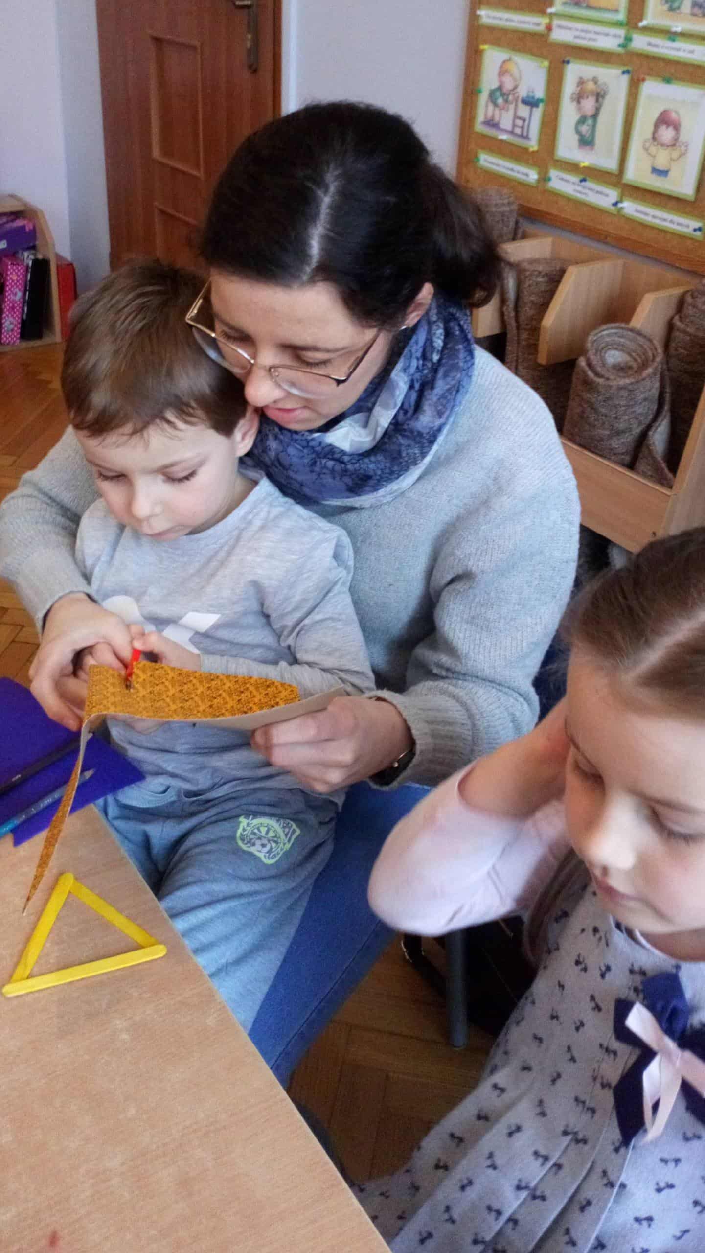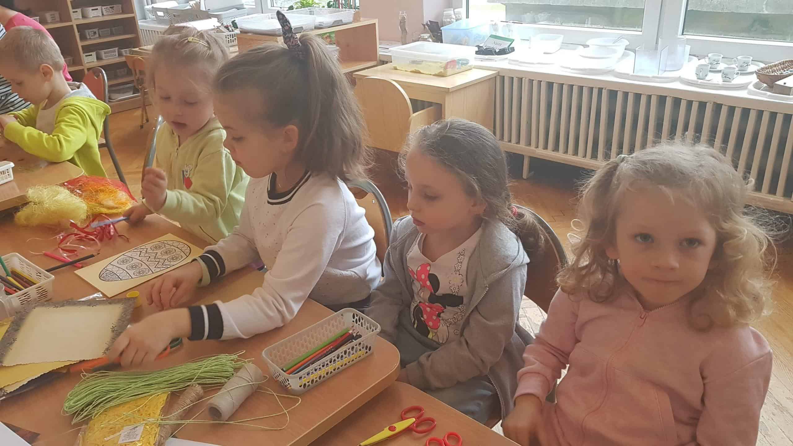 Dziękujemy wszystkim obecnym na warsztatach – małej Emilii, która cierpliwie i cichutko leżała w wózeczku czekając aż mamusia skończy tworzyć karteczki z Gabrysią i Kinią, nieco starszemu Wojtusiowi, braciszkowi Kubusia, który zajął się poznawaniem materiałów na półkach i przez to dał spokojnie pracować mamusi, Oli i Kubusiowi, Milence, która swoimi zdolnościami plastycznymi dzielnie wspierała swoją siostrę Maję i pomagała innym, młodszym dzieciom z grupy, oczywiście Amelii i Wiktorii, o których wspominałam już wcześniej oraz naszym niezastąpionym i niezawodnym mamusiom, które starają się być zawsze i pomagać we wszystkim. Bardzo się cieszymy, że mamy tak uzdolnionych i chętnych do współpracy rodziców wdrażających w nasze życie przedszkolne także innych członków rodzin. W tym miejscu pragniemy również serdecznie podziękować babci naszego Michałka, która nie mogła być na warsztatach, ale chcąc zaznaczyć swój wkład w tworzenie ozdób świątecznych przekazała do grupy piękne, własnoręcznie dziergane ozdoby wielkanocne (kurczaczki, baranki, króliki), które zdobią naszą salę i przedszkolny hol. Dziękujemy za wspólnie spędzony czas i życzymy wesołych, zdrowych, radosnych Świąt Wielkanocnych.