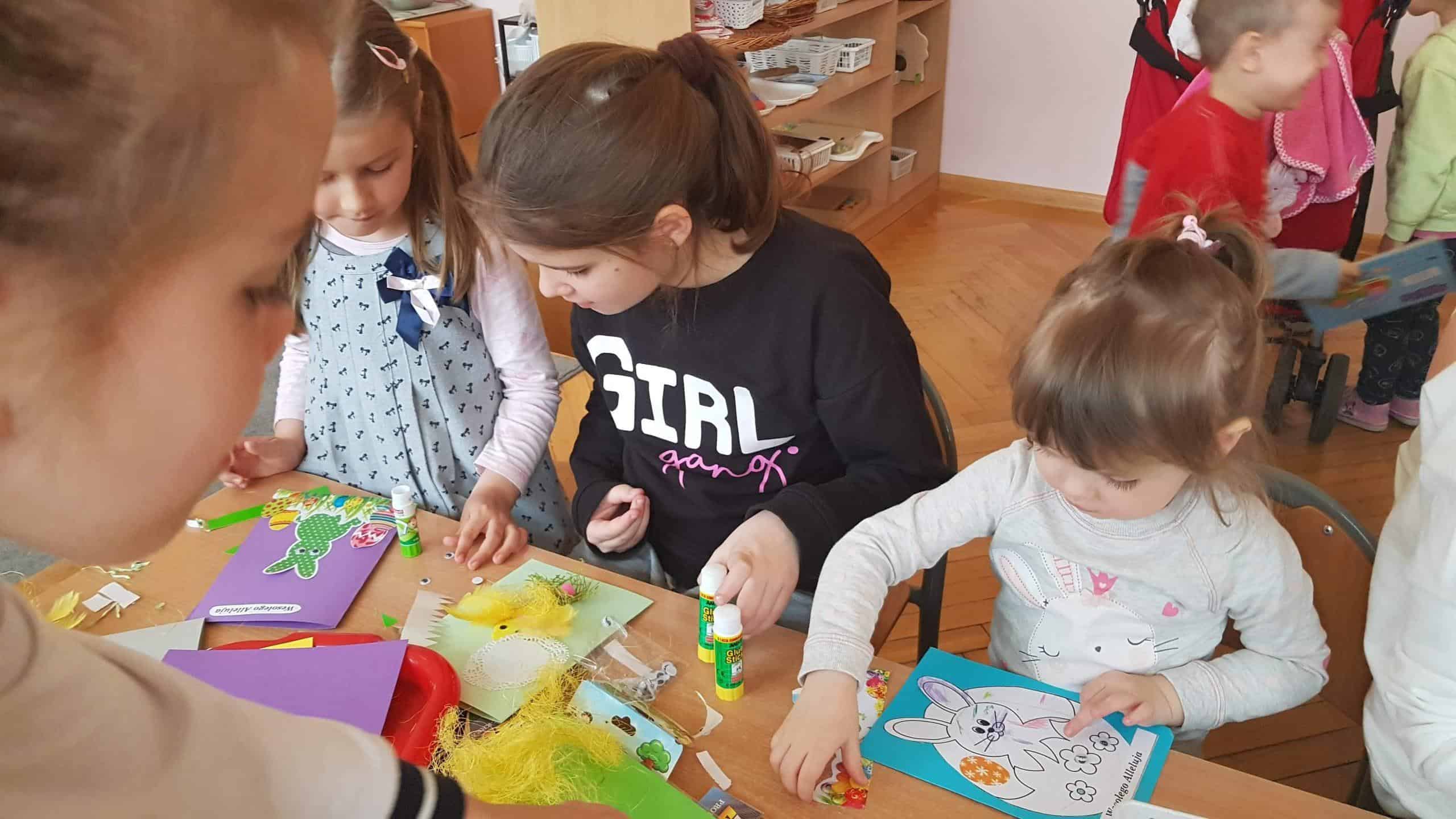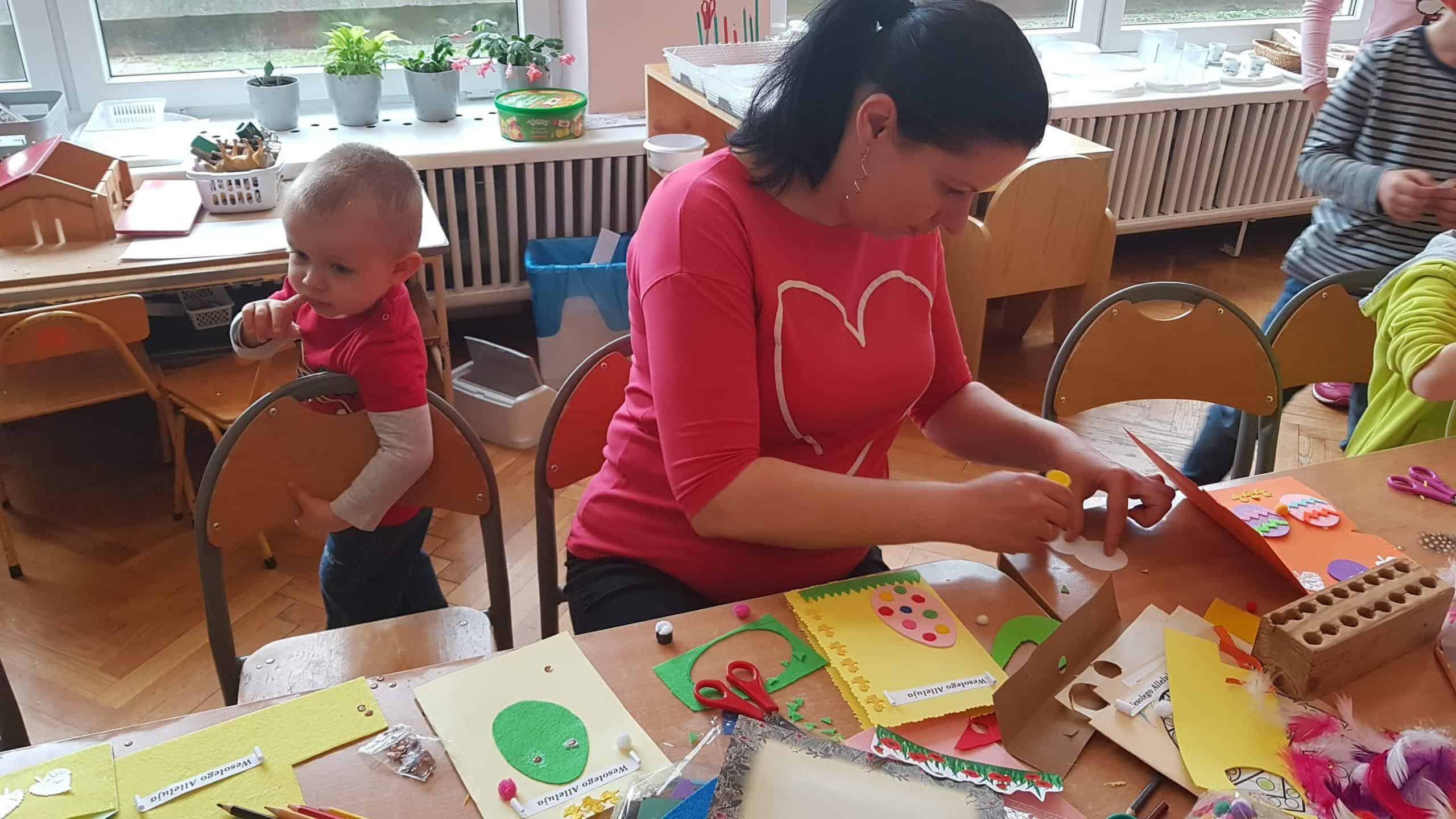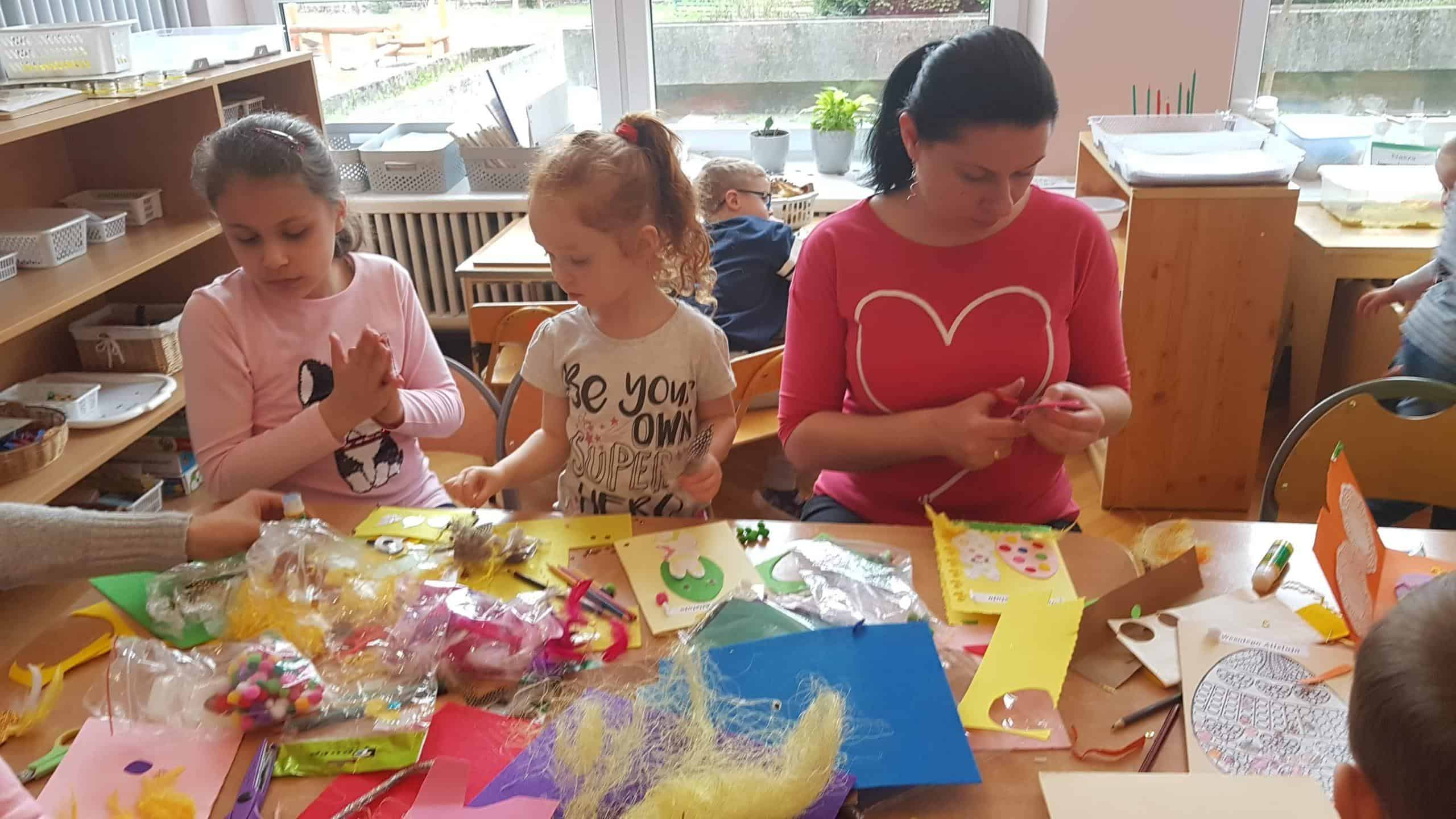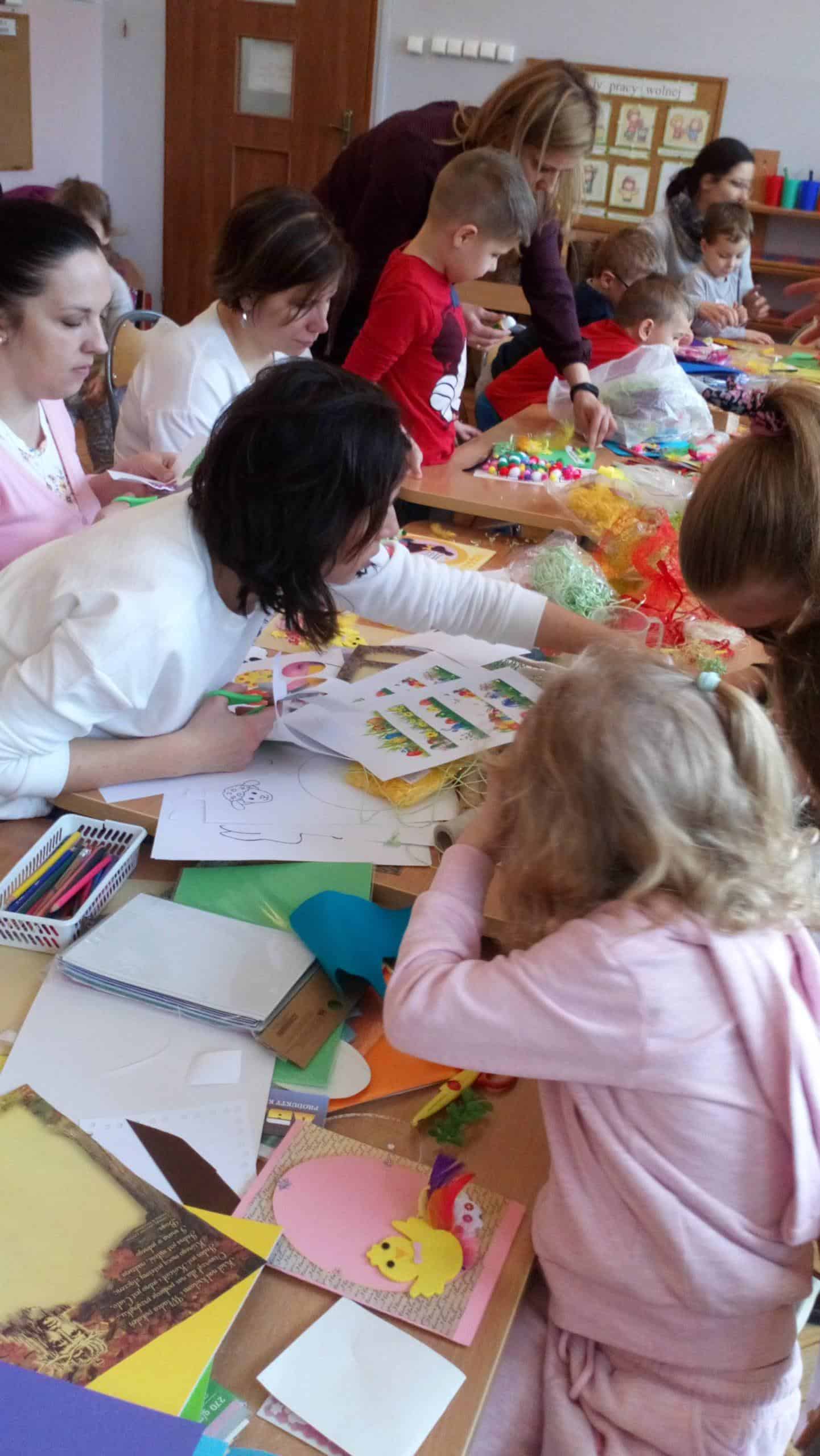11 kwietnia w naszej grupie odbyły się warsztaty wielkanocne z udziałem rodziców, rodzeństwa a nawet kuzynostwa – Amelii i Wiktorii, które swoimi umiejętnościami przyszły wspierać Maję i Nadię – swoje, dwie nieco młodsze, kuzynki. W repertuarze tegorocznego rękodzieła było tworzenie kartek wielkanocnych za pomocą różnorodnych technik plastycznych. We wspaniałym gronie, miłej, rodzinnej atmosferze, wśród tak wielu utalentowanych gości, pomysłów było bardzo wiele. Nasza sala przedszkolna zamieniła się na ten czas w jedną, wielką pracownię plastyczną, w której działo się wiele ciekawych rzeczy. Rodzice odkrywali swoje talenty plastyczne a dzieci zamieniły się w prawdziwych artystów. Wszyscy pracowali z ogromnym zapałem, ale był też i czas na miłe pogawędki:) Powstało bardzo dużo pięknych i niepowtarzalnych dekoracji świątecznych w postaci wyjątkowych karteczek wielkanocnych.