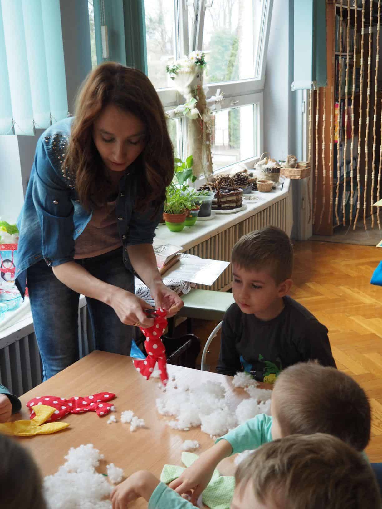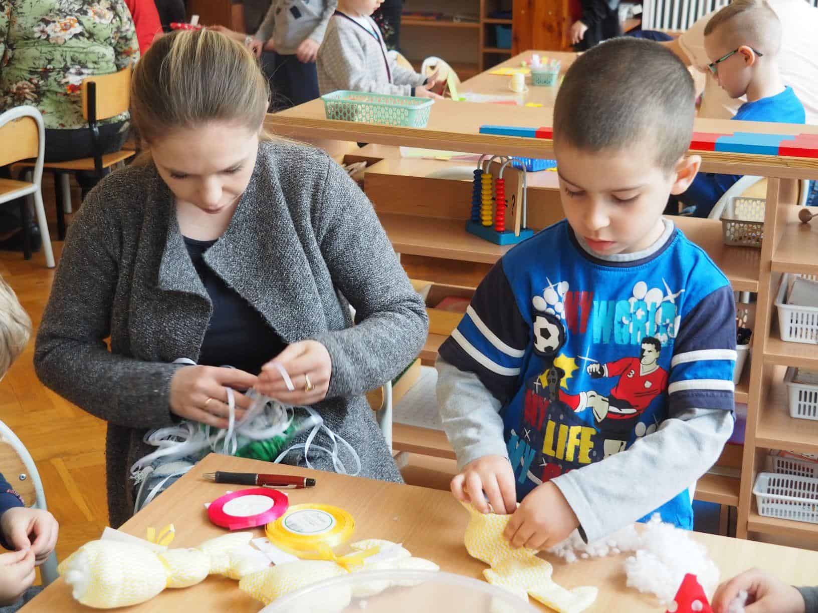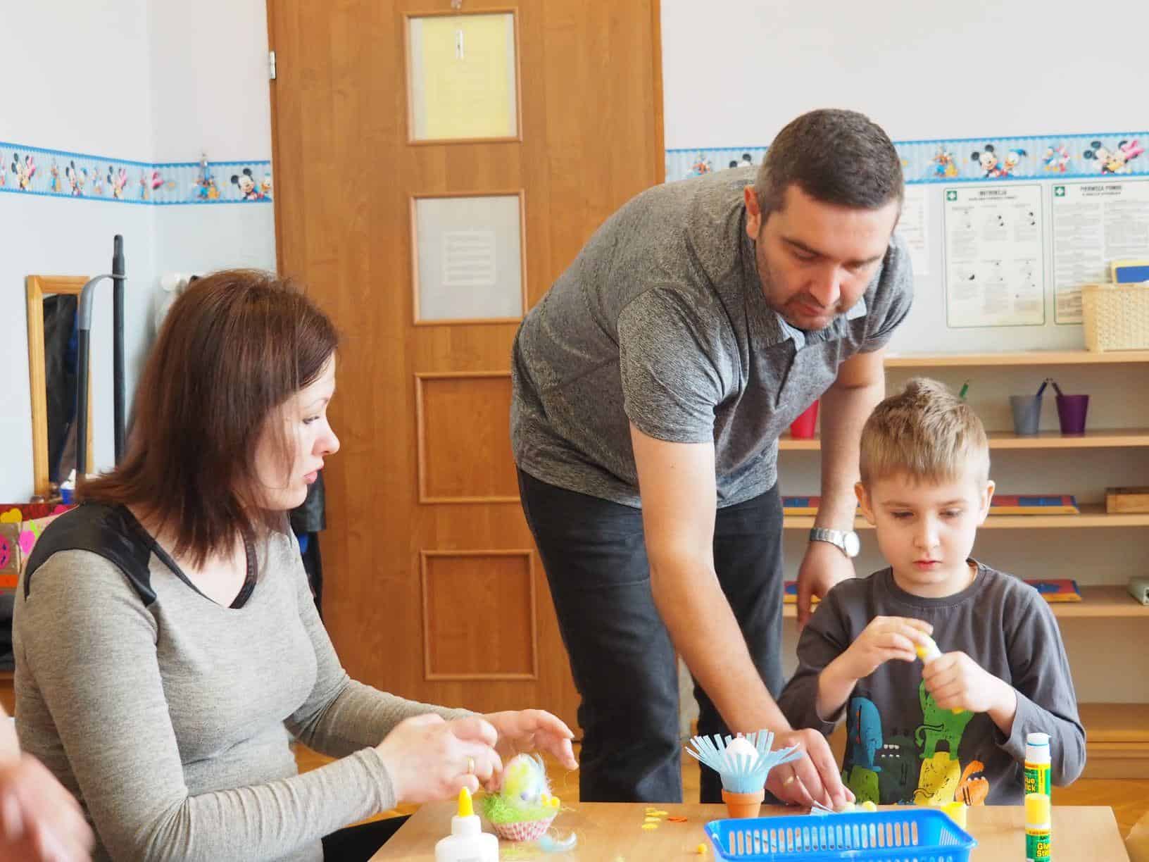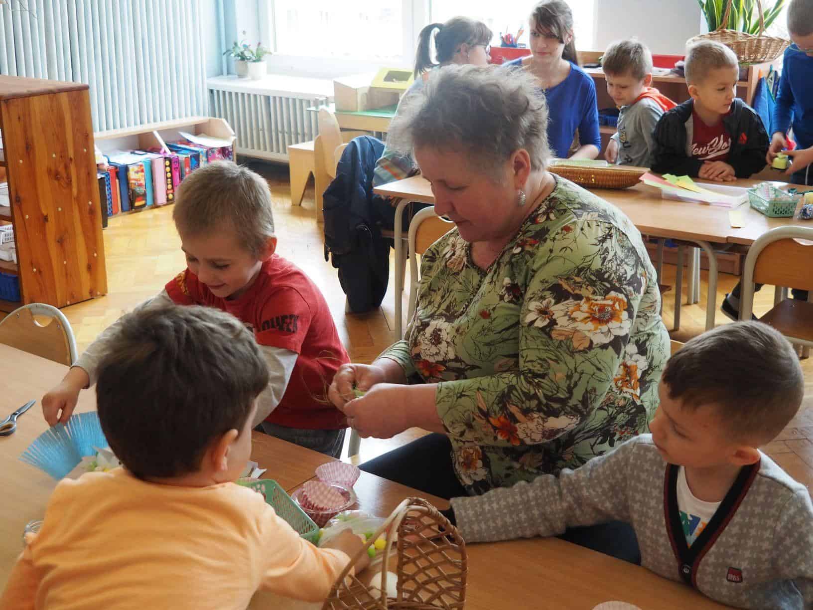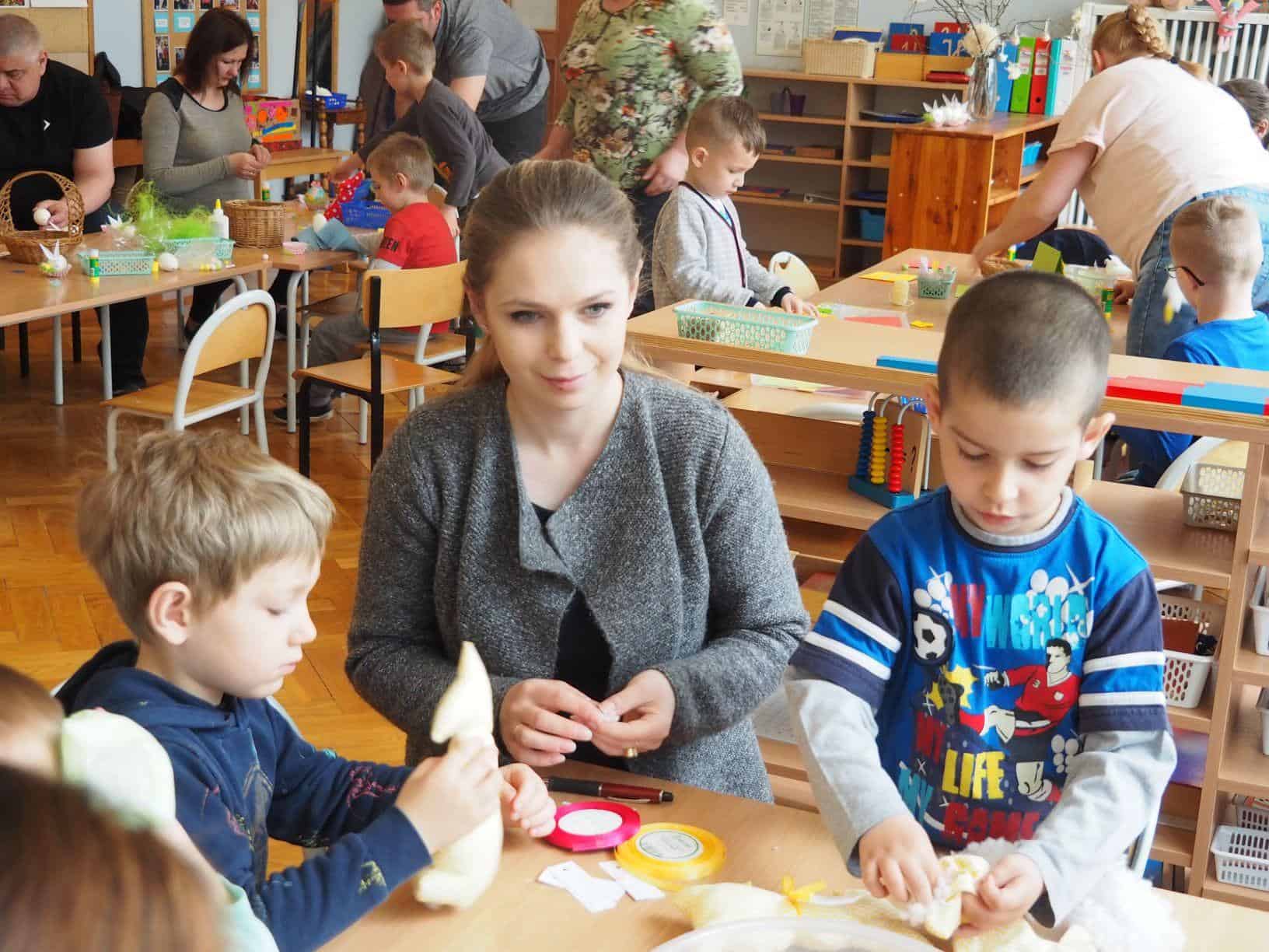 W przedświątecznych zajęciach plastycznych w grupie Niebieskiej uczestniczyło wielu gości. Dzięki ich pomocy dzieciom i oryginalnym pomysłom powstało wiele ozdób wielkanocnych. Na stołach zaroiło się od zajączków przygotowanych przez mamusię Bartka, wymyślnych pisanek, zajączków z jajek i barwnych kartek świątecznych.
