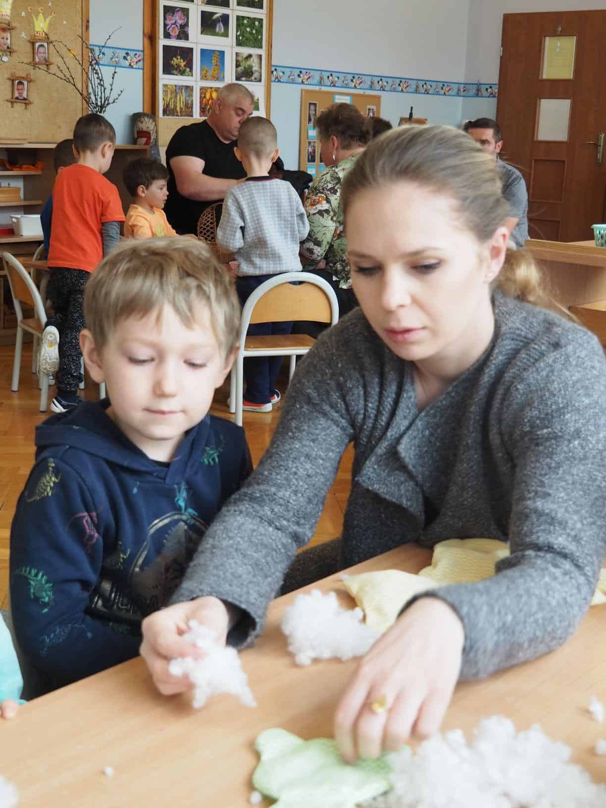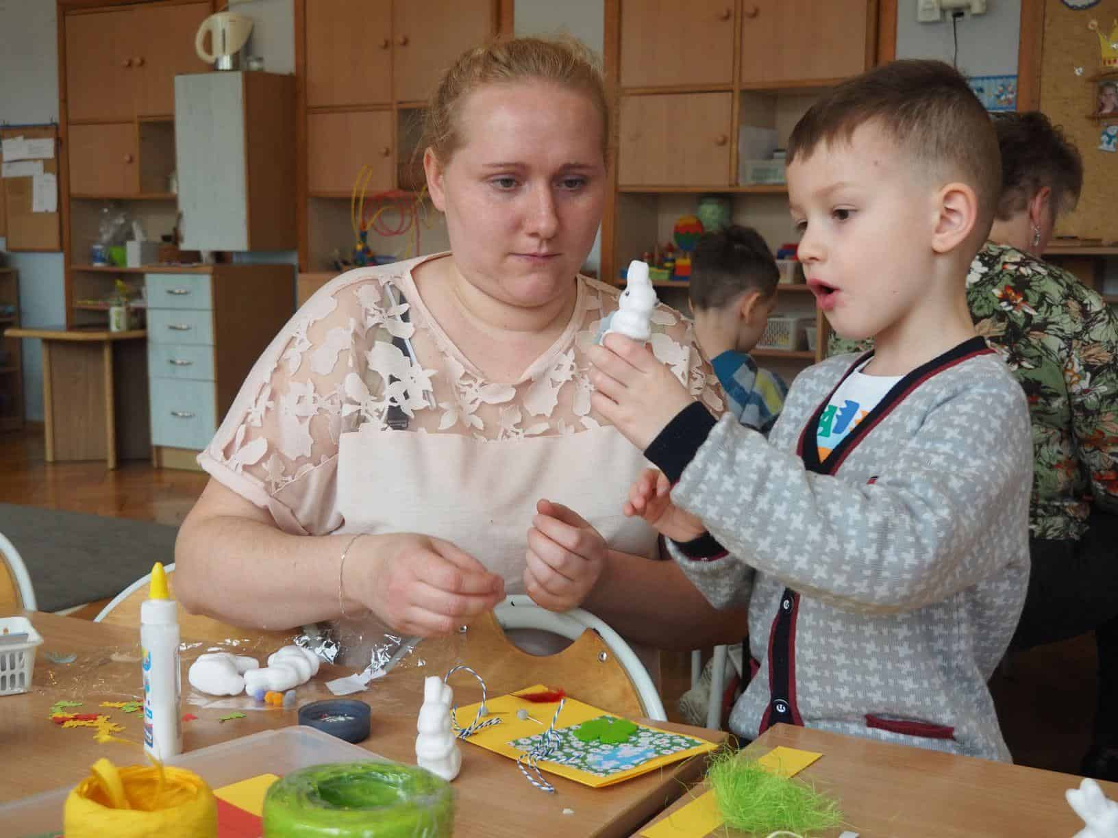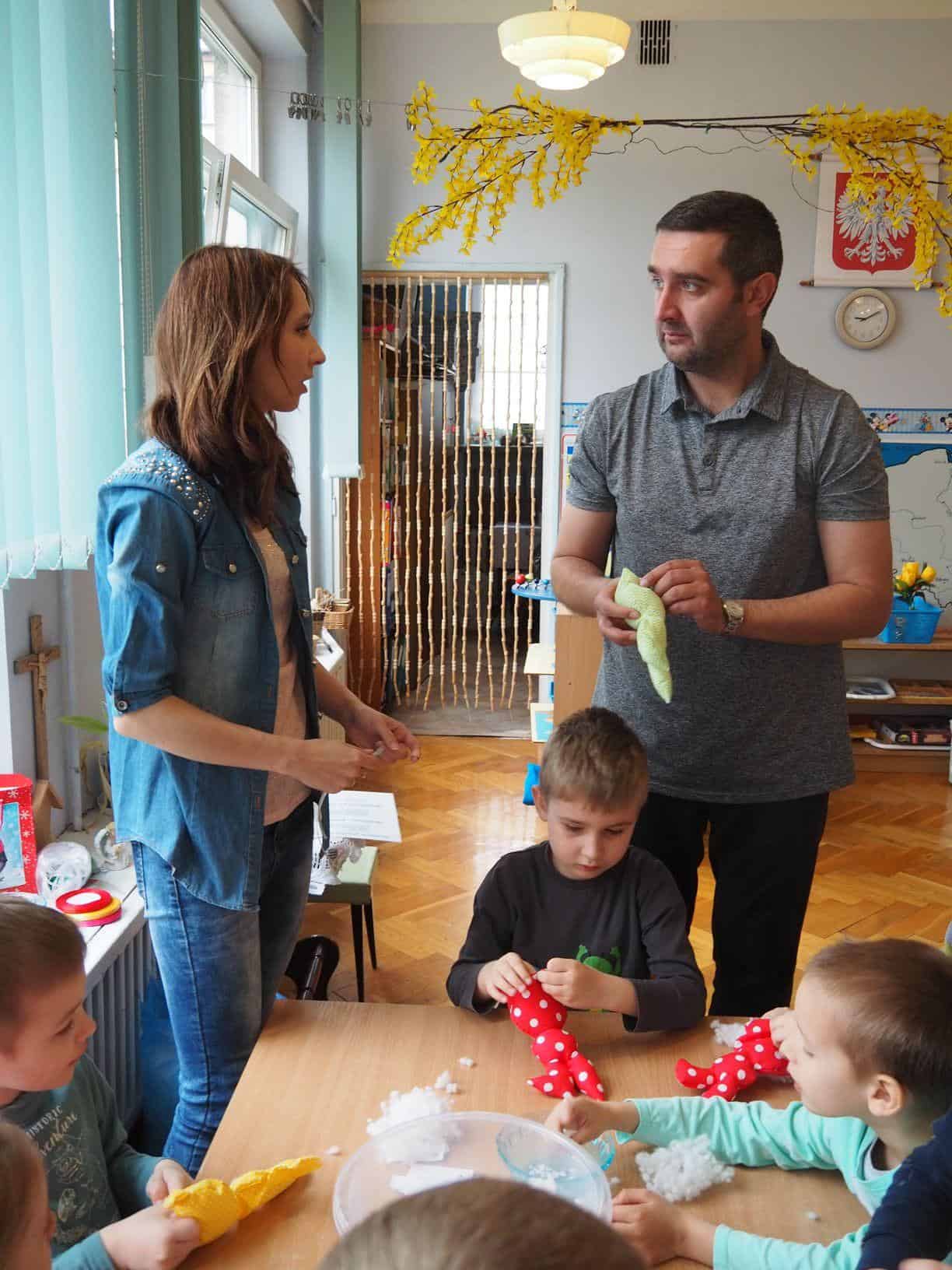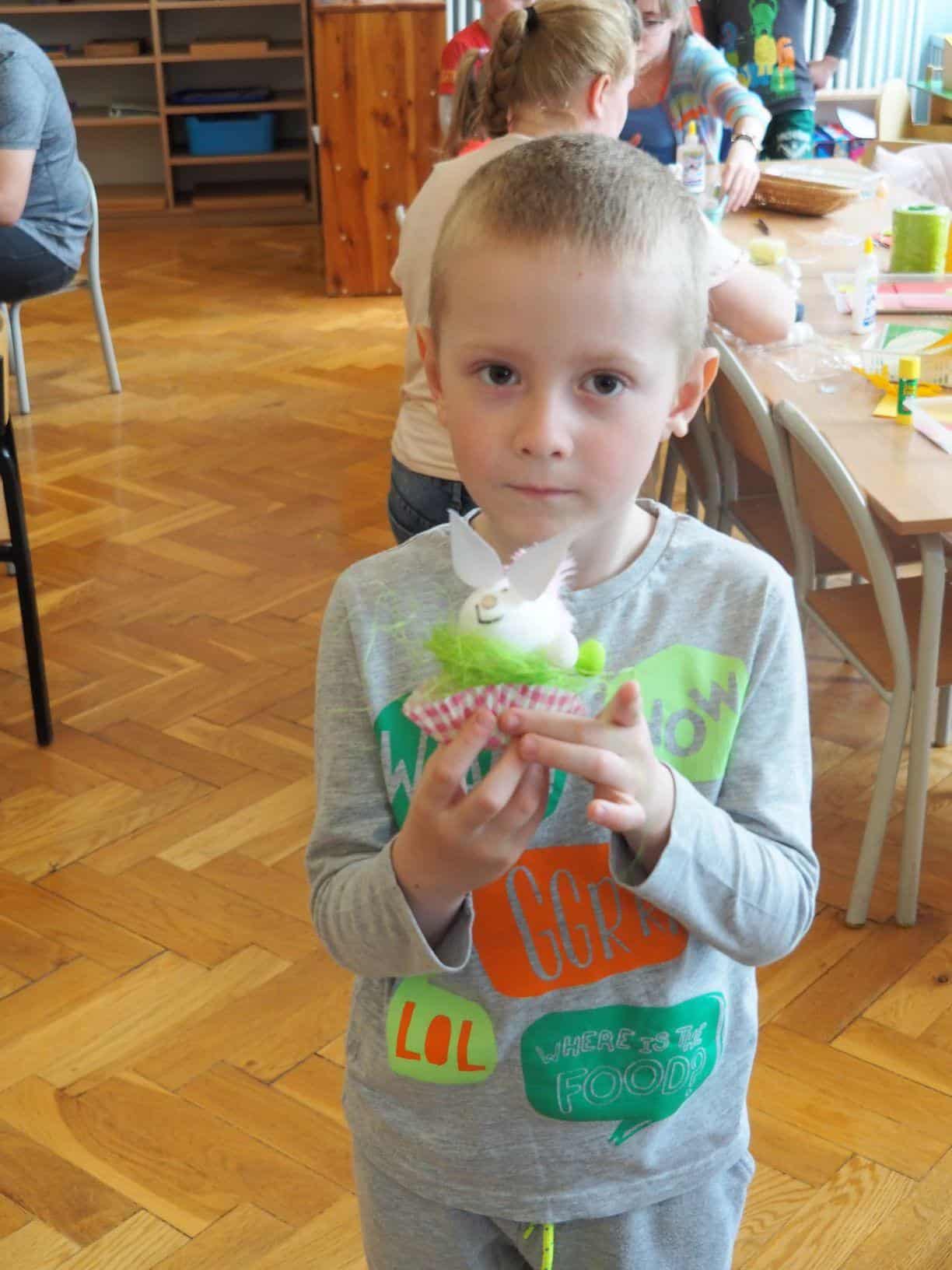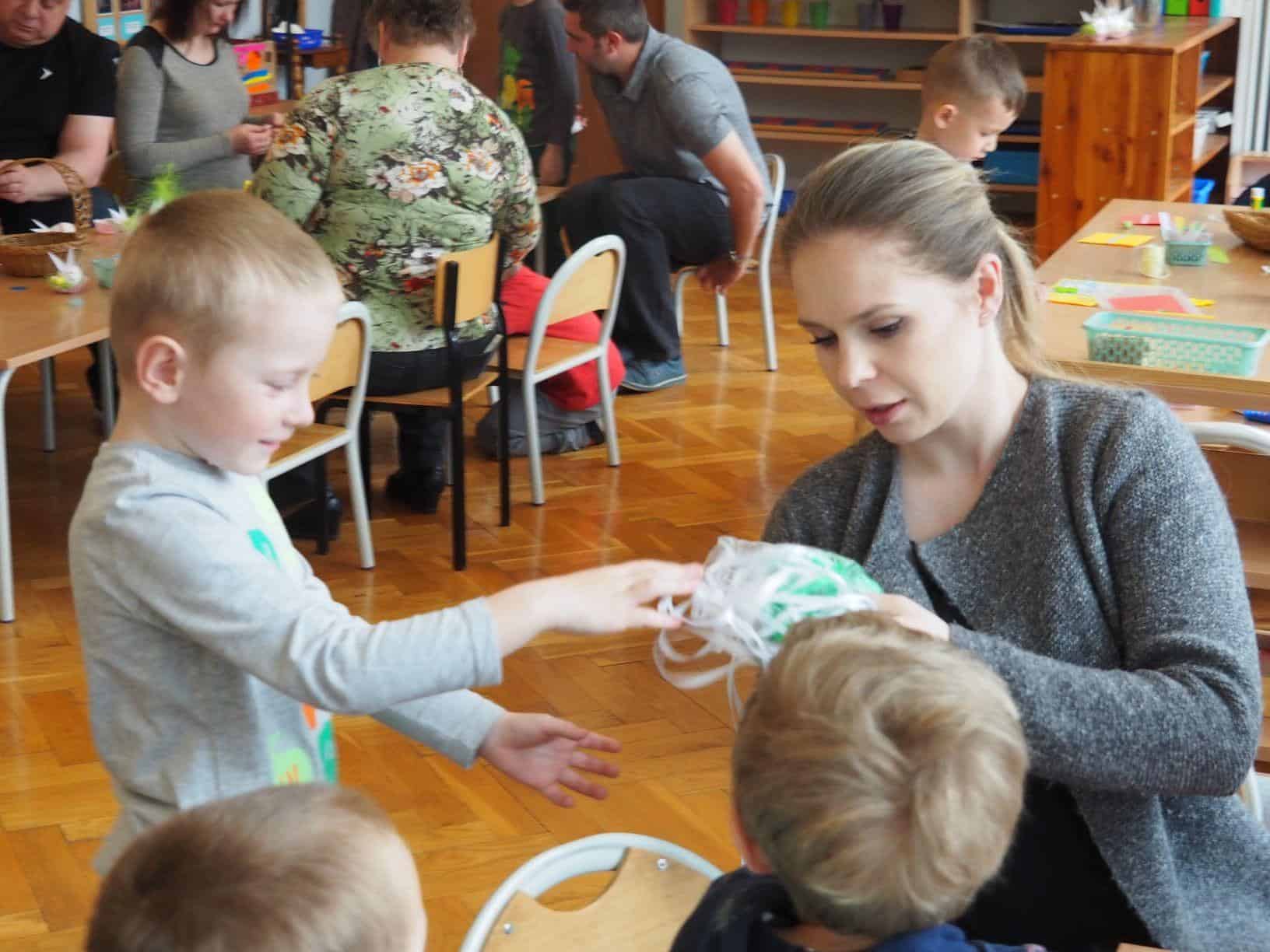 W przedświątecznych zajęciach plastycznych w grupie Niebieskiej uczestniczyło wielu gości. Dzięki ich pomocy dzieciom i oryginalnym pomysłom powstało wiele ozdób wielkanocnych. Na stołach zaroiło się od zajączków przygotowanych przez mamusię Bartka, wymyślnych pisanek, zajączków z jajek i barwnych kartek świątecznych.