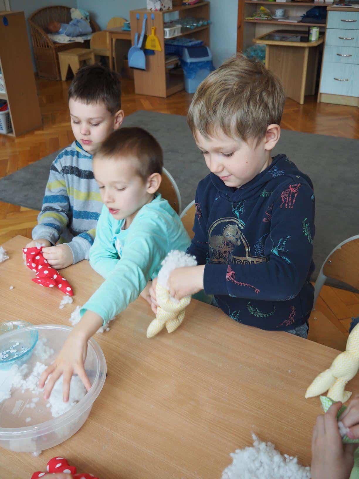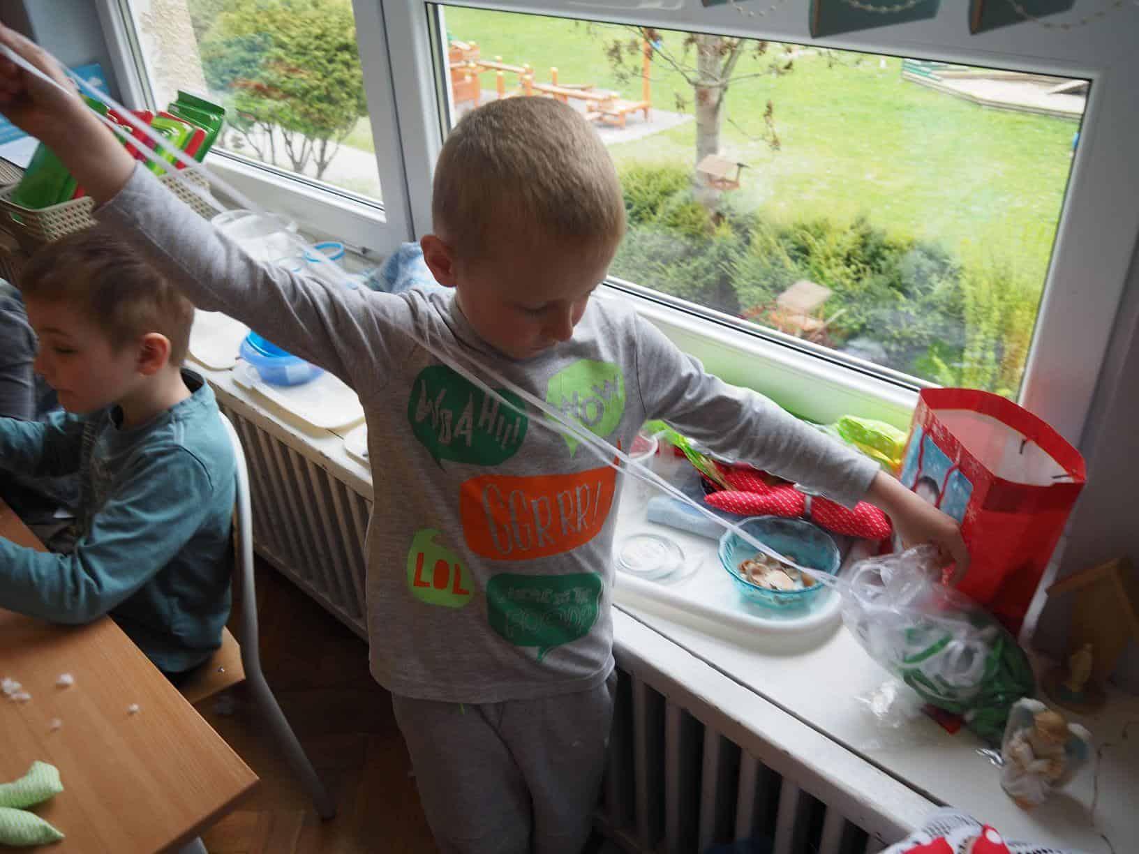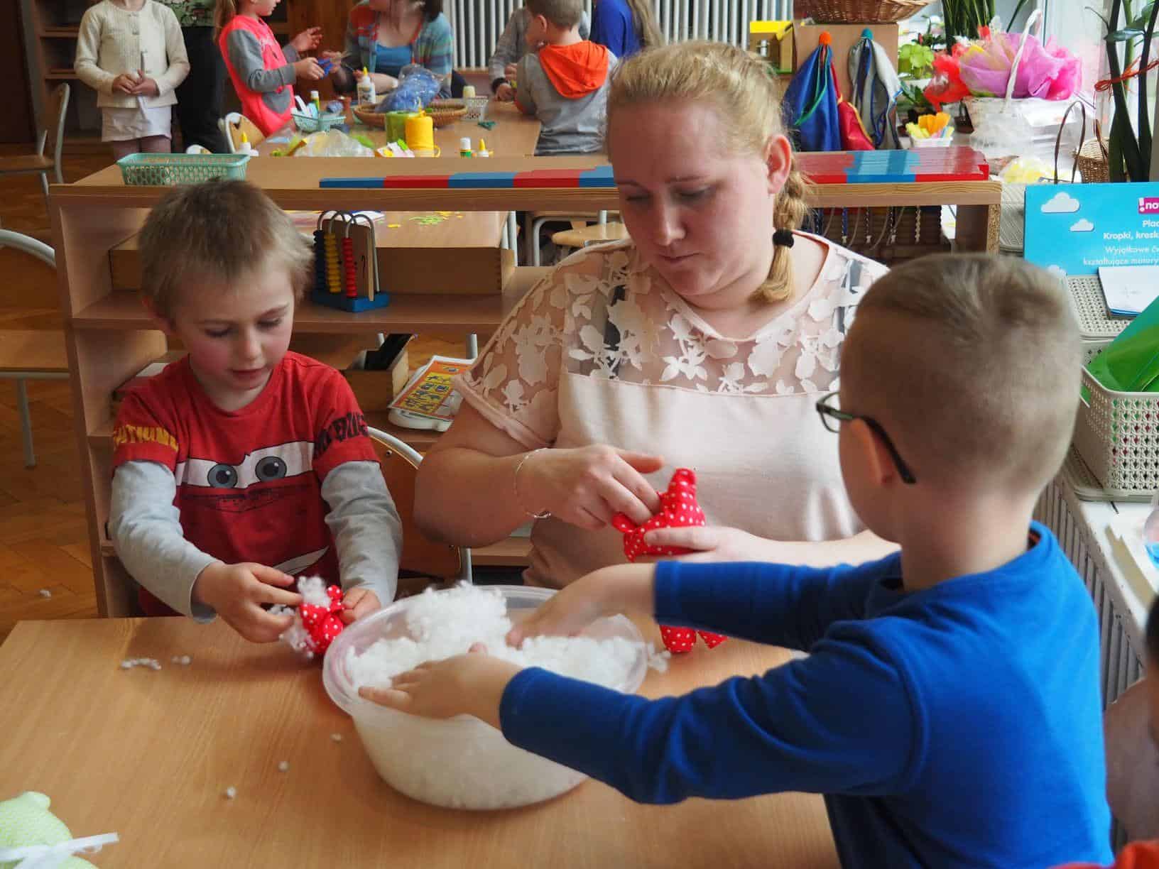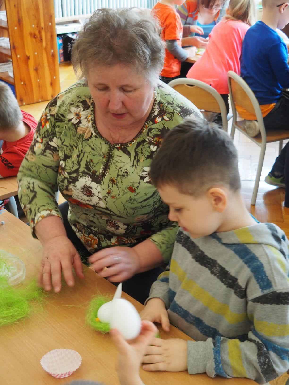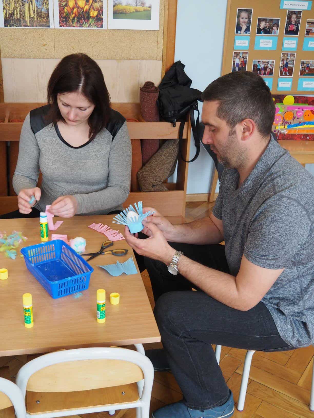 W przedświątecznych zajęciach plastycznych w grupie Niebieskiej uczestniczyło wielu gości. Dzięki ich pomocy dzieciom i oryginalnym pomysłom powstało wiele ozdób wielkanocnych. Na stołach zaroiło się od zajączków przygotowanych przez mamusię Bartka, wymyślnych pisanek, zajączków z jajek i barwnych kartek świątecznych.