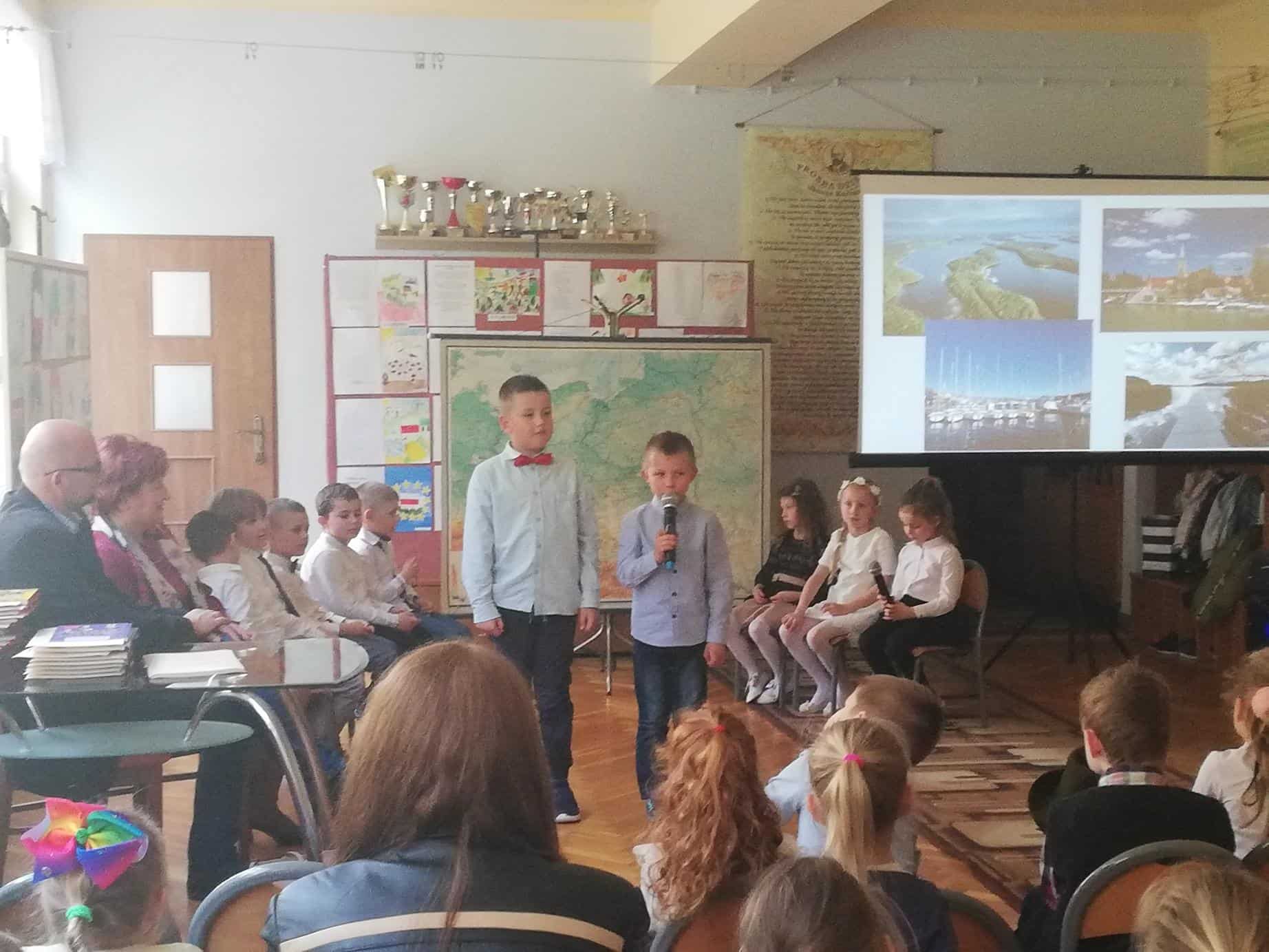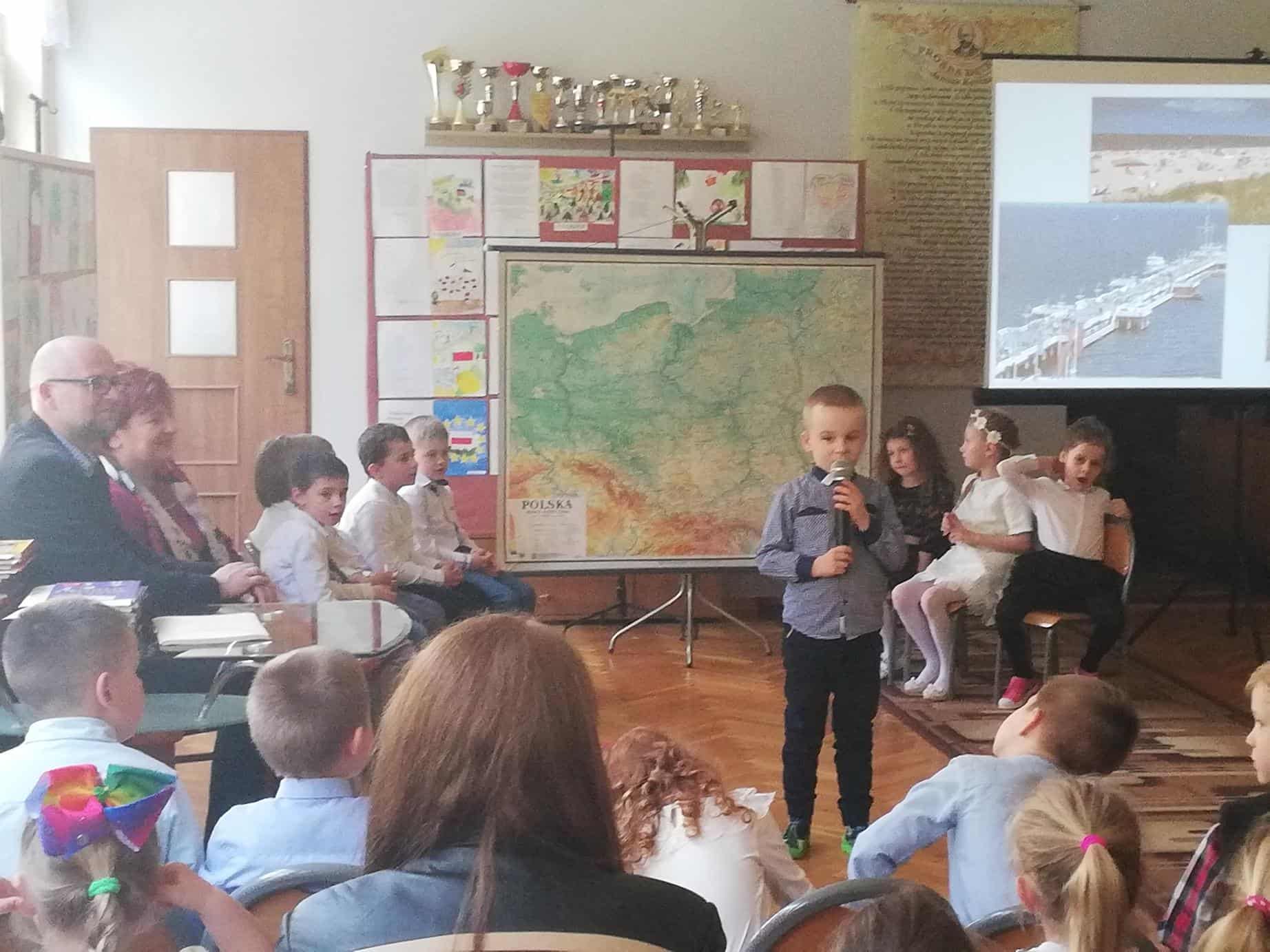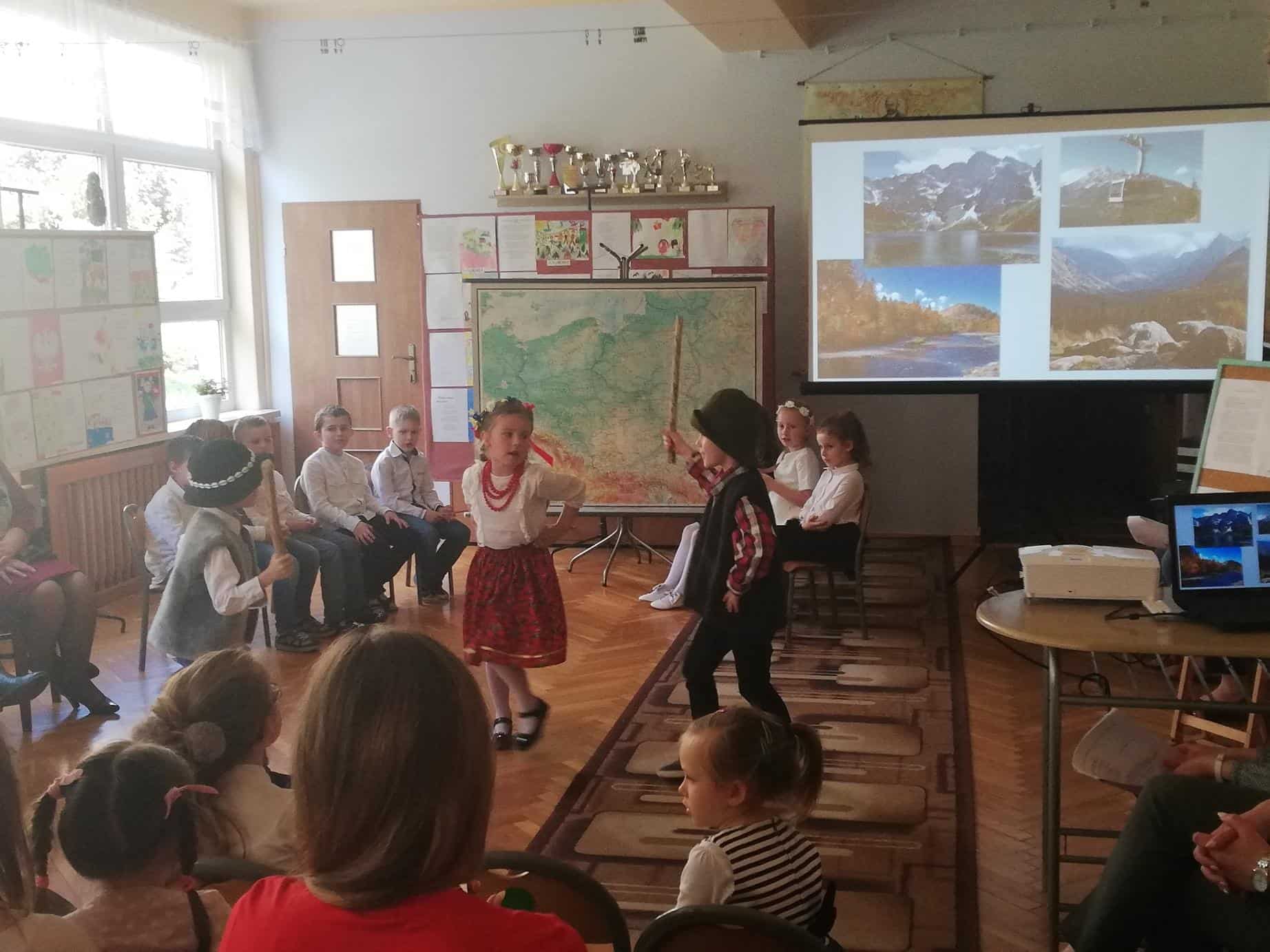 Podczas czwartkowego finału dzieci z grupy Zielonej i Czerwonej zaprosiły wszystkich przybyłych Gości w podróż po Polsce. Zwiedzanie zaczęliśmy od naszego miasta Jarosławia, po czym przenieśliśmy się do stolicy, czyli Warszawy, potem odwiedziliśmy Kraków, następnie wędrowaliśmy po naszych pięknych, polskich górach, w końcu dotarliśmy nad nasze Bałtyckie Morze, później na Mazury, a na koniec zwiedziliśmy Śląsk. Wszystkie te piękne miejsca, o których opowiadały dzieci można było zobaczyć dzięki prezentacji multimedialnej. Przedszkolaki wykazały się umiejętnością czytania mapy, wskazywały na niej miejsca, o których mówiły. Informacje o charakterze geograficzno-historycznym na temat poszczególnych miejsc przeplatane były wierszami i piosenką „Za górami, za lasami”.