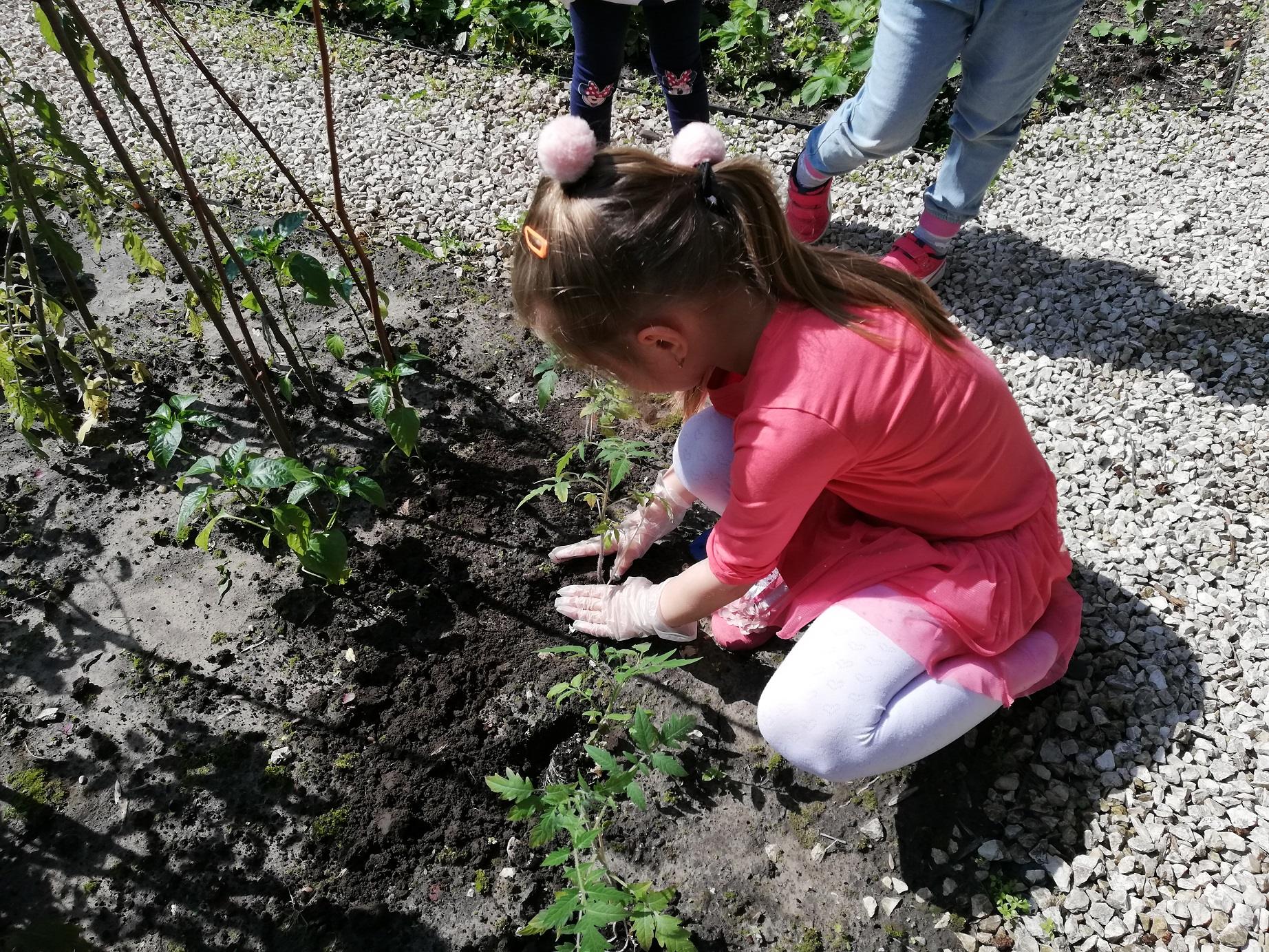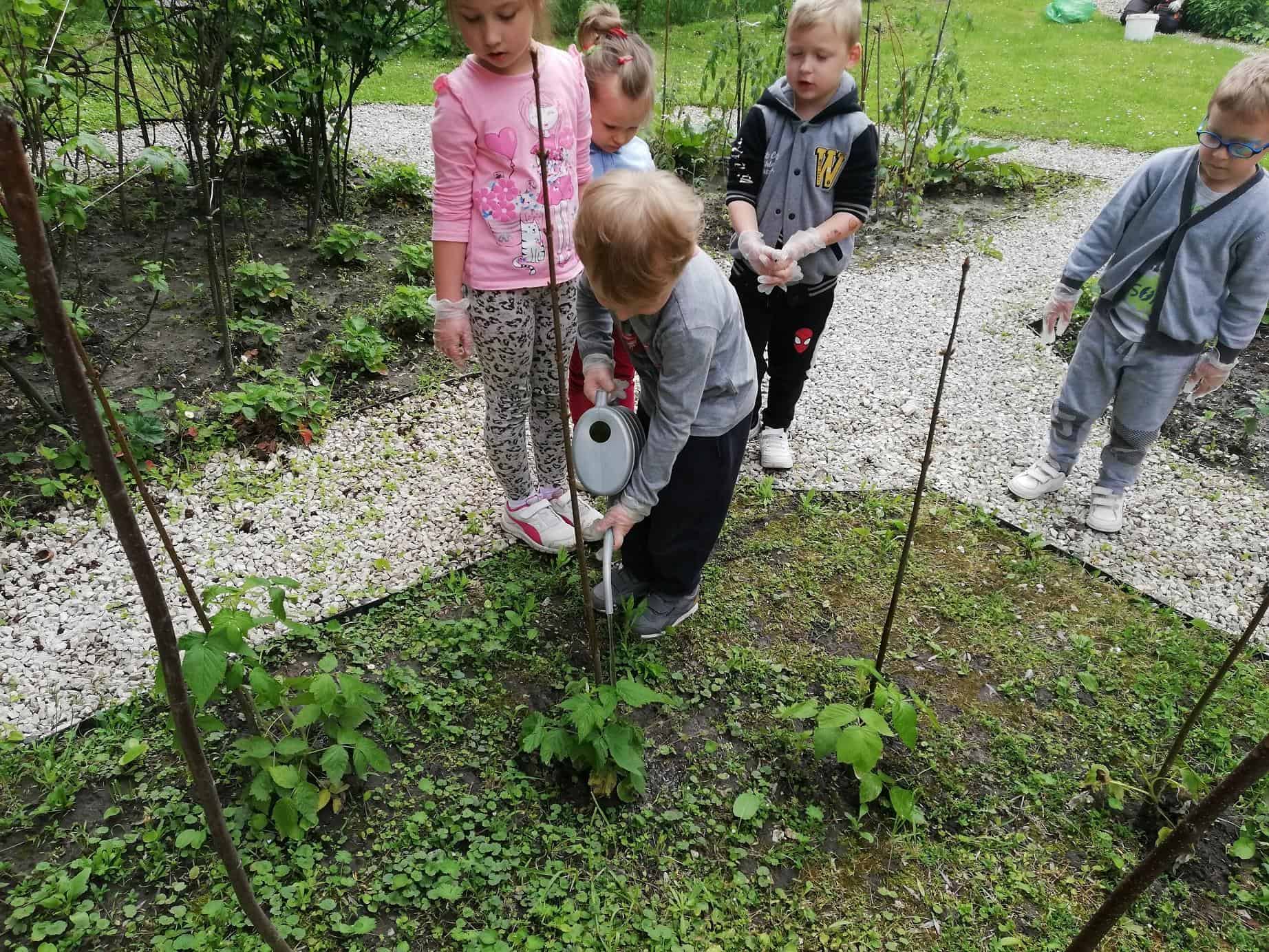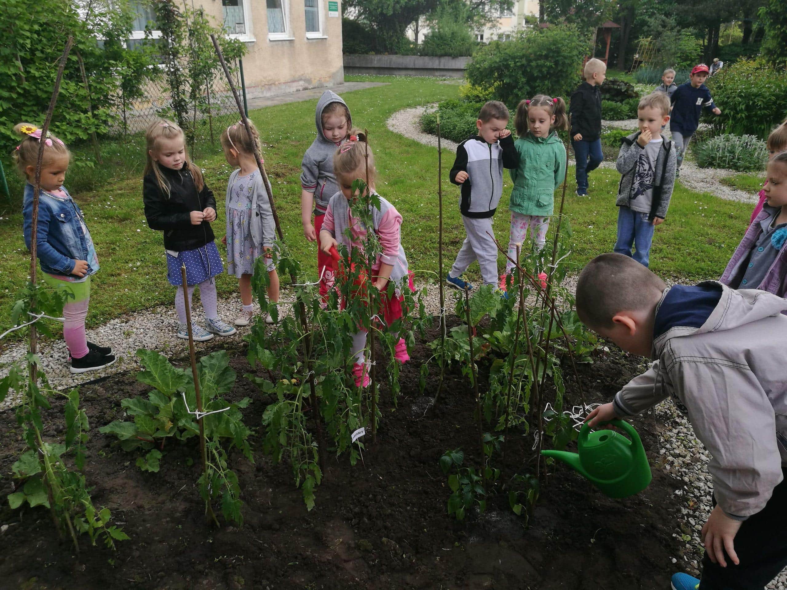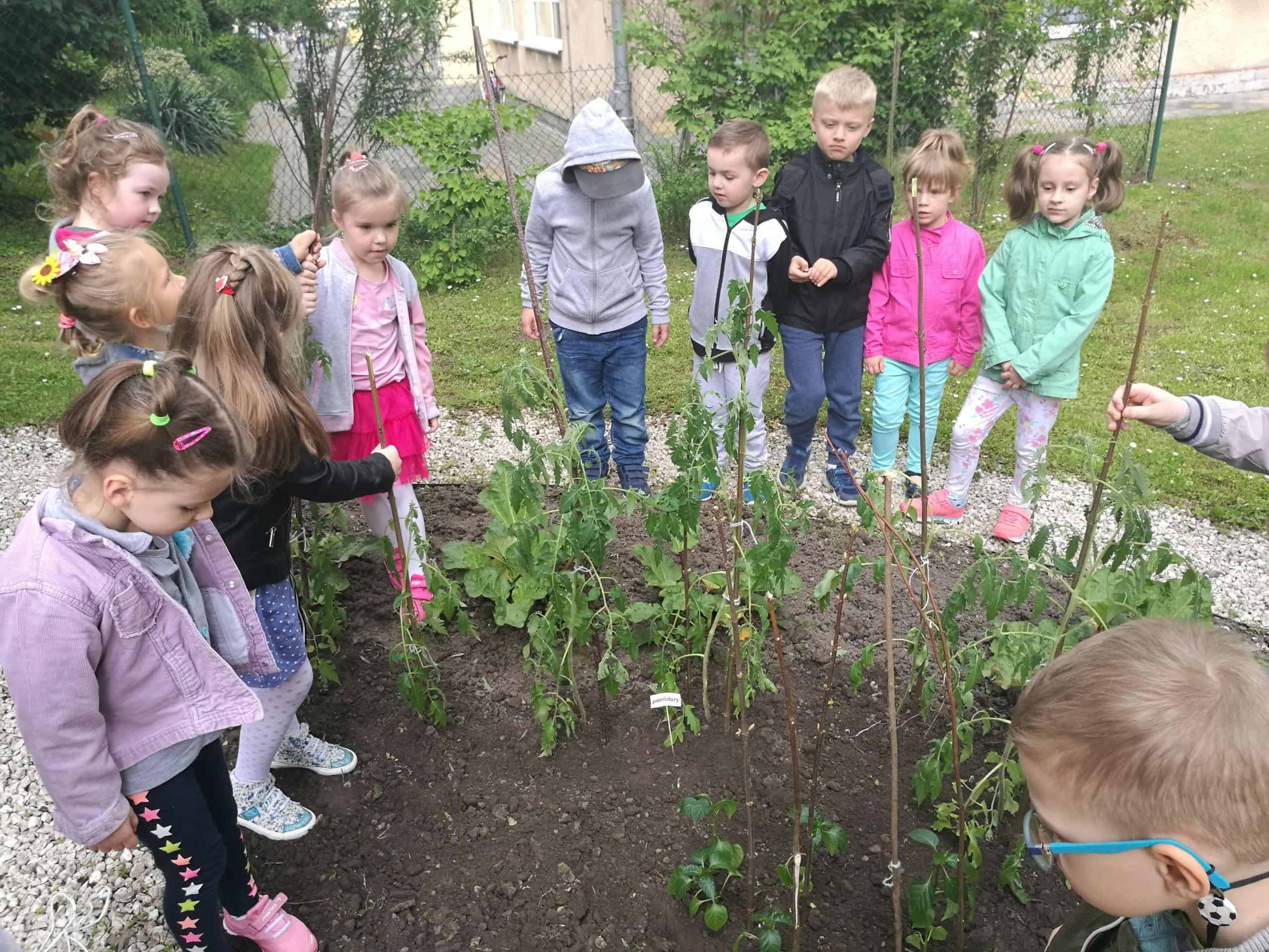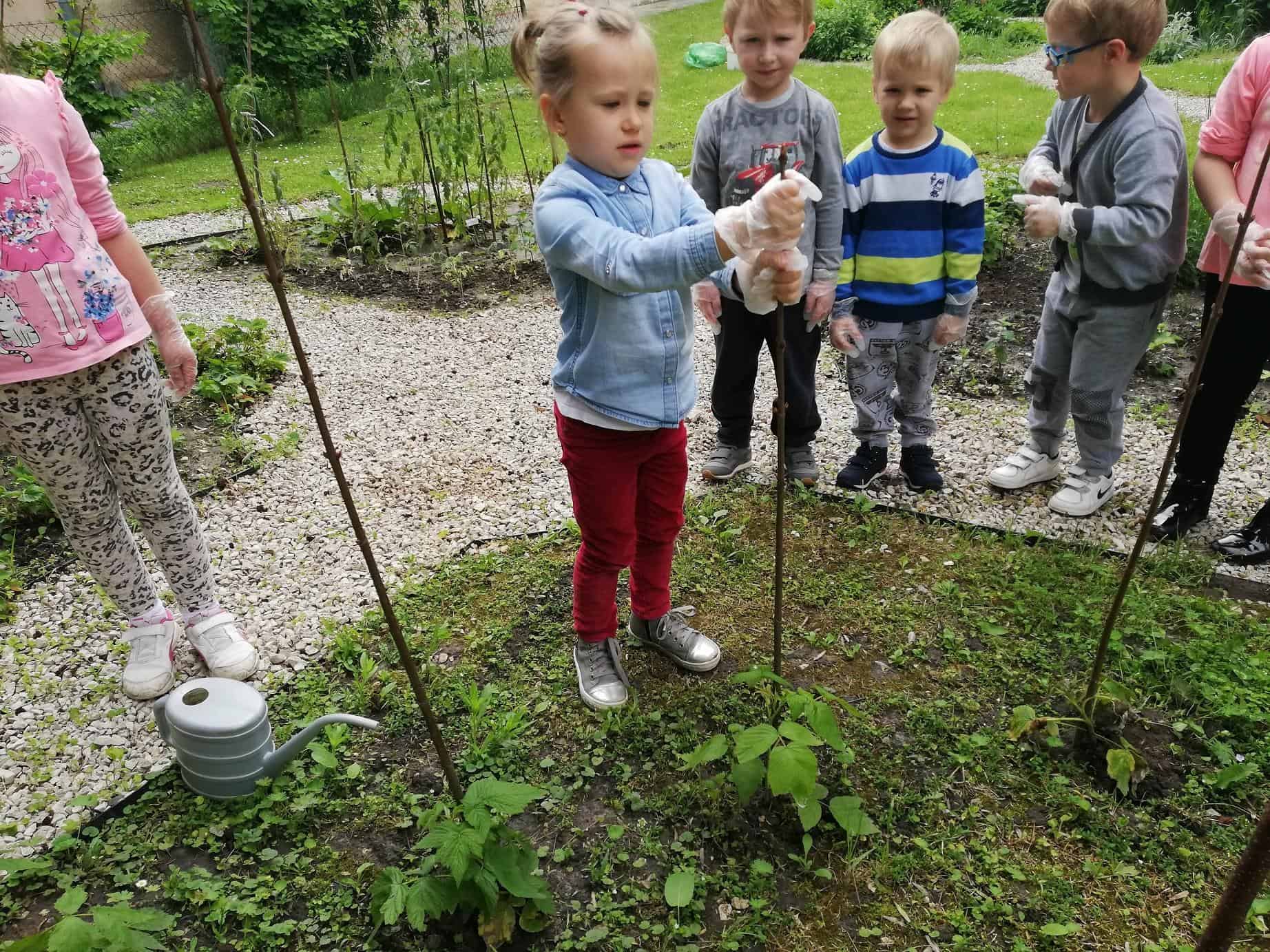 W marcu uczyliśmy się na temat budowy oraz wzrostu roślin, a także sposobów ich pielęgnacji. Założyliśmy w sali ziołowo-warzywny ogródek. Dzięki czemu dzieci miały możliwość obserwacji wzrostu niektórych roślin od nasionka po dalsze jego etapy. Dzieci miały także okazję, aby sprawdzić się w roli ogrodników, ucząc się systematyczności i odpowiedzialności. Początkiem maja sadzonki pomidorów wysadziliśmy w naszym przydomowym ogródku na Przyrodniczej Ścieżce Ekologicznej. Kilka dni później posadziliśmy również sadzonki malin.