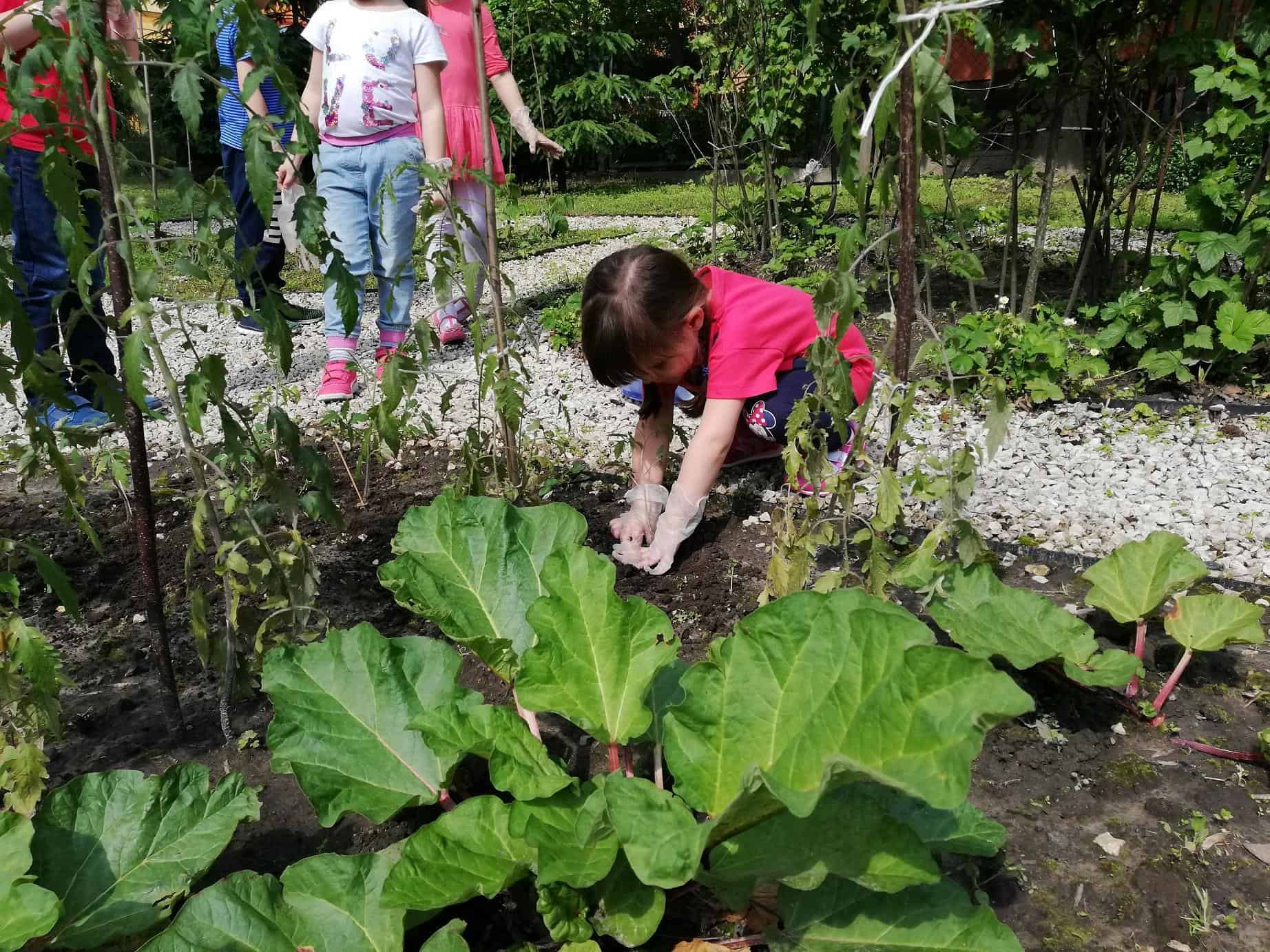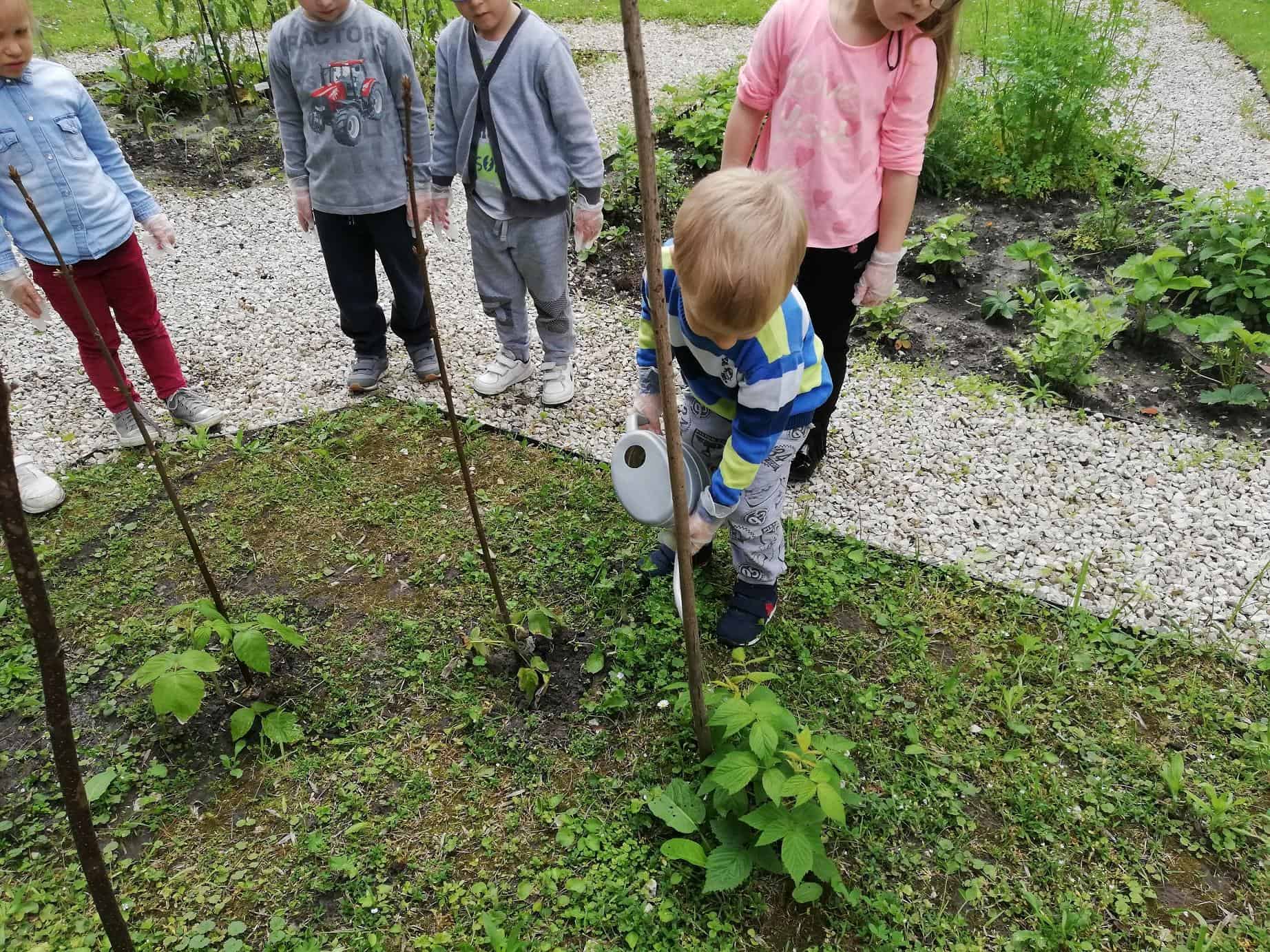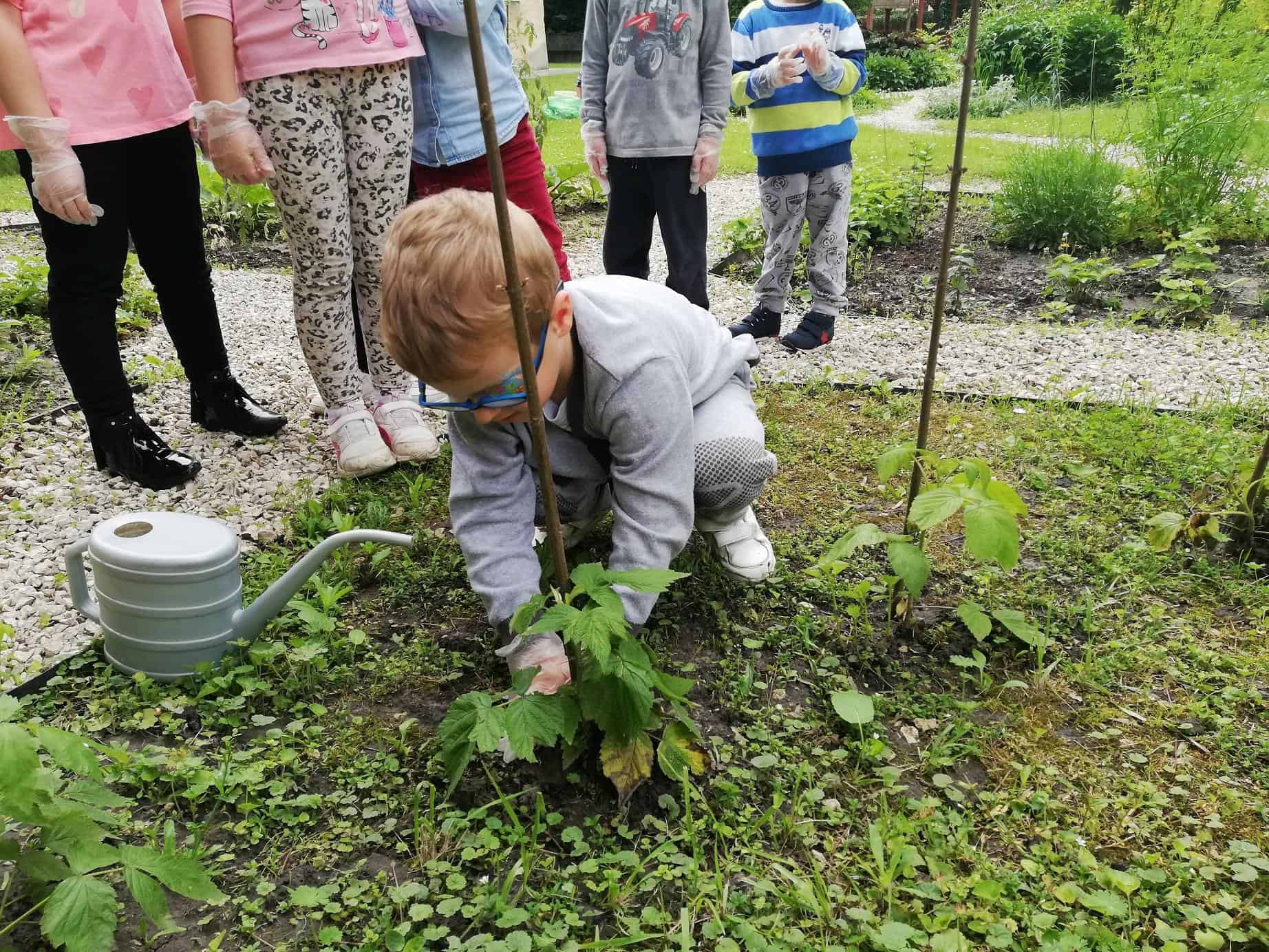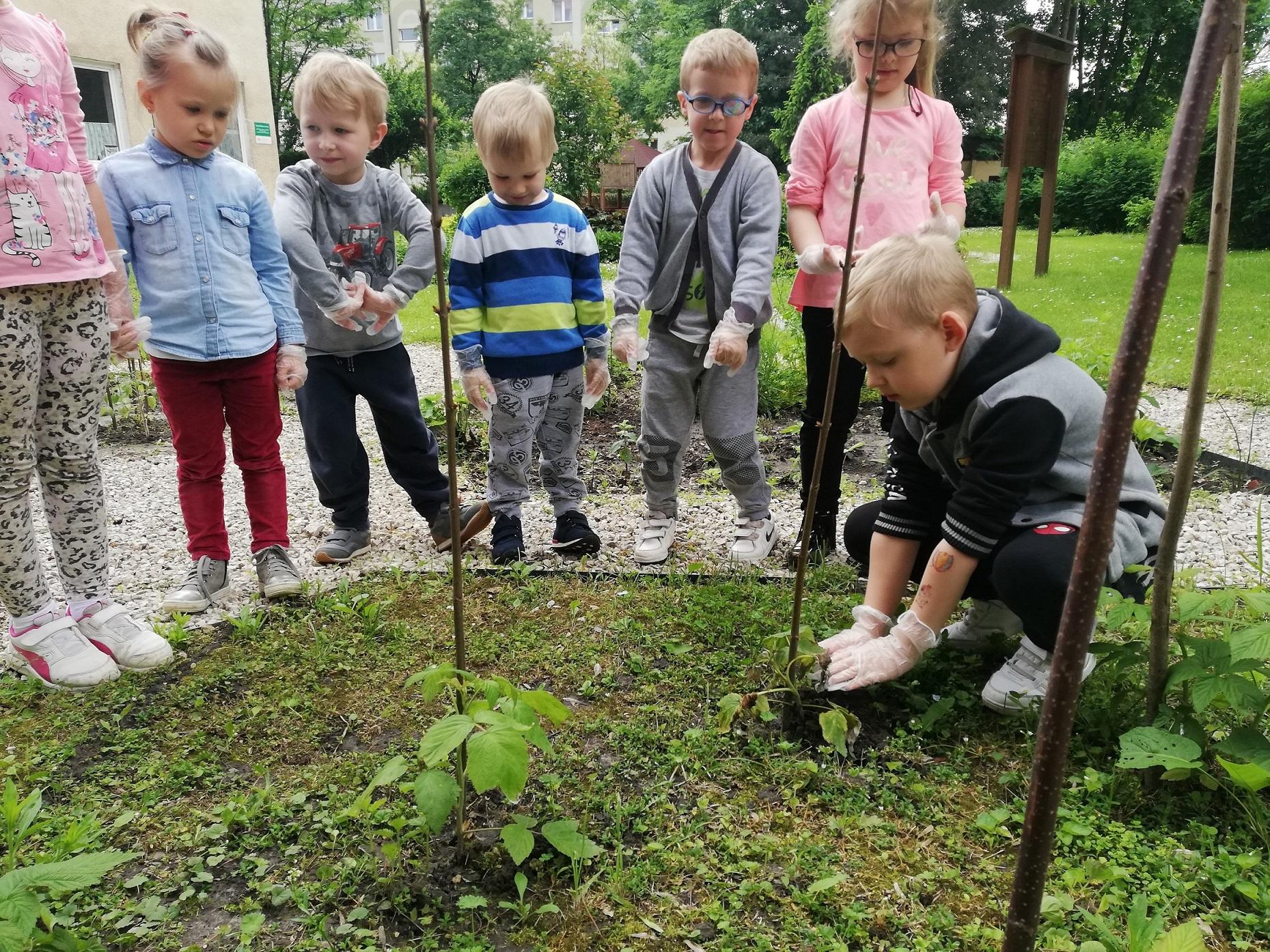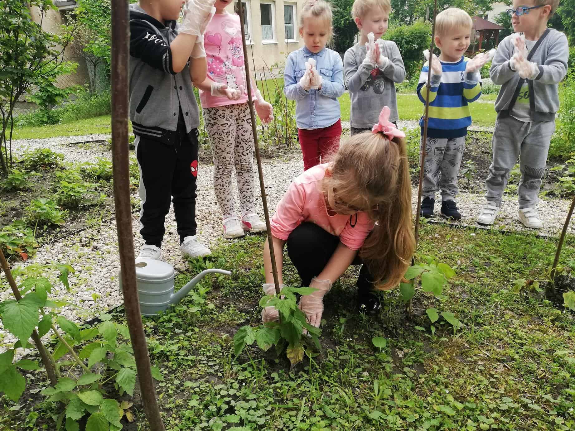 W marcu uczyliśmy się na temat budowy oraz wzrostu roślin, a także sposobów ich pielęgnacji. Założyliśmy w sali ziołowo-warzywny ogródek. Dzięki czemu dzieci miały możliwość obserwacji wzrostu niektórych roślin od nasionka po dalsze jego etapy. Dzieci miały także okazję, aby sprawdzić się w roli ogrodników, ucząc się systematyczności i odpowiedzialności. Początkiem maja sadzonki pomidorów wysadziliśmy w naszym przydomowym ogródku na Przyrodniczej Ścieżce Ekologicznej. Kilka dni później posadziliśmy również sadzonki malin.