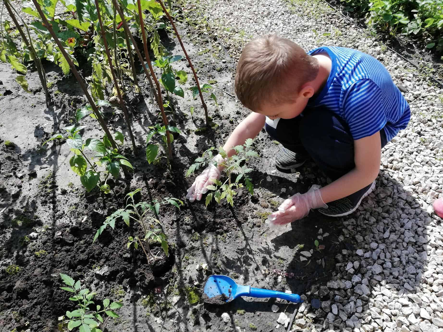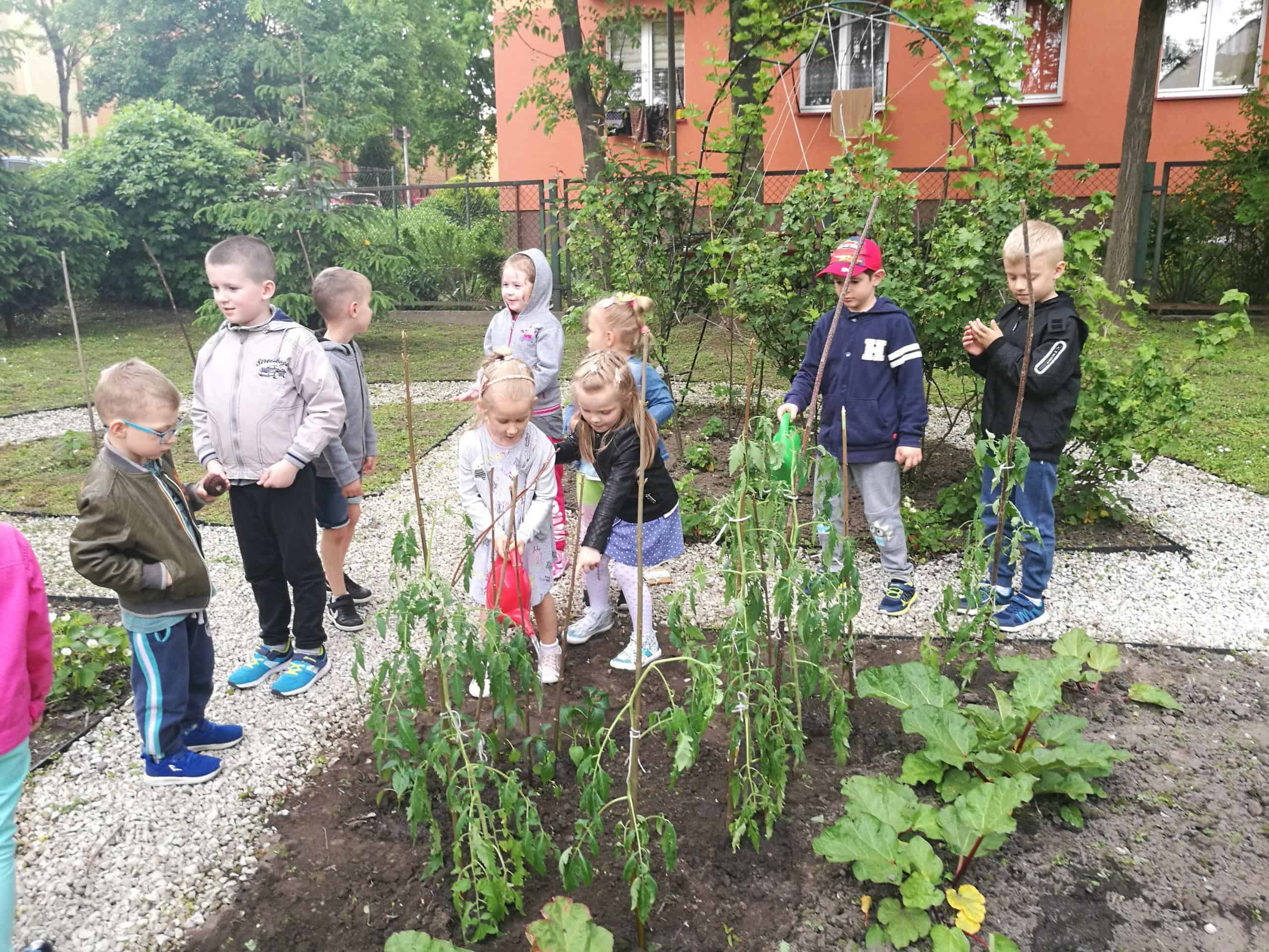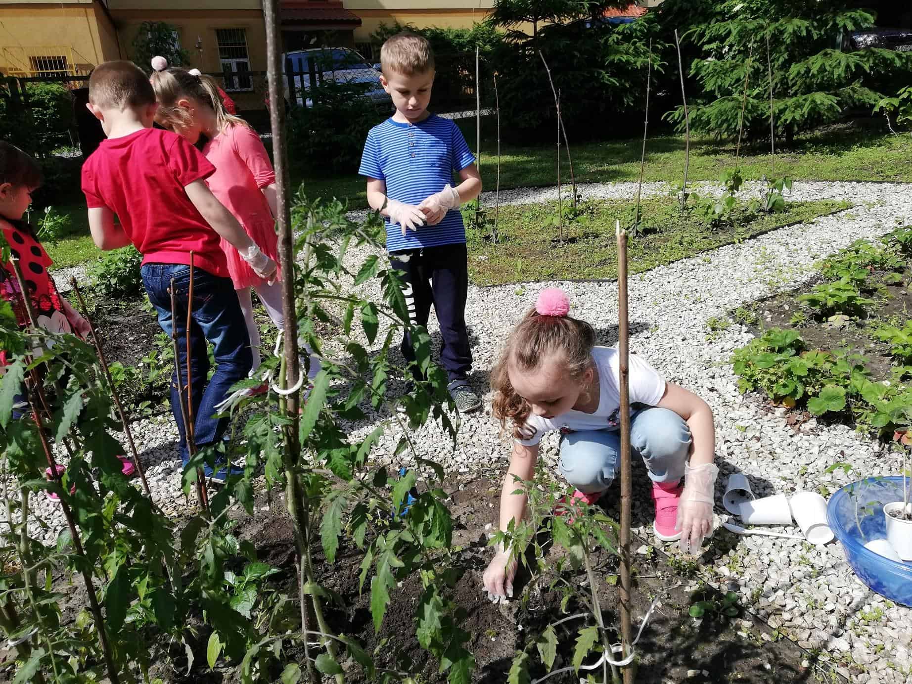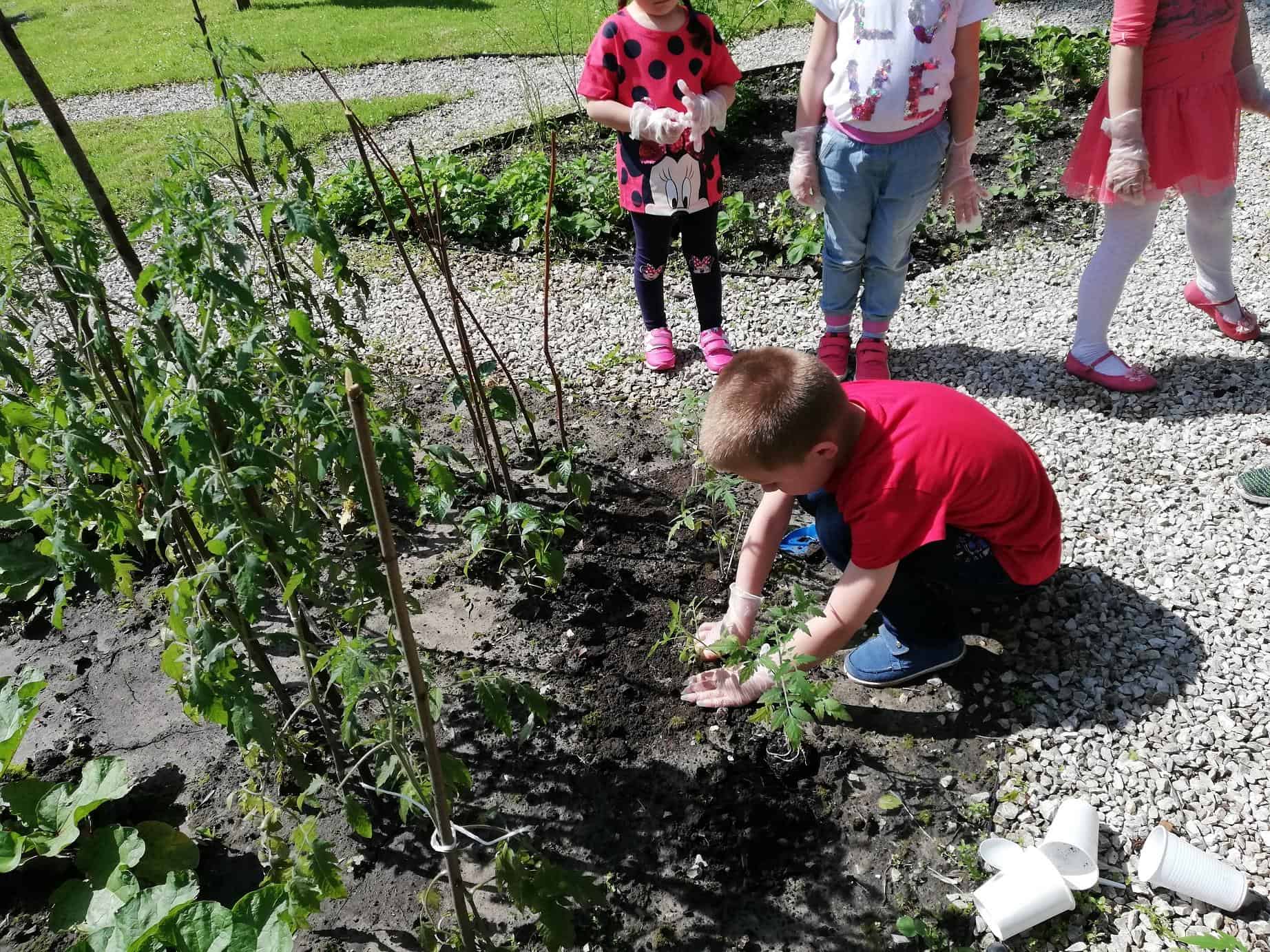 Zanim przystąpiliśmy do działania dzieci poznały nazwy warzyw które wysiewamy na wiosnę. Wspólnie zastanowiliśmy się jakie warzywa pojawią się w naszym kąciku przyrodniczym, przynieśliśmy między innymi nasiona fasoli, papryki, pomidorów. Największe zaciekawienie wśród dzieci wzbudziły właśnie nasiona pomidorów, niektóre dzieci z niedowierzaniem dopytywały ,, czy z tego maleńkiego nasionka wyrośnie taki prawdziwy pomidor?”. Ogromna ciekawość dzieci przyczyniła się do założenia hodowli pomidora w ramach realizacji projektu ,,Działam – doświadczam- odkrywam”. Podczas zajęć dzieci dowiedziały się jak wygląda hodowla pomidora, jakie warunki są potrzebne aby wyrosły piękne i smaczne. Po zdobyciu niezbędnej wiedzy przystąpiliśmy do działania. Pod koniec zimy wspólnie wysialiśmy nasionka do ziemi w doniczce, którą to ustawiliśmy na naszym parapecie w sali. Dzieci zadbały o odpowiednie warunki wzrostu rośliny codziennie obserwowały rośliny i pielęgnowały. Po kilku dniach pomidory wykiełkowała a po kilku tygodniach przesadziliśmy kilka sztuk do naszej mini szklarni. Na początku były bardzo malutkie ale z dnia na dzień, z tygodnia na tydzień rosły coraz większe aż pewnego dnia pojawiły się pęki kwiatowe. W dniu dzisiejszym, przy pięknej pogodzie postanowiliśmy wysadzić rośliny do ogródka przedszkolnego, na ścieżce ekologicznej w miejscu , w którym dzieci sadzą i sieją, a następnie pielęgnują różne warzywa oraz obserwują ich kolejne etapy rozwoju i zbierają plony swojej pracy. Teraz już tylko pozostało obserwować pojawienie się i dojrzewanie owoców a następnie sięgną po pomidorka z własnej uprawy.