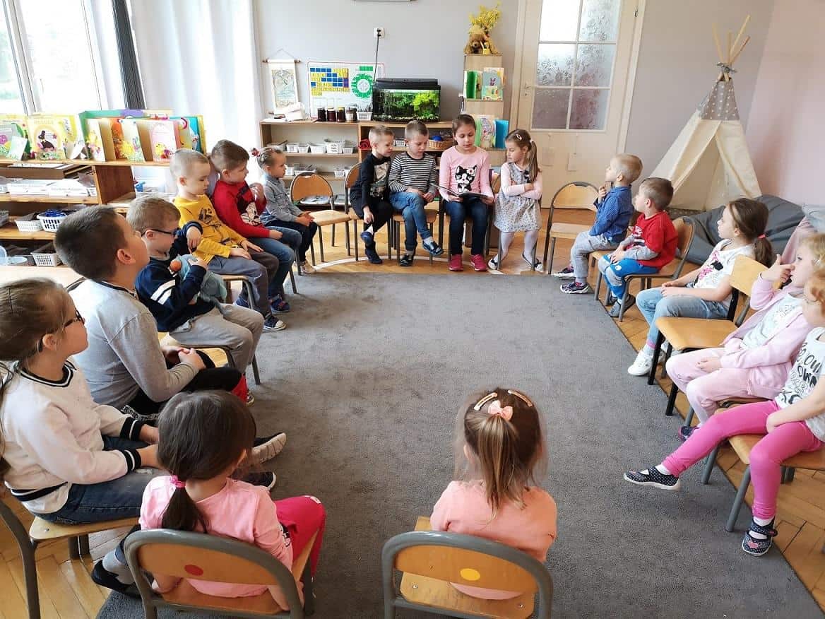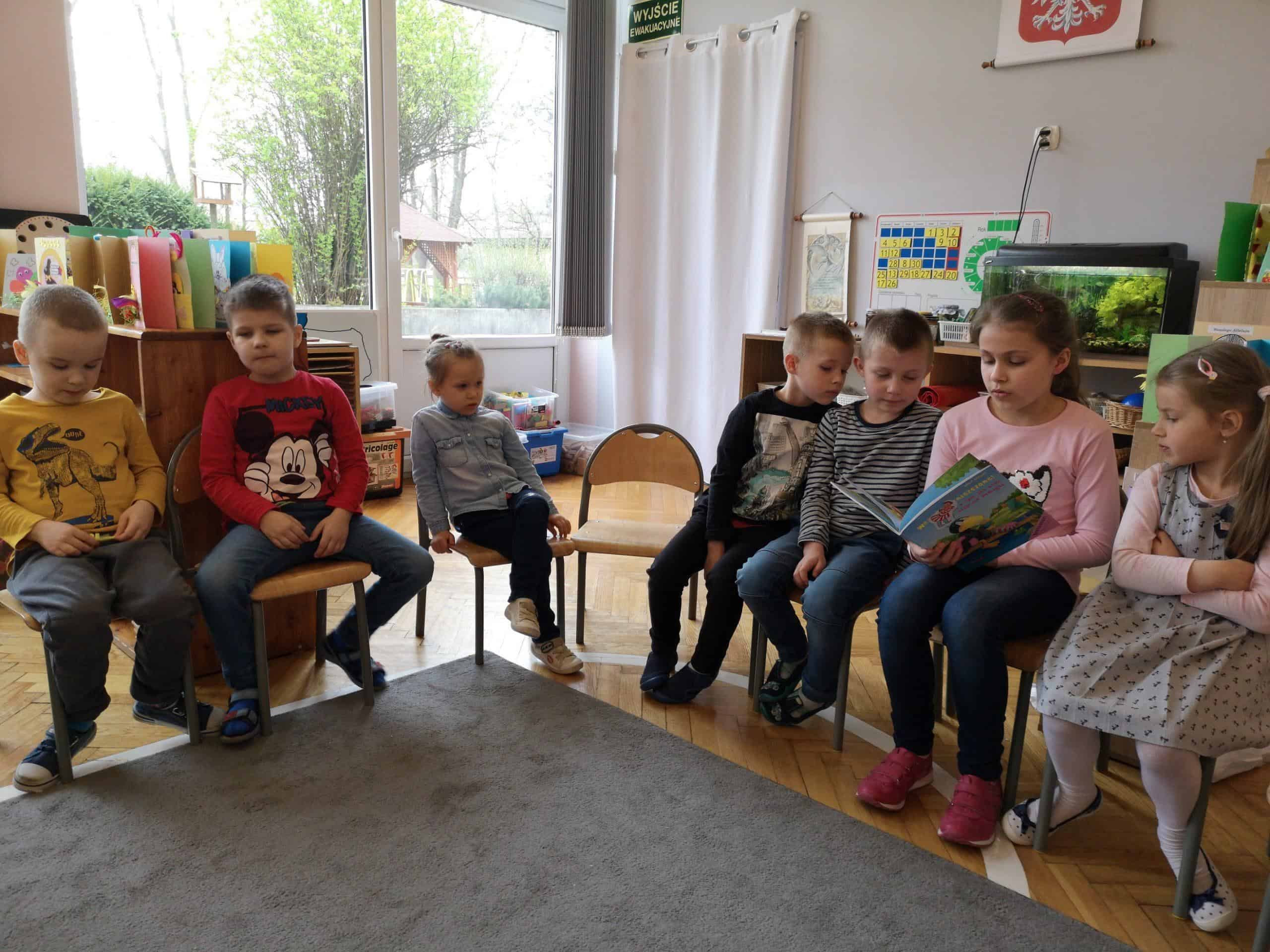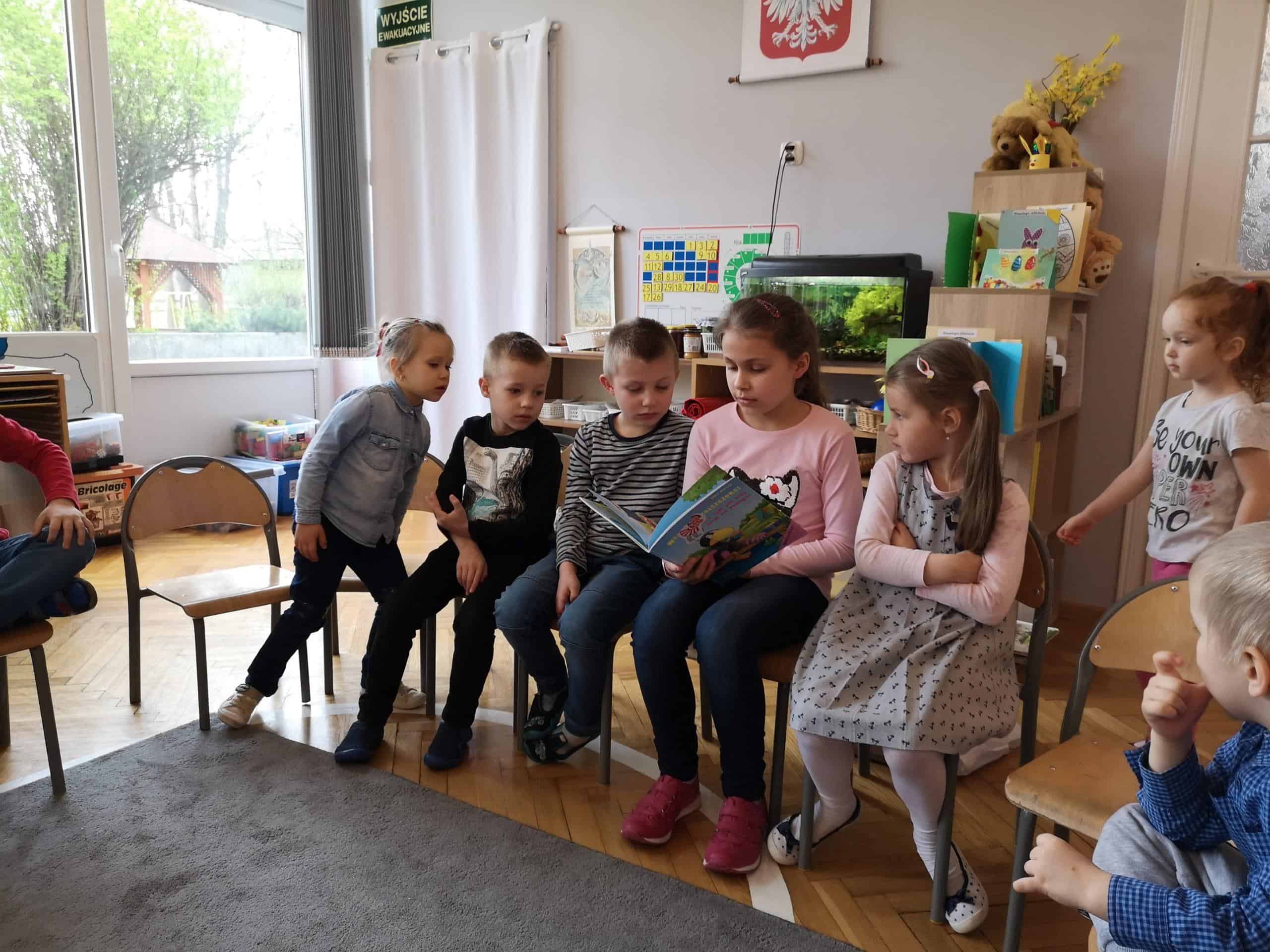 Ola ma 9 lat i chodzi do IV klasy, jest absolwentką naszego przedszkola. Dziewczynka zaprezentowała swoje umiejętności – pięknie przeczytała opowiadanie Nele Moost pt. „Wszystko zniszczone! Czyli o tym, jak kruk uczył się pomagać”. Dzieci z zainteresowaniem słuchały dziewczynki i mówiły, że też chciałyby tak pięknie czytać.