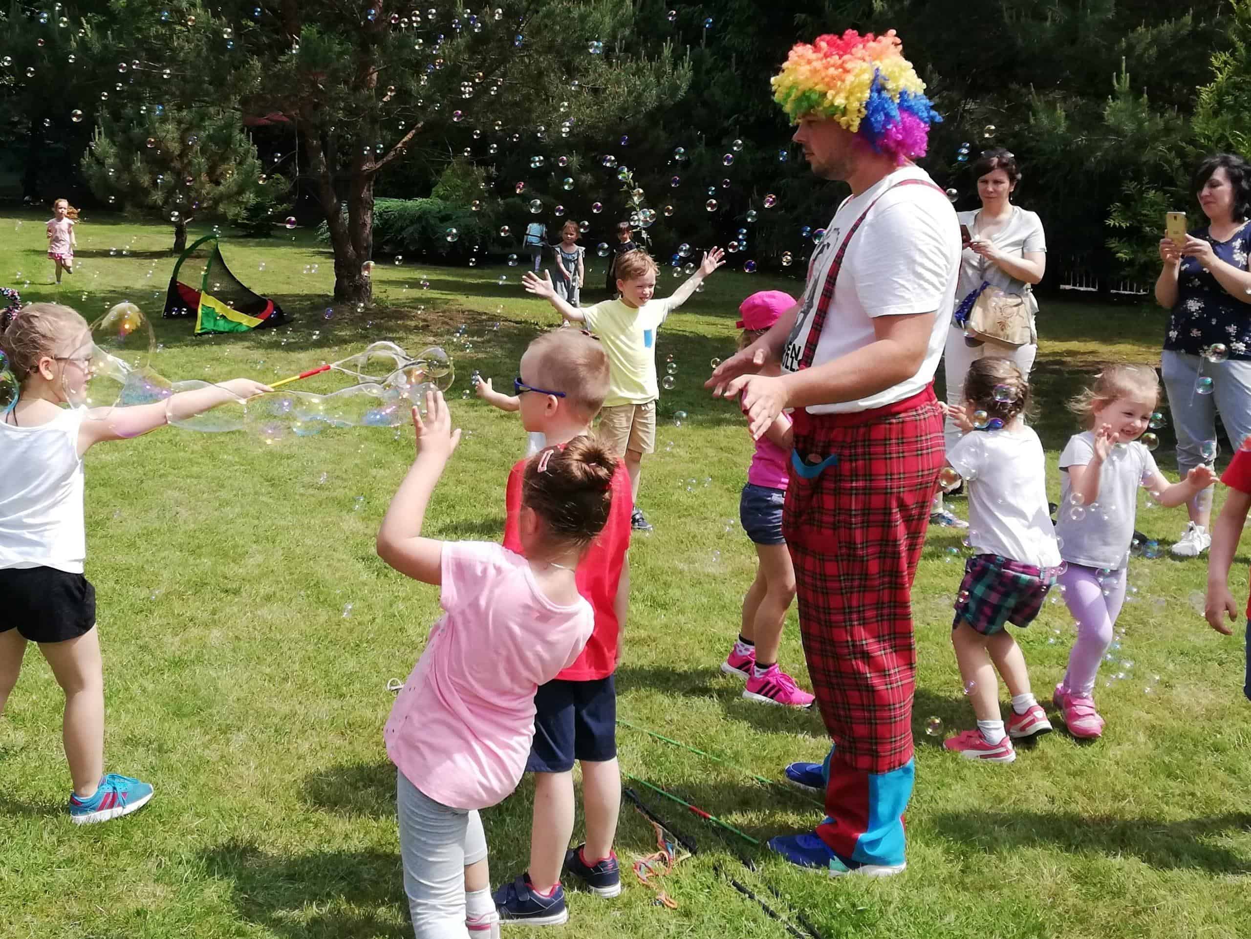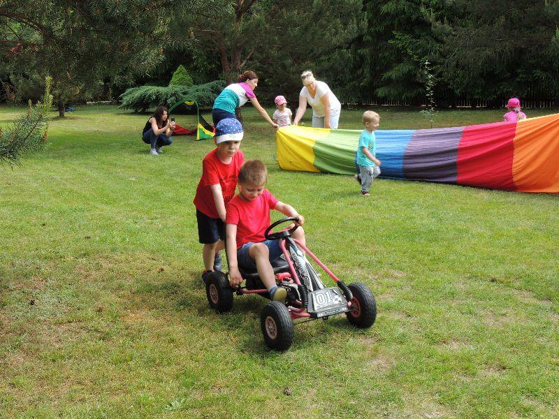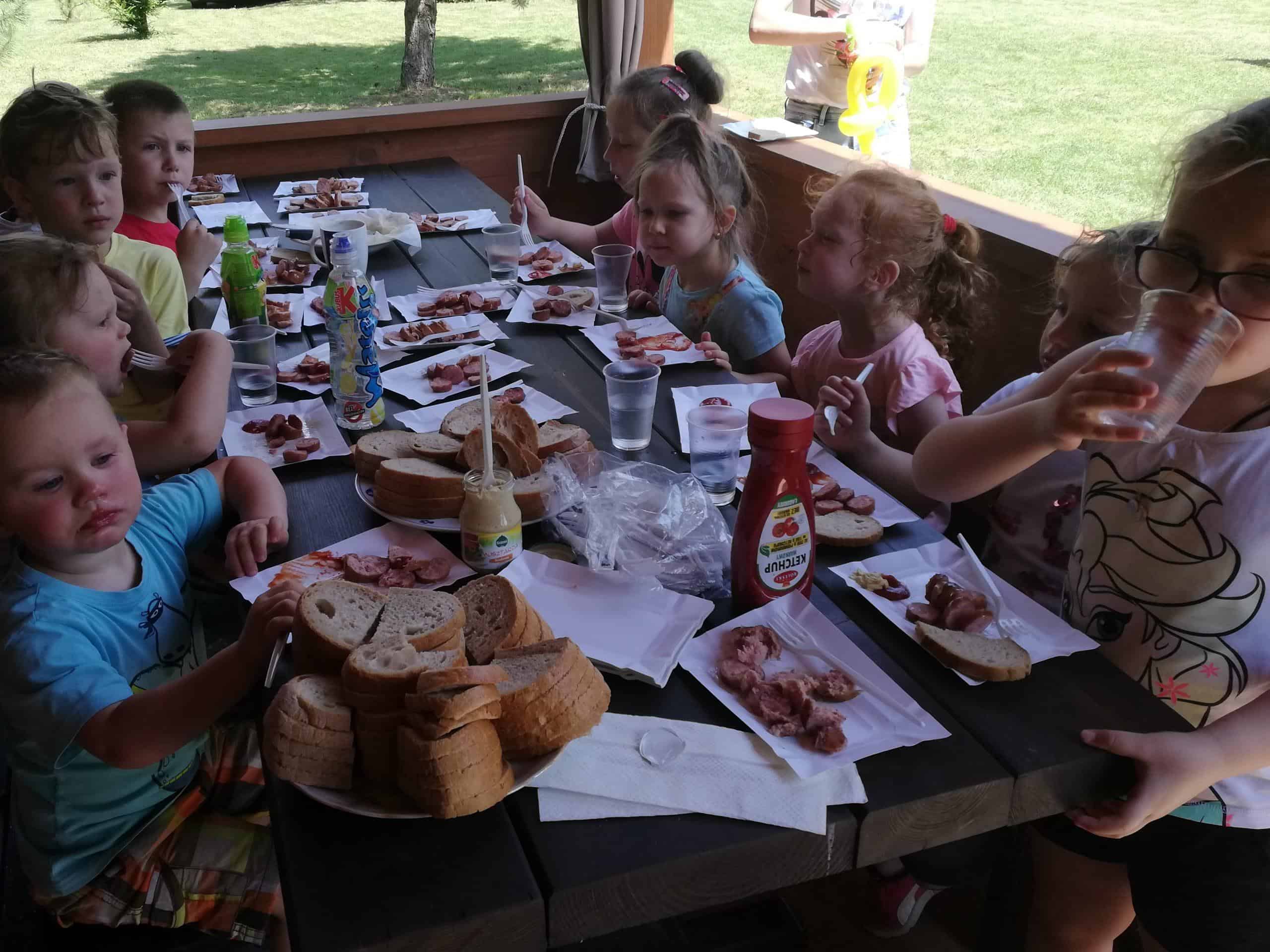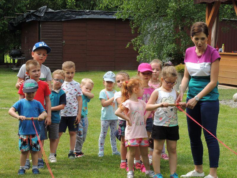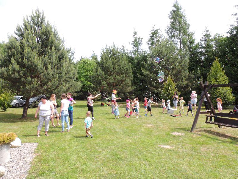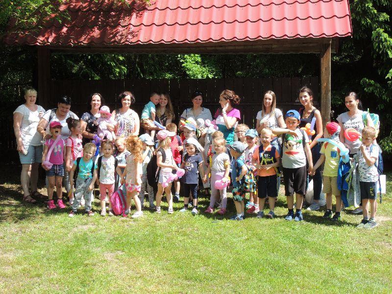Po sytym śniadaniu zjedzonym w przedszkolu wsiedliśmy do autobusu i z uśmiechami na twarzy wyruszyliśmy na naszą długo wyczekiwaną wycieczkę grupową. Dzieci nie mogły doczekać się wyjazdu. Już sama podróż autobusem była pasjonująca, gdyż wreszcie można było wyciągnąć z plecaka przygotowane przez rodziców smakołyki. A później… później to niezmącona radość, nieustające uśmiechy i niezanikająca energia dzieci. Po pierwszych szaleństwach wśród zieleni, przyszedł czas na zabawy z Wodzirejem, który umilał pobyt dzieci różnorodnymi animacjami – były tańce i przeciąganie liny, rzuty do celu i przechodzenie przez tunel. Były też przepiękne bańki mydlane i wytwory z balonów – zabawa goniła zabawę! A gdy po biegach, szaleństwie i harcach brzuszki zaczęły nam burczeć, to czekały na nas pyszne kiełbaski ugrillowane przez Pana Grzesia a zaraz po nich można było delektować się smakowitymi rurkami z kremem. Iście królewska uczta. Ach cóż to był za dzień…