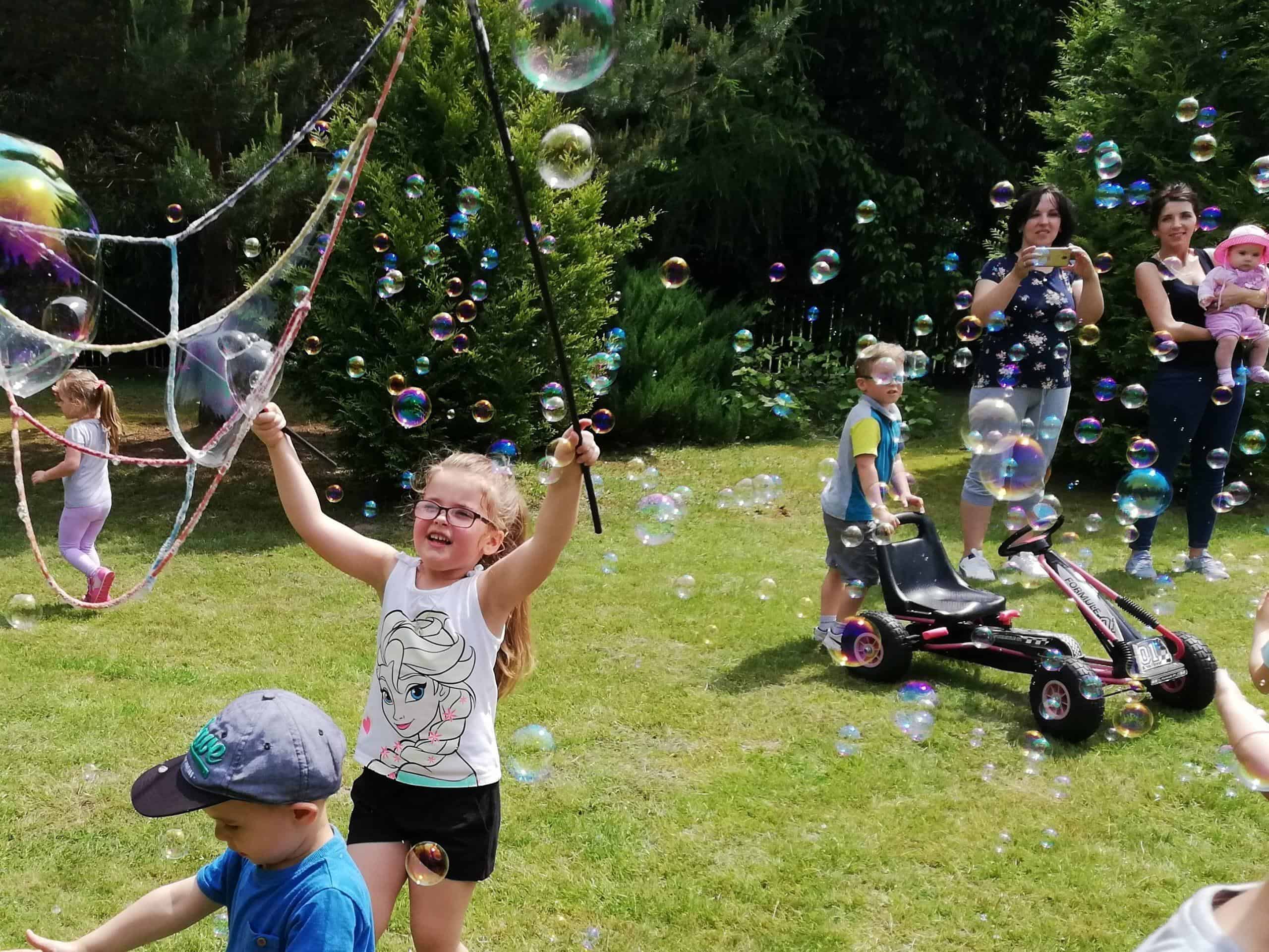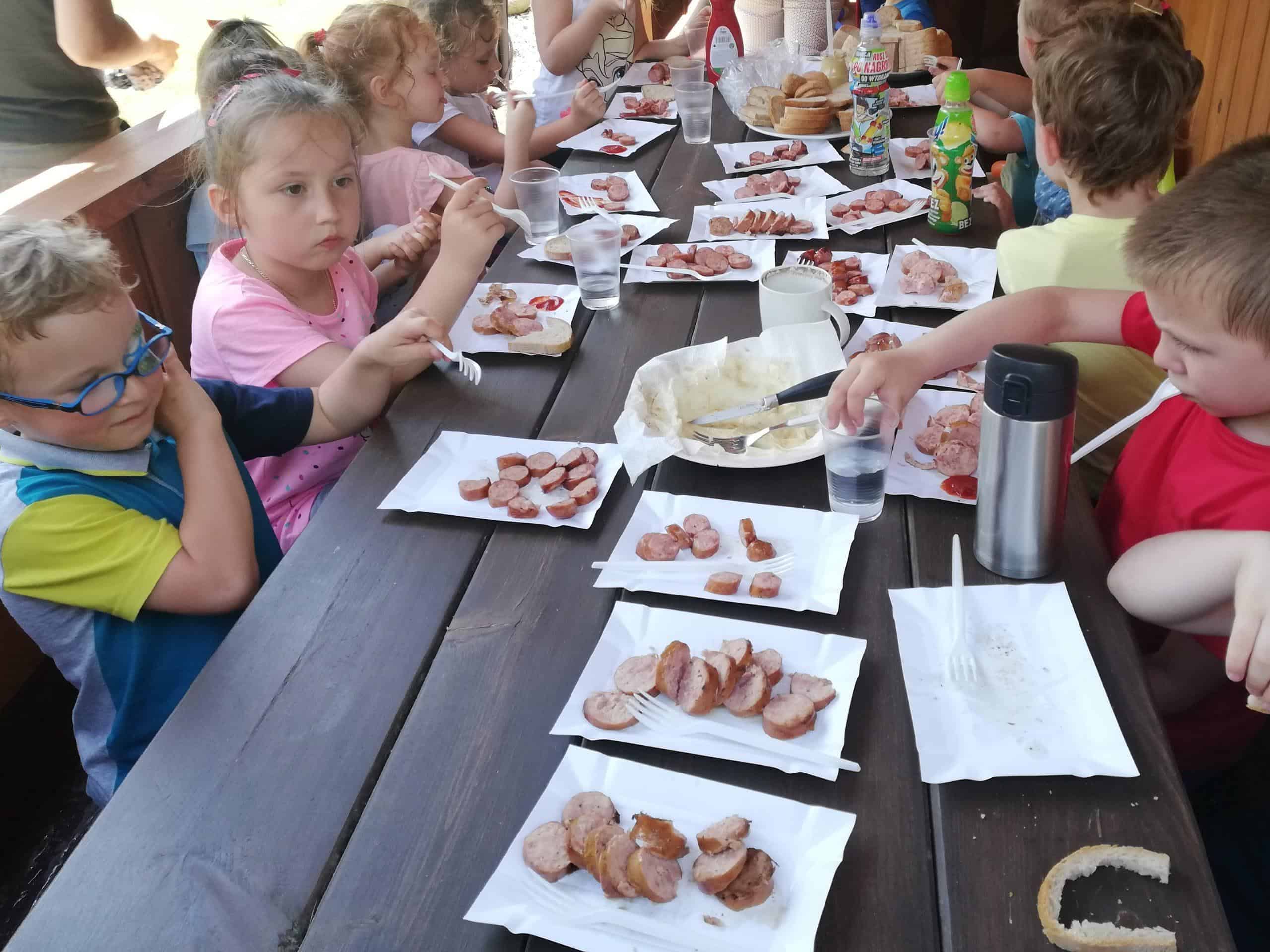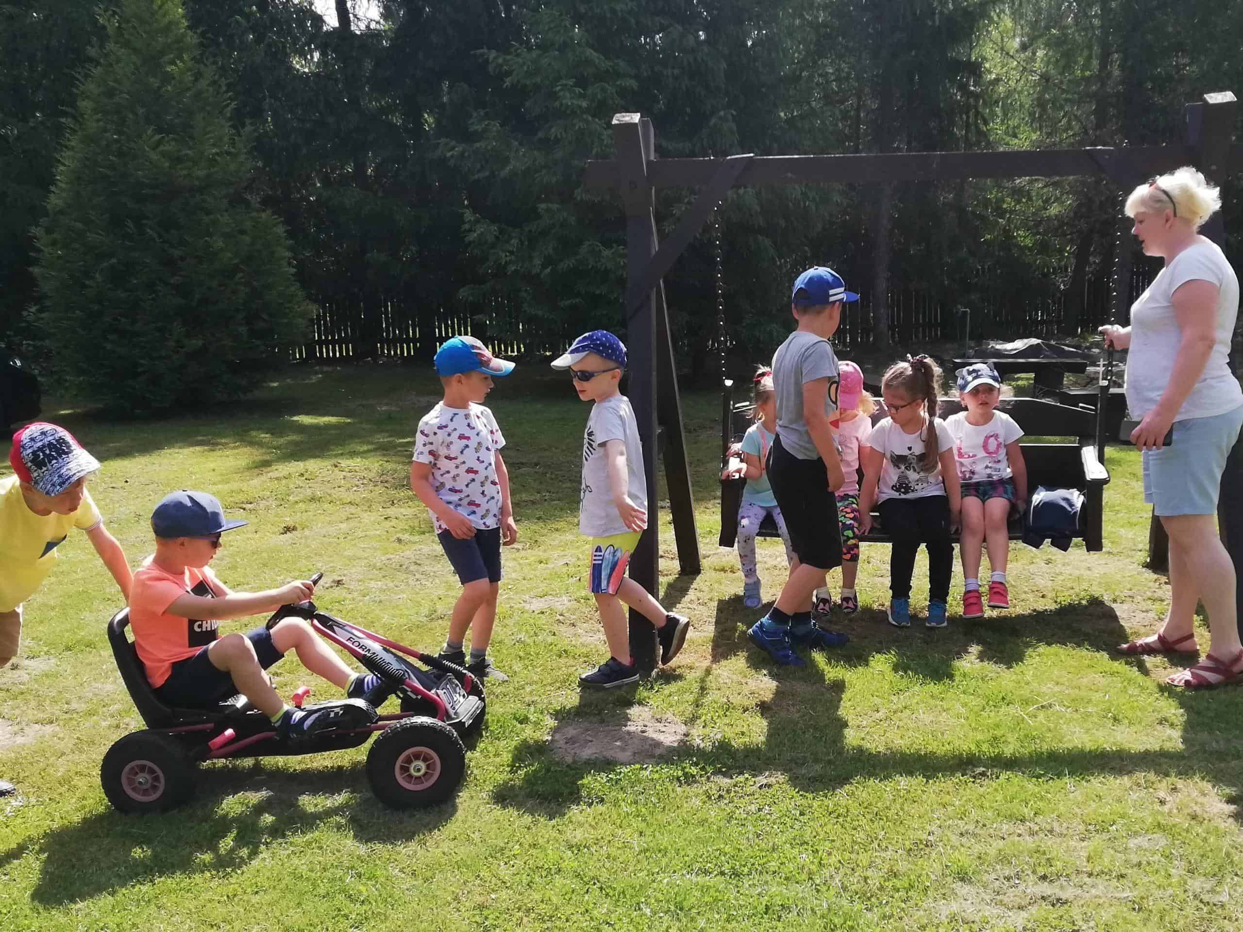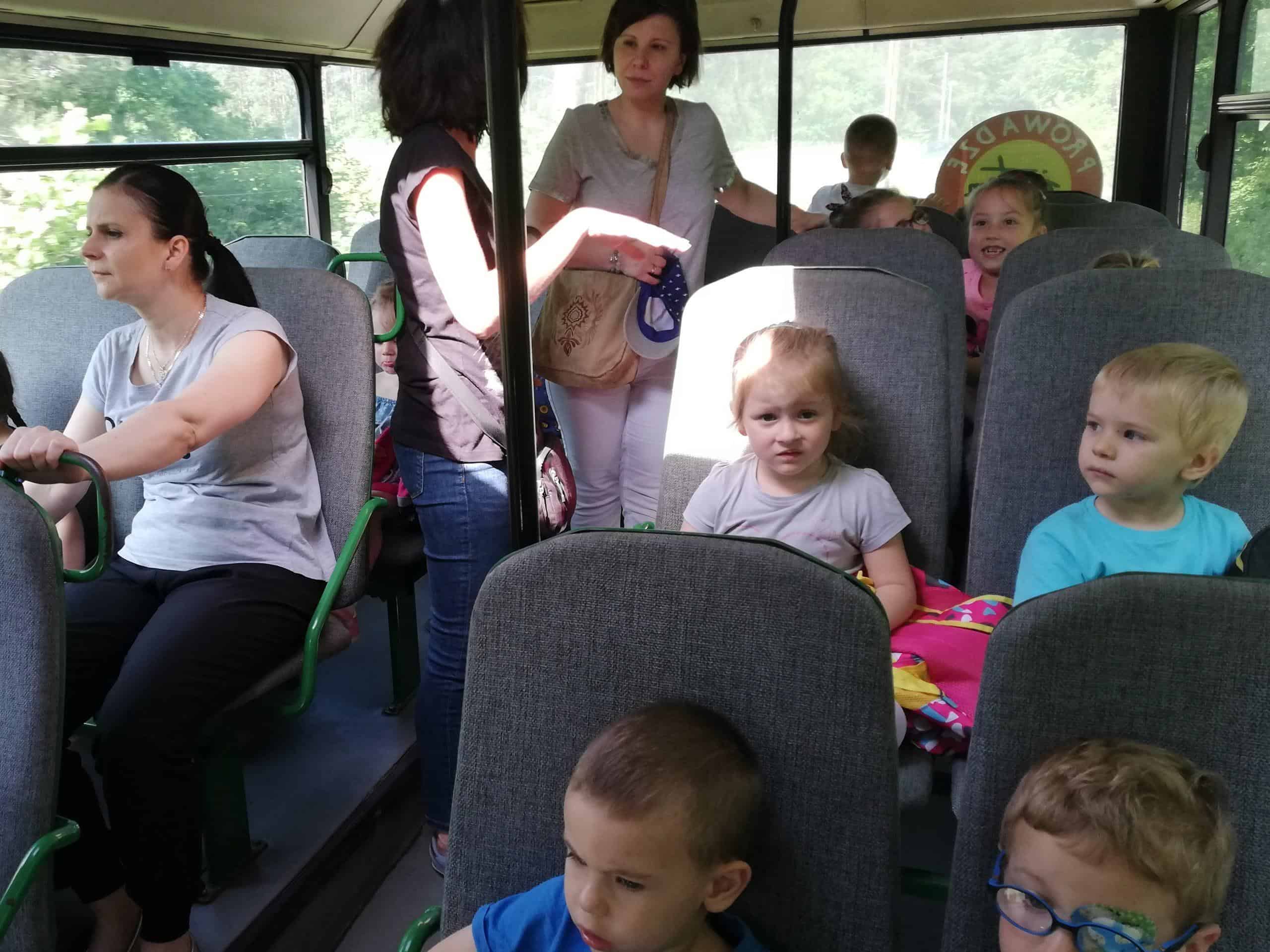 Po sytym śniadaniu zjedzonym w przedszkolu wsiedliśmy do autobusu i z uśmiechami na twarzy wyruszyliśmy na naszą długo wyczekiwaną wycieczkę grupową. Dzieci nie mogły doczekać się wyjazdu. Już sama podróż autobusem była pasjonująca, gdyż wreszcie można było wyciągnąć z plecaka przygotowane przez rodziców smakołyki. A później… później to niezmącona radość, nieustające uśmiechy i niezanikająca energia dzieci. Po pierwszych szaleństwach wśród zieleni, przyszedł czas na zabawy z Wodzirejem, który umilał pobyt dzieci różnorodnymi animacjami – były tańce i przeciąganie liny, rzuty do celu i przechodzenie przez tunel. Były też przepiękne bańki mydlane i wytwory z balonów – zabawa goniła zabawę! A gdy po biegach, szaleństwie i harcach brzuszki zaczęły nam burczeć, to czekały na nas pyszne kiełbaski ugrillowane przez Pana Grzesia a zaraz po nich można było delektować się smakowitymi rurkami z kremem. Iście królewska uczta. Ach cóż to był za dzień…
