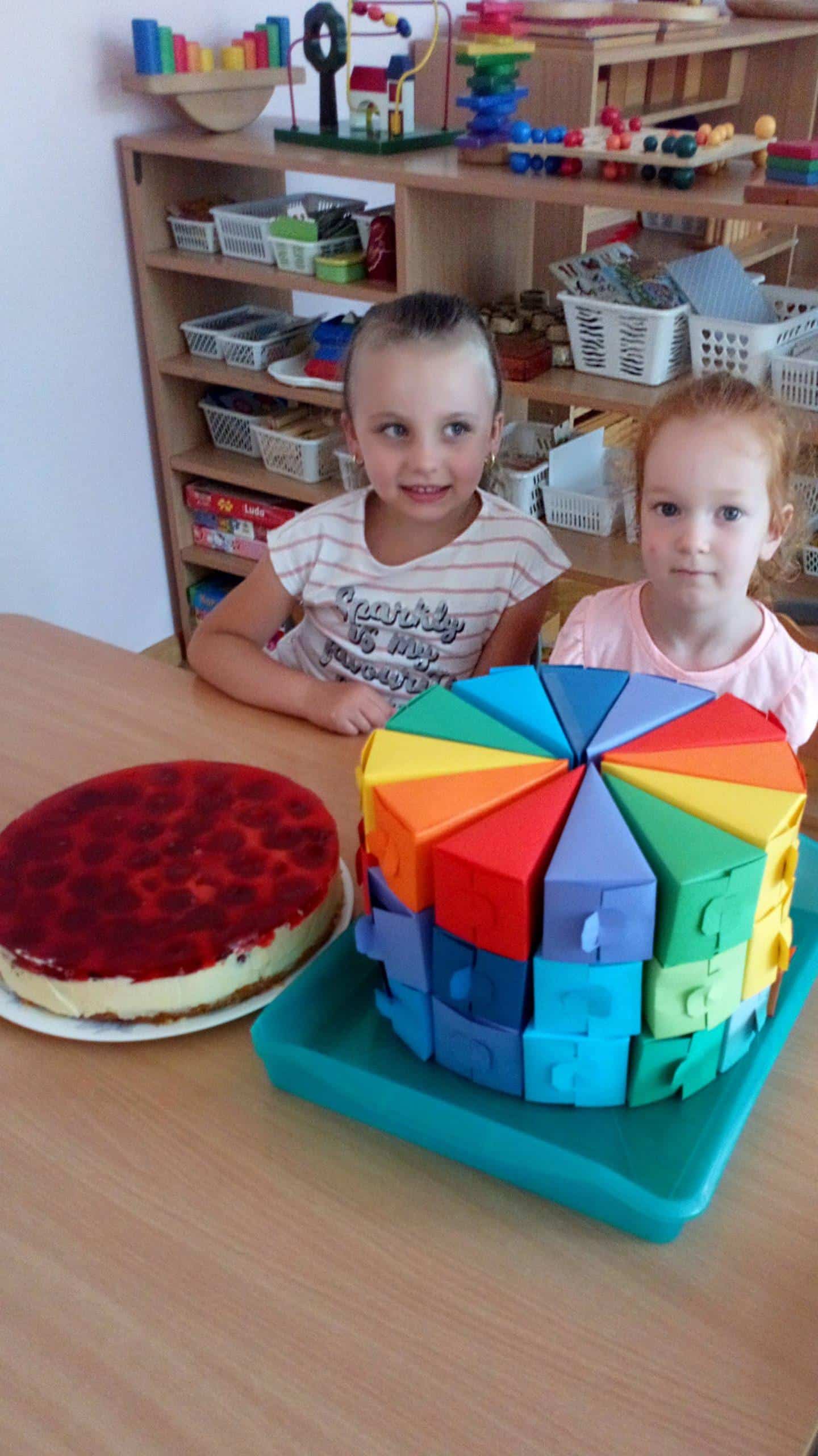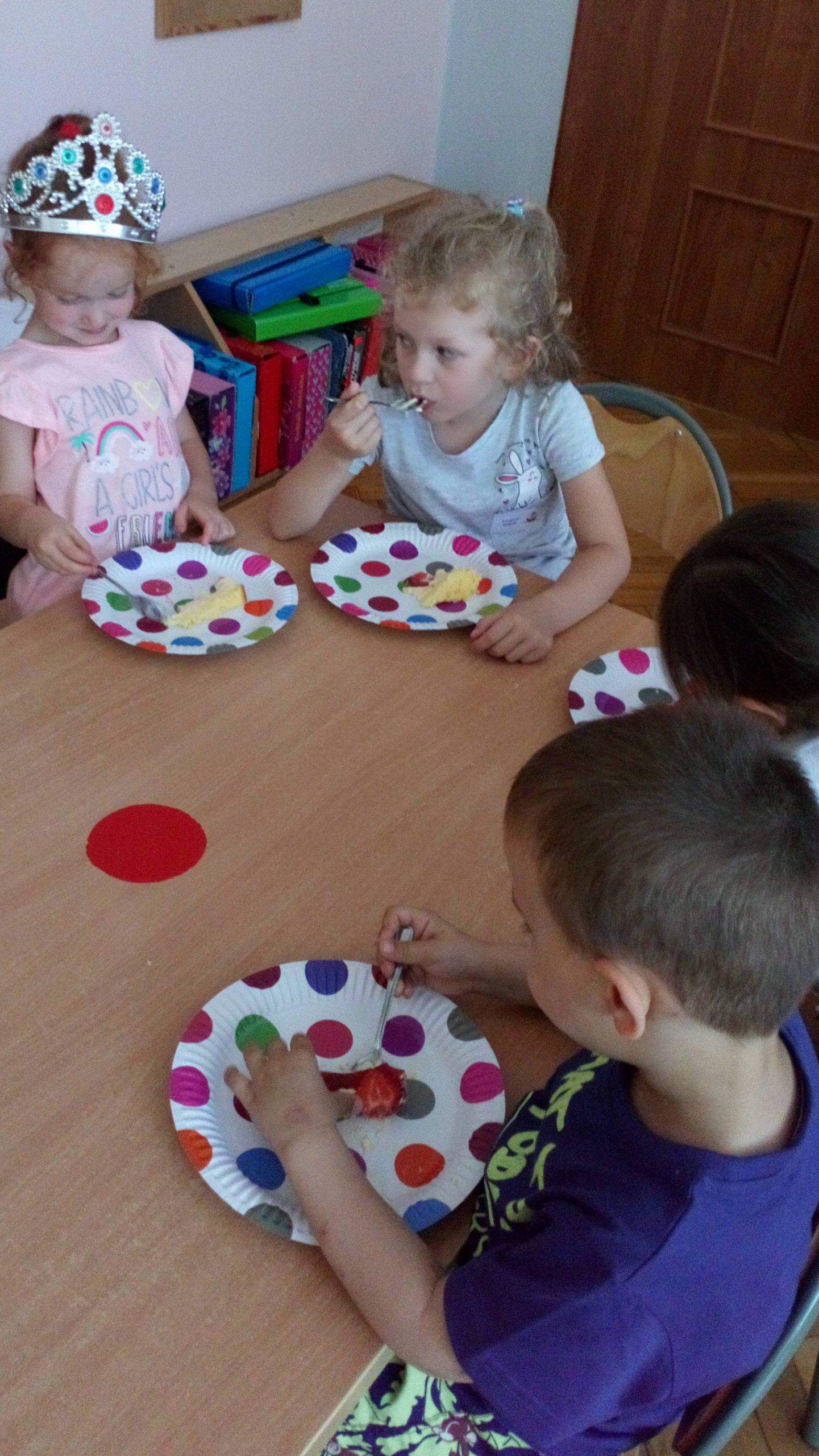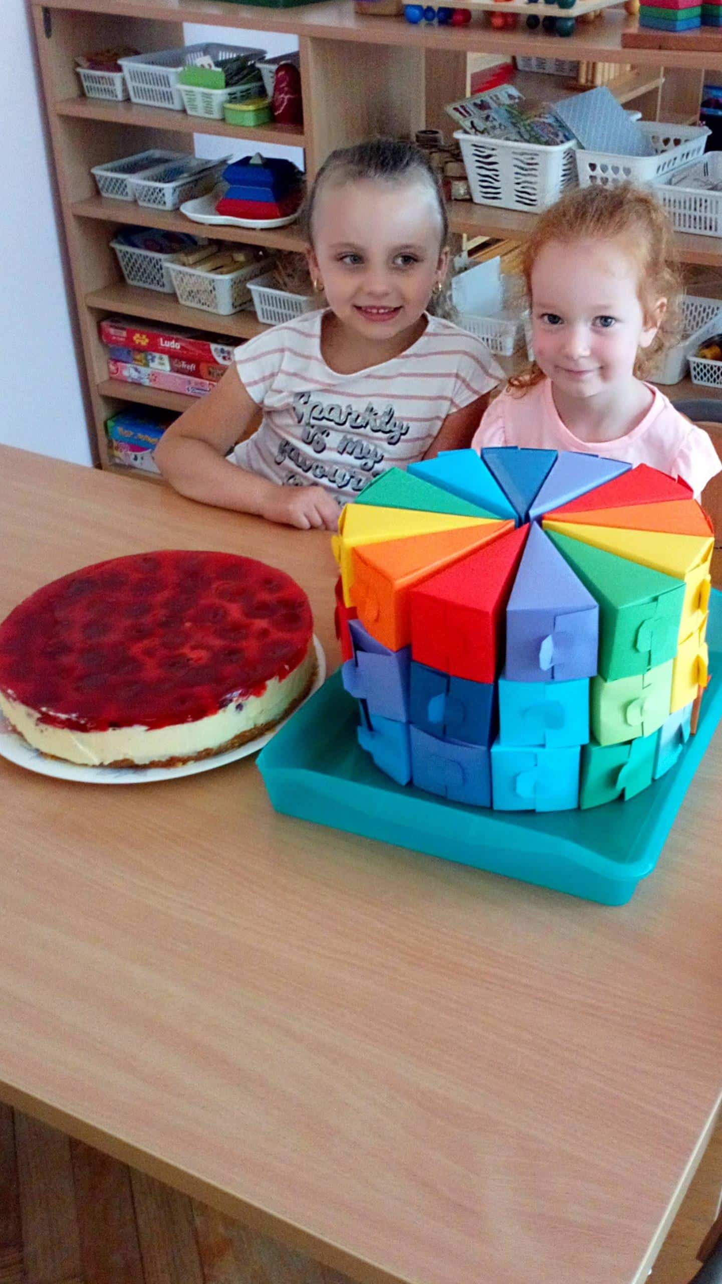 Gdy emocje już opadły i wróciliśmy do naszych codziennych zajęć i przedszkolnych aktywności Rodzice Zosi po raz kolejny zrobili nam niebywałą niespodziankę – oto na stoliku w naszej sali pojawił się przepiękny i niezwykle smakowicie wyglądający tort truskawkowy – tort urodzinowy Zosi, ale żeby tego było mało tuż obok niego pojawił się drugi, piętrowy tort w wersji papierowej. Każdy kawałek tego tortu krył w sobie niespodziankę dla dzieci z grupy – były to ukryte w środku drobne słodkości, które stanowiły upominek urodzinowy od Zosi. Kolorowy, piętrowy tort niespodzianka! Ach jakie on robił wrażenie! Dzieci były zachwycone – zarówno prezencikami jak i ogromem pracy, jaki musiała włożyć Mamusia Zosi i sama Zosia w przygotowanie takiej niespodzianki! DZIĘKUJEMY SERDECZNIE! Były to niebywale smakowite urodziny, które z pewnością będziemy długo pamiętać!