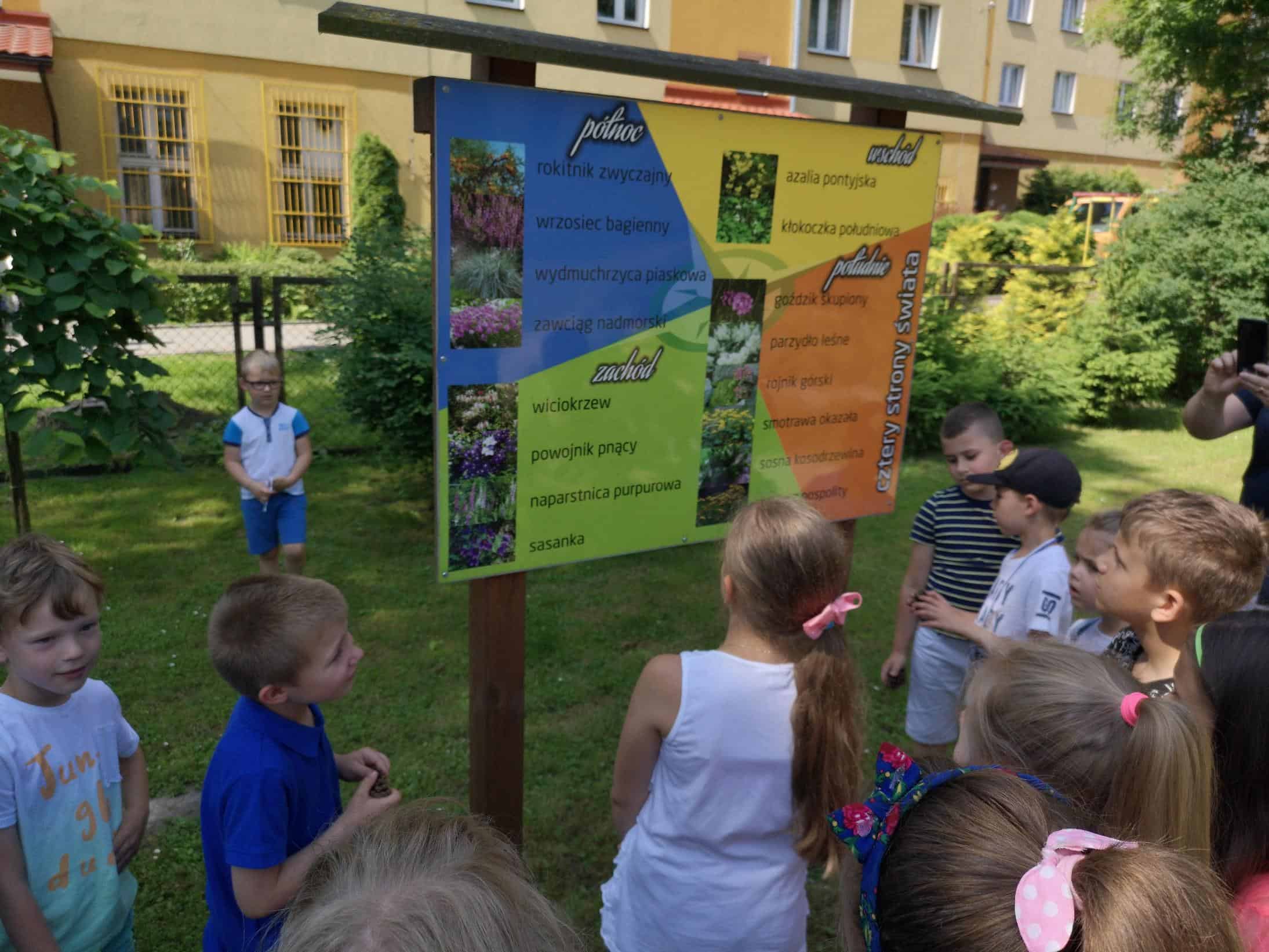 Podczas spotkania dzieci z gr. Zielonej i Czerwonej oraz zaproszeni uczniowie uporządkowali i wzbogacili wiedzę na temat roślinności znajdującej się na naszej Przyrodniczej Ścieżce Edukacyjnej tj.: