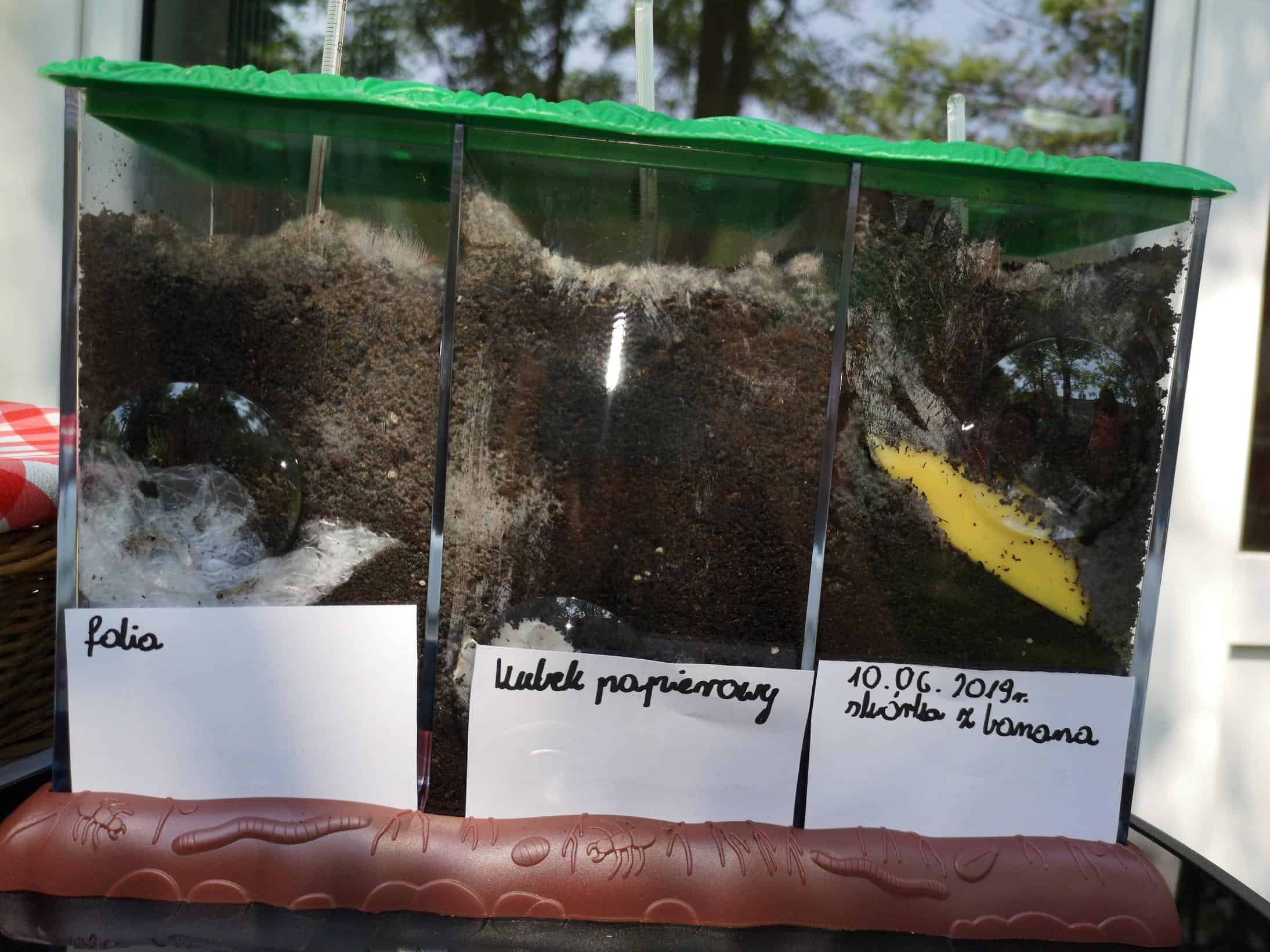 W jednym pojemniku umieszczono: skórkę z banana, kubek papierowy, woreczek foliowy, w drugim: ogryzek z jabłka, kartkę papieru oraz kubek plastikowy. Komory pojemników zostały odpowiednio podpisane. Teraz będziemy obserwować przez lupy jak proces biodegradacji będzie zachodził w stosunku do poszczególnych materiałów.