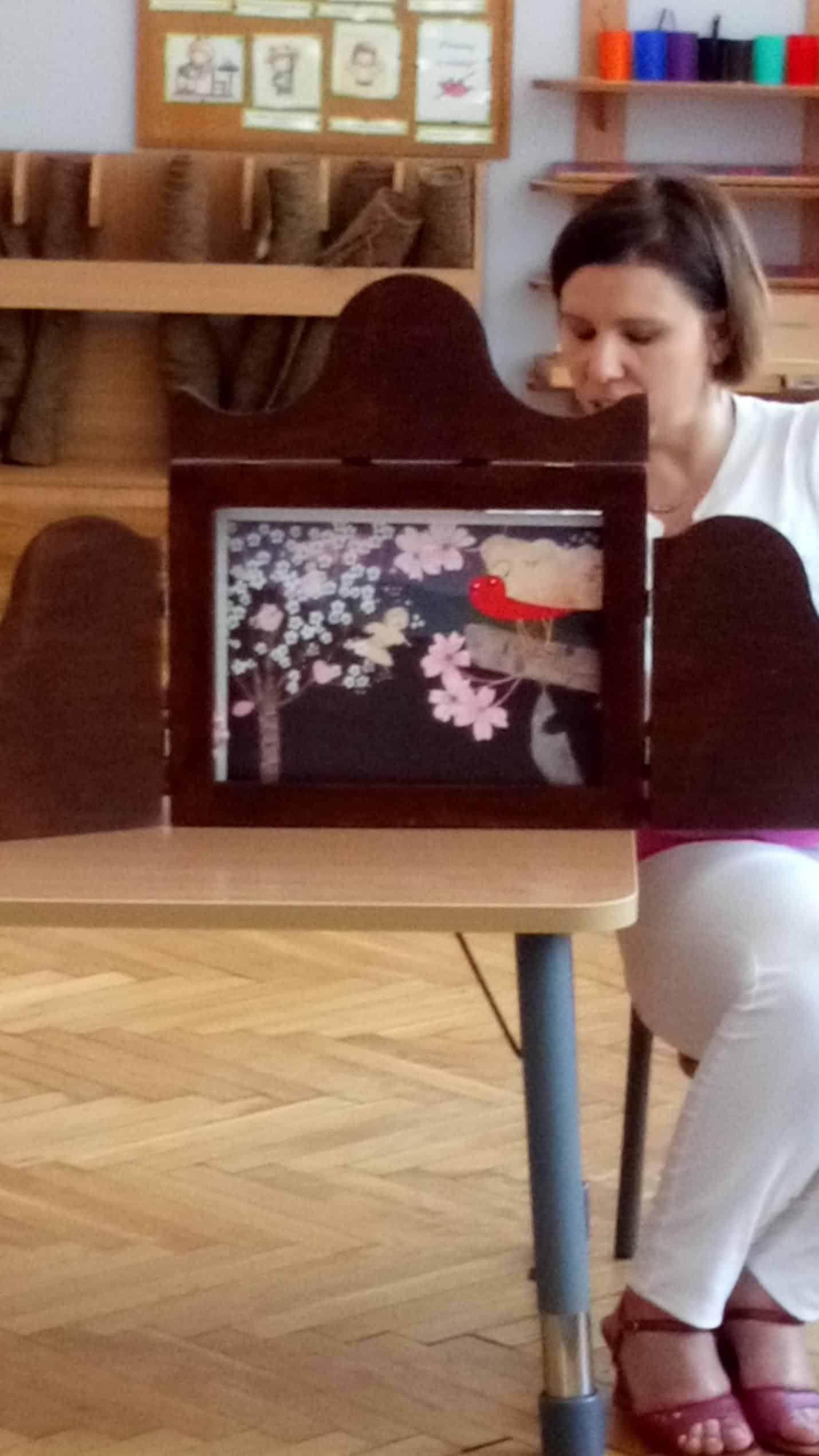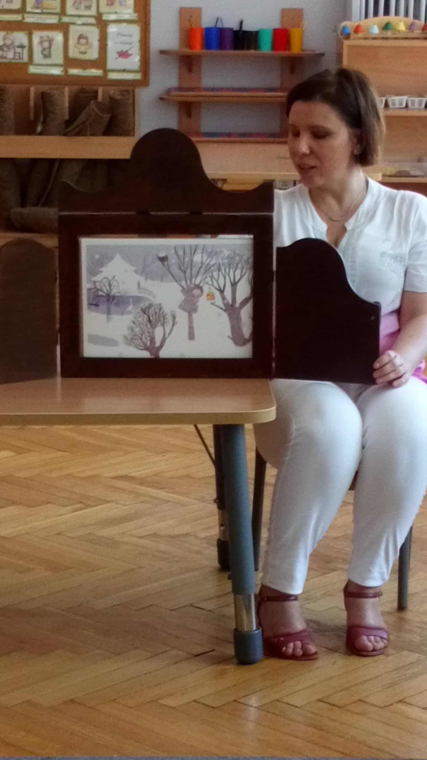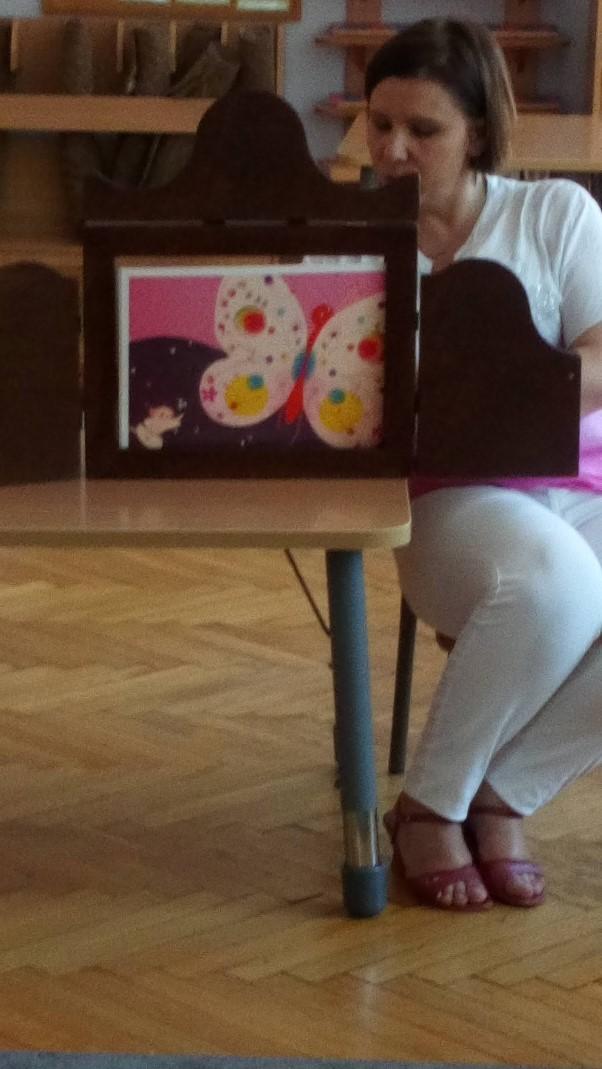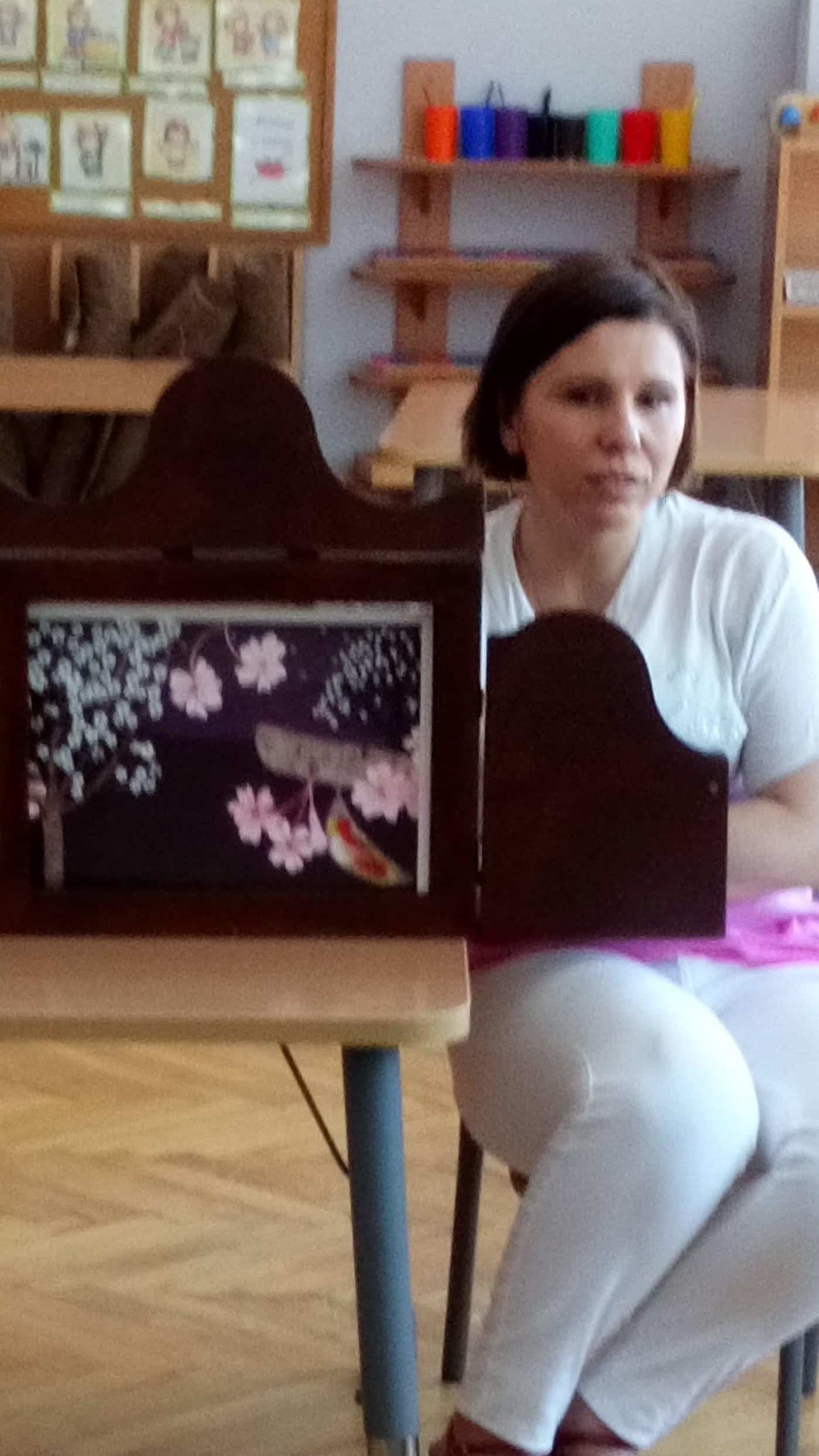 Żeby opowiadać o przyrodzie wcale nie trzeba być na łące, w lesie czy w ogrodzie. Wystarczyło zjawić się we wtorek 11 czerwca w naszej grupie, aby wysłuchać Pani Dorotki, mamusi naszego Przemka, która w niezwykle barwny i ciekawy sposób opowiedziała nam o motylu imieniem Kemushi. Było to o tyle wyjątkowe spotkanie, że Pani Dorotka przedstawiła nam tę historię za pomocą sztuki Kamishibai – japońskiej techniki czytania bajek lub inaczej teatru ilustracji. Za pomocą kartonowych plansz z obrazkami poznaliśmy historię mówiącą o przemianach w przyrodzie wraz ze zmieniającymi się porami roku. Narrator opowieści, dziecko, zabrało nas w swój mały świat, w którym fascynowała go gąsienica mieszkająca w małym domku na drzewie. Każdego dnia przychodził tam i obserwował to stworzenie nazwane przez niego Kemushi ( co w języku japońskim oznacza gąsienica), które całą zimę rosło i dojrzewało schowane pod ciepłą ,,kołderką”. Czas mijał a gąsienica z dnia na dzień stawała się coraz większa. W domku, w którym mieszkała było już jej za ciasno. Kiedy owocowe drzewa przekwitły a ,,płatki spadły jak konfetti”, kokon pękł a Kemushi stała się pięknym motylem. „Płatki opadają, a on odlatuje.”