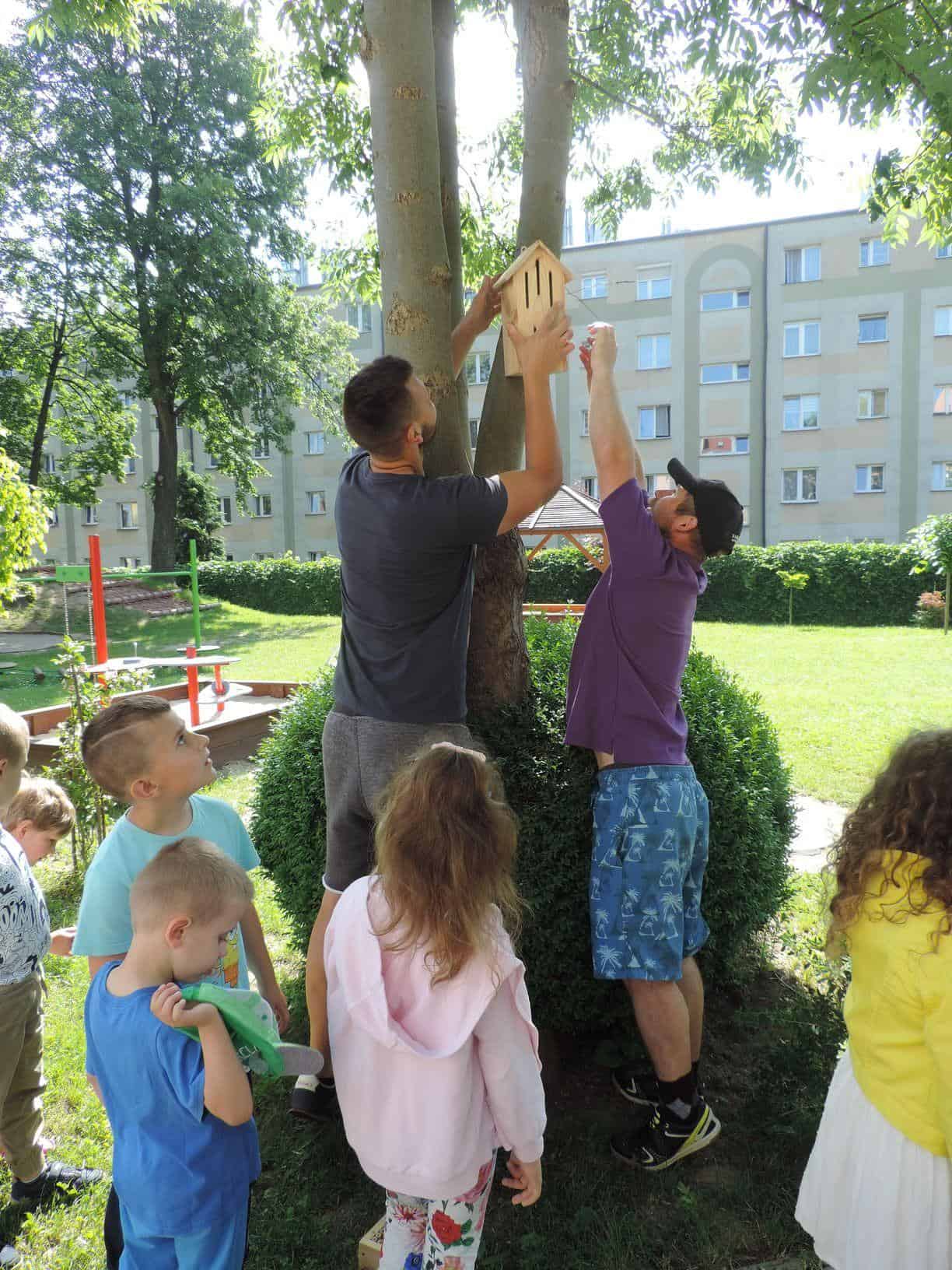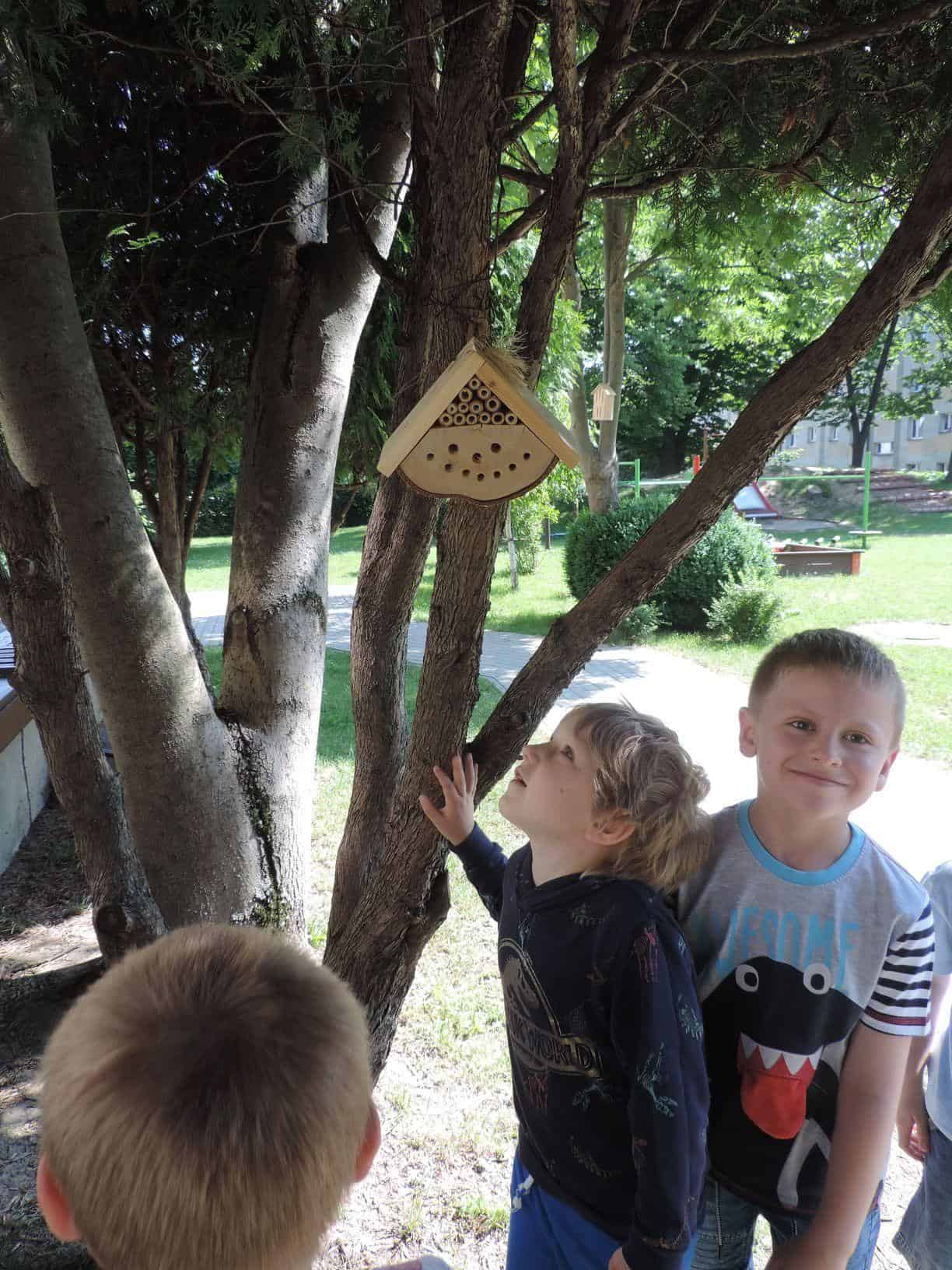Ogród przedszkolny łączy rożne funkcje. Jest miejscem do zabaw dzieci. Znajduje się w nim również szczególny obszar, przeznaczony do uprawy i obserwacji roślin. W tak sprzyjających warunkach przyrodniczych w ogrodzie chętnie gnieżdżą się ptaki i przylatują do niego owady. Obecność różnych gatunków roślin to dla nich prawdziwa pokusa. Z myślą o udogodnieniach dla owadów oraz o obserwacji przyrody w naturalnym środowisku, dzieci razem z rodzicami przygotowały nowe stanowiska przyrodnicze. Są wśród nich domki dla owadów. Domki dla owadów pełnią w ogrodzie ważną rolę, bo pomagają je zwabić, są dla nich schronieniem i dogodnym miejscem do przetrwania chłodów. Podczas praktycznej lekcji w ogrodzie dzieci dowiedziały się o roli owadów. Rozumieją, że owady zapylają rośliny umożliwiając zawiązywanie się owoców, znają również rolę owadów w walce ze szkodnikami. Domki poza praktyczną funkcją przyciągają wzrok swoim wyglądem. Są jak obrazy skomponowane z tworzywa przyrodniczego: szyszek, patyczków oraz innych naturalnych przedmiotów. Oprawione w gustowne kolorowe ramki wyglądają jak małe dzieła sztuki. Połączono w nich funkcję praktyczną i estetyczną.