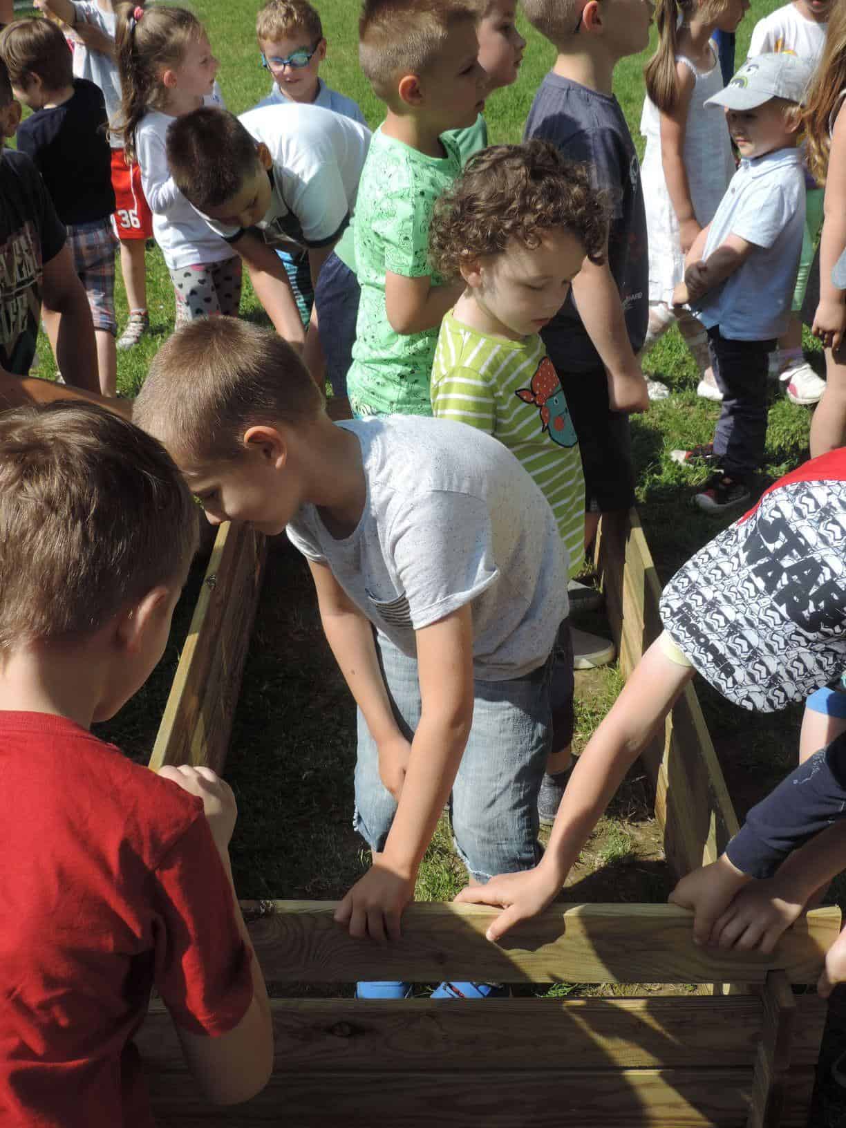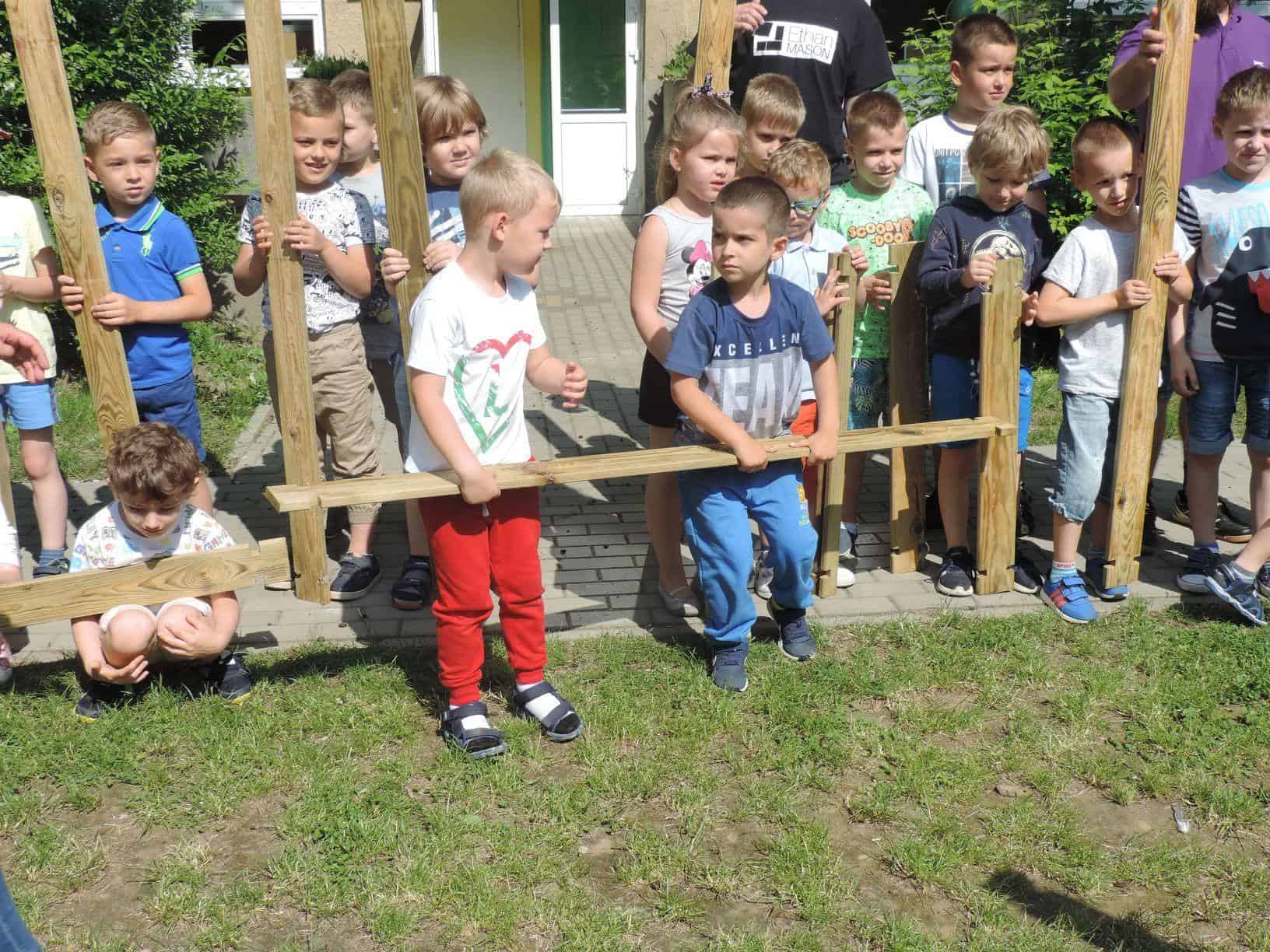 Największą aktywność, dzieci i rodzice wykazali podczas montowania kompostownika. To już nie wznoszenie z klocków, ale konstruowanie z dużych, drewnianych elementów. Poważna praca. Pod kierunkiem tatusiów w mgnieniu oka powstała pokaźnych rozmiarów konstrukcja. Kompostownik. Wprawdzie po jego skonstruowaniu dzieci nabrały ochoty na zabawę w nim, ale doskonale znały jego prawdziwe przeznaczenie.