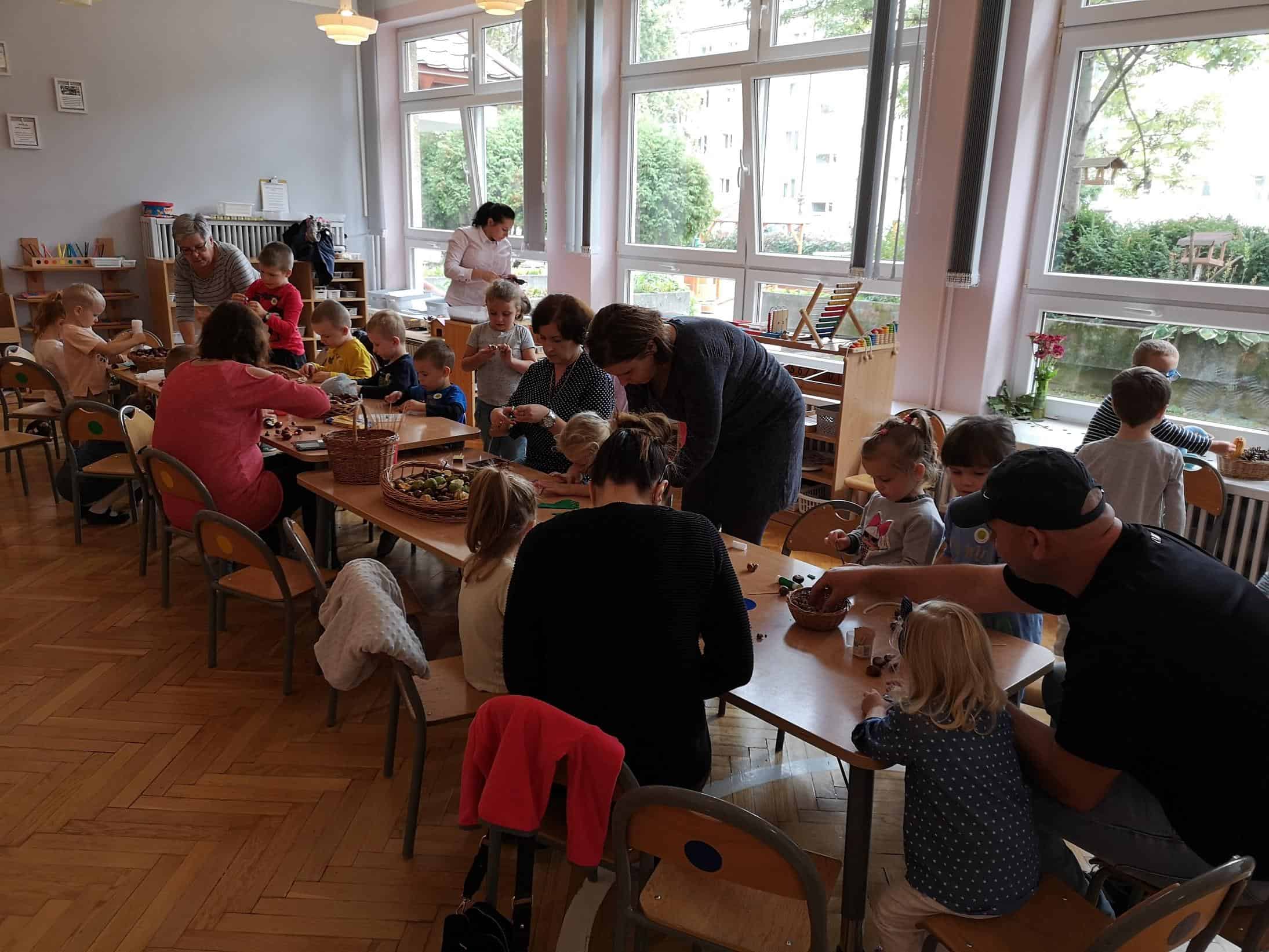 Nastała jesień, a wraz z nią nasz przyrodniczy kącik zaczął robić się coraz piękniejszy. Dzieci uzupełniały go przynoszonymi przez siebie kasztanami, żołędziami, szyszkami, orzechami, itp. Pewnego ranka Marysia i Hubert przynieśli do przedszkola wykonane razem ze swoją mamusią ludziki z kasztanów i żołędzi. Właśnie wtedy wpadł mi do głowy pomysł, aby zorganizować warsztaty z udziałem Rodziców, podczas których wykonamy takie cudeńka. W czwartek 26 września sala grupy Czerwonej zamieniła się w pracownię artystyczną, w której powstały jesienne rękodzieła.
