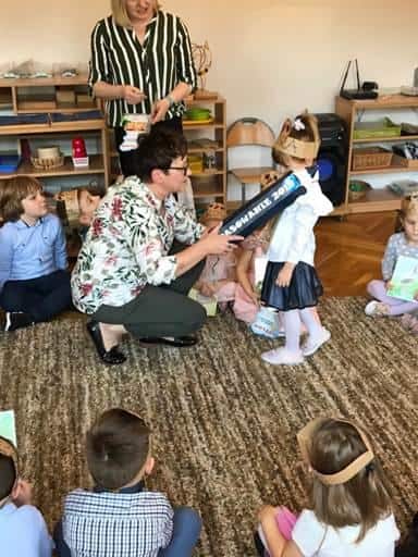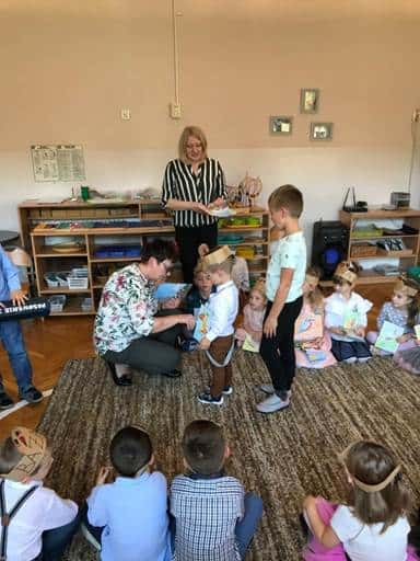 Po części artystycznej nastąpił akt pasowania, czyli dotknięcie ramienia każdego przedszkolaka ogromną kredką przez Panią Dyrektor. I oczywiście złożenie Przyrzeczenia przez dzieci. W zamian za to, każdy nowo mianowany przedszkolak otrzymał dyplom i odznakę Przedszkolaka.