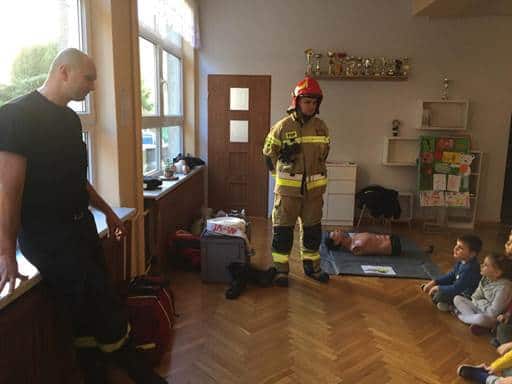 Okazało się, że nasze przedszkolaki mają już sporą wiedzę i umiejętności. Udowodnił to czteroletni Marcelek, który pięknie zaśpiewał piosenkę o numerach alarmowych, których znajomość ratuje życie. Otrzymał wielkie brawa i pochwałę od panów strażaków. Podczas zajęć dzieci poznały i utrwaliły procedury zachowania się w sytuacjach zagrożenia życia, gdy osoby dorosłe są nieobecne. Największe emocje wśród przedszkolaków wzbudził pokaz czynności resuscytacji wykonany na fantomie. Po części teoretycznej nadszedł czas na praktykę. Dzieci pod okiem prowadzących samodzielnie wykazywały się znajomością udzielania pierwszej pomocy. Ćwiczyły układanie poszkodowanego w pozycji bezpiecznej oraz resuscytację na fantomach. Utrwalały numery alarmowe, jak również kolejność podejmowania działań podczas udzielania pomocy.