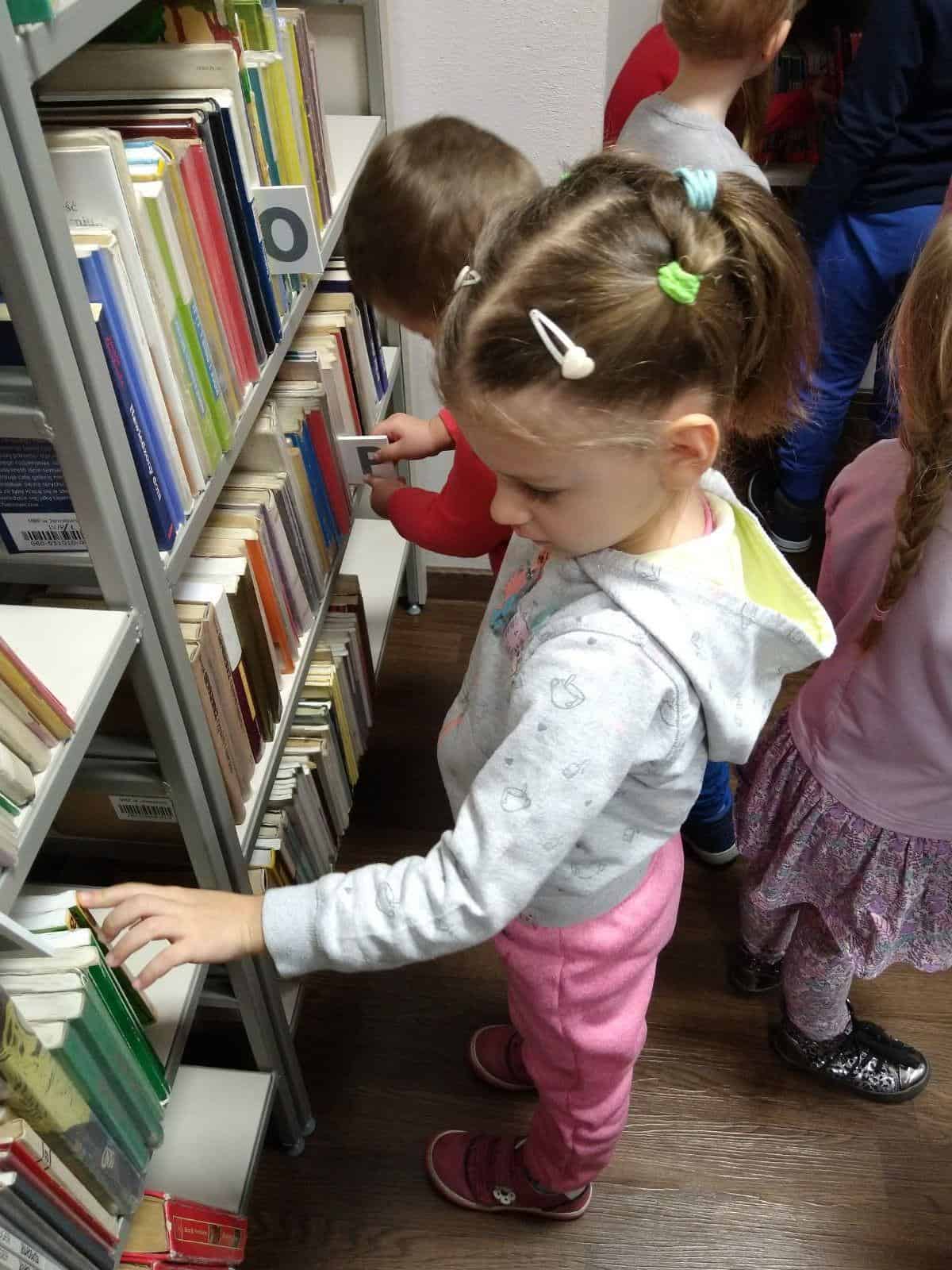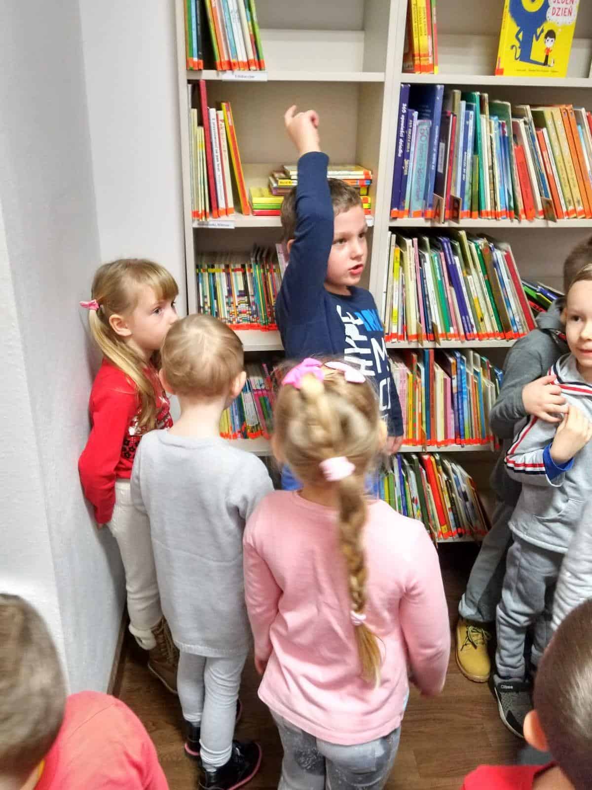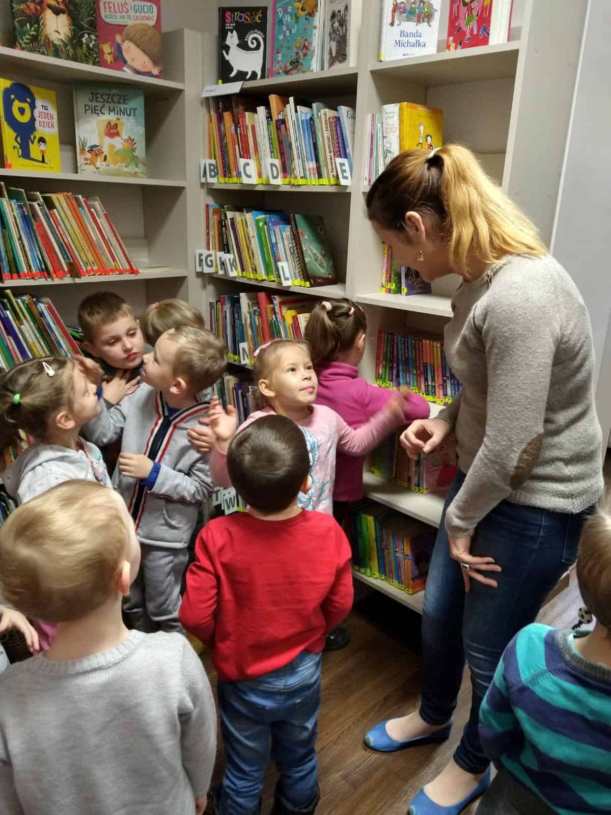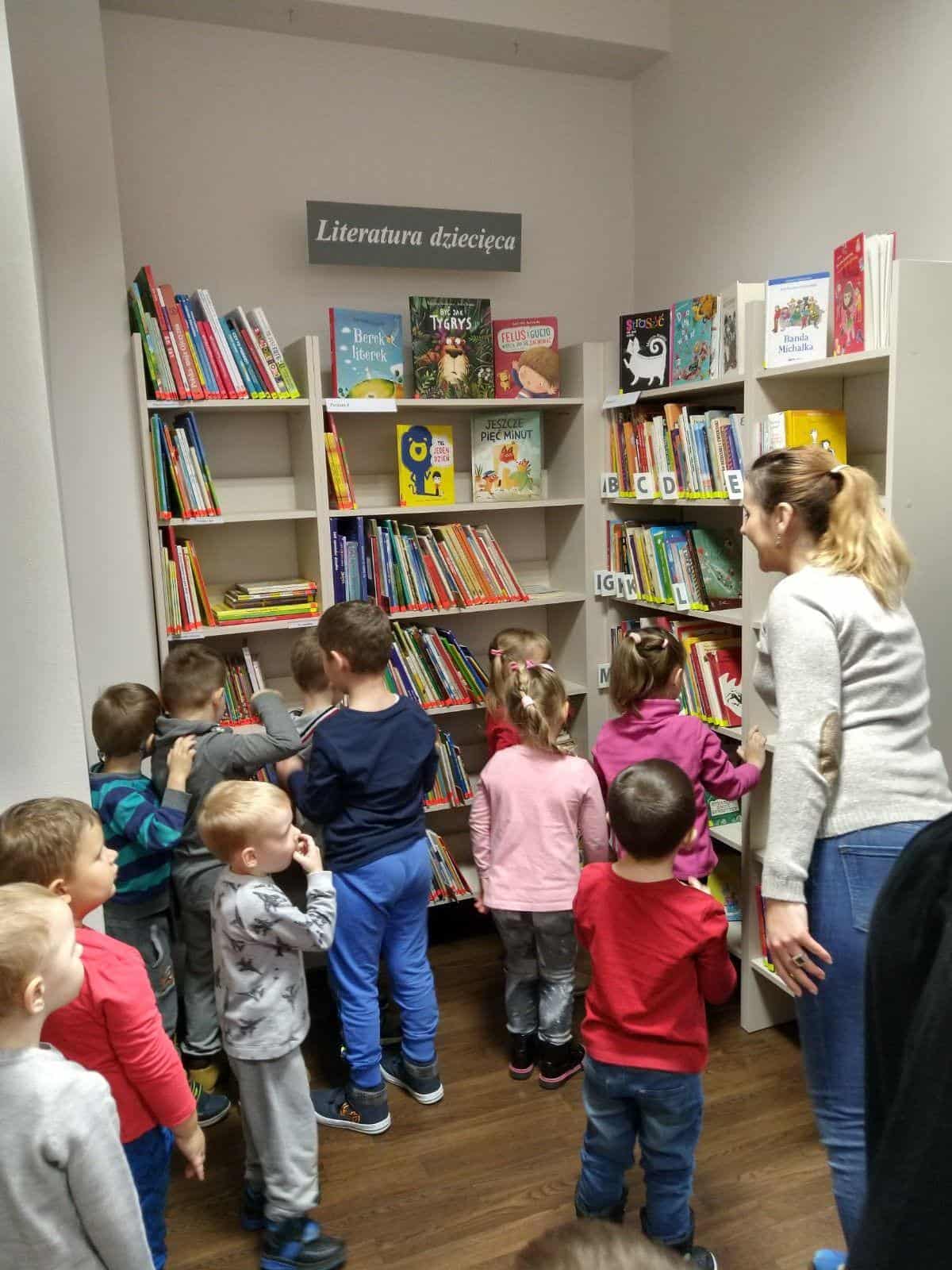 Poznające bibliotekę dzieci były bardzo skupione. Z zainteresowaniem chłonęły wiedzę,  którą przekazywała im pani bibliotekarka, gospodarz tego miejsca. Razem z panią bibliotekarką dzieci zwiedziły całą bibliotekę. Dowiedziały się, że w bibliotece oprócz książek można poczytać czasopisma, że istnieje w niej porządek polegający na zgromadzeniu książek w działach tematycznych. Czas, który dzieci spędziły w bibliotece przyniósł im dużo pożytku i bardzo dobrze nastroił.
