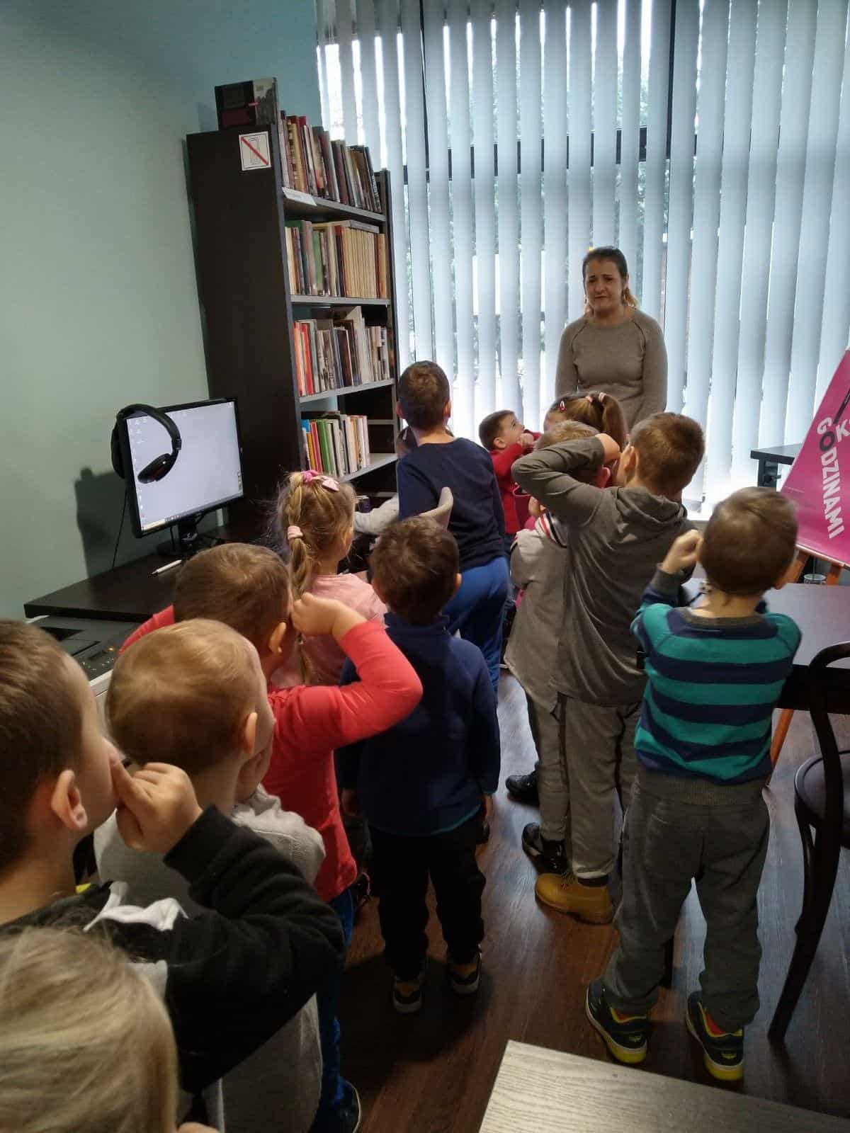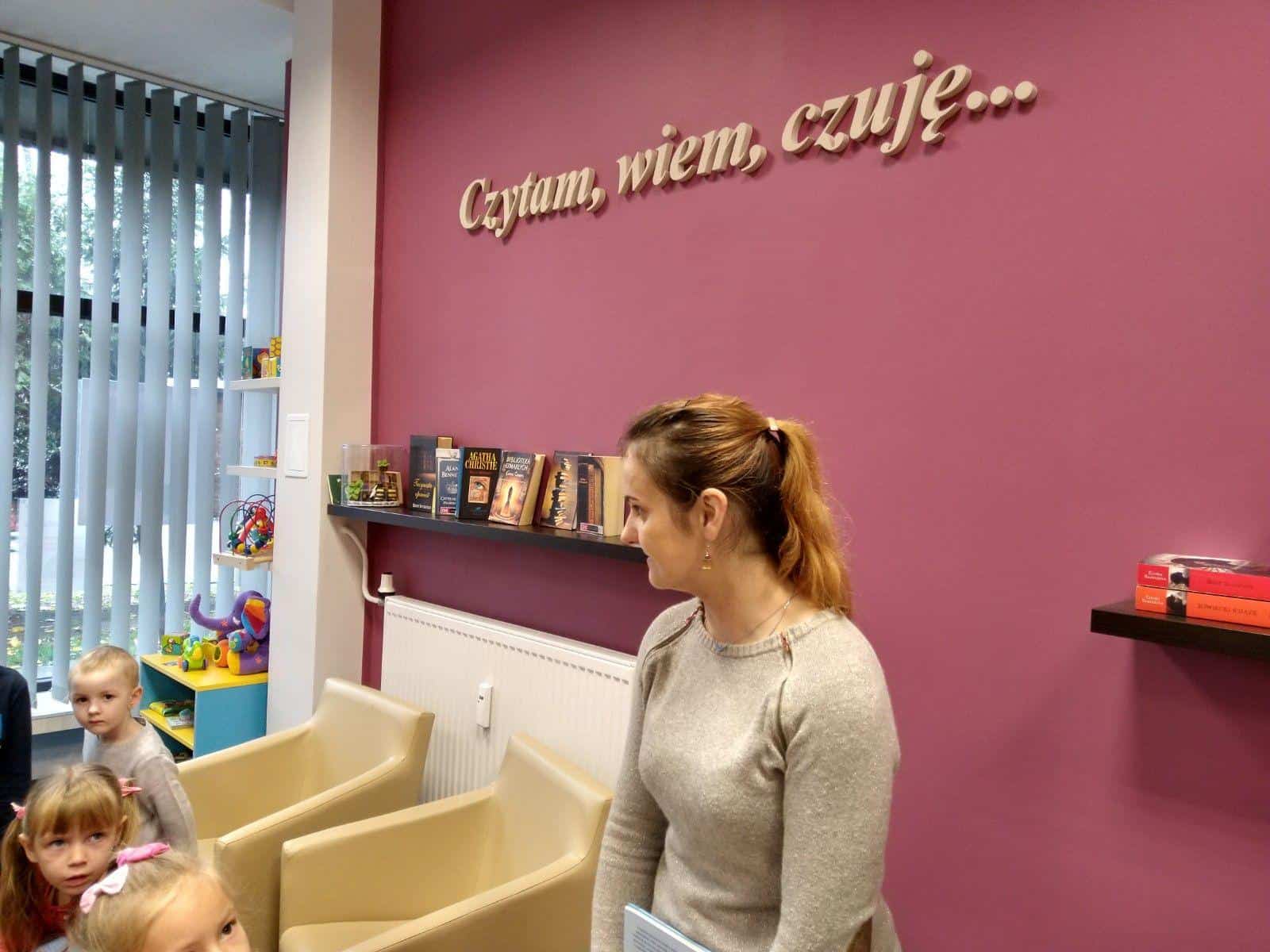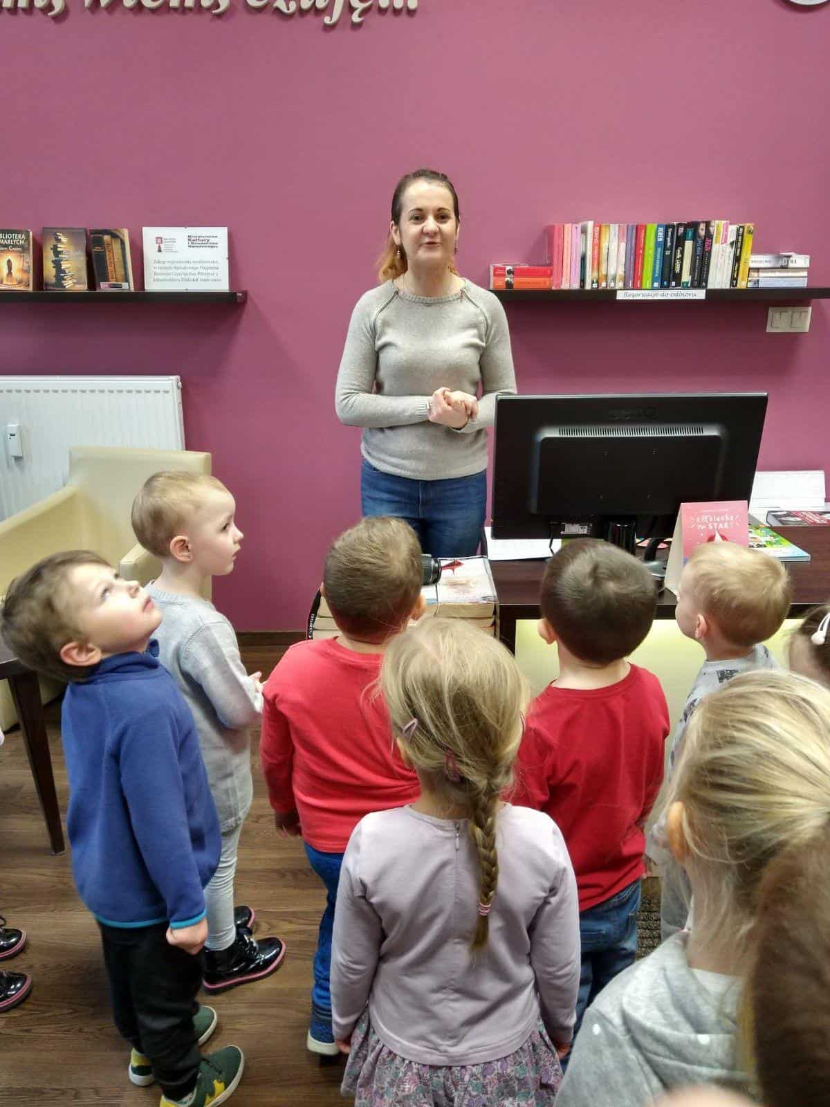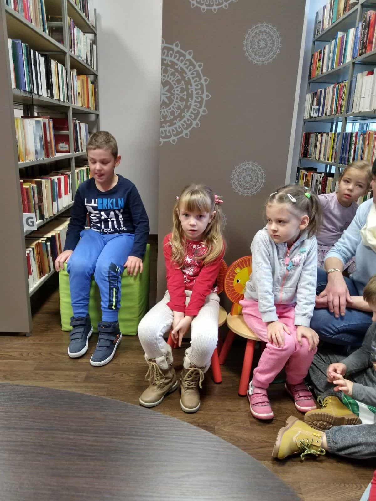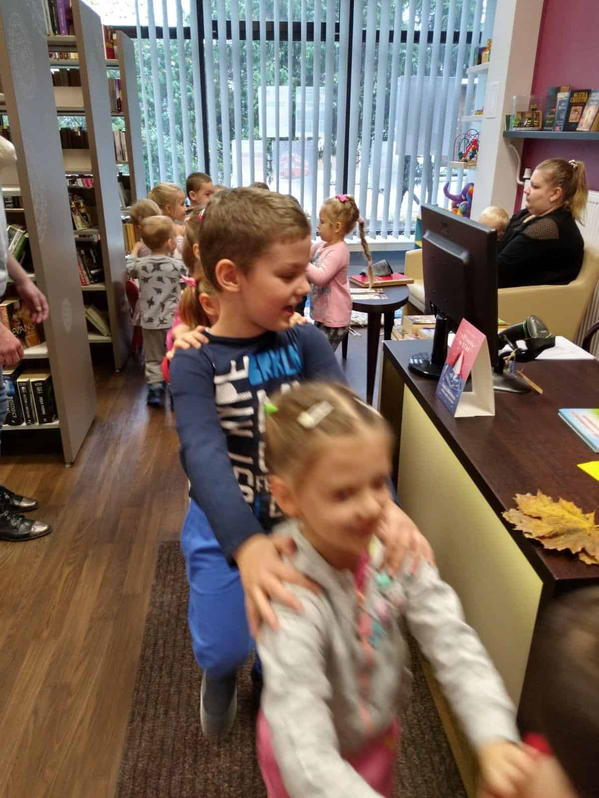 Poznające bibliotekę dzieci były bardzo skupione. Z zainteresowaniem chłonęły wiedzę,  którą przekazywała im pani bibliotekarka, gospodarz tego miejsca. Razem z panią bibliotekarką dzieci zwiedziły całą bibliotekę. Dowiedziały się, że w bibliotece oprócz książek można poczytać czasopisma, że istnieje w niej porządek polegający na zgromadzeniu książek w działach tematycznych. Czas, który dzieci spędziły w bibliotece przyniósł im dużo pożytku i bardzo dobrze nastroił.