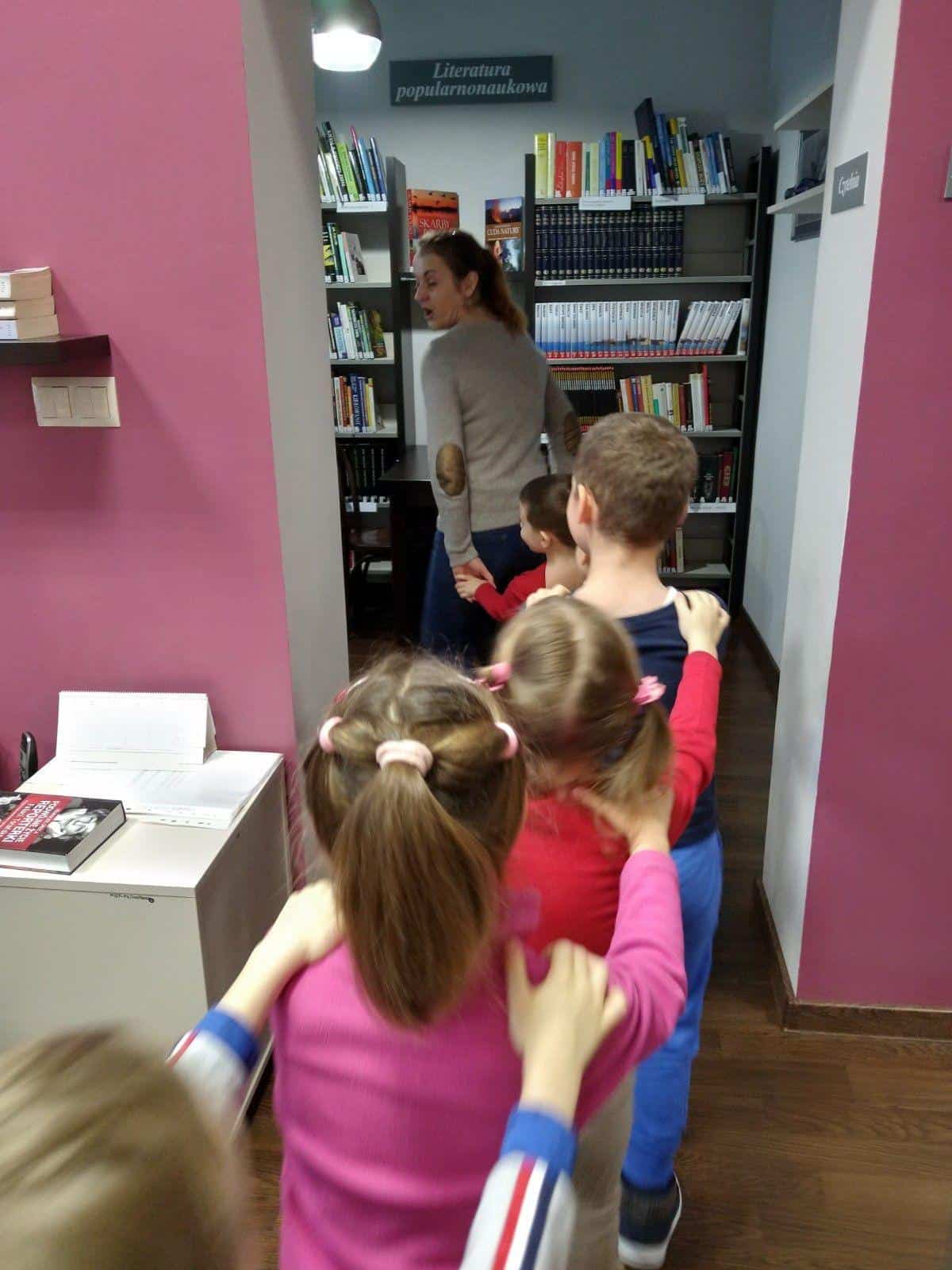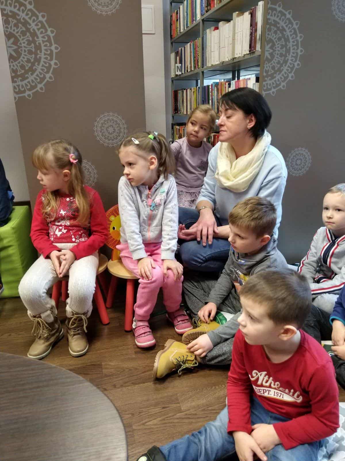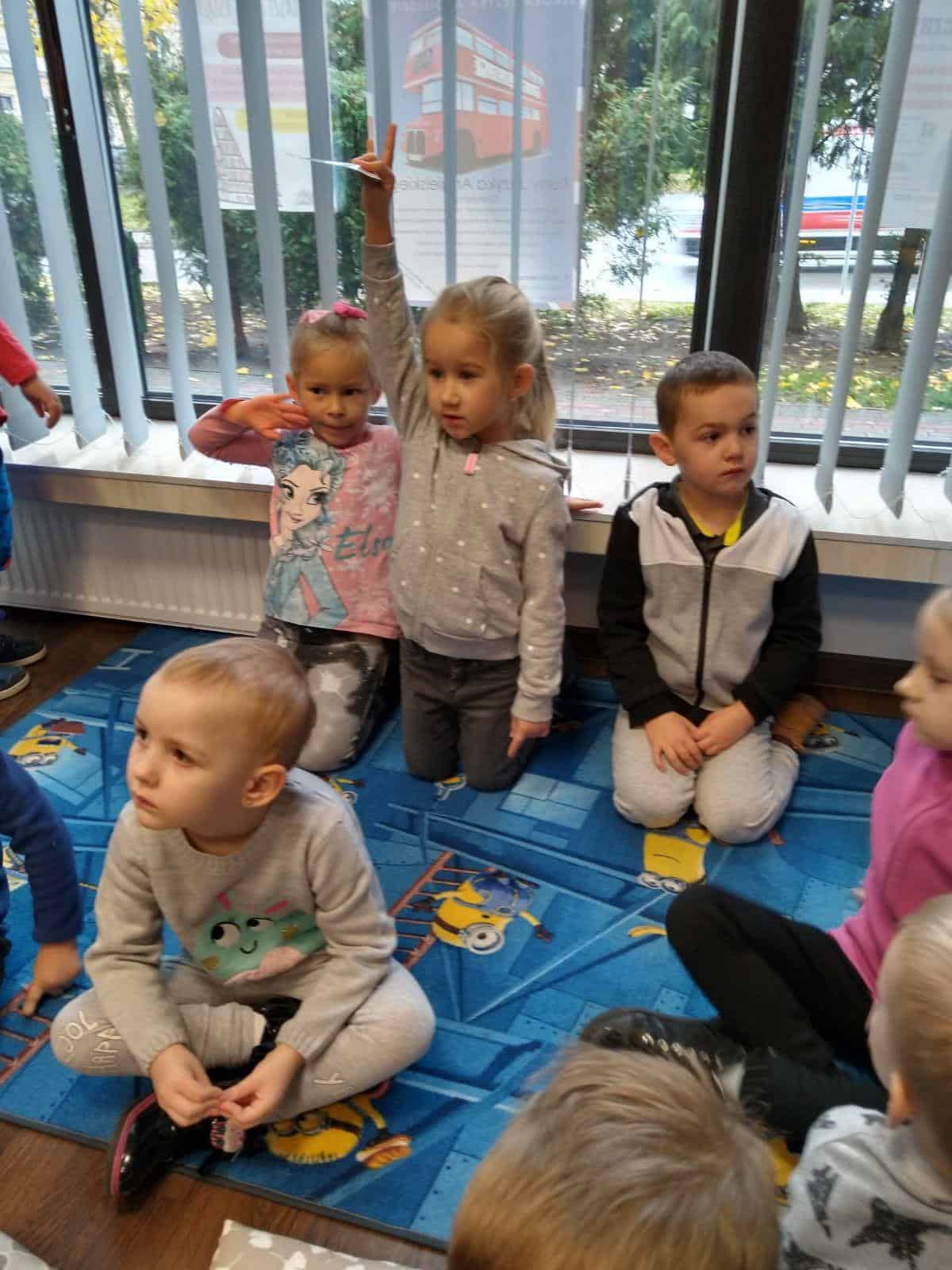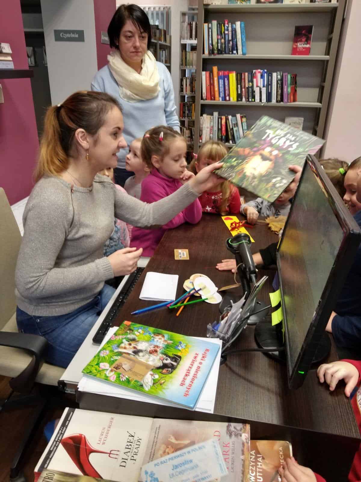 Poznające bibliotekę dzieci były bardzo skupione. Z zainteresowaniem chłonęły wiedzę,  którą przekazywała im pani bibliotekarka, gospodarz tego miejsca. Razem z panią bibliotekarką dzieci zwiedziły całą bibliotekę. Dowiedziały się, że w bibliotece oprócz książek można poczytać czasopisma, że istnieje w niej porządek polegający na zgromadzeniu książek w działach tematycznych. Czas, który dzieci spędziły w bibliotece przyniósł im dużo pożytku i bardzo dobrze nastroił.